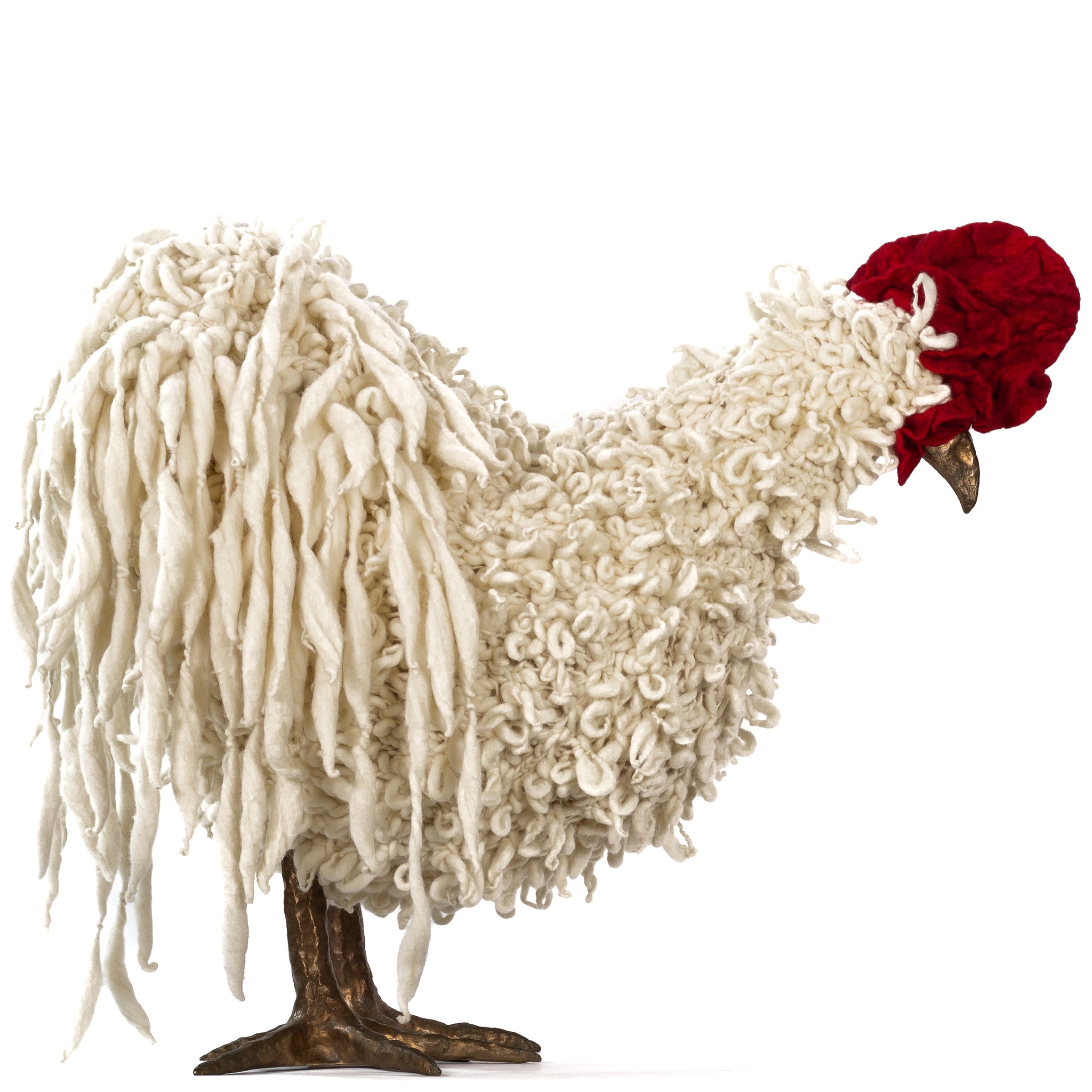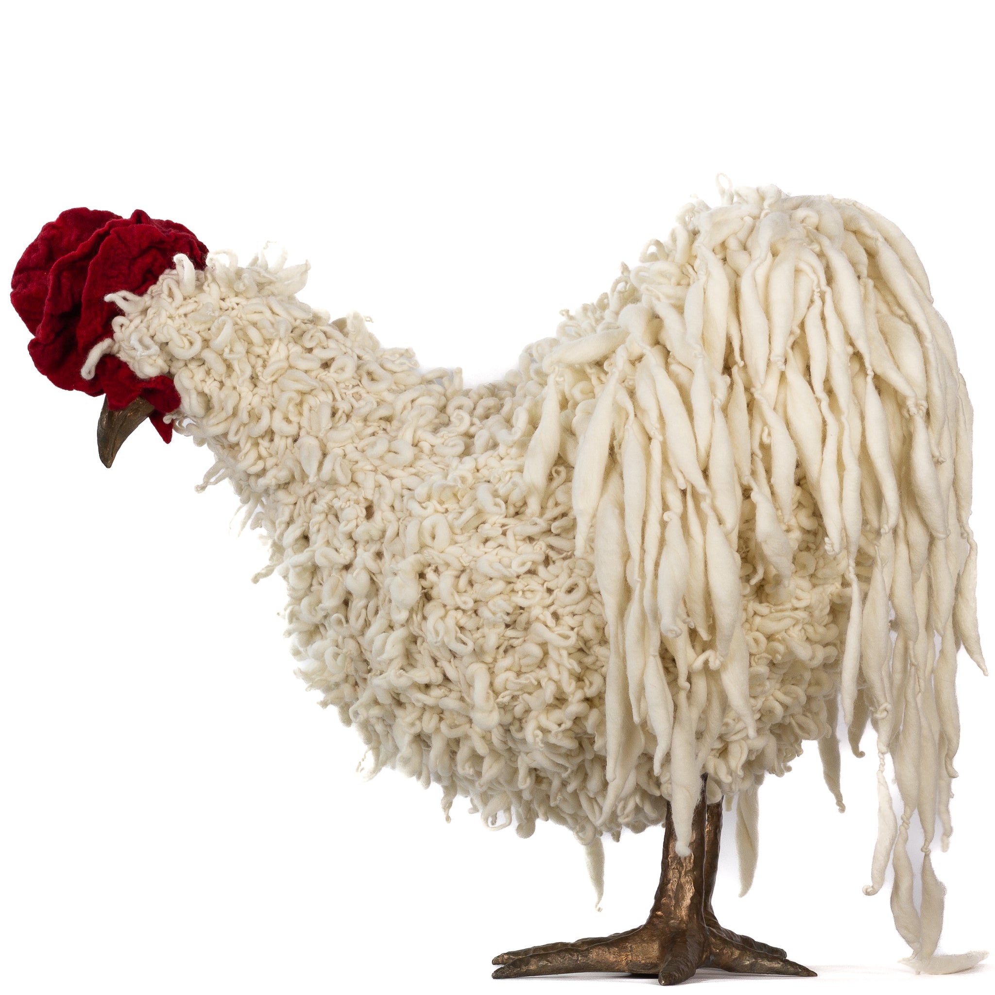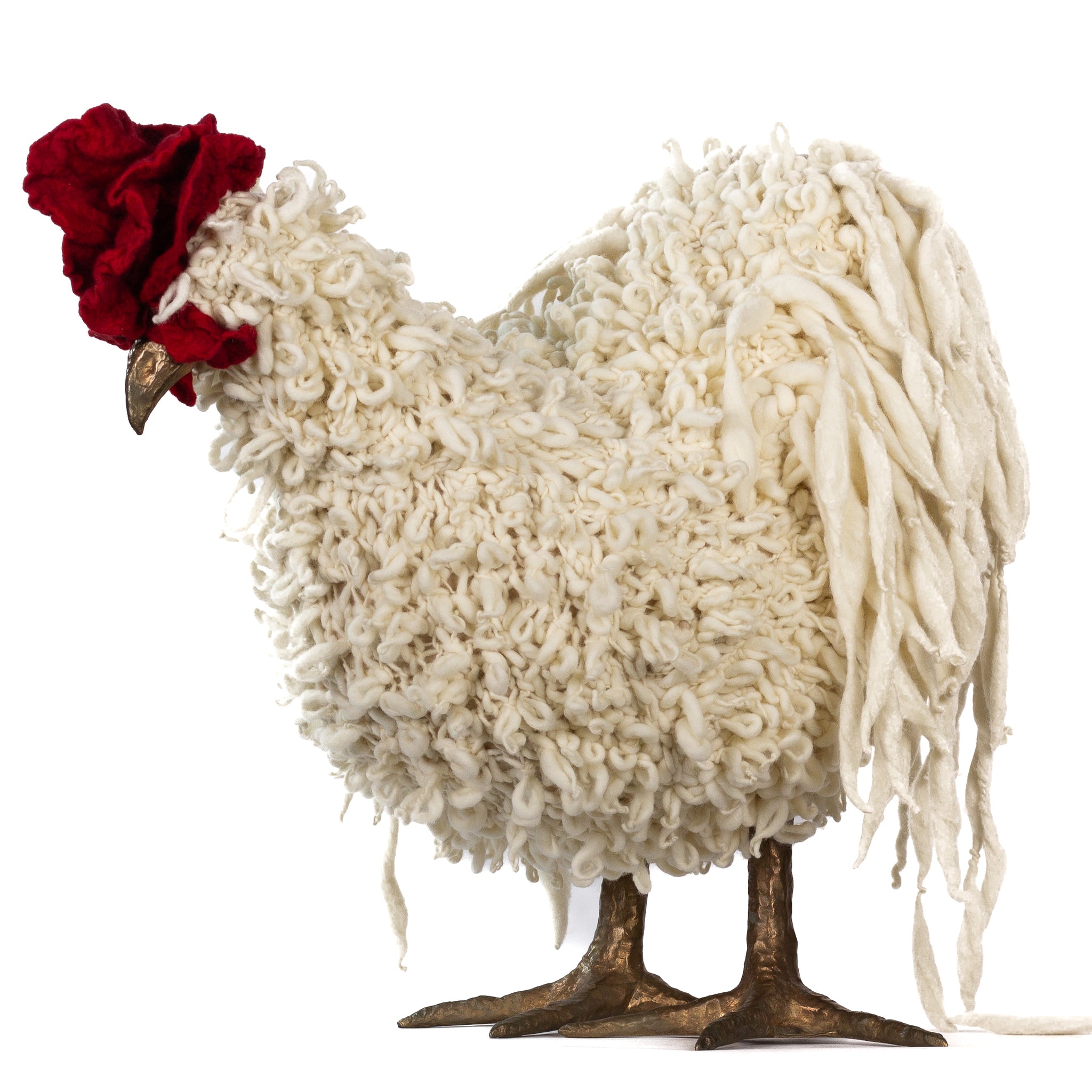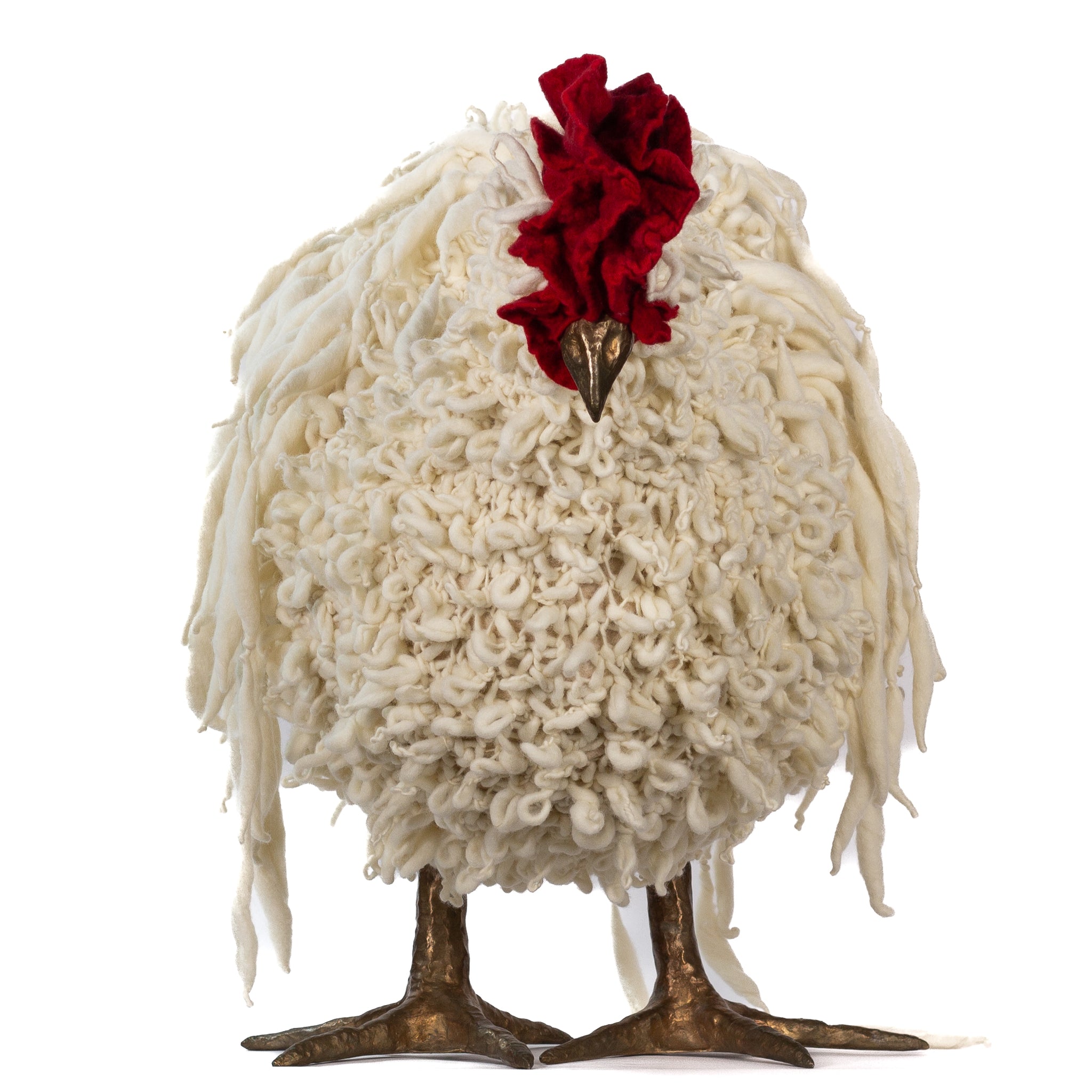 The chickens are sculpted in Kansas City, Missouri with care and delight, upholstered to function as footstools. Each is one-of-a-kind, unique in posture and personality. A turned wood egg-shaped core stands on bronze feet and is connected to a bronze beak. Feathers are fashioned with traditional fiber art techniques- dyeing, felting, spinning, knitting- and are stitched by hand. And a surprise? Their heads bob.