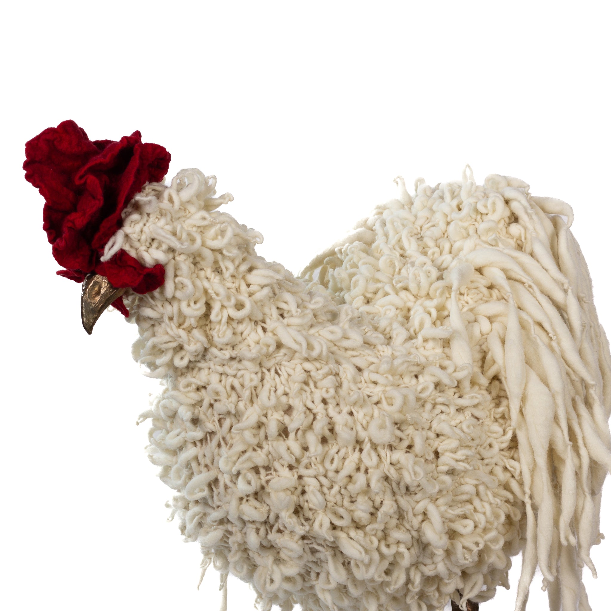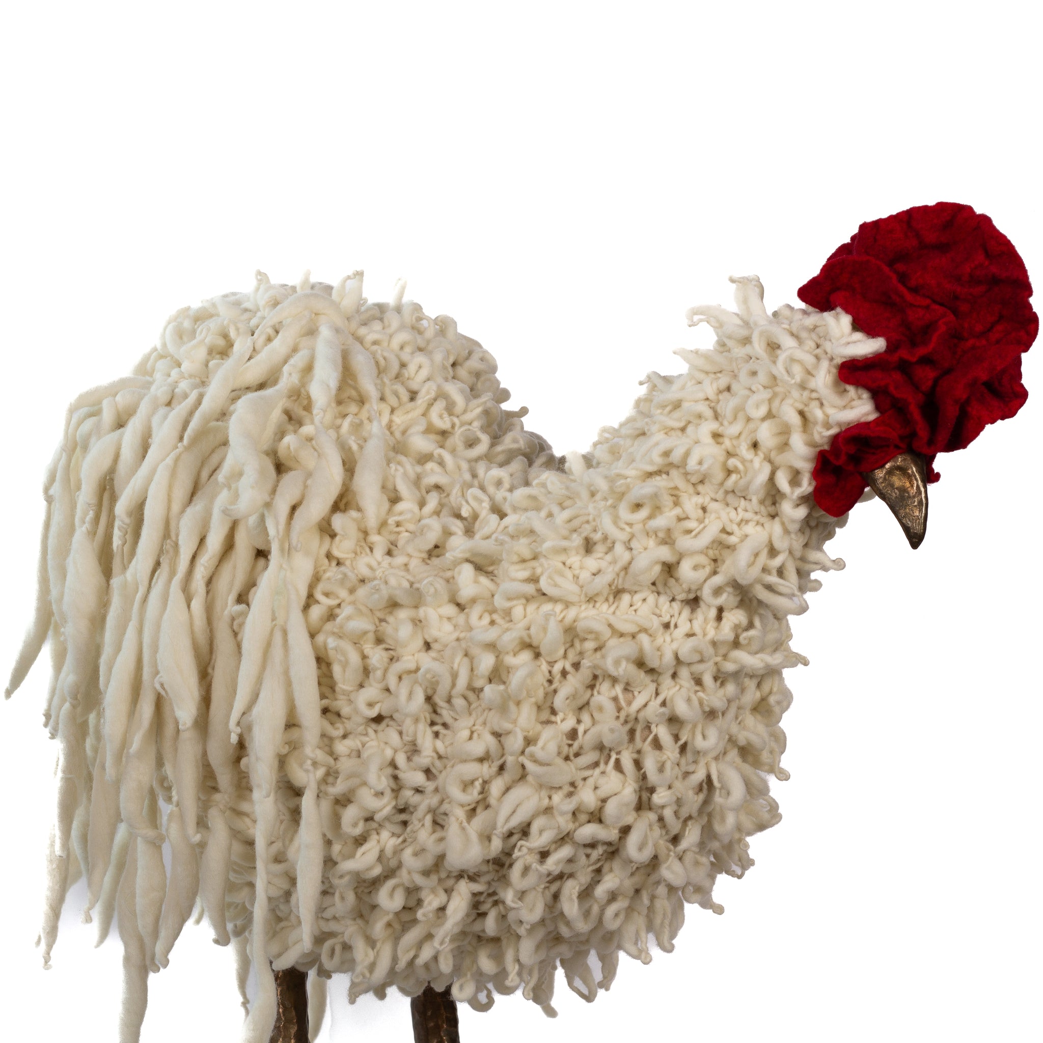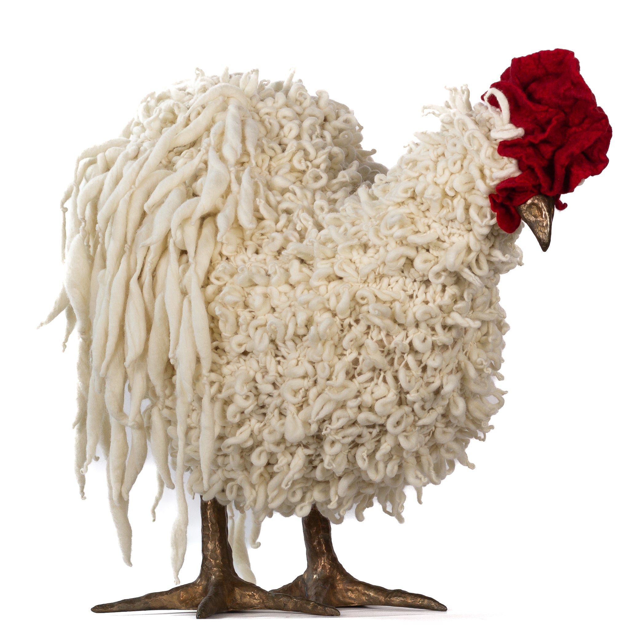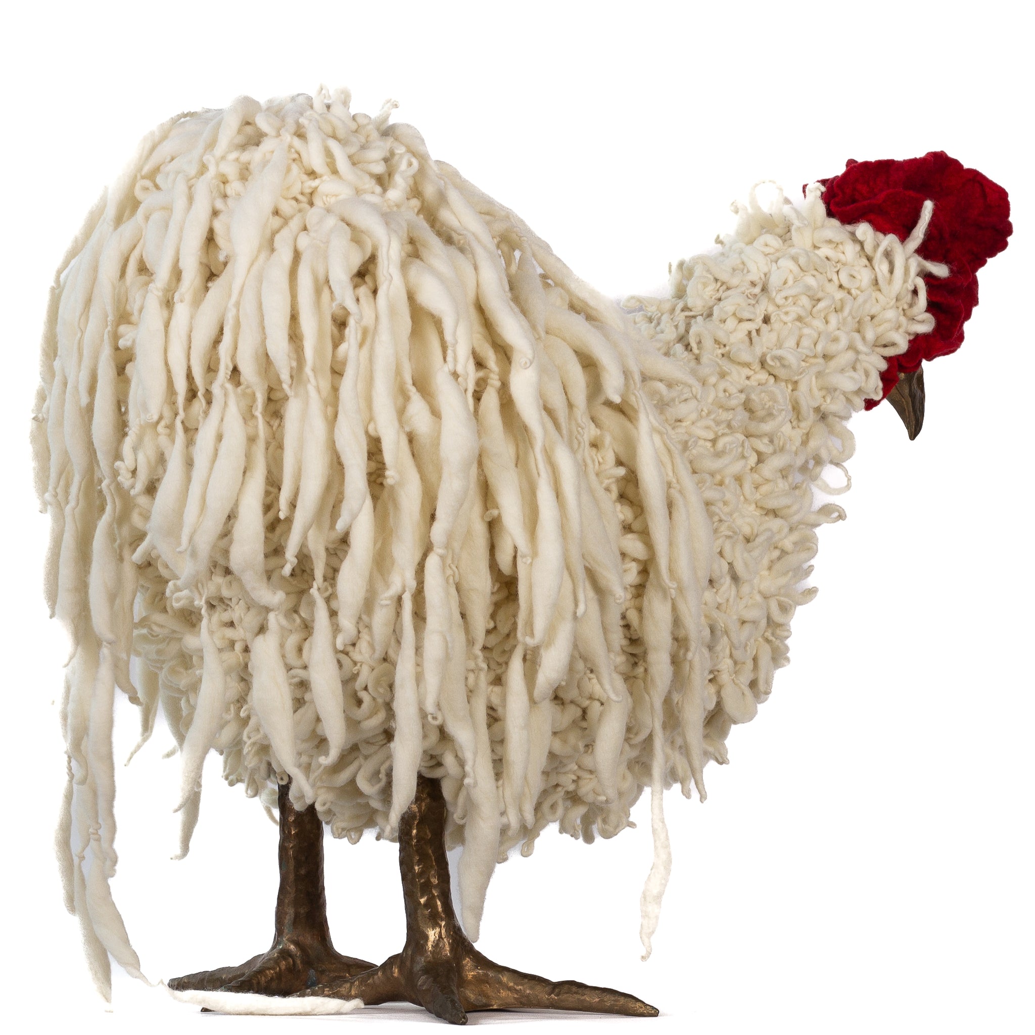 The chickens are sculpted in Kansas City, Missouri with care and delight, upholstered to function as footstools. Each is one-of-a-kind, unique in posture and personality. A turned wood egg-shaped core stands on bronze feet and is connected to a bronze beak. Feathers are fashioned with traditional fiber art techniques- dyeing, felting, spinning, knitting- and are stitched by hand. And a surprise? Their heads bob.