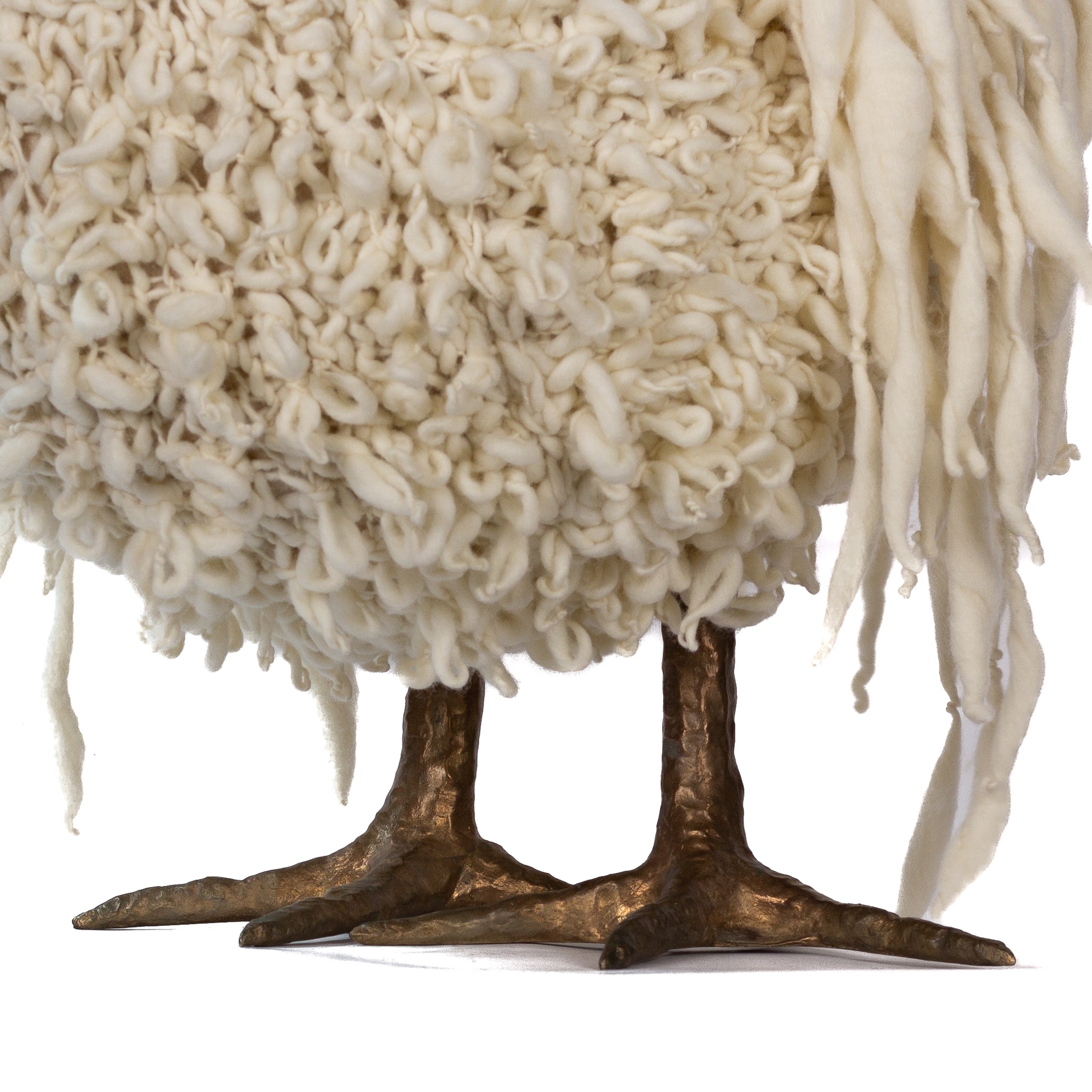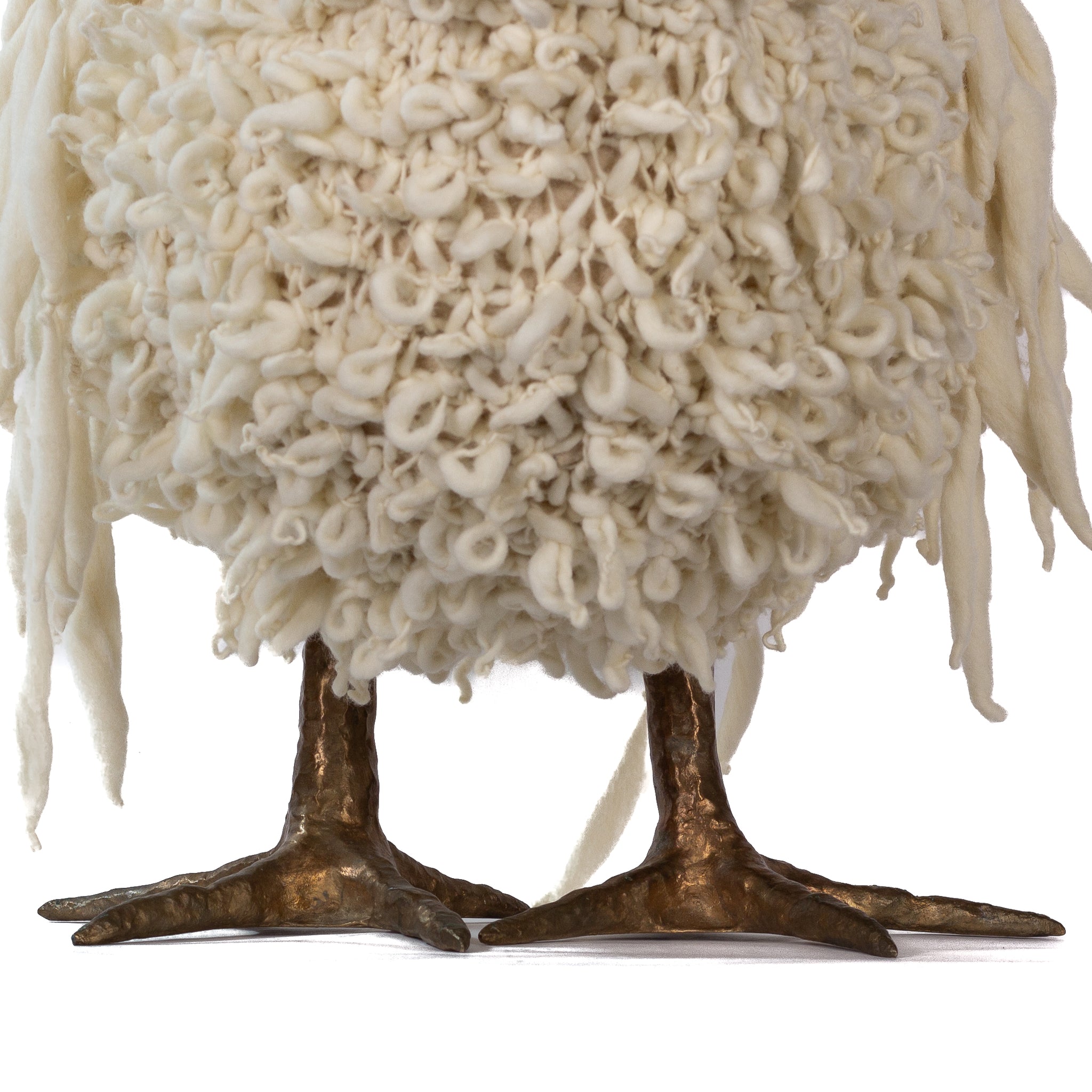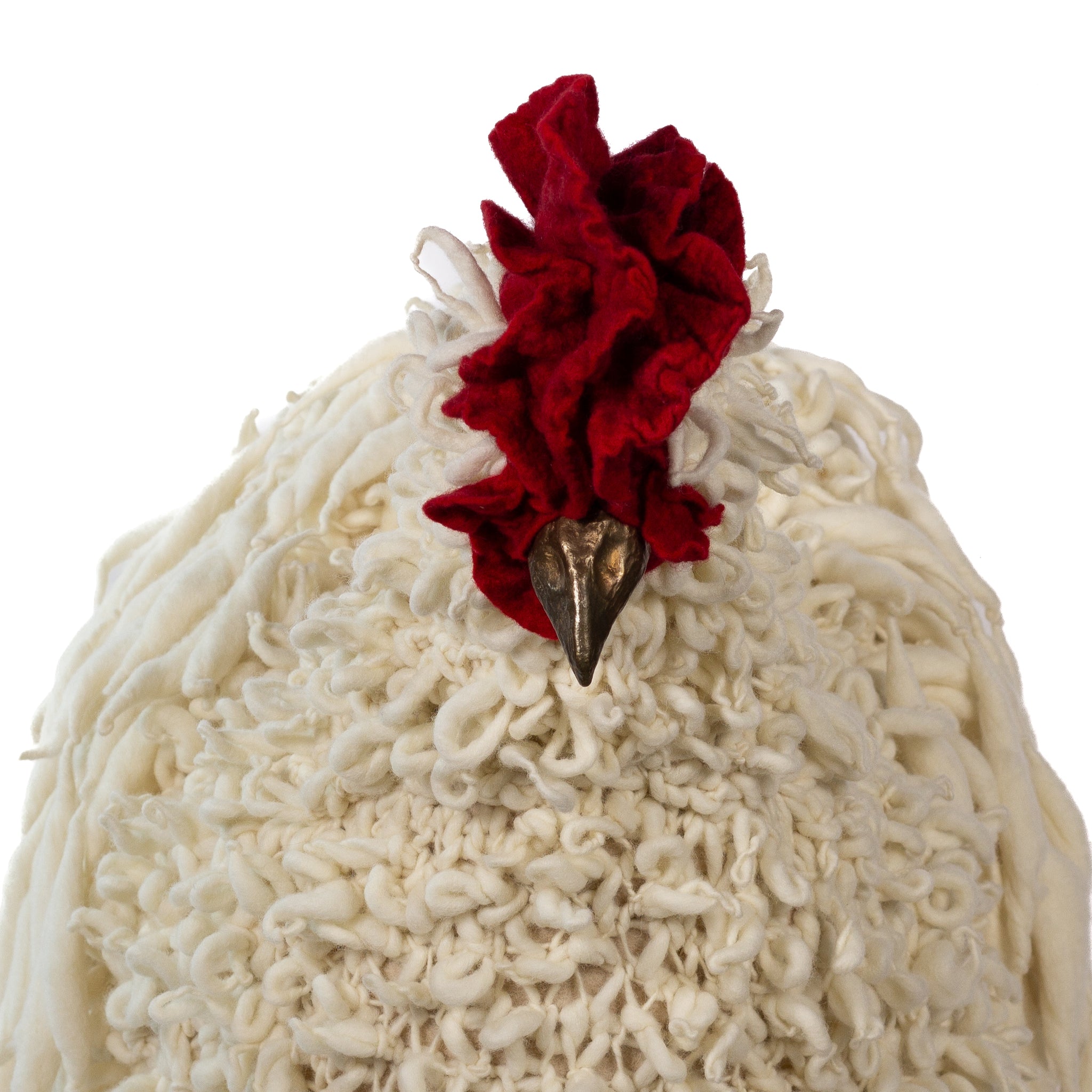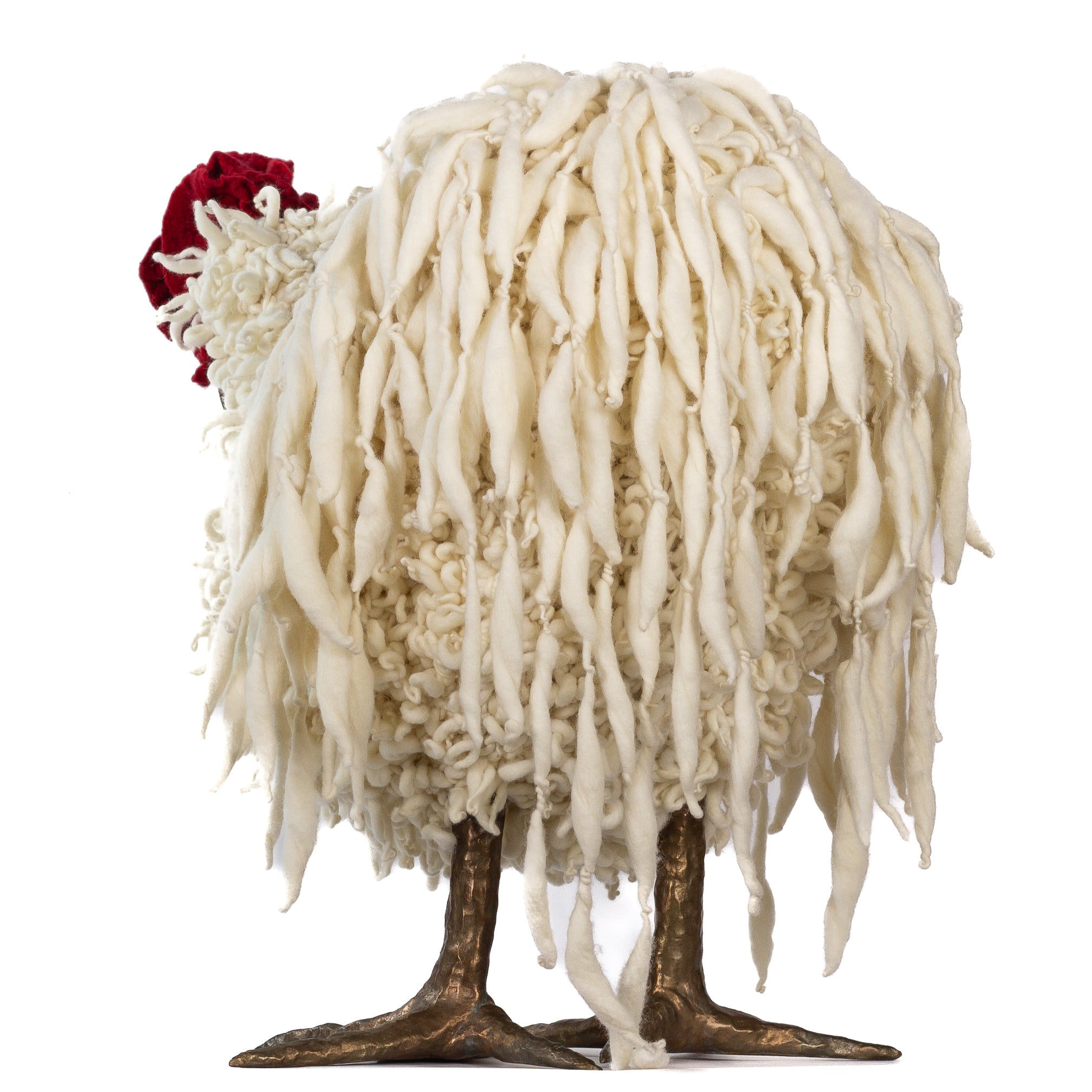 The chickens are sculpted in Kansas City, Missouri with care and delight, upholstered to function as footstools. Each is one-of-a-kind, unique in posture and personality. A turned wood egg-shaped core stands on bronze feet and is connected to a bronze beak. Feathers are fashioned with traditional fiber art techniques- dyeing, felting, spinning, knitting- and are stitched by hand. And a surprise? Their heads bob.