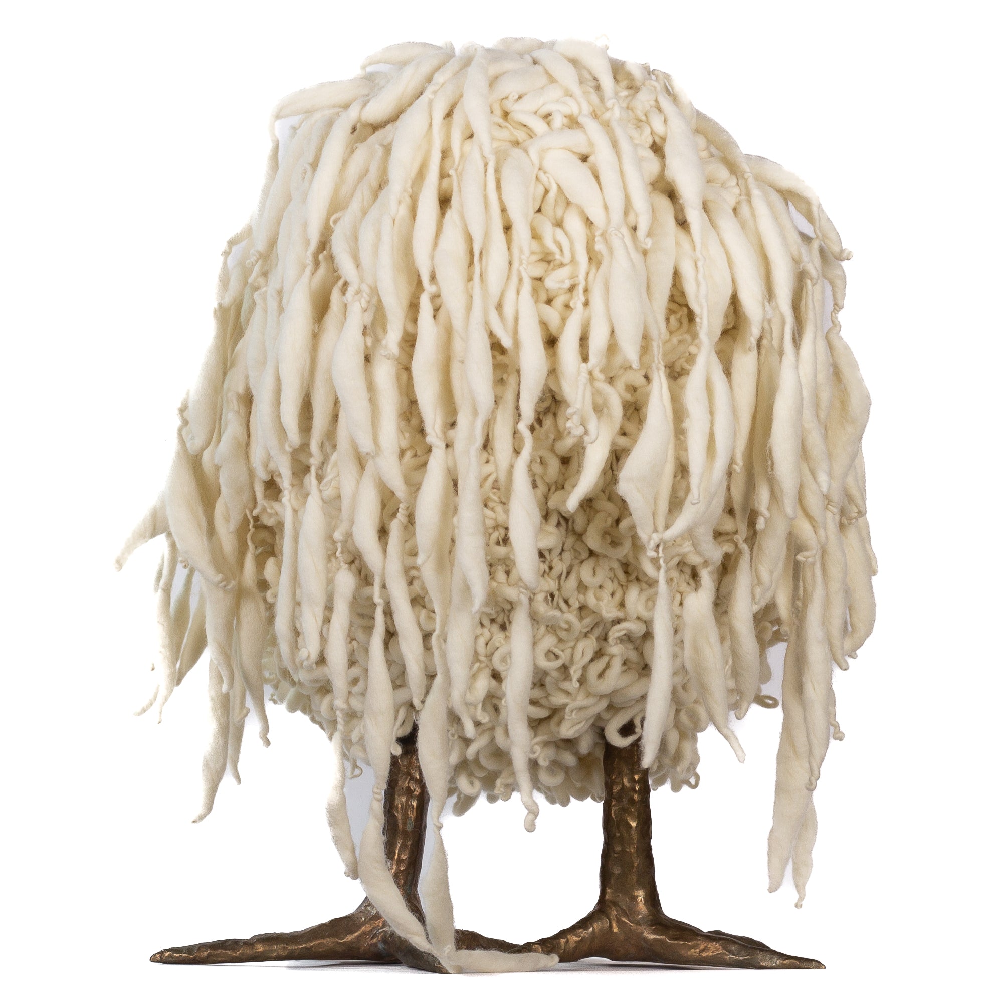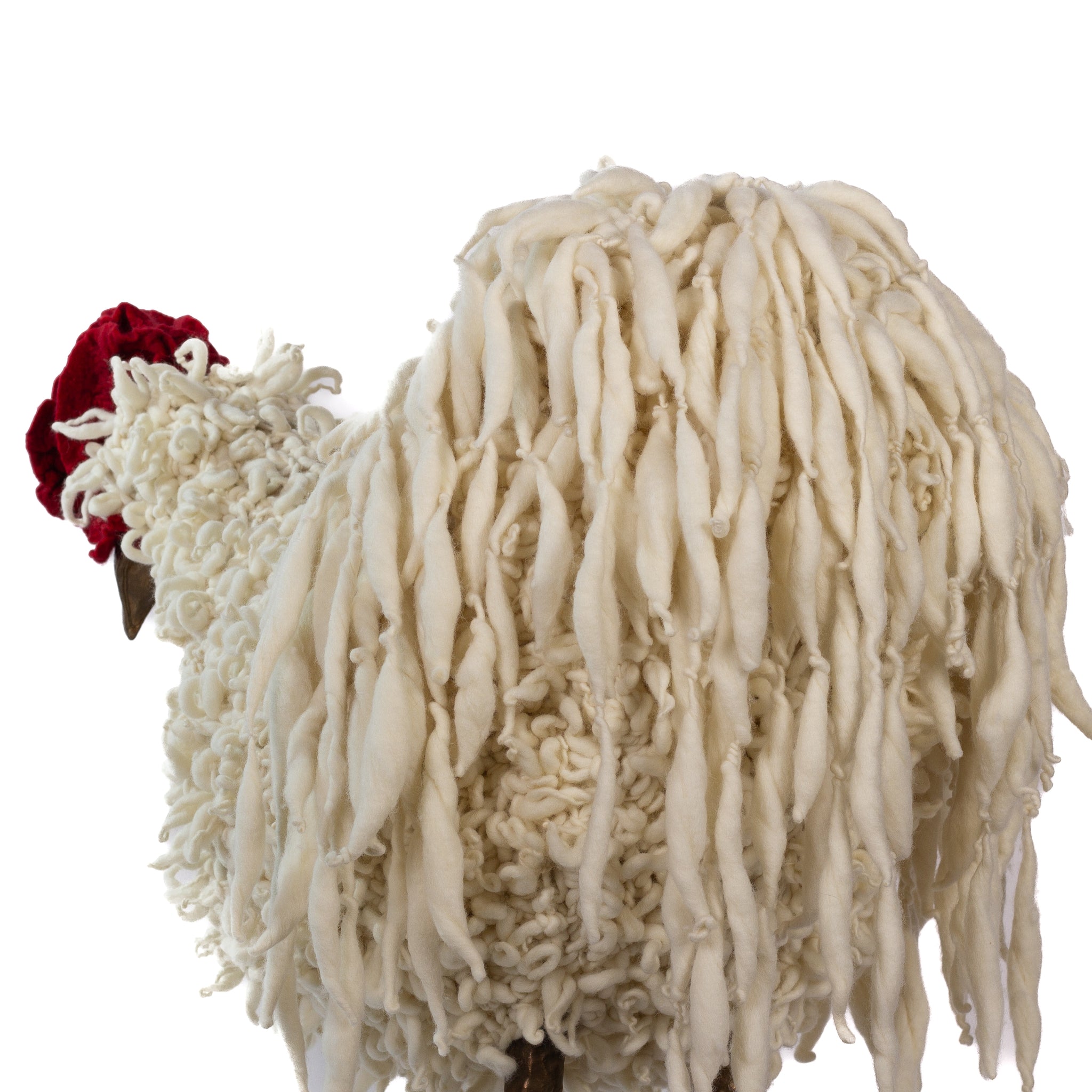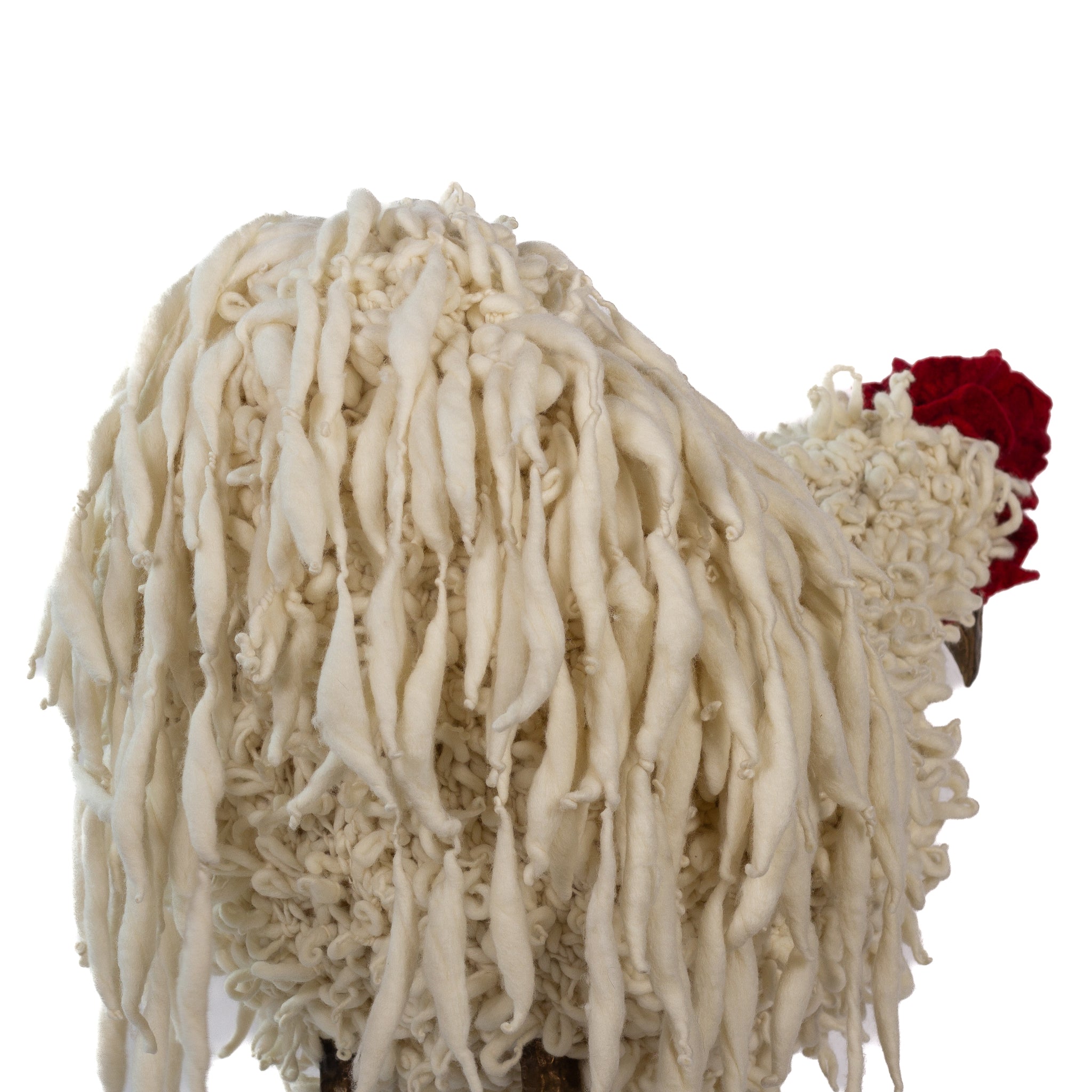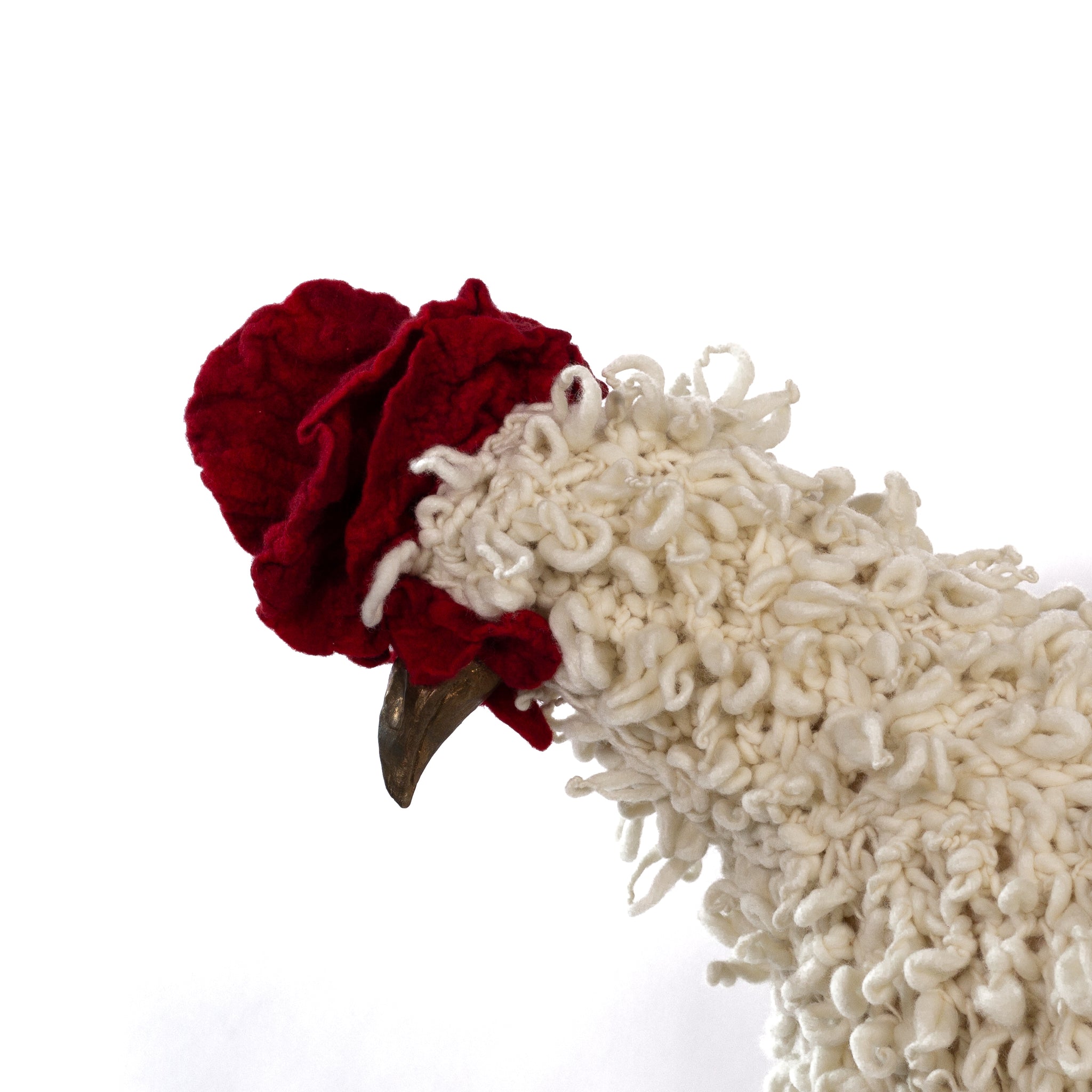The chickens are sculpted in Kansas City, Missouri with care and delight, upholstered to function as footstools. Each is one-of-a-kind, unique in posture and personality. A turned wood egg-shaped core stands on bronze feet and is connected to a bronze beak. Feathers are fashioned with traditional fiber art techniques- dyeing, felting, spinning, knitting- and are stitched by hand. And a surprise? Their heads bob.