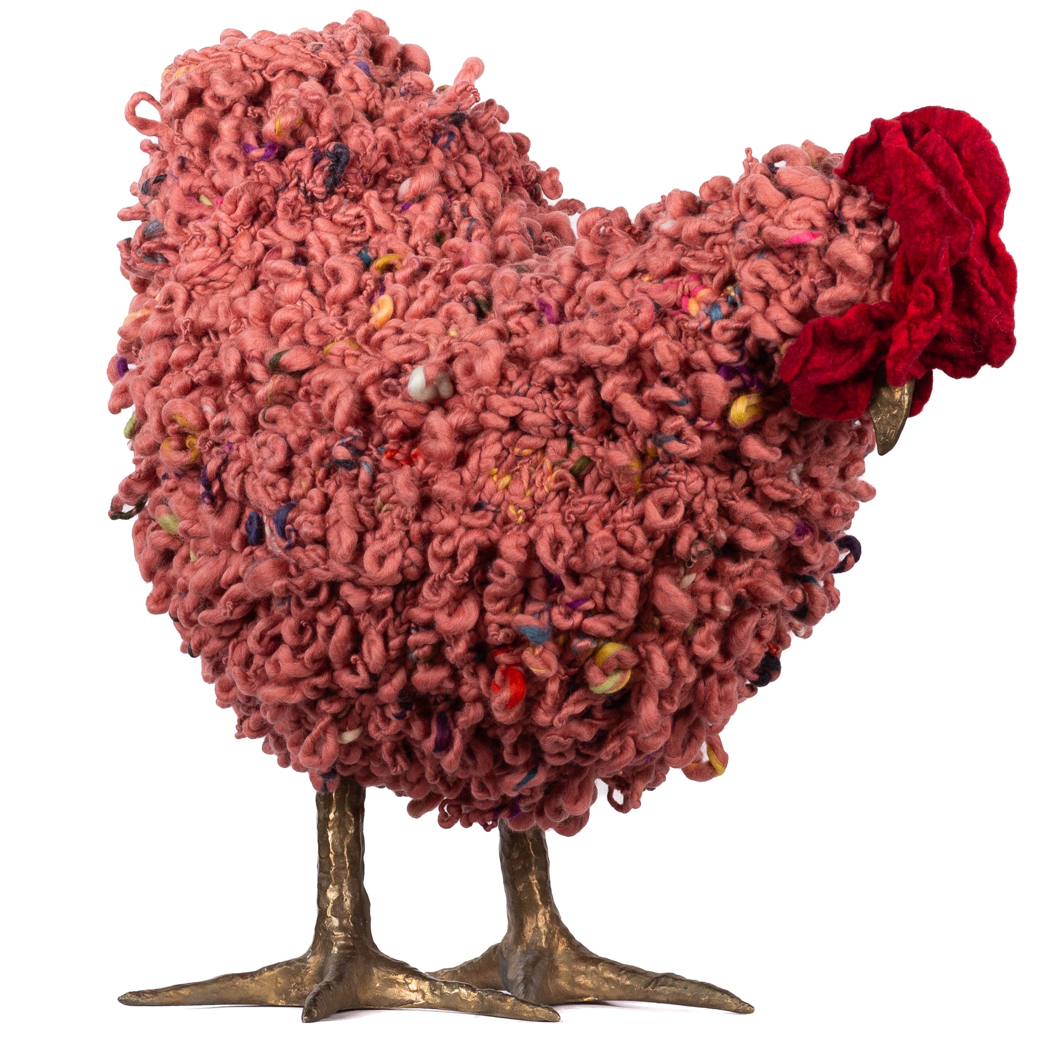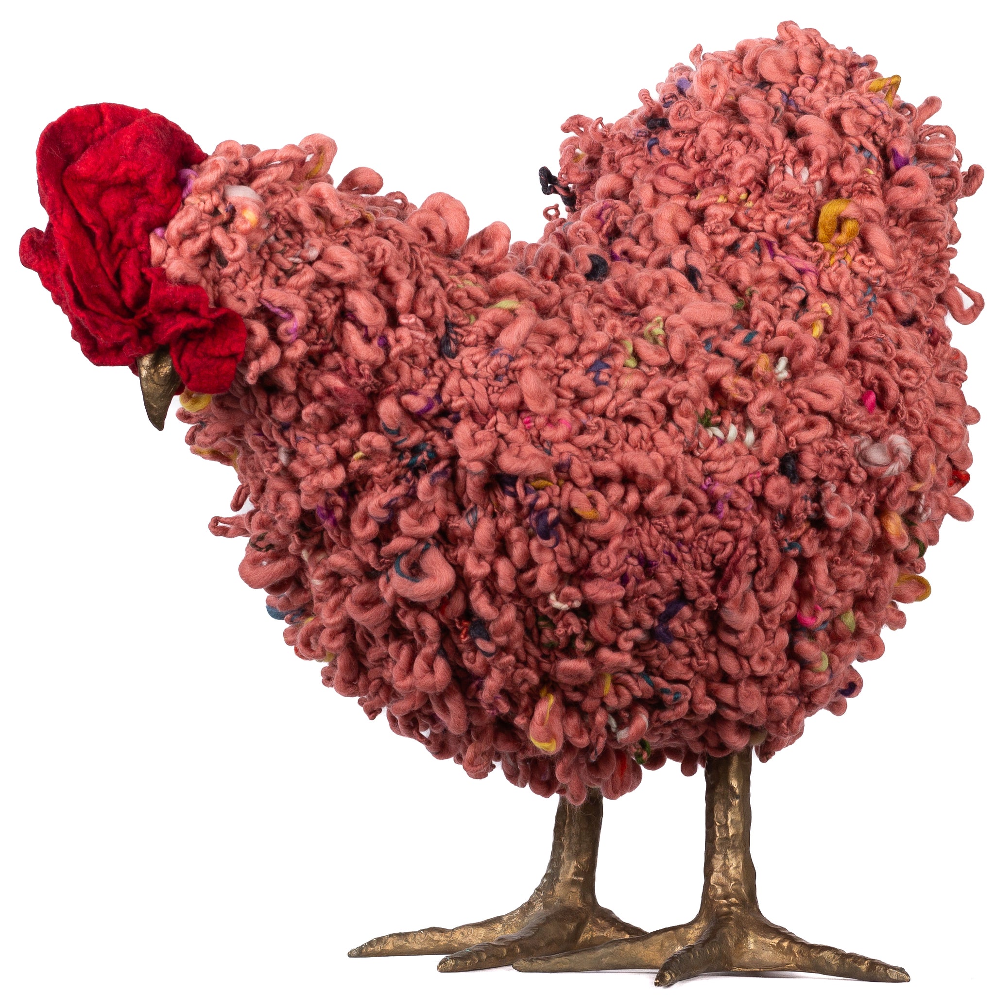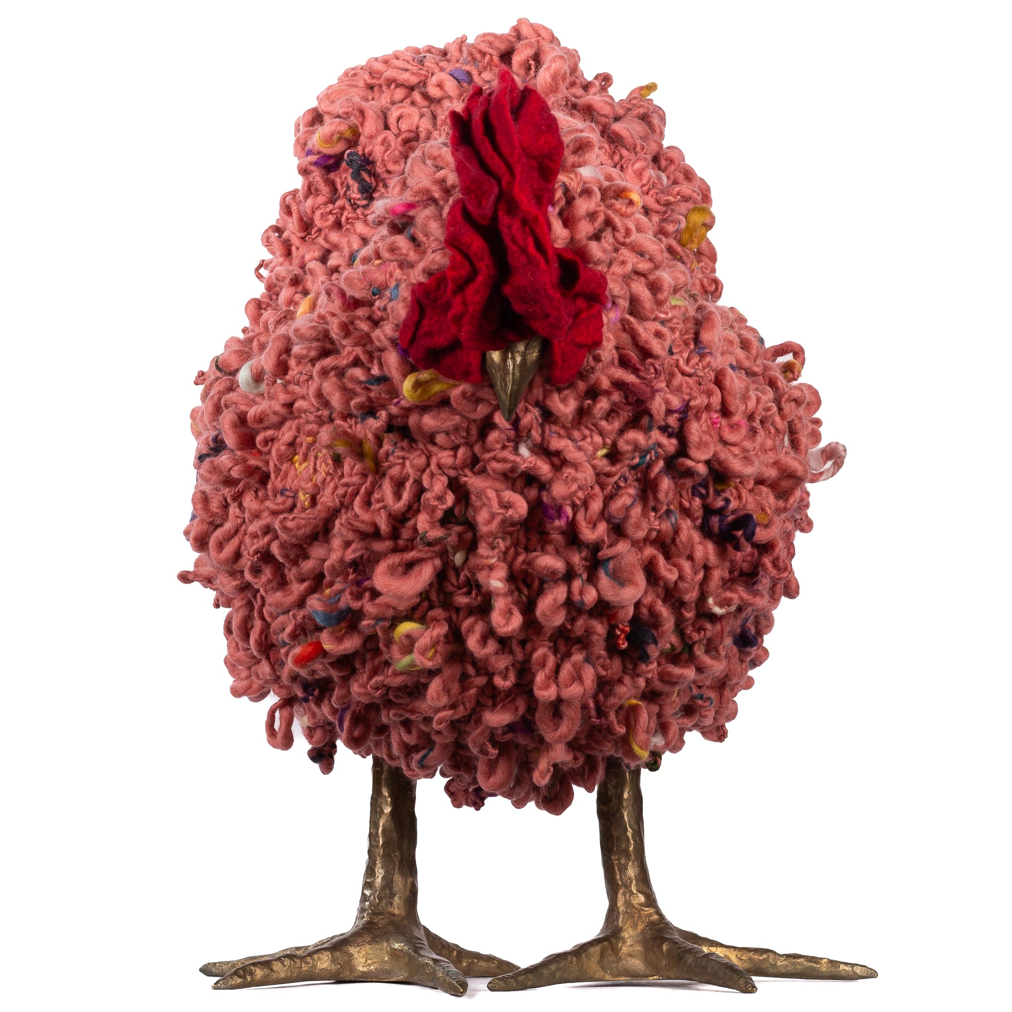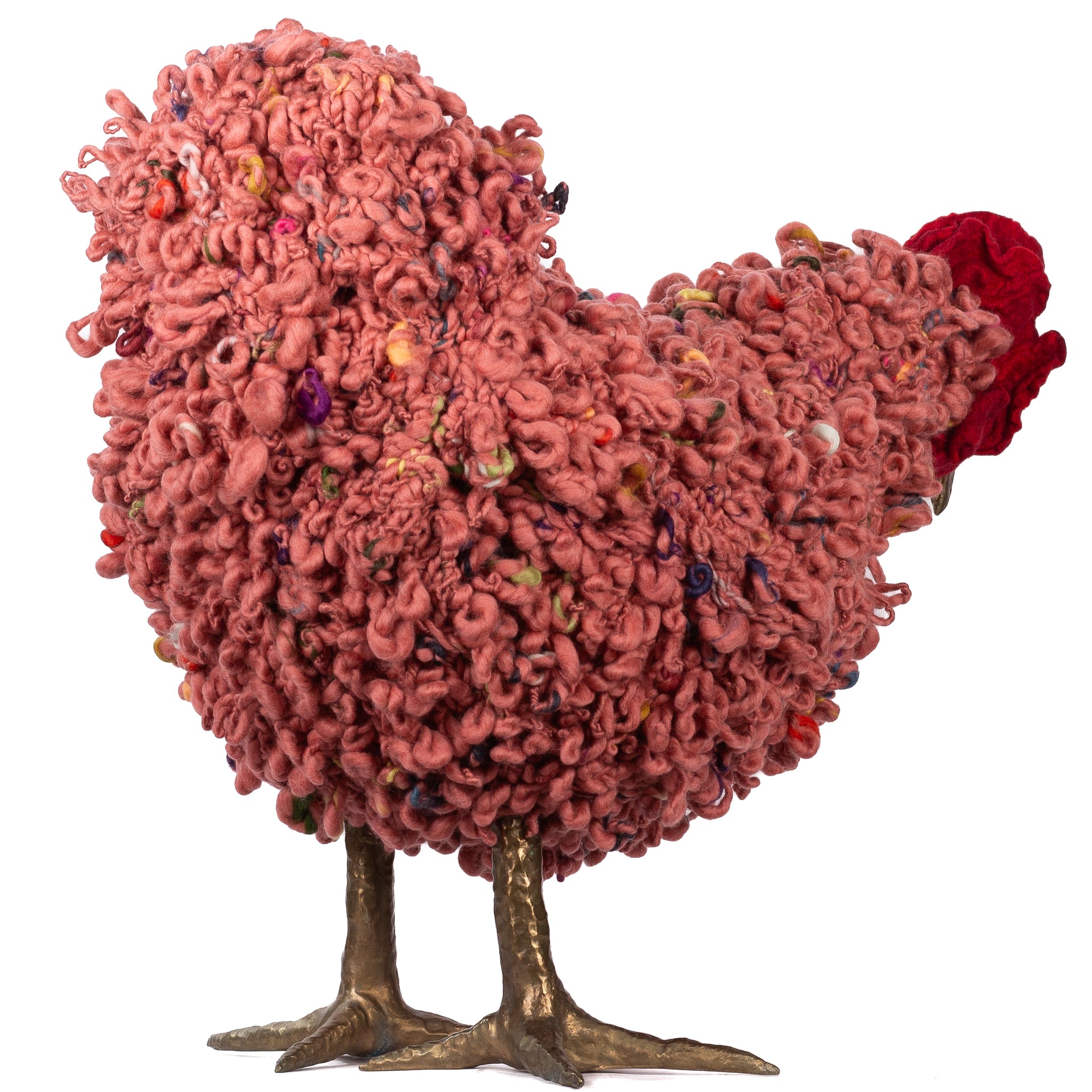 The chickens are sculpted in Kansas City, Missouri with care and delight, upholstered to function as footstools. Each is one-of-a-kind, unique in posture and personality. A turned wood egg-shaped core stands on bronze feet and is connected to a bronze beak. Feathers are fashioned with traditional fiber art techniques- dyeing, felting, spinning, knitting- and are stitched by hand. And a surprise? Their heads bob.