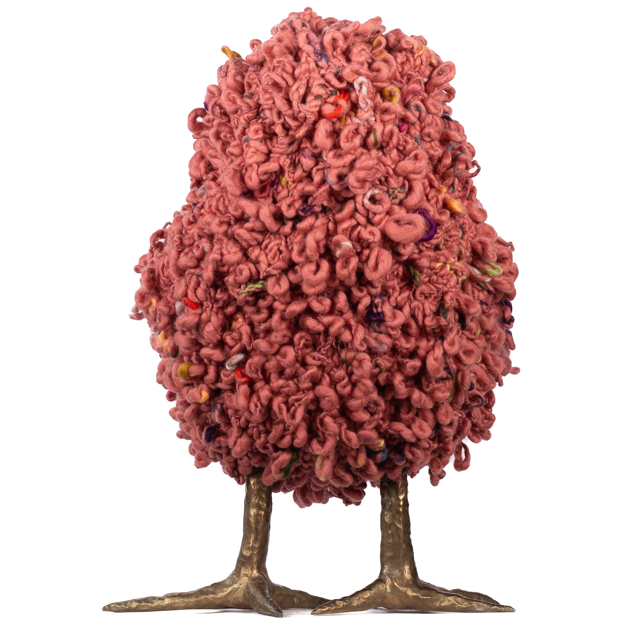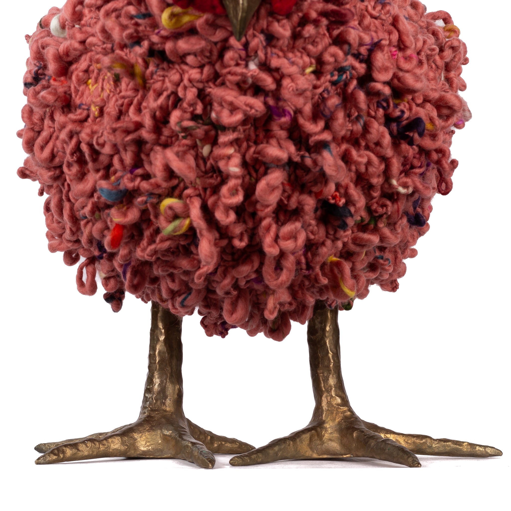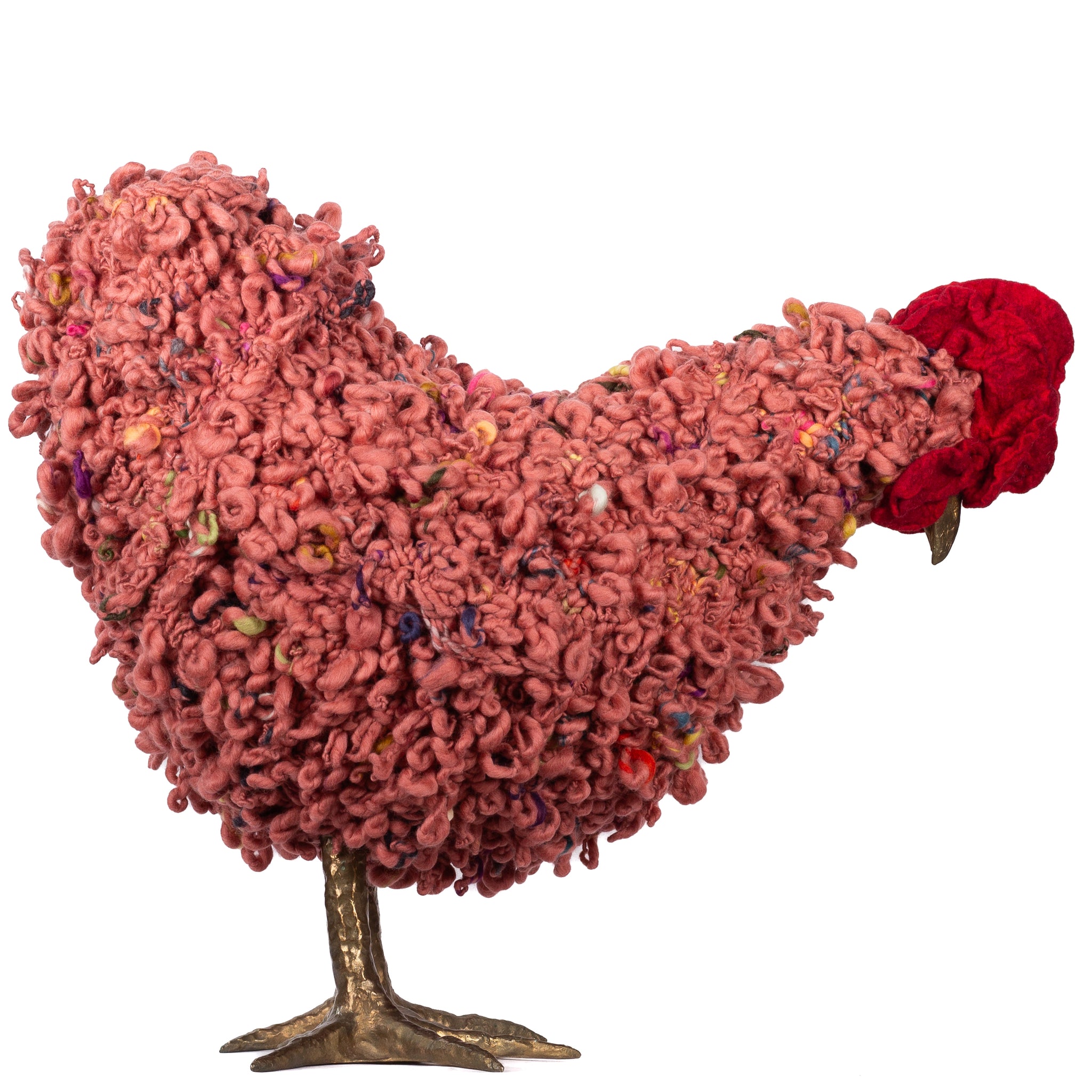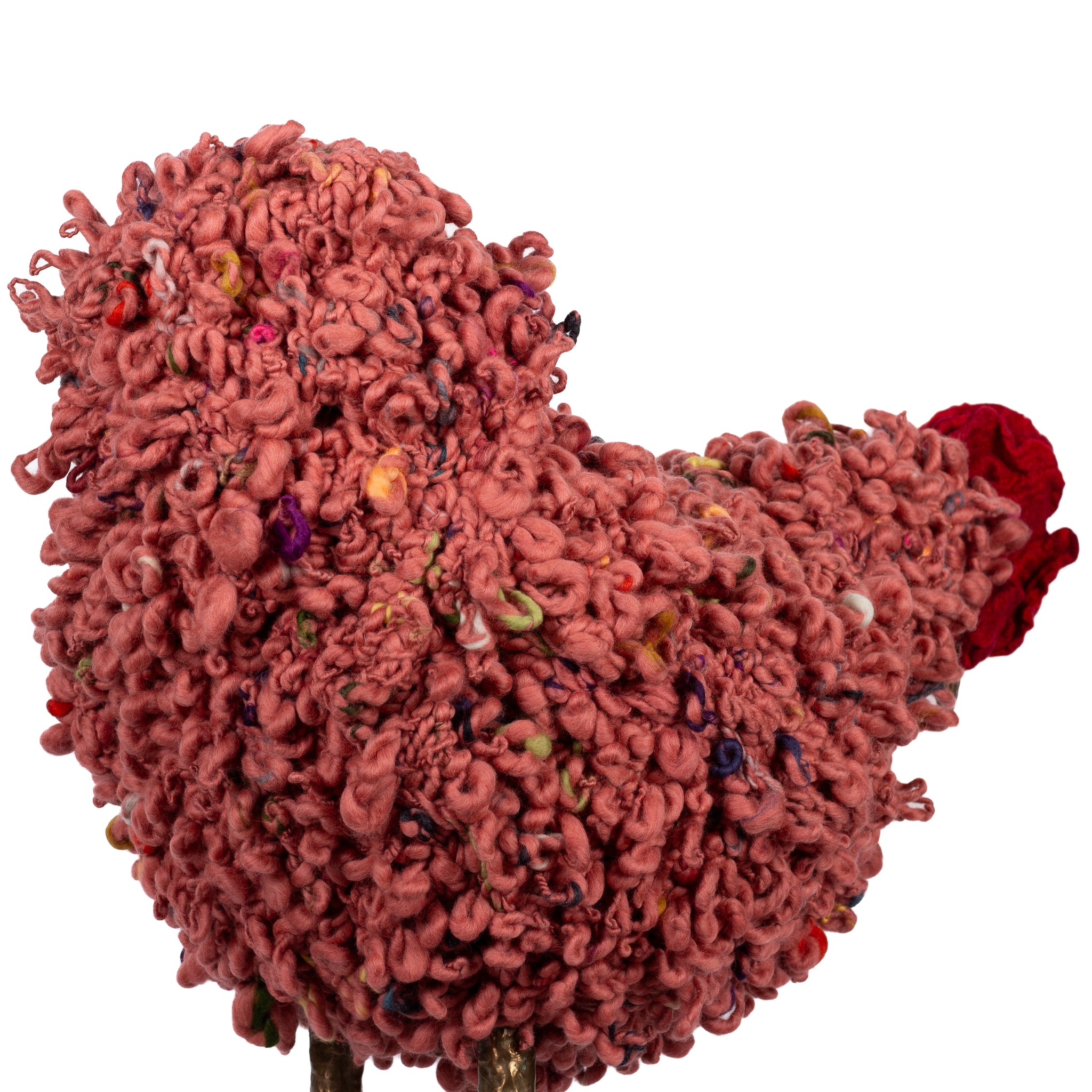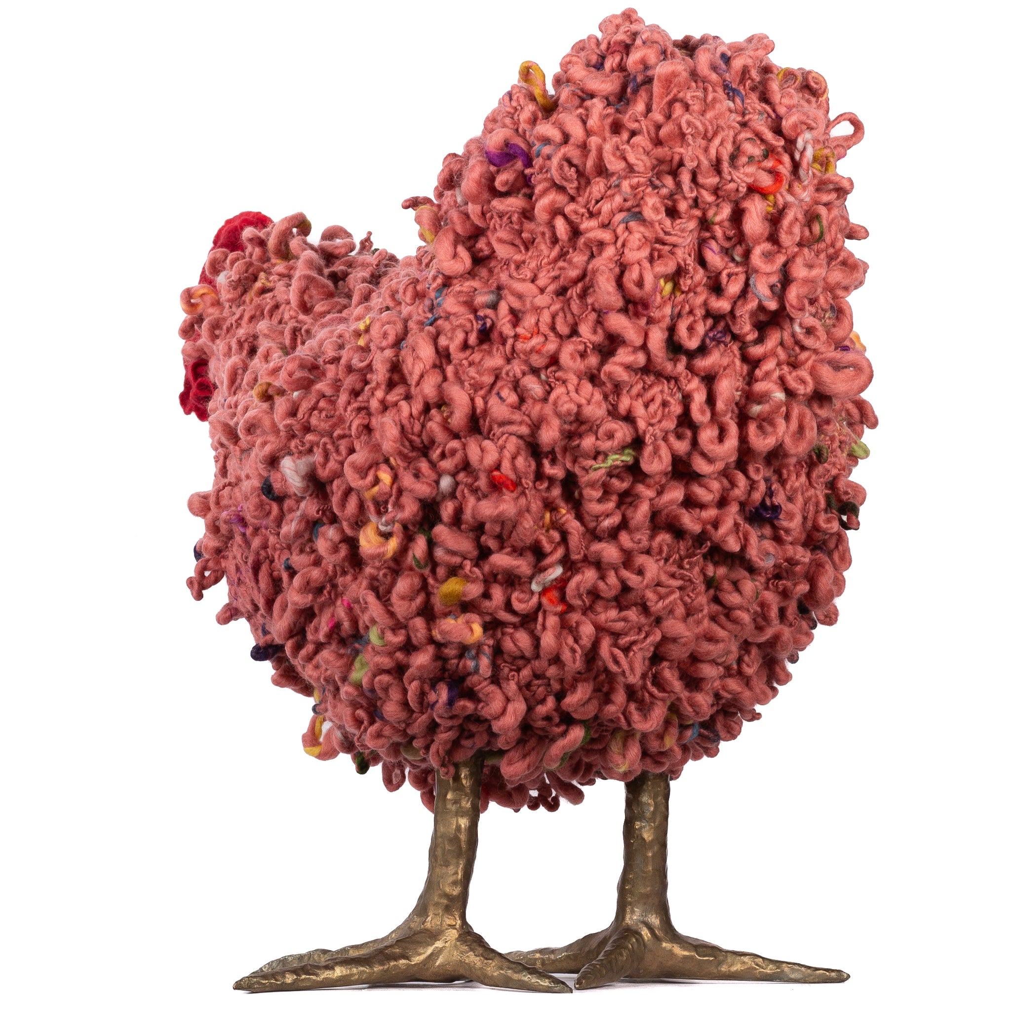 The chickens are sculpted in Kansas City, Missouri with care and delight, upholstered to function as footstools. Each is one-of-a-kind, unique in posture and personality. A turned wood egg-shaped core stands on bronze feet and is connected to a bronze beak. Feathers are fashioned with traditional fiber art techniques- dyeing, felting, spinning, knitting- and are stitched by hand. And a surprise? Their heads bob.