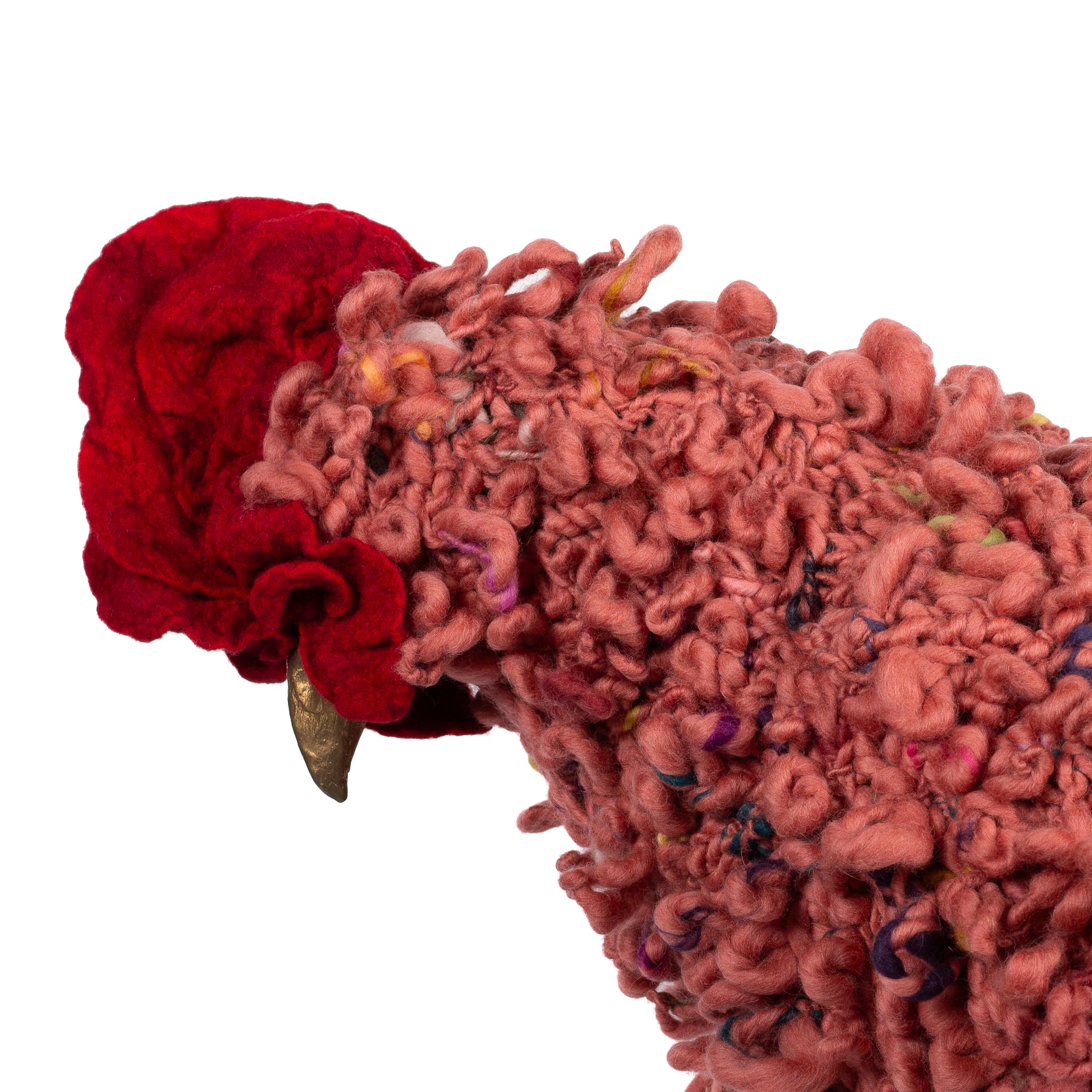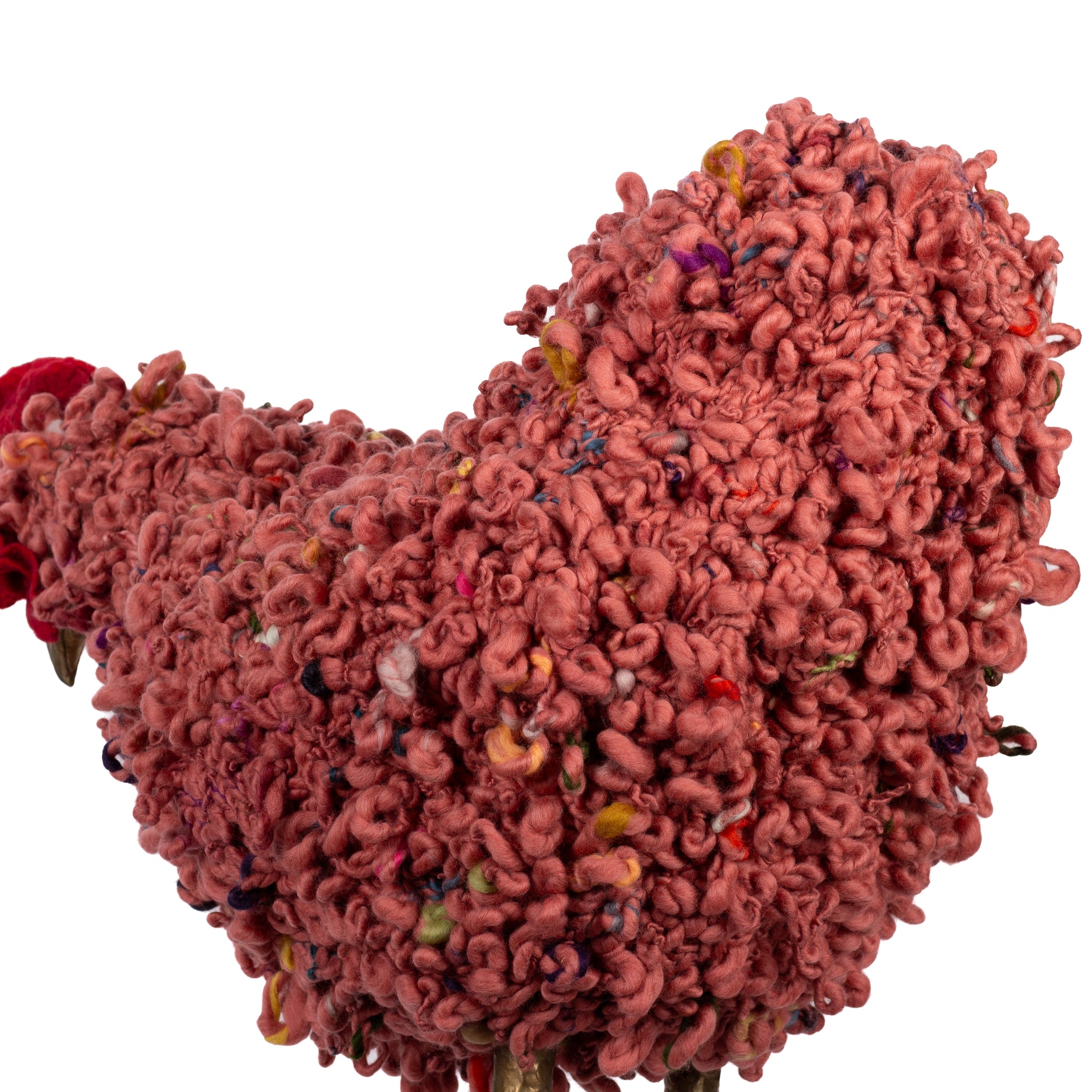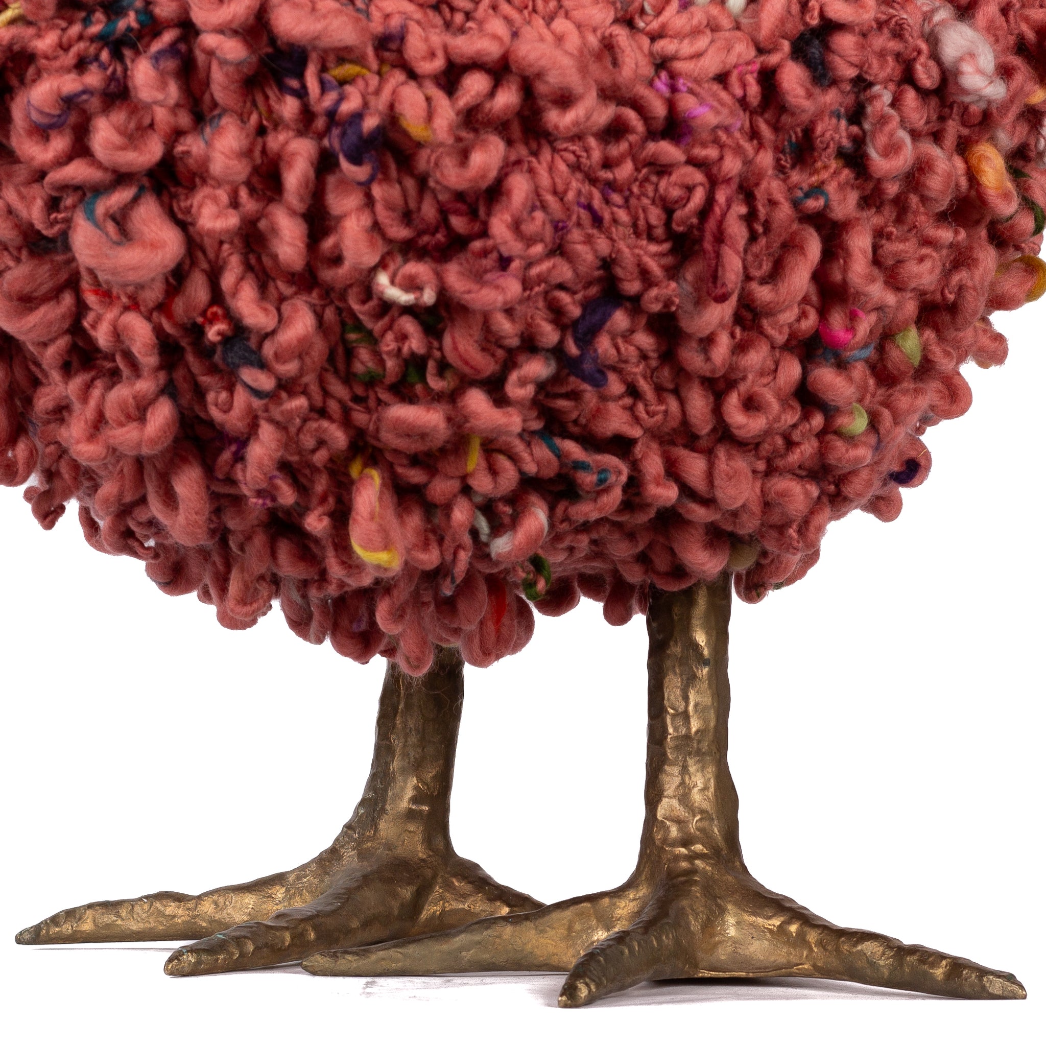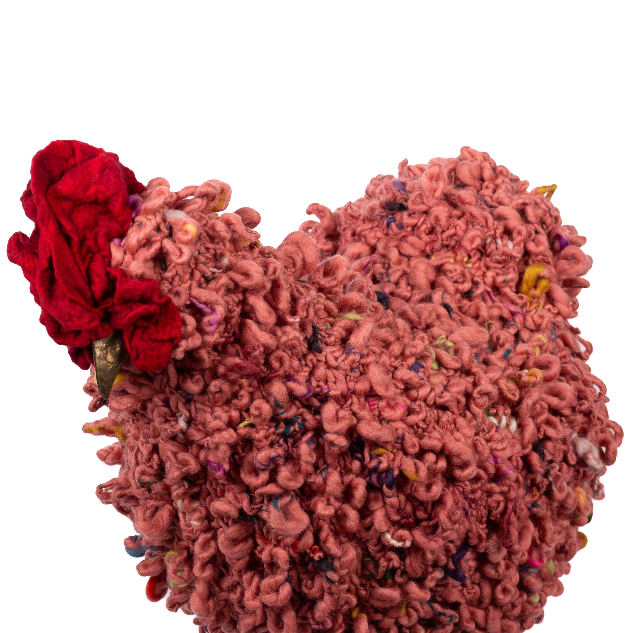 The chickens are sculpted in Kansas City, Missouri with care and delight, upholstered to function as footstools. Each is one-of-a-kind, unique in posture and personality. A turned wood egg-shaped core stands on bronze feet and is connected to a bronze beak. Feathers are fashioned with traditional fiber art techniques- dyeing, felting, spinning, knitting- and are stitched by hand. And a surprise? Their heads bob.