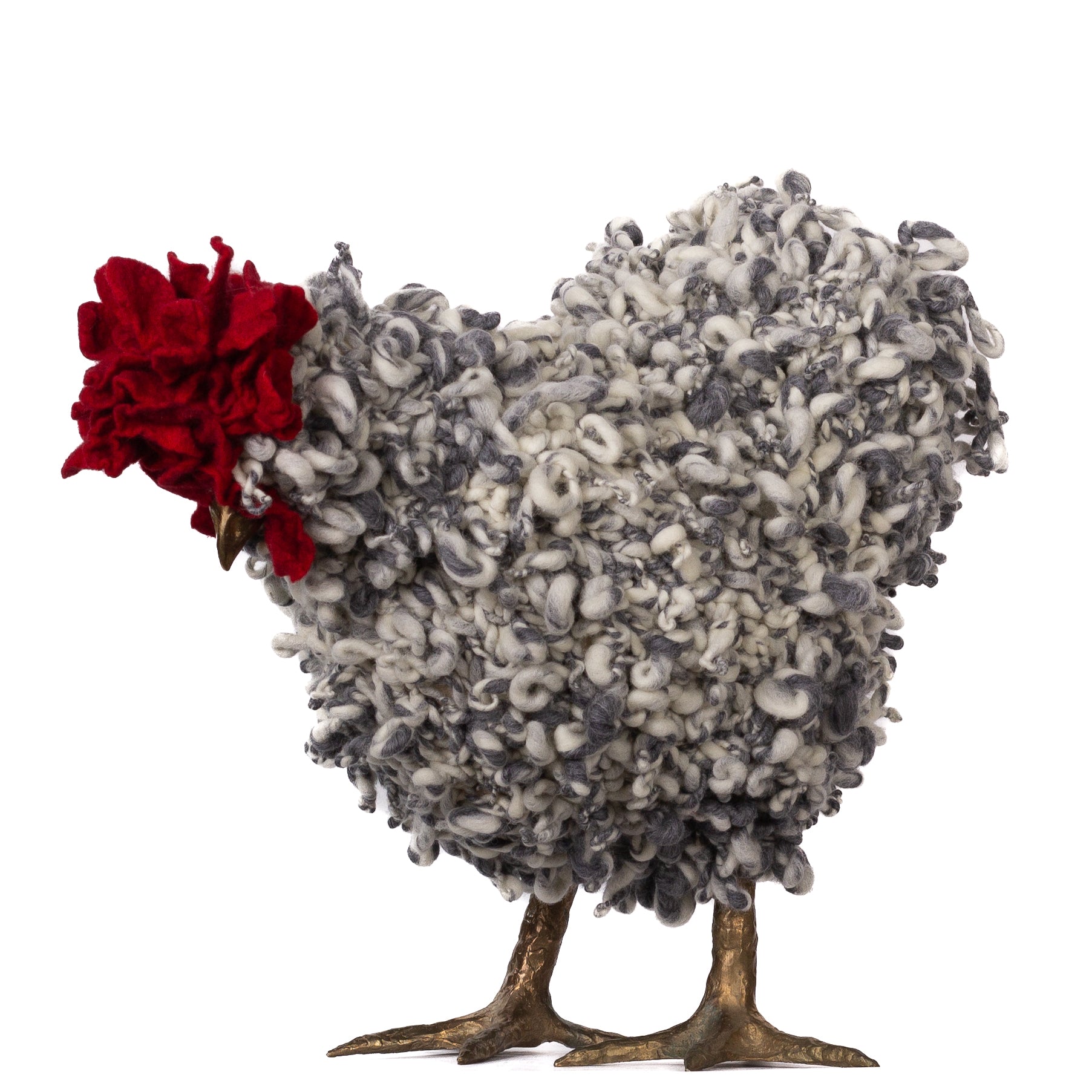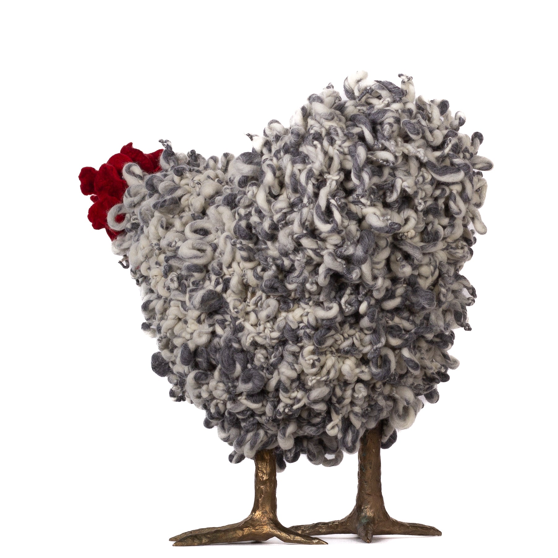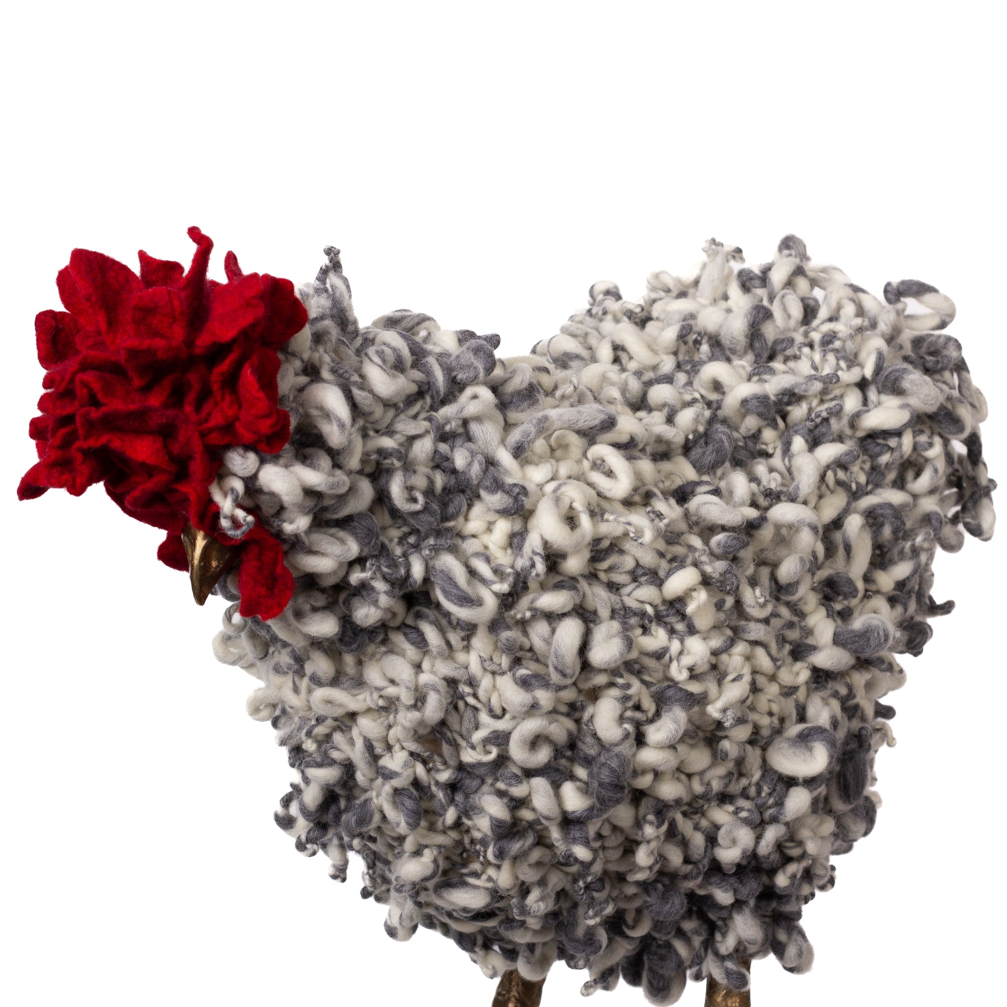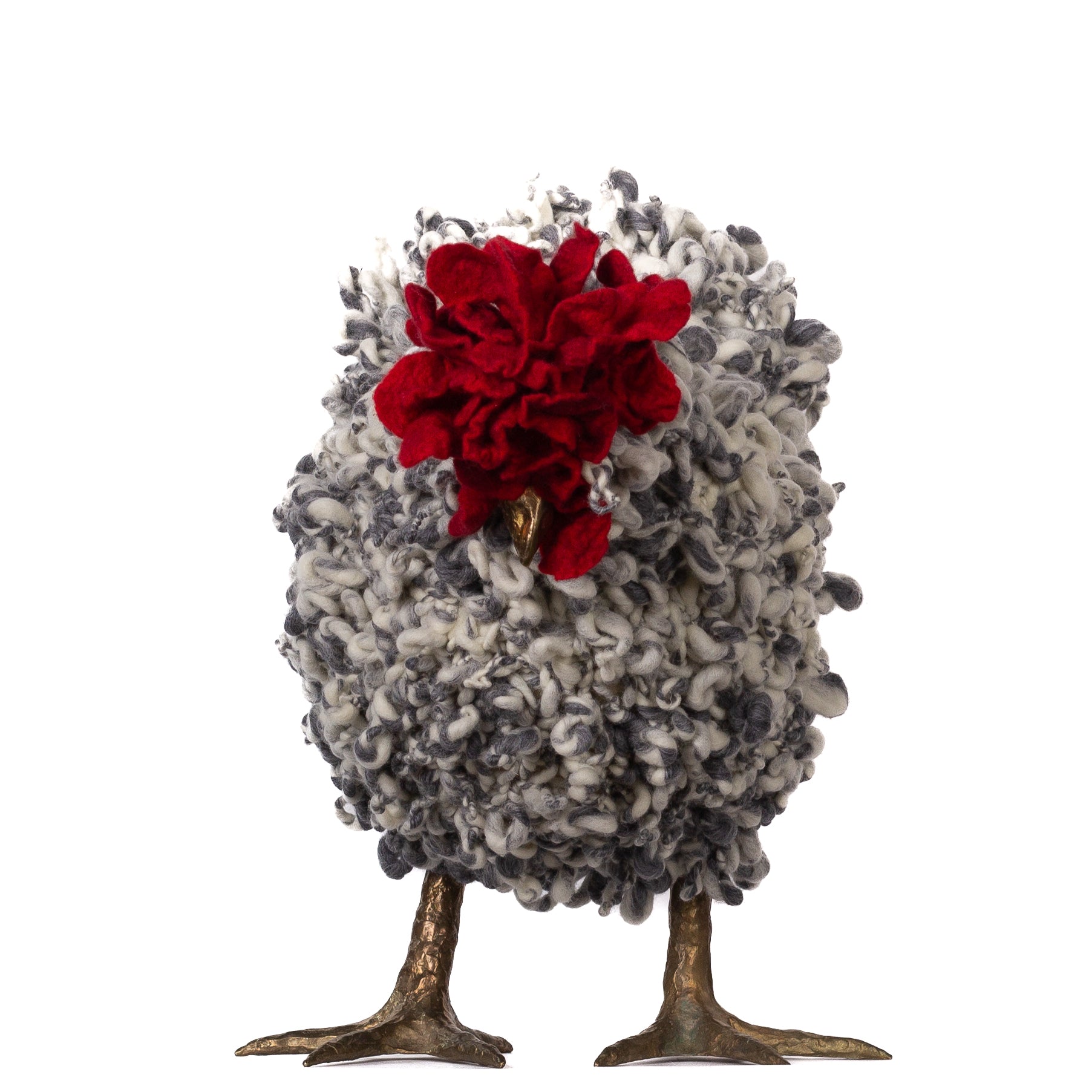 The chickens are sculpted in Kansas City, Missouri with care and delight, upholstered to function as footstools. Each is one-of-a-kind, unique in posture and personality. A turned wood egg-shaped core stands on bronze feet and is connected to a bronze beak. Feathers are fashioned with traditional fiber art techniques- dyeing, felting, spinning, knitting- and are stitched by hand. And a surprise? Their heads bob.