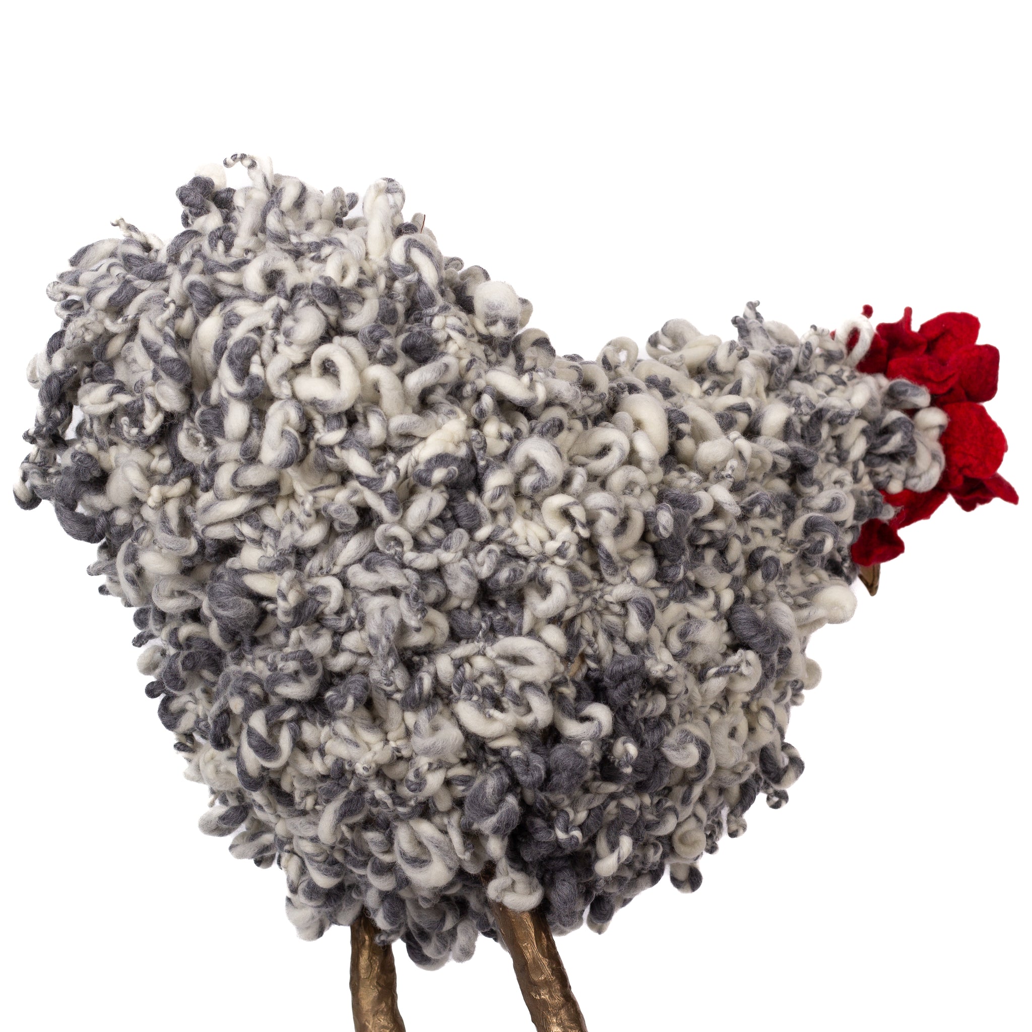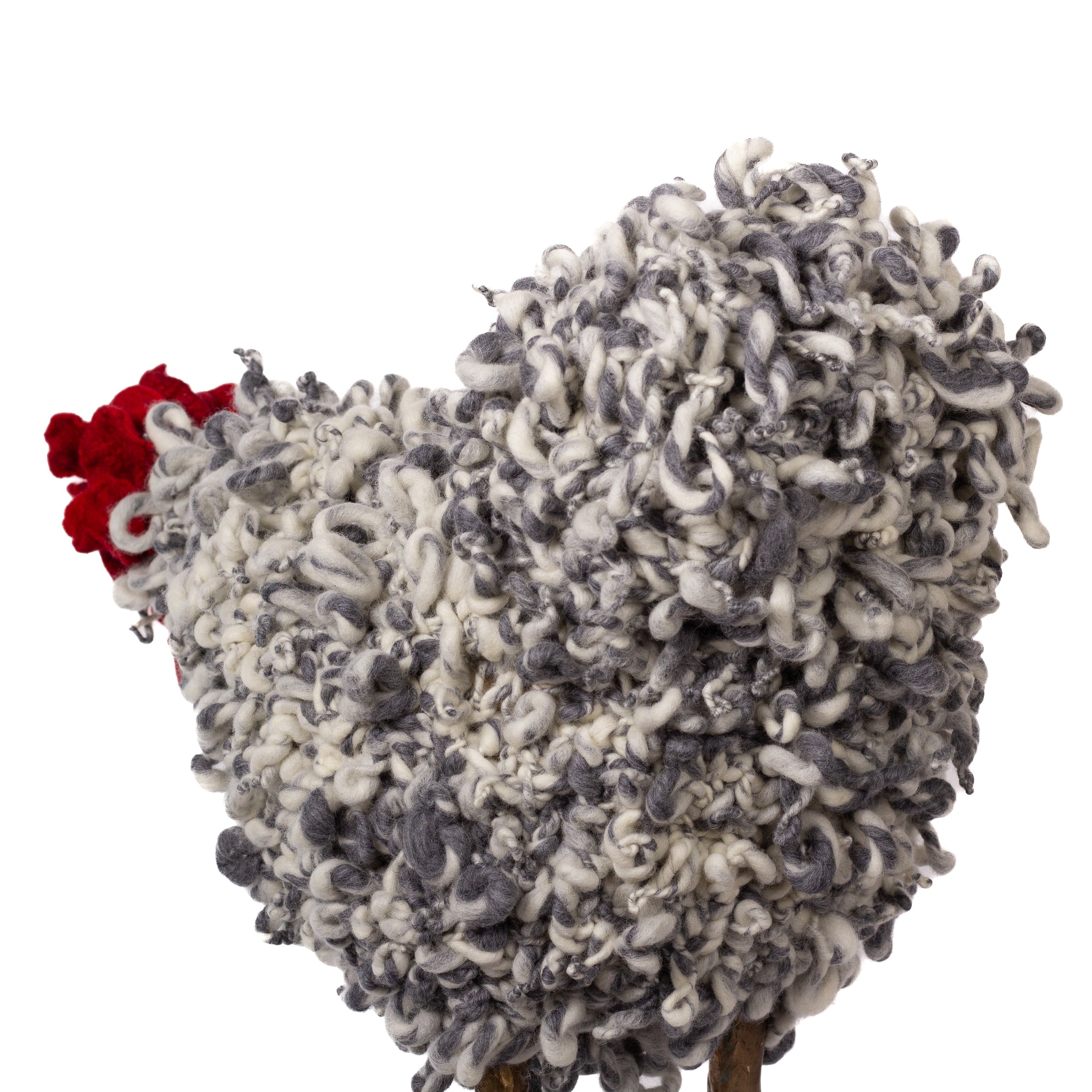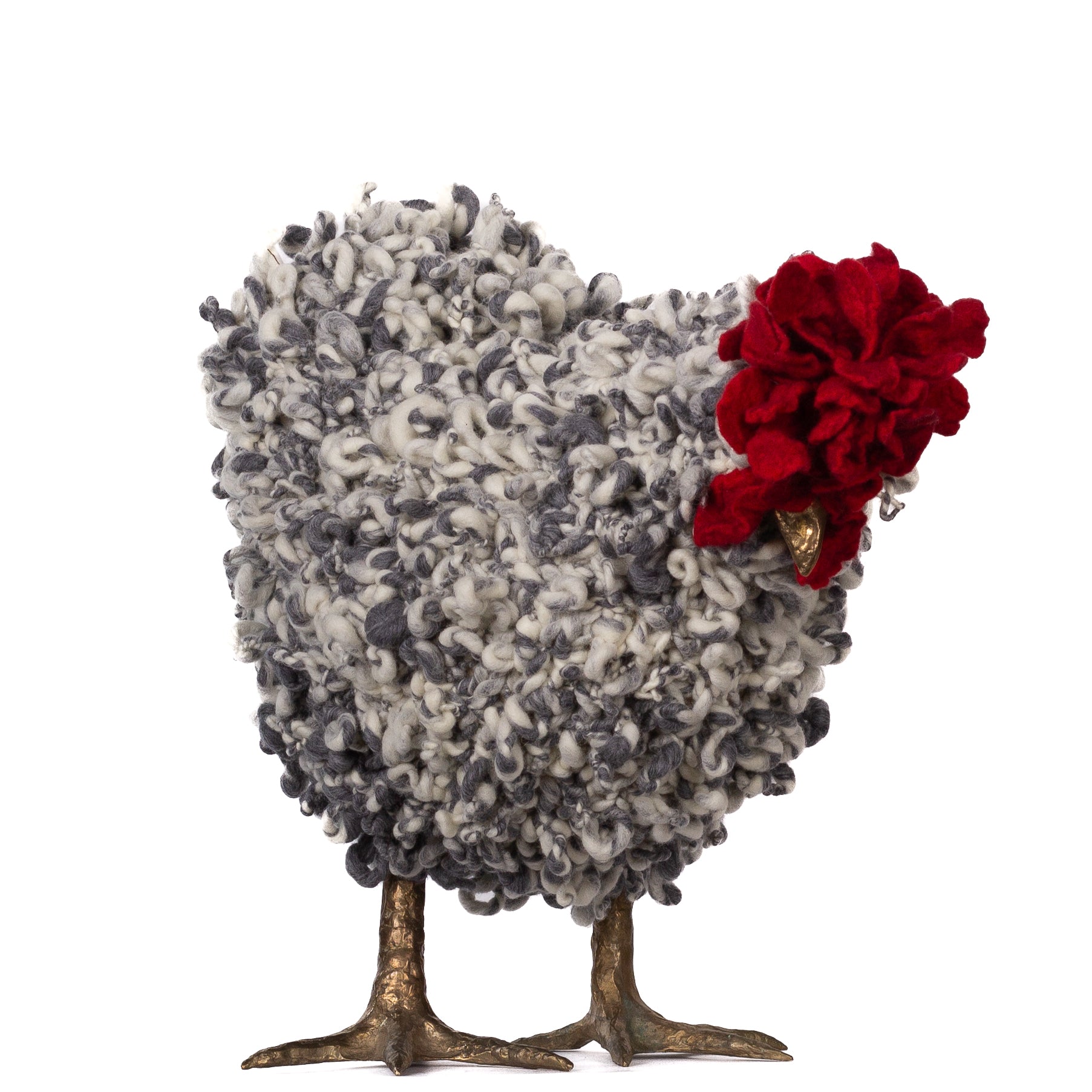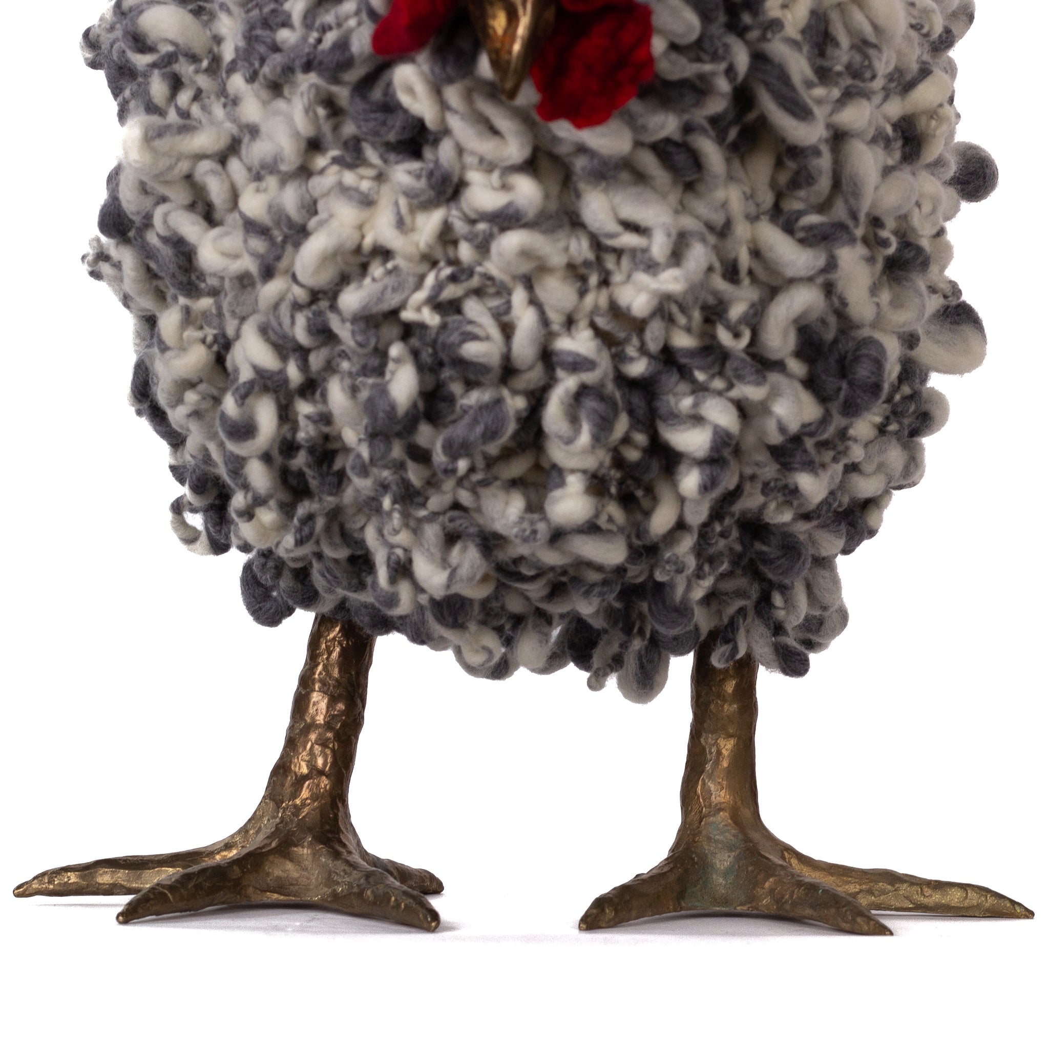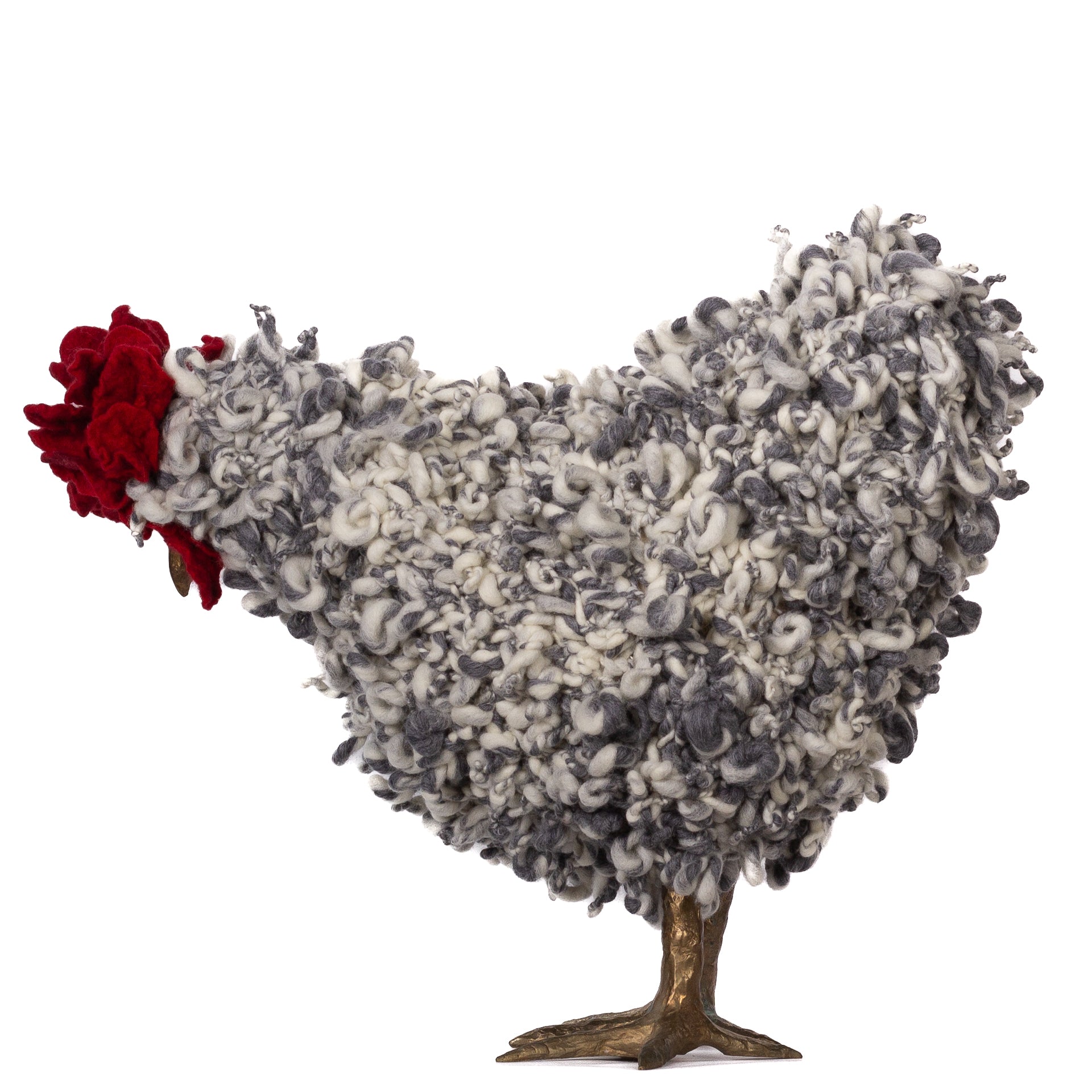 The chickens are sculpted in Kansas City, Missouri with care and delight, upholstered to function as footstools. Each is one-of-a-kind, unique in posture and personality. A turned wood egg-shaped core stands on bronze feet and is connected to a bronze beak. Feathers are fashioned with traditional fiber art techniques- dyeing, felting, spinning, knitting- and are stitched by hand. And a surprise? Their heads bob.