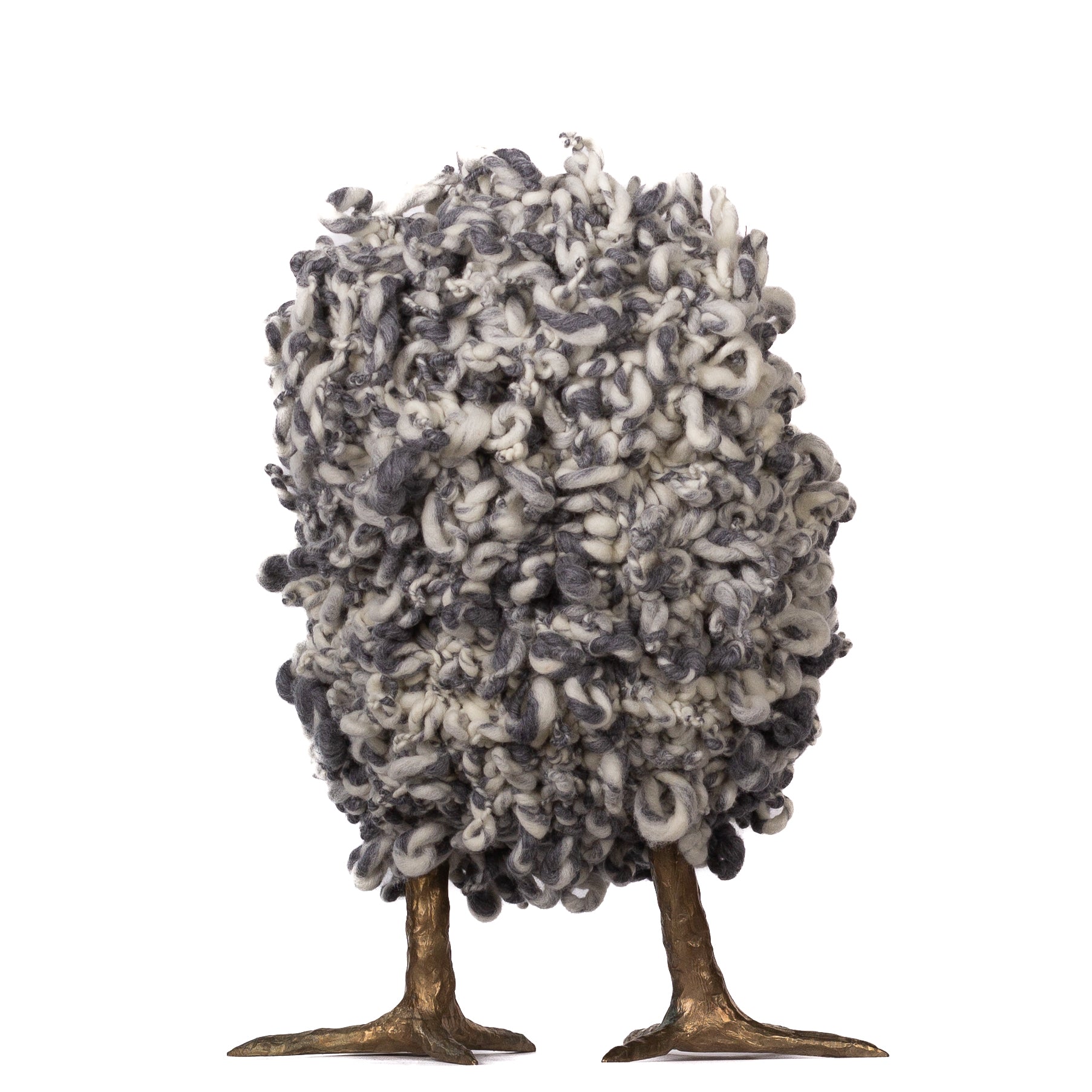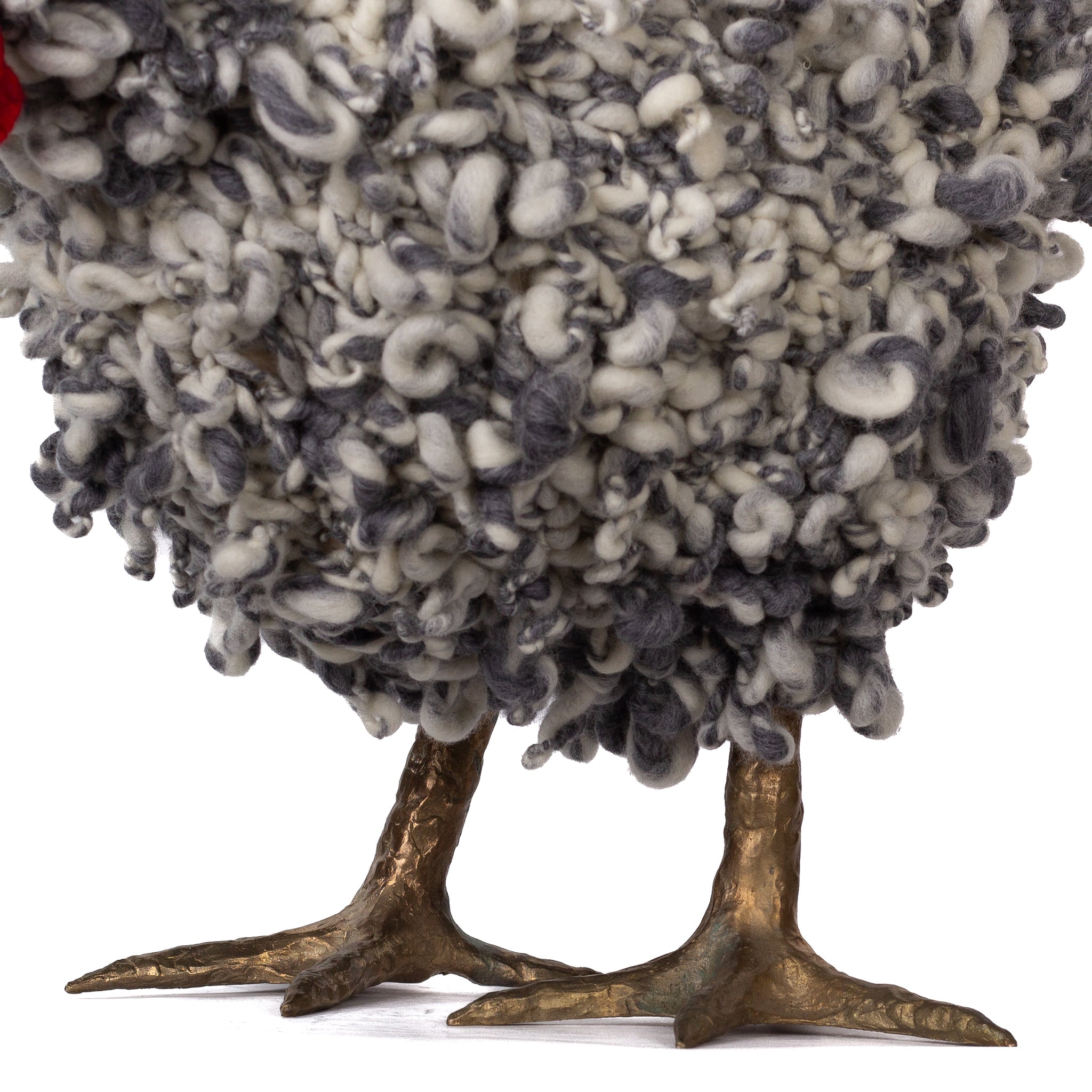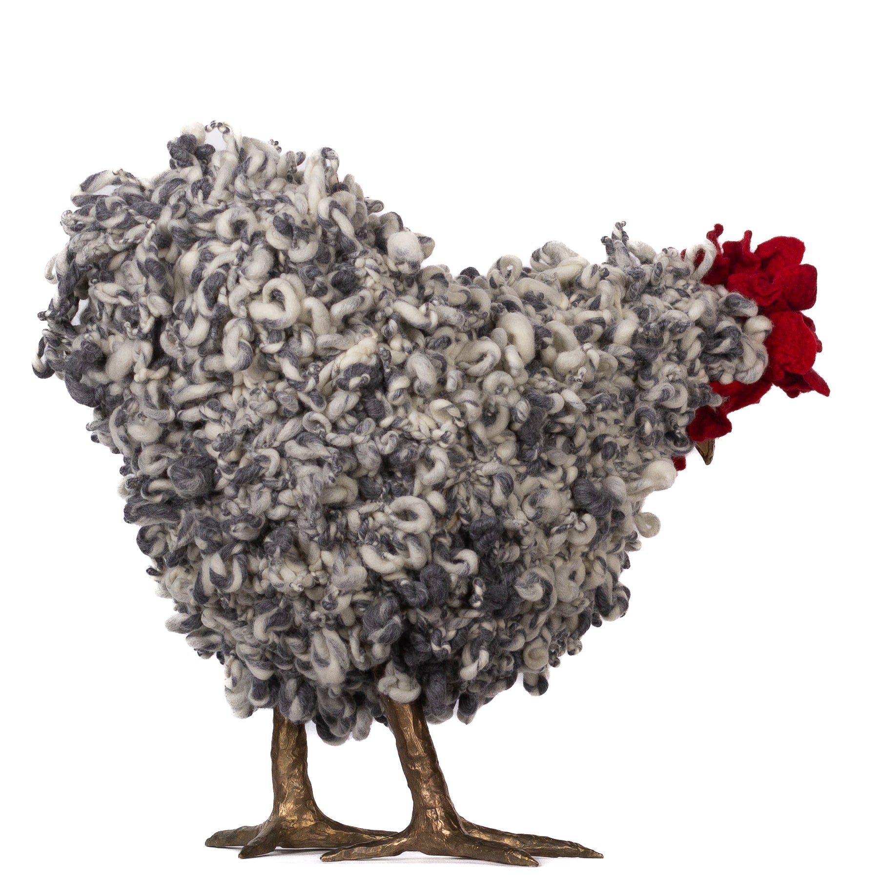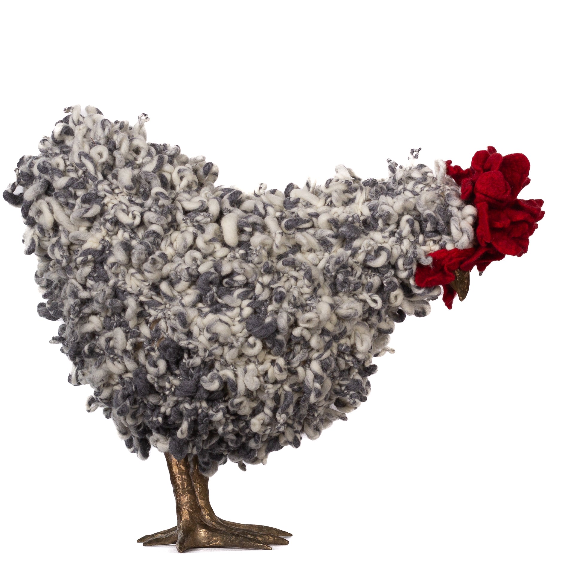 The chickens are sculpted in Kansas City, Missouri with care and delight, upholstered to function as footstools. Each is one-of-a-kind, unique in posture and personality. A turned wood egg-shaped core stands on bronze feet and is connected to a bronze beak. Feathers are fashioned with traditional fiber art techniques- dyeing, felting, spinning, knitting- and are stitched by hand. And a surprise? Their heads bob.