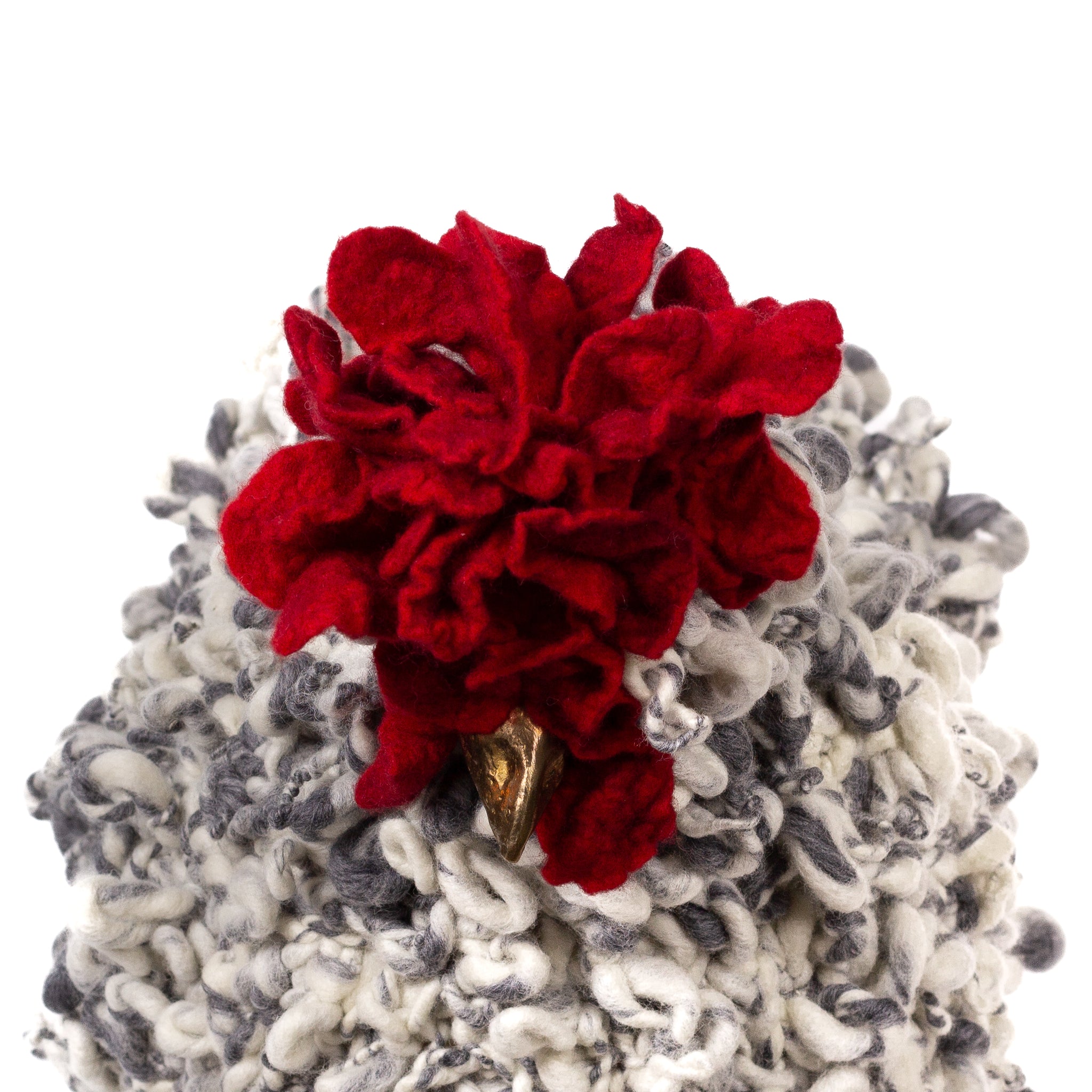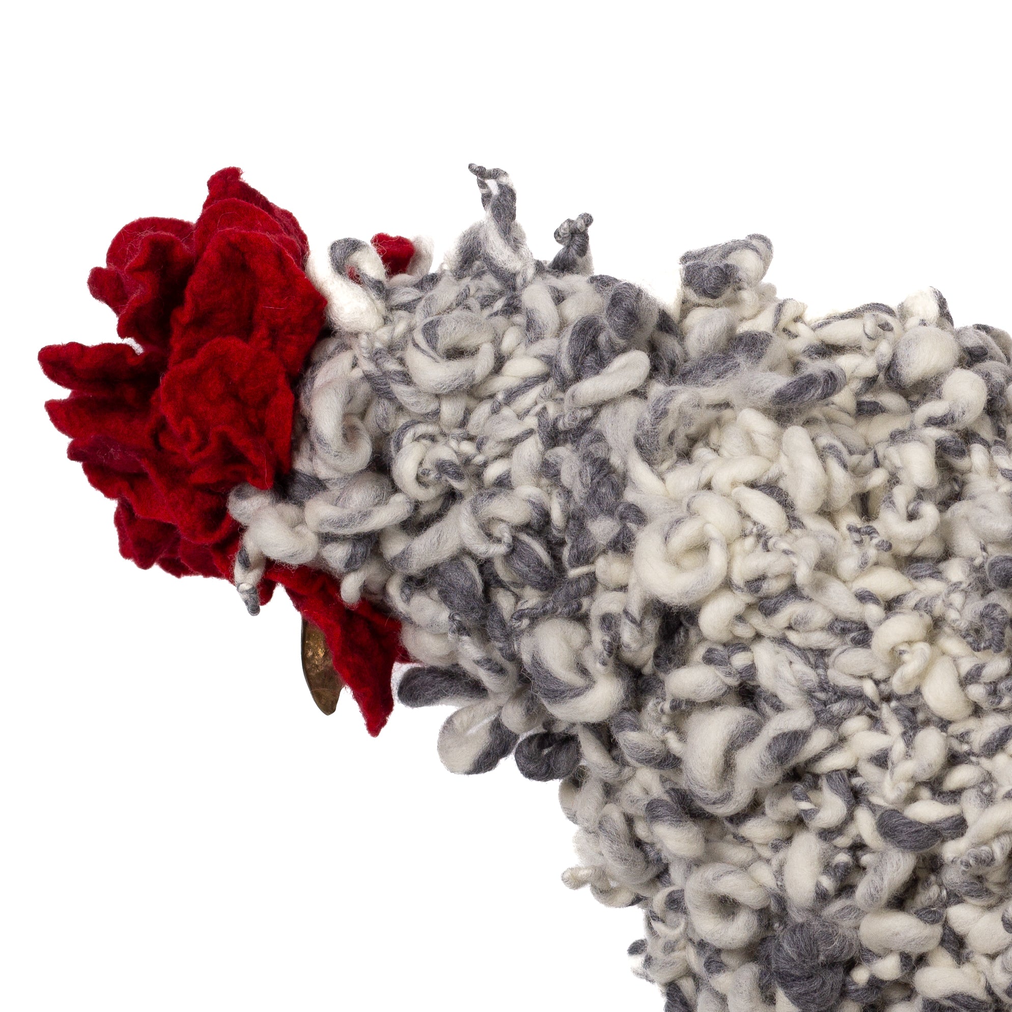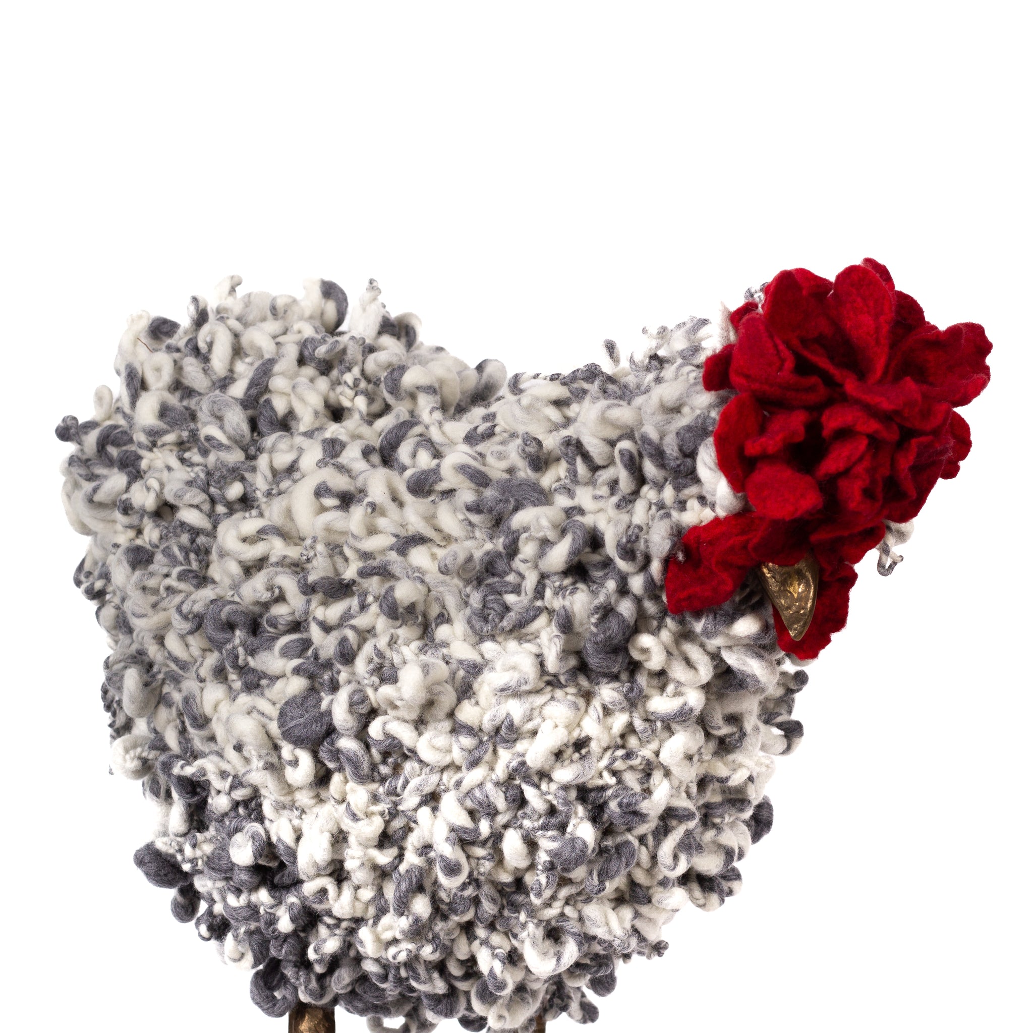 Ellen is a Chicken Little Footstool whose feathers are fashioned with hand-knit 100% Merino wool. She is looking for a good home.