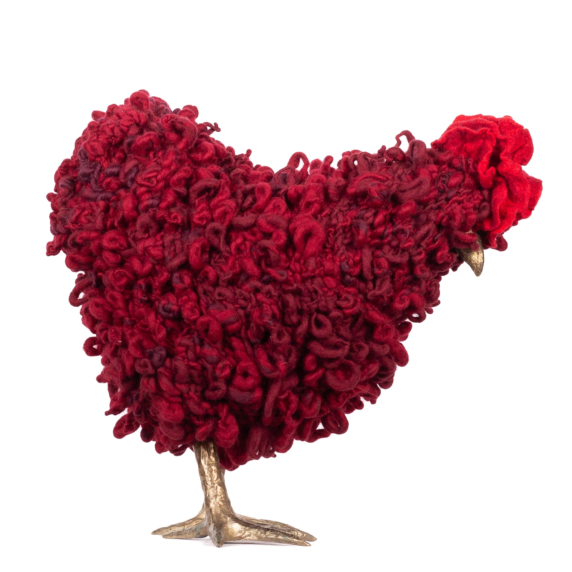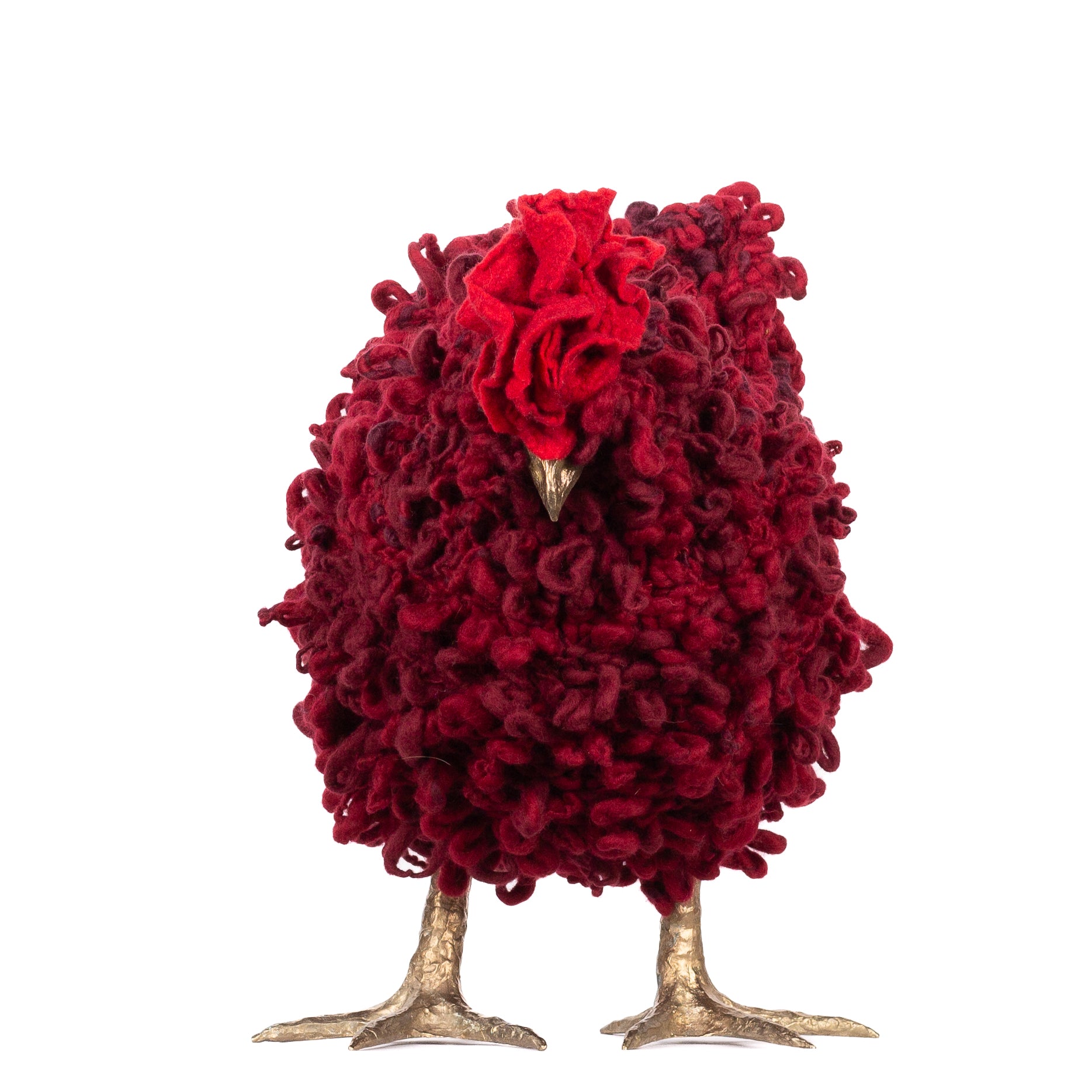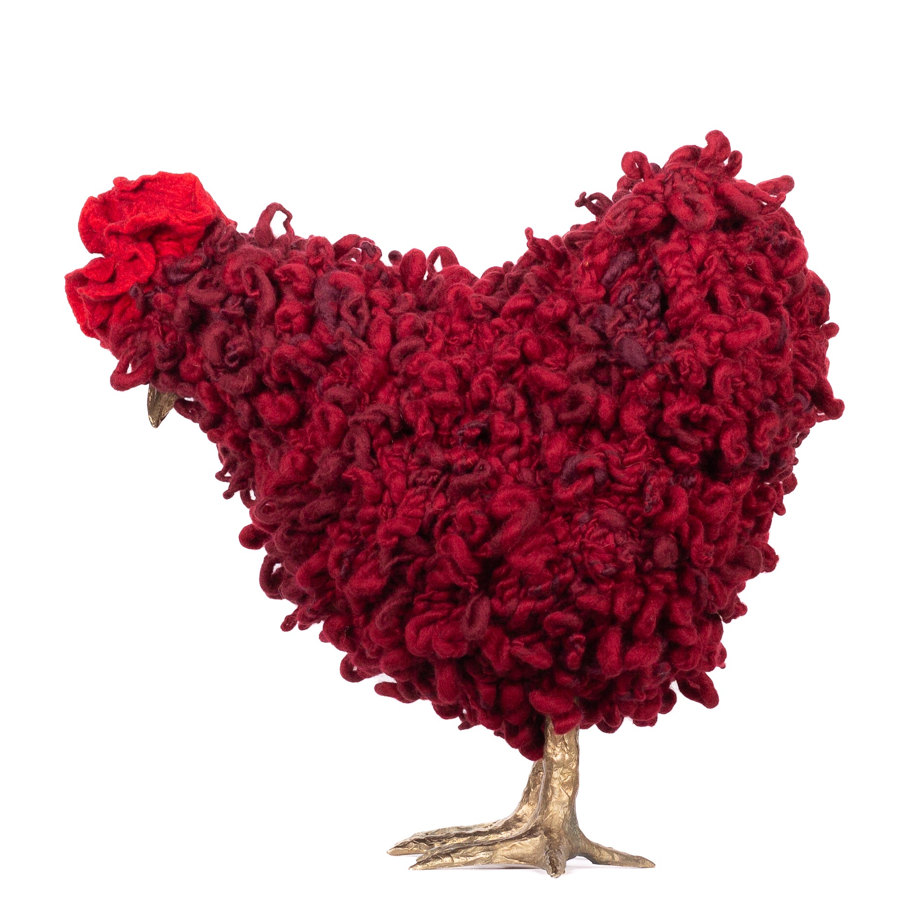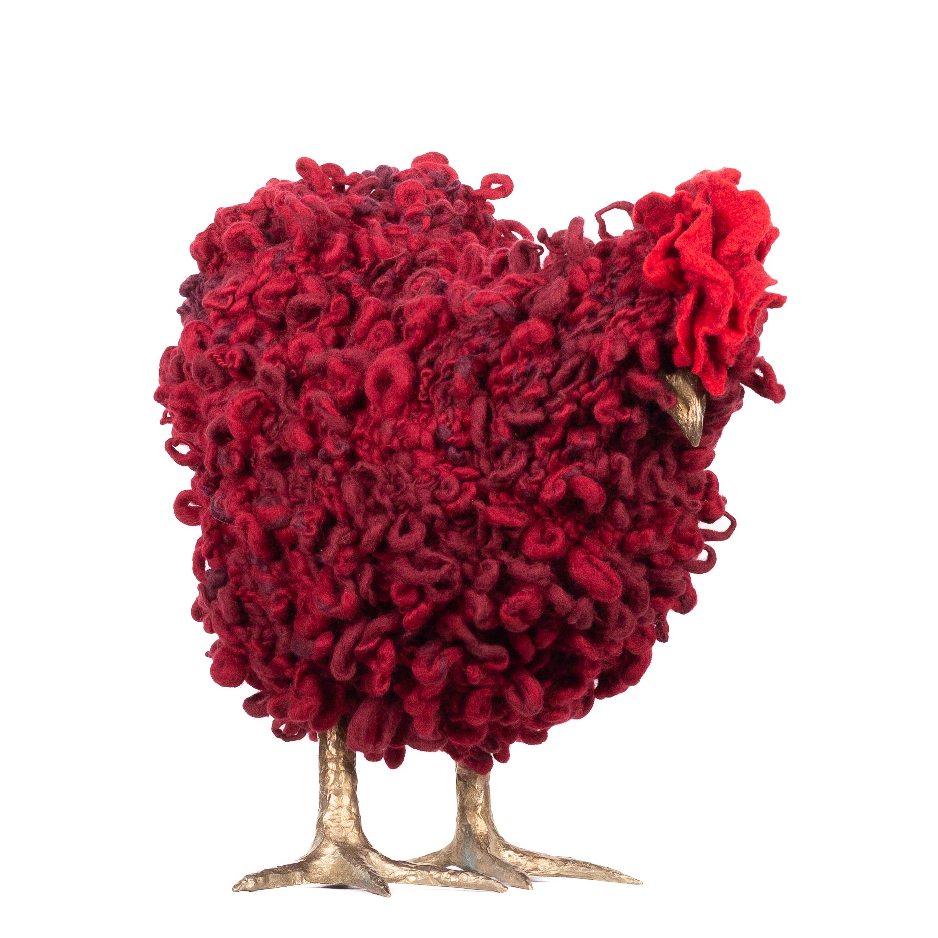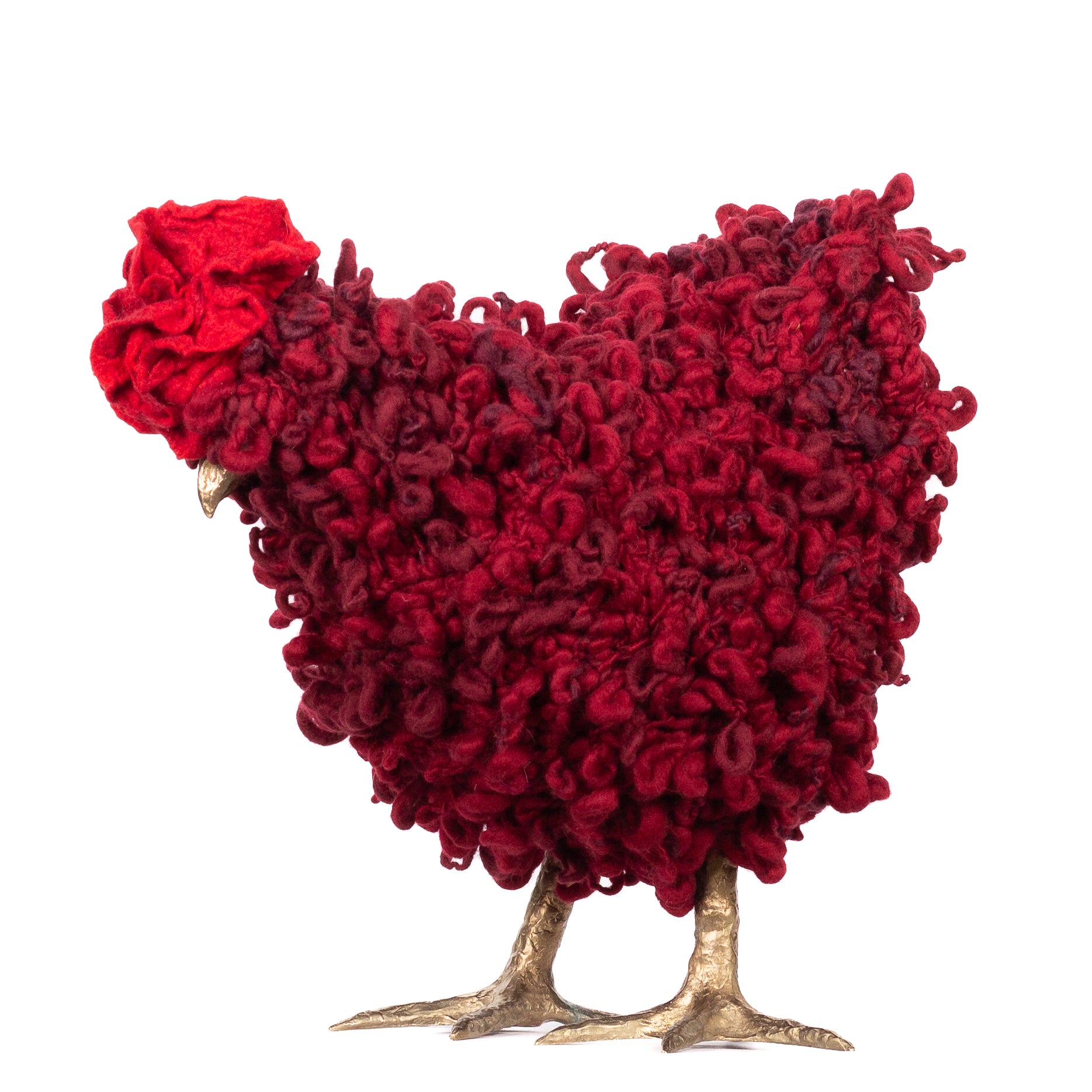 The chickens are sculpted in Kansas City, Missouri with care and delight, upholstered to function as footstools. Each is one-of-a-kind, unique in posture and personality. A turned wood egg-shaped core stands on bronze feet and is connected to a bronze beak. Feathers are fashioned with traditional fiber art techniques- dyeing, felting, spinning, knitting- and are stitched by hand. And a surprise? Their heads bob.
