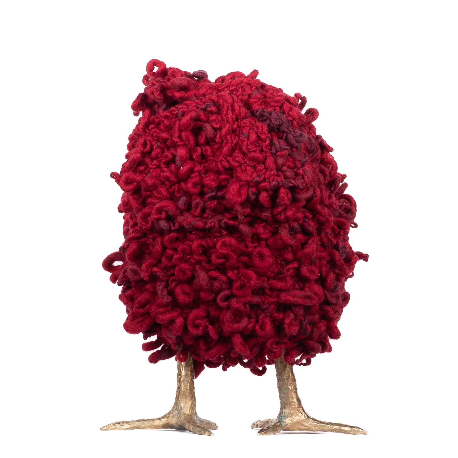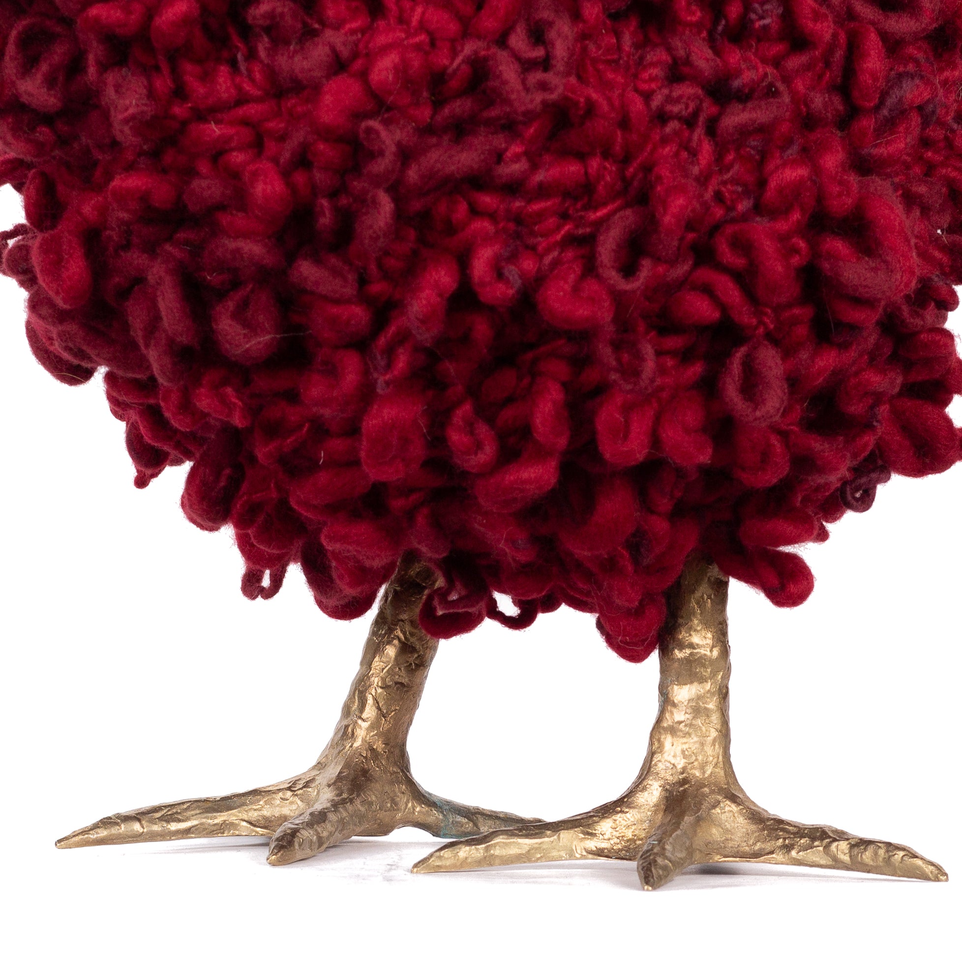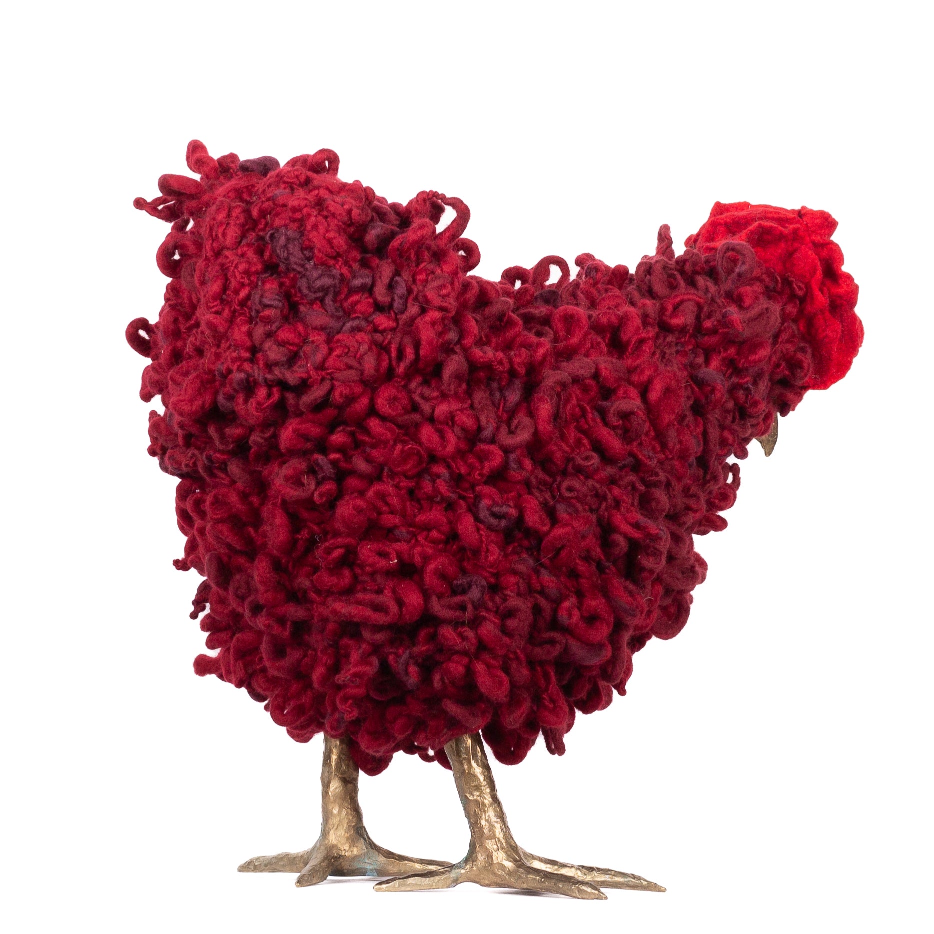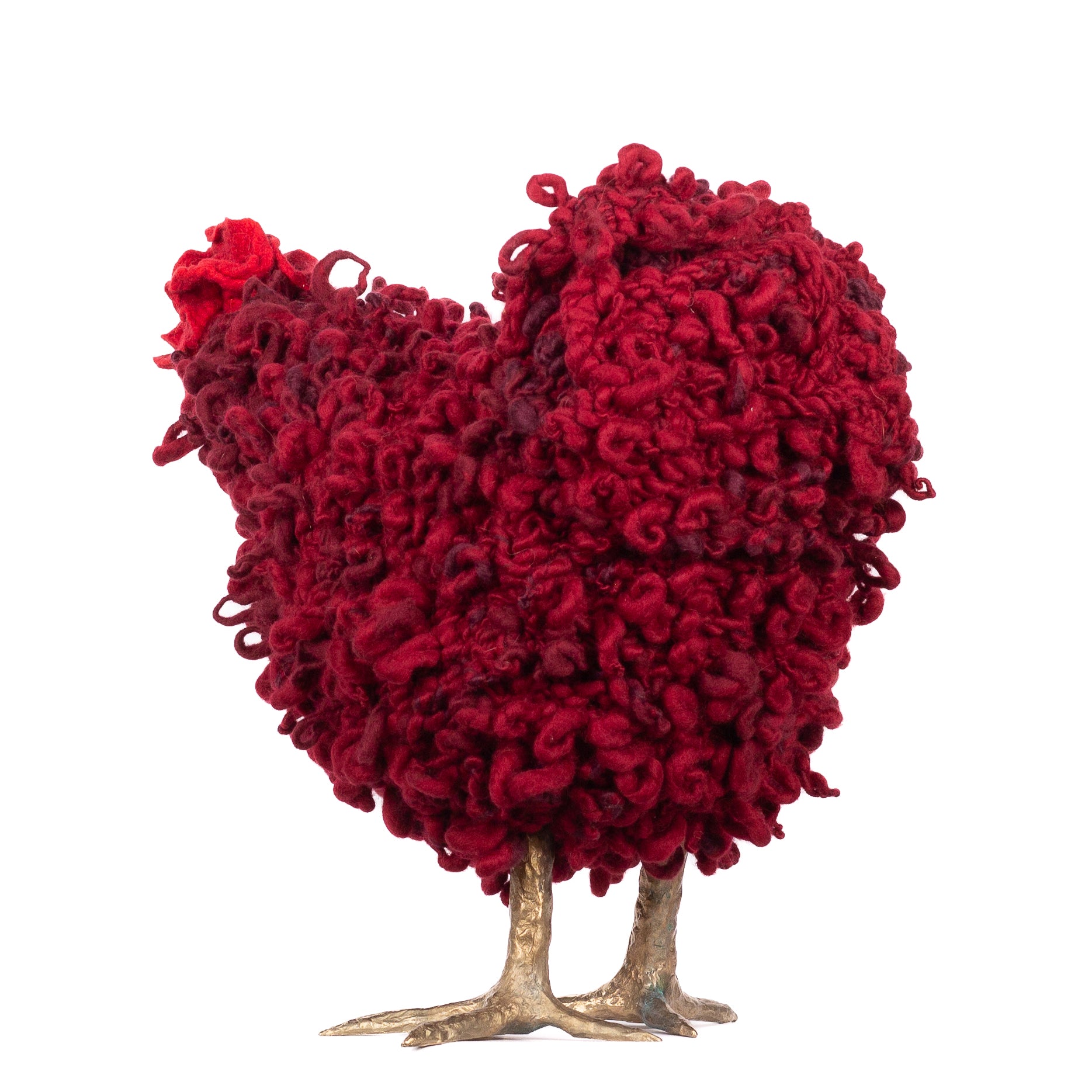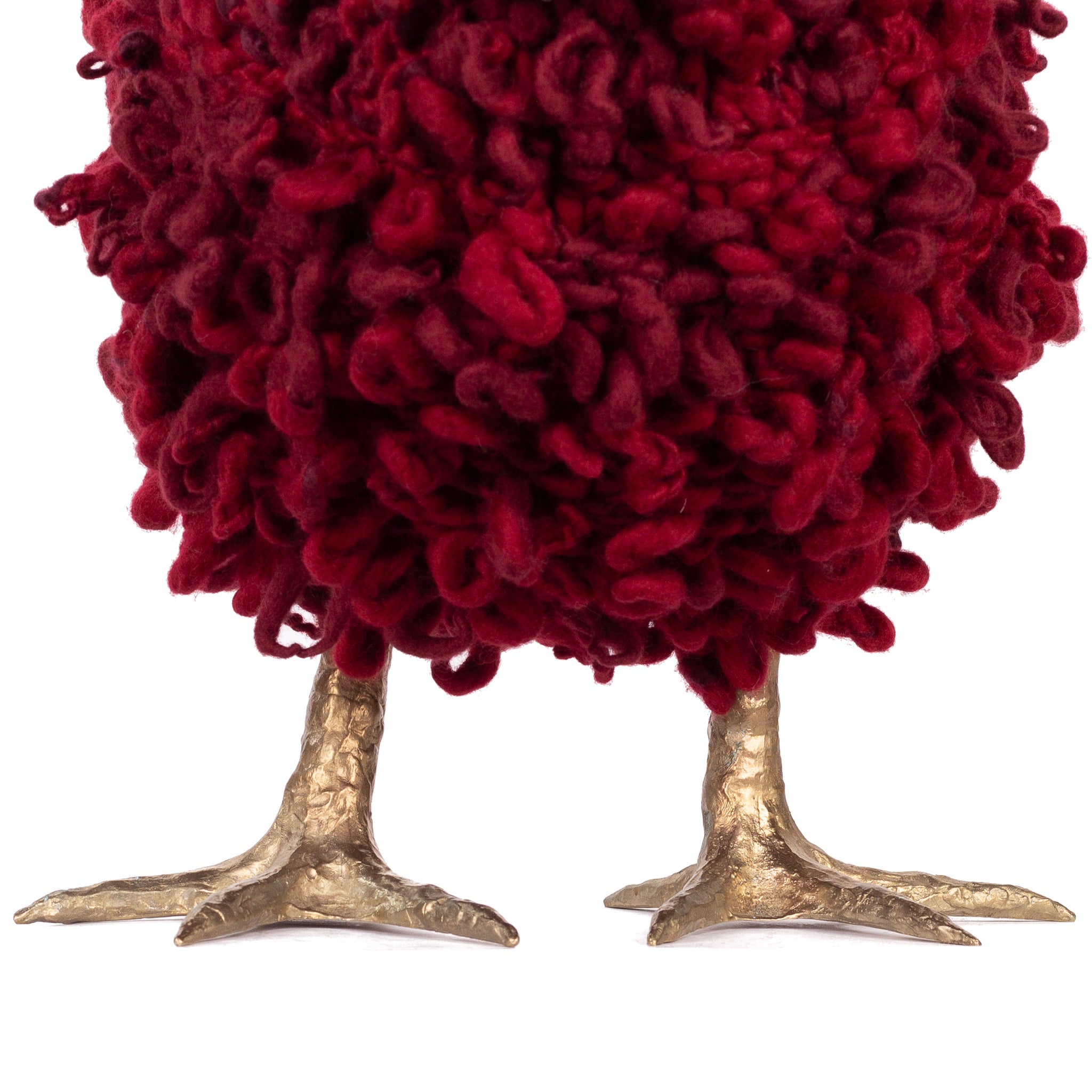 The chickens are sculpted in Kansas City, Missouri with care and delight, upholstered to function as footstools. Each is one-of-a-kind, unique in posture and personality. A turned wood egg-shaped core stands on bronze feet and is connected to a bronze beak. Feathers are fashioned with traditional fiber art techniques- dyeing, felting, spinning, knitting- and are stitched by hand. And a surprise? Their heads bob.