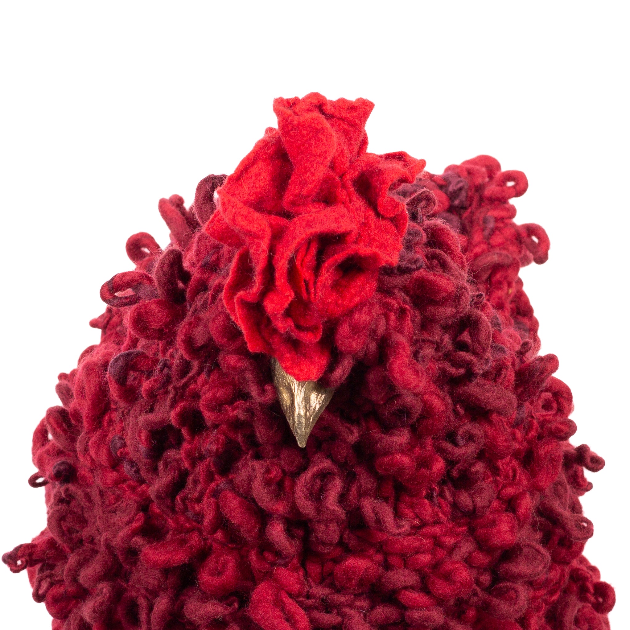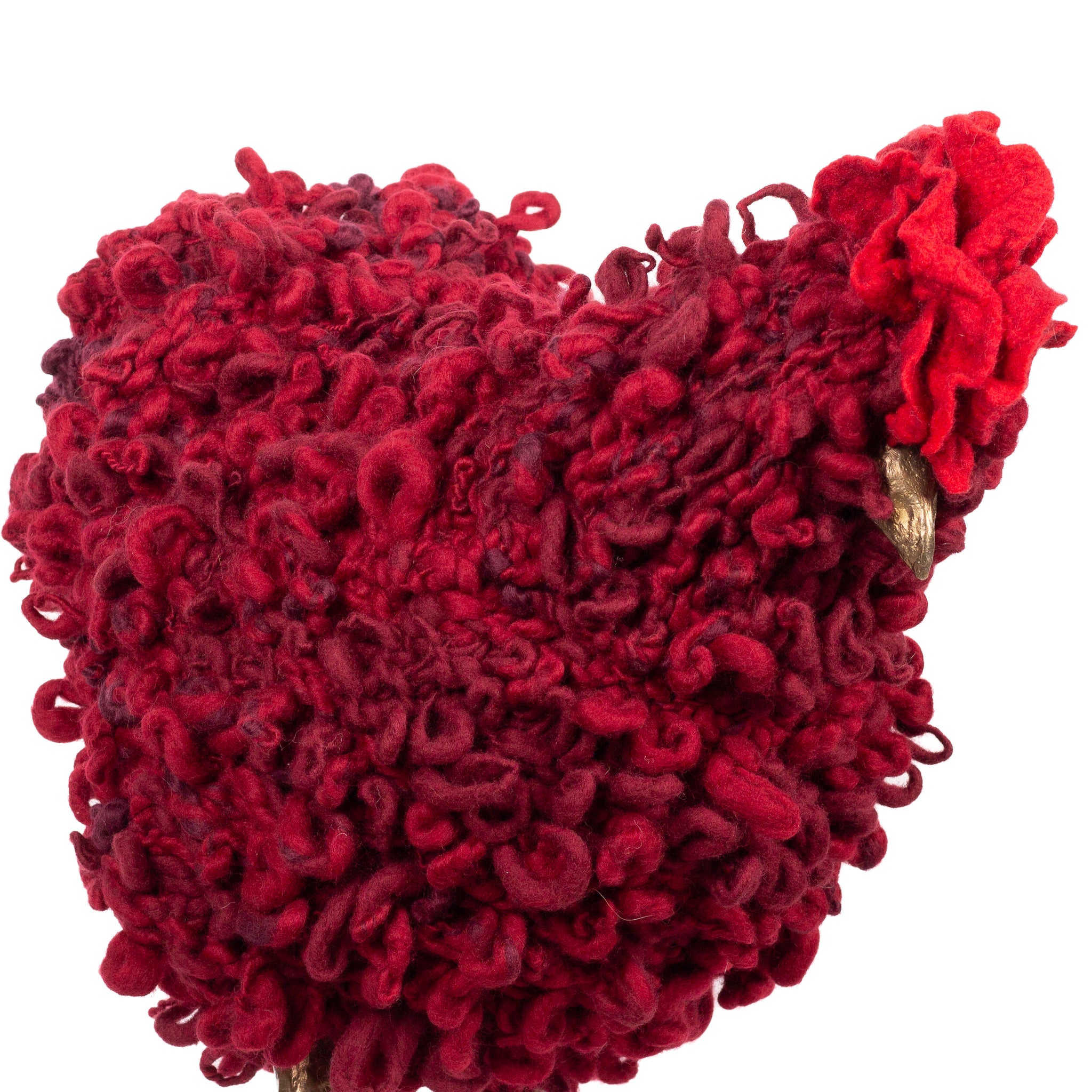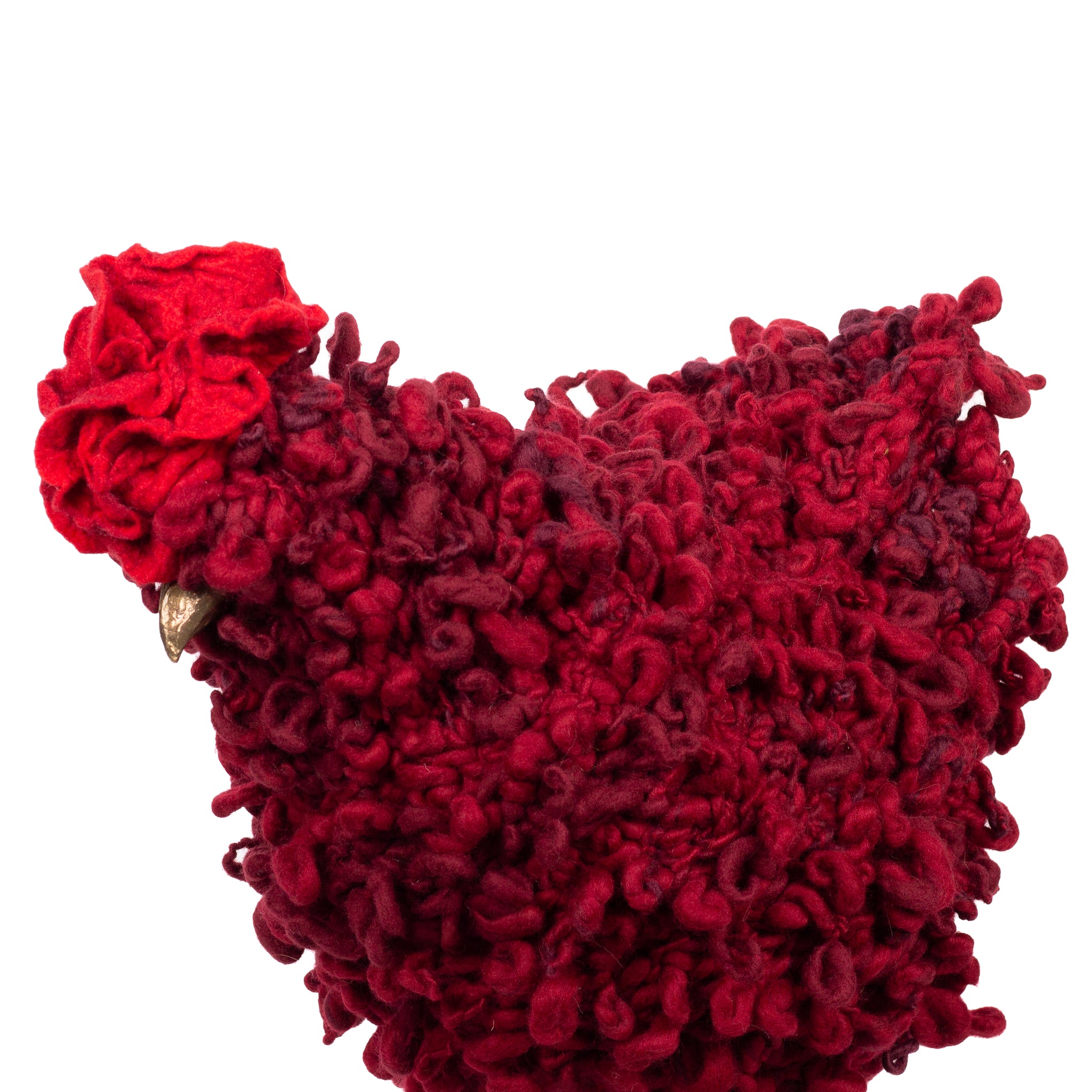 Jelly is a Chicken Little Footstool whose feathers are fashioned with hand-knit 100% Merino wool. She is looking for a good home.