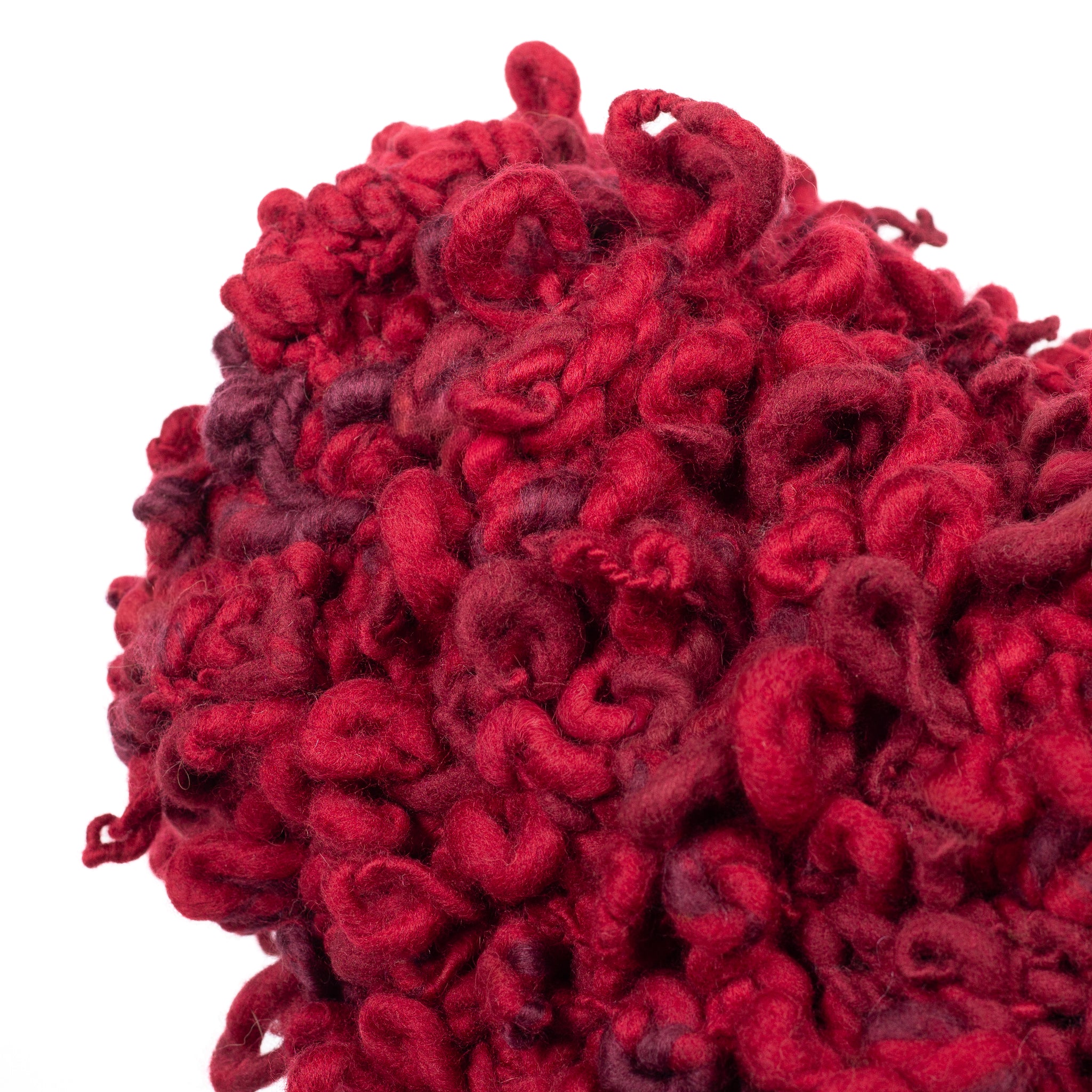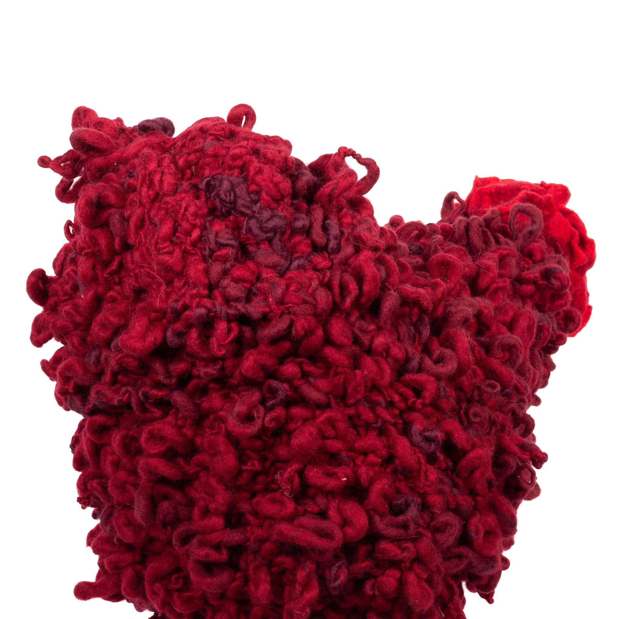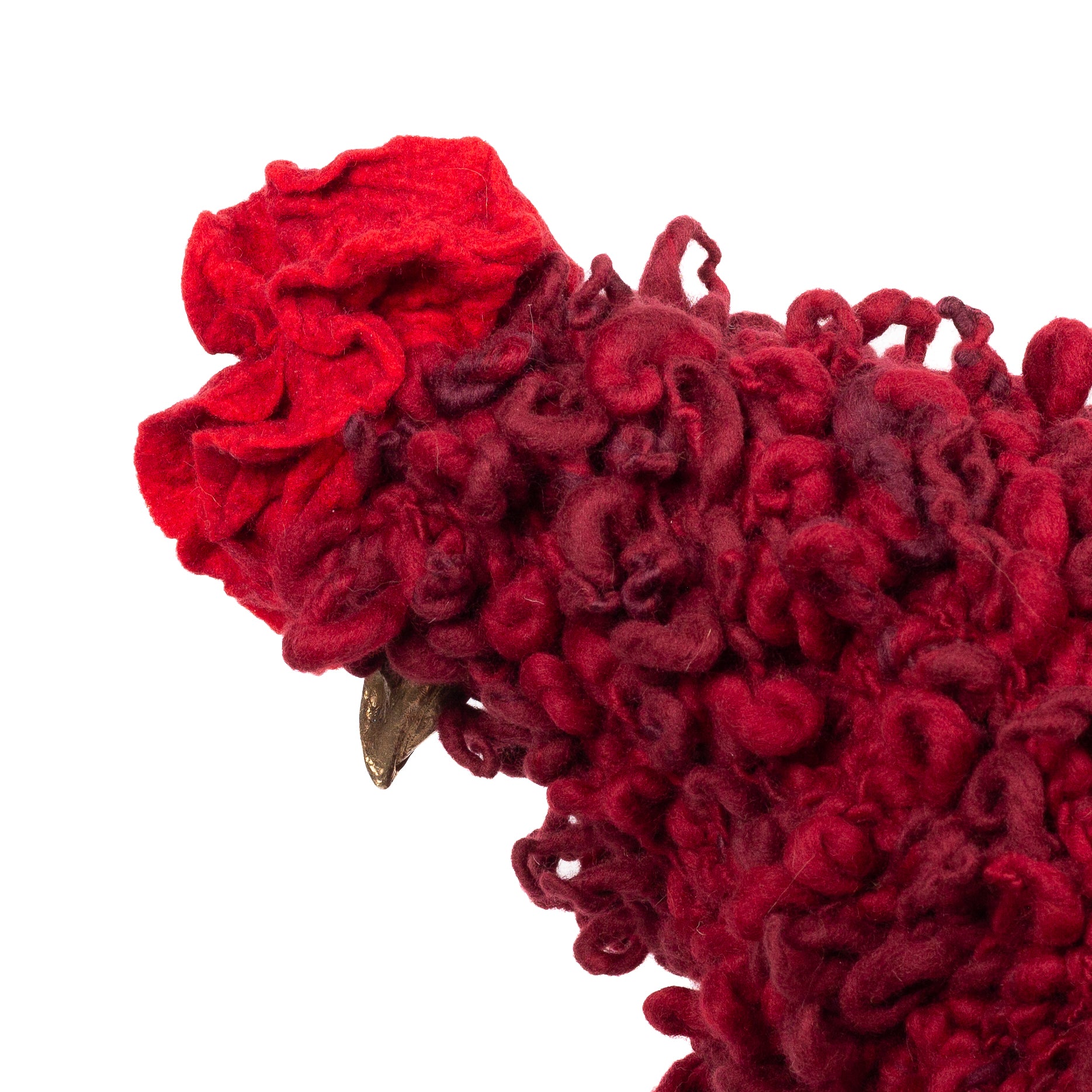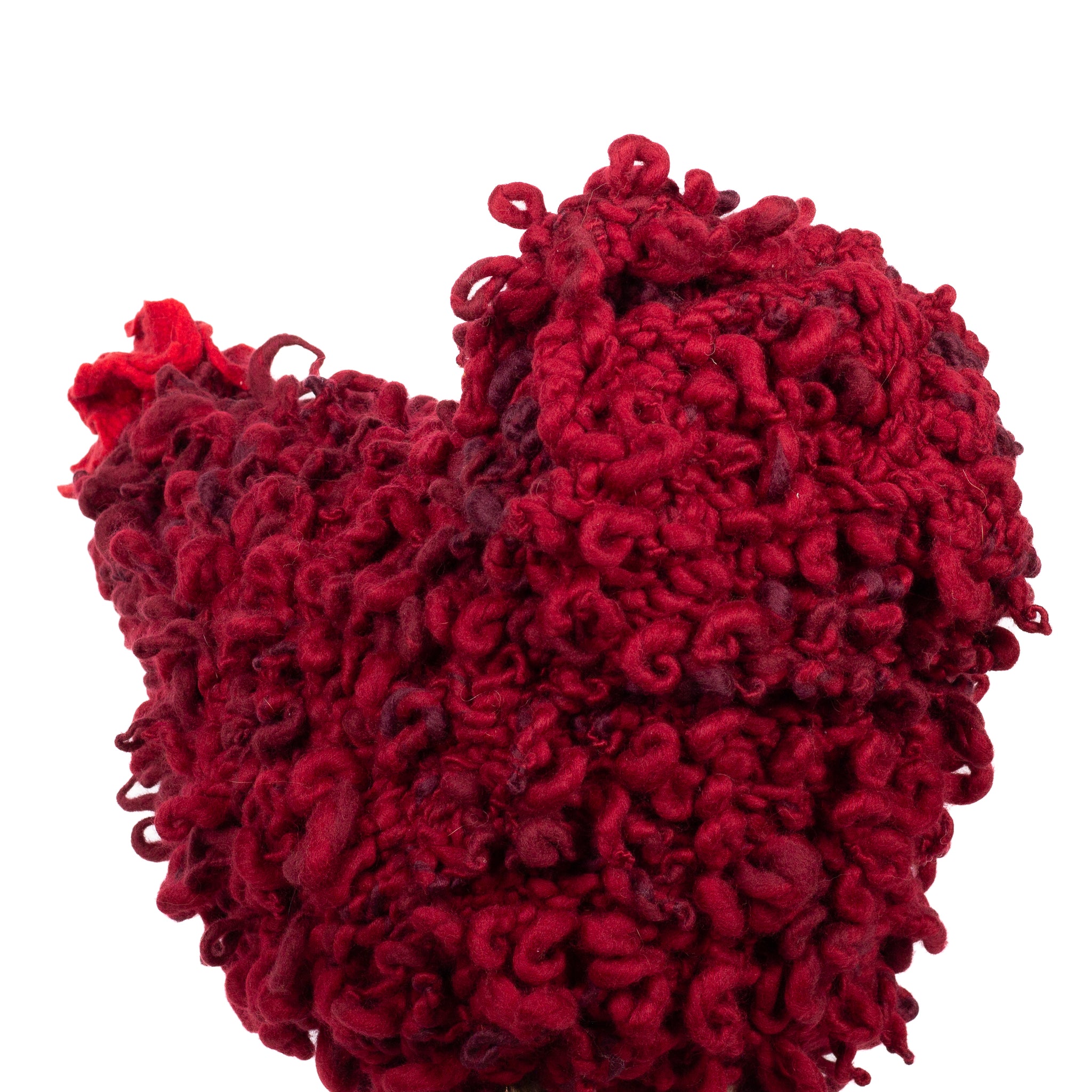 Jelly is a Chicken Little Footstool whose feathers are fashioned with hand-knit 100% Merino wool. She is looking for a good home.
