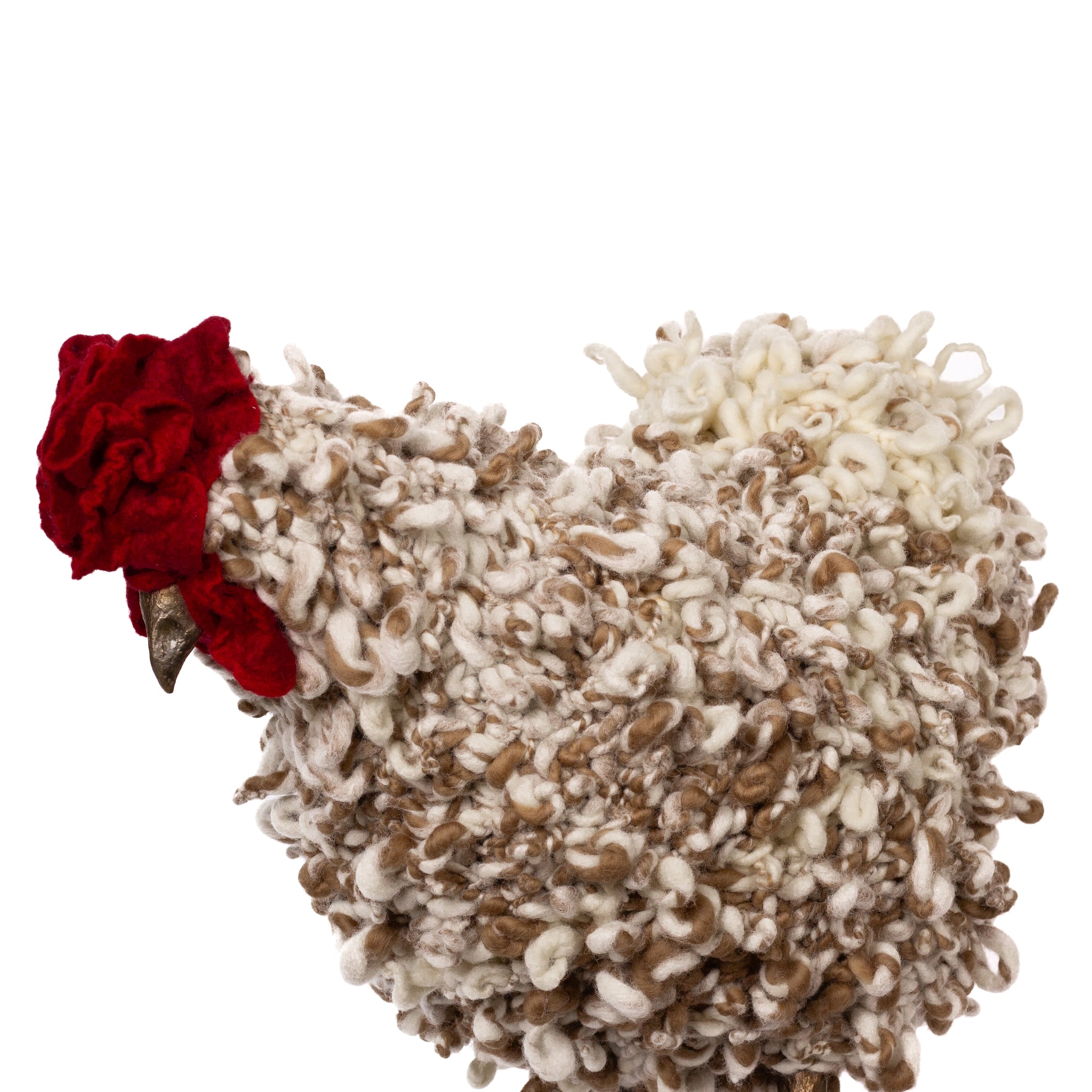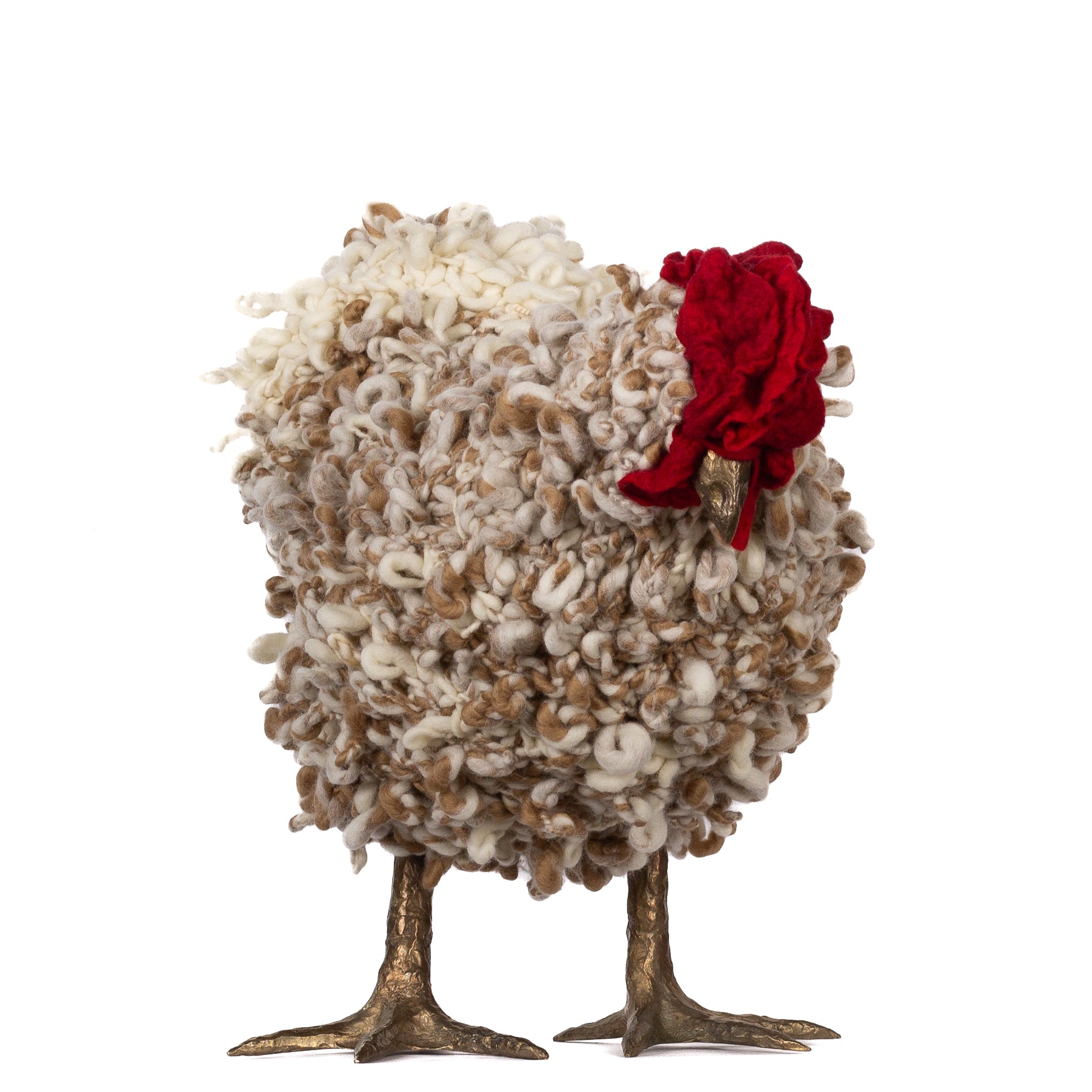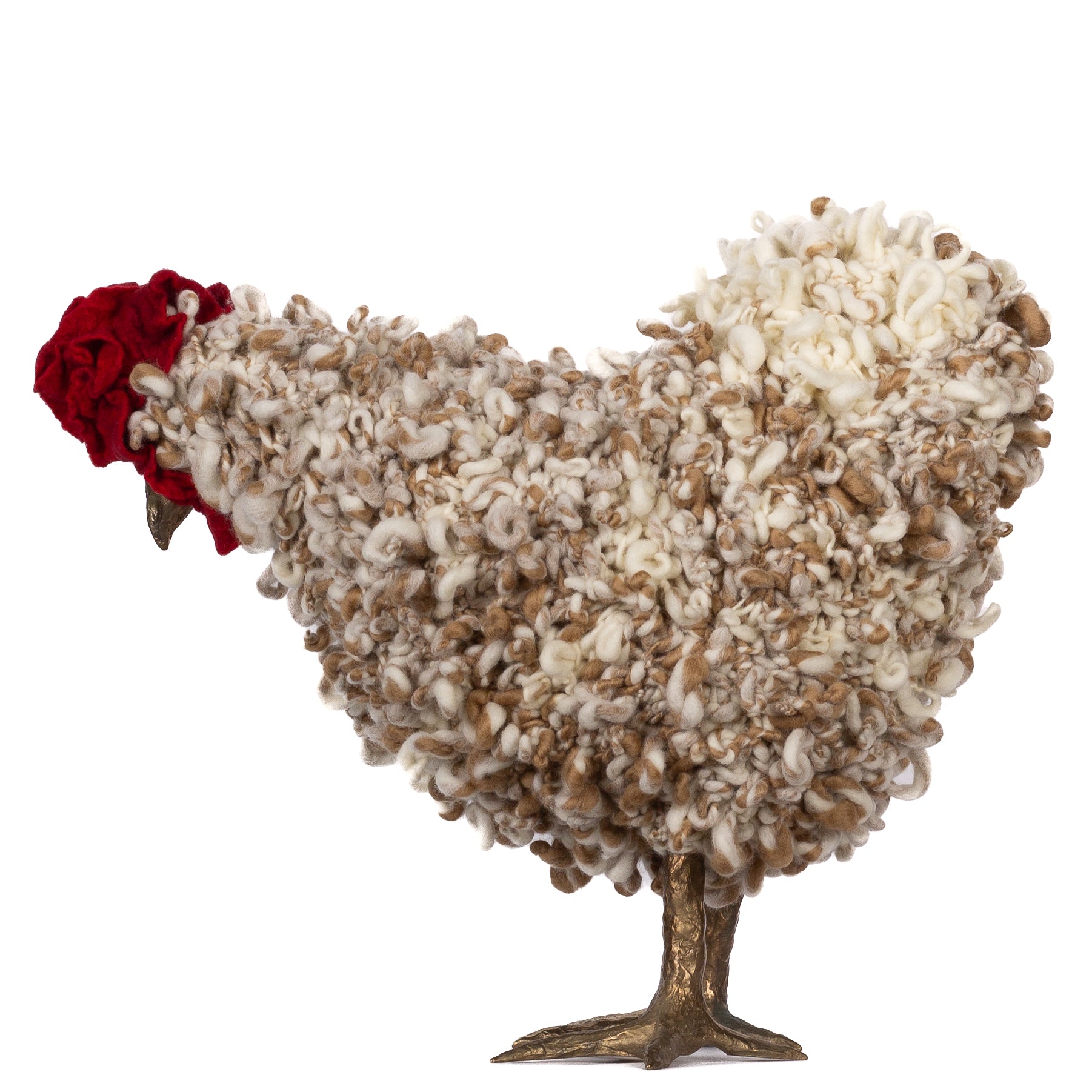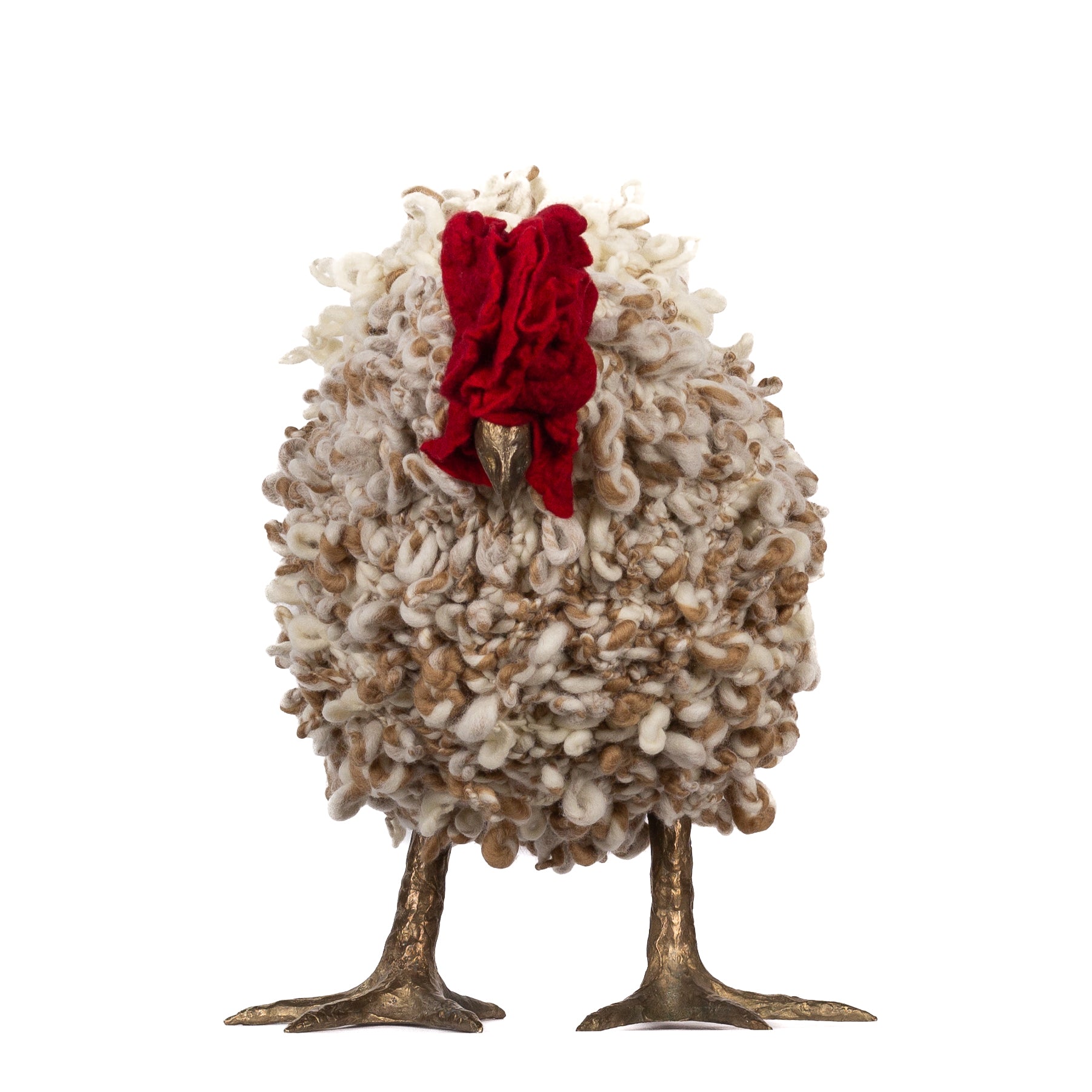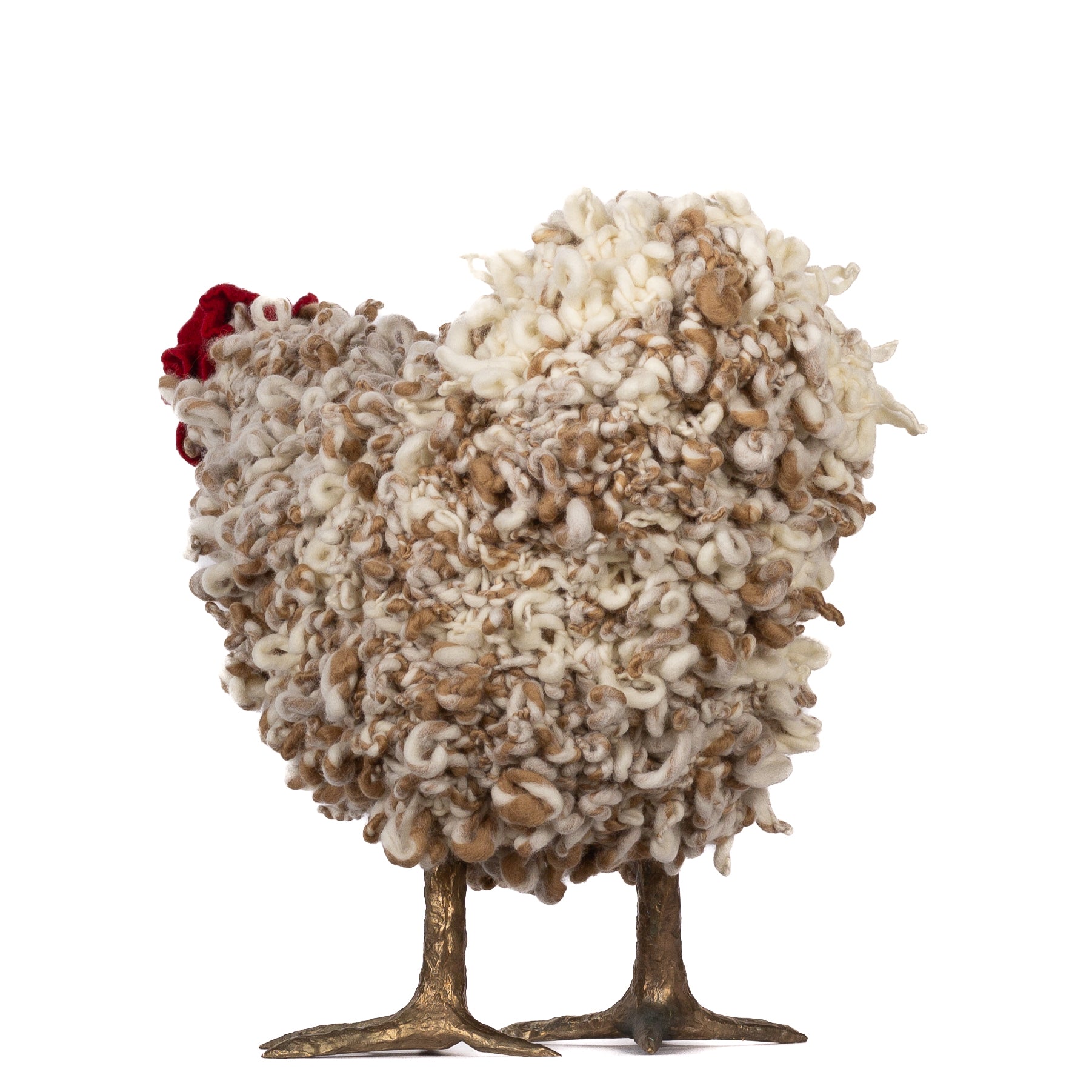 The chickens are sculpted in Kansas City, Missouri with care and delight, upholstered to function as footstools. Each is one-of-a-kind, unique in posture and personality. A turned wood egg-shaped core stands on bronze feet and is connected to a bronze beak. Feathers are fashioned with traditional fiber art techniques- dyeing, felting, spinning, knitting- and are stitched by hand. And a surprise? Their heads bob.