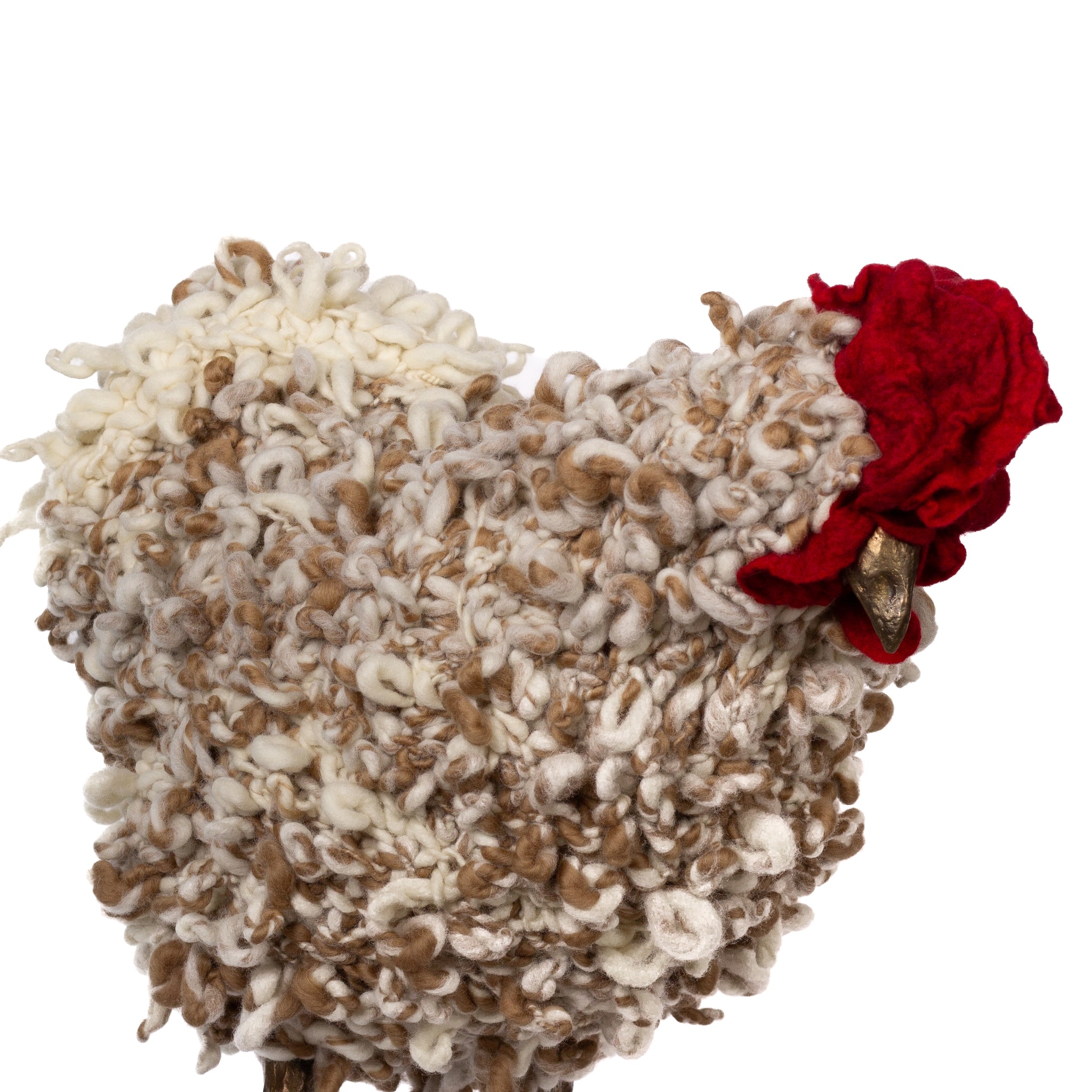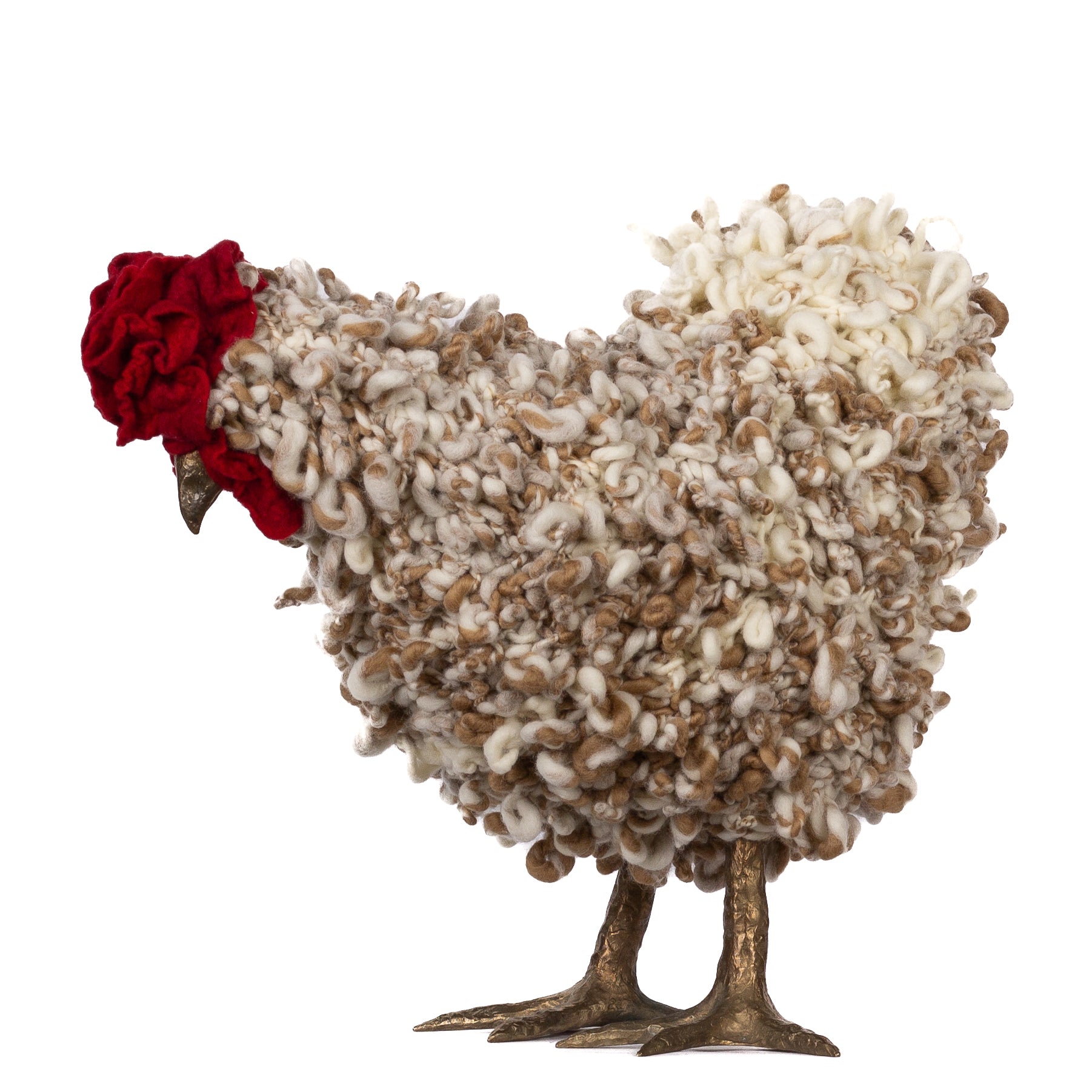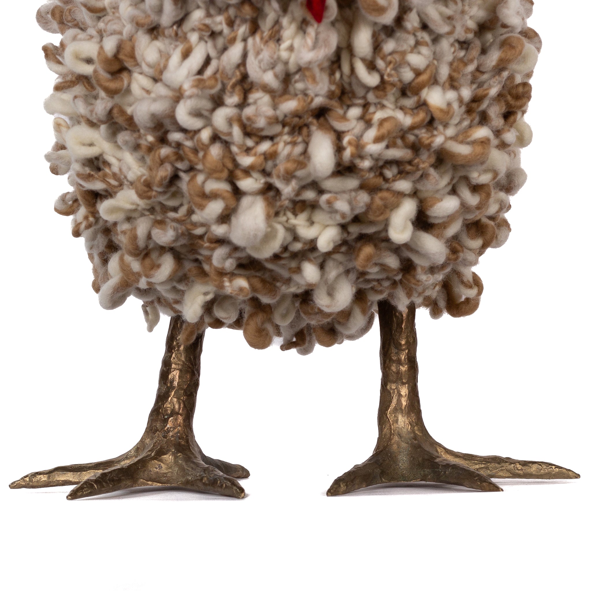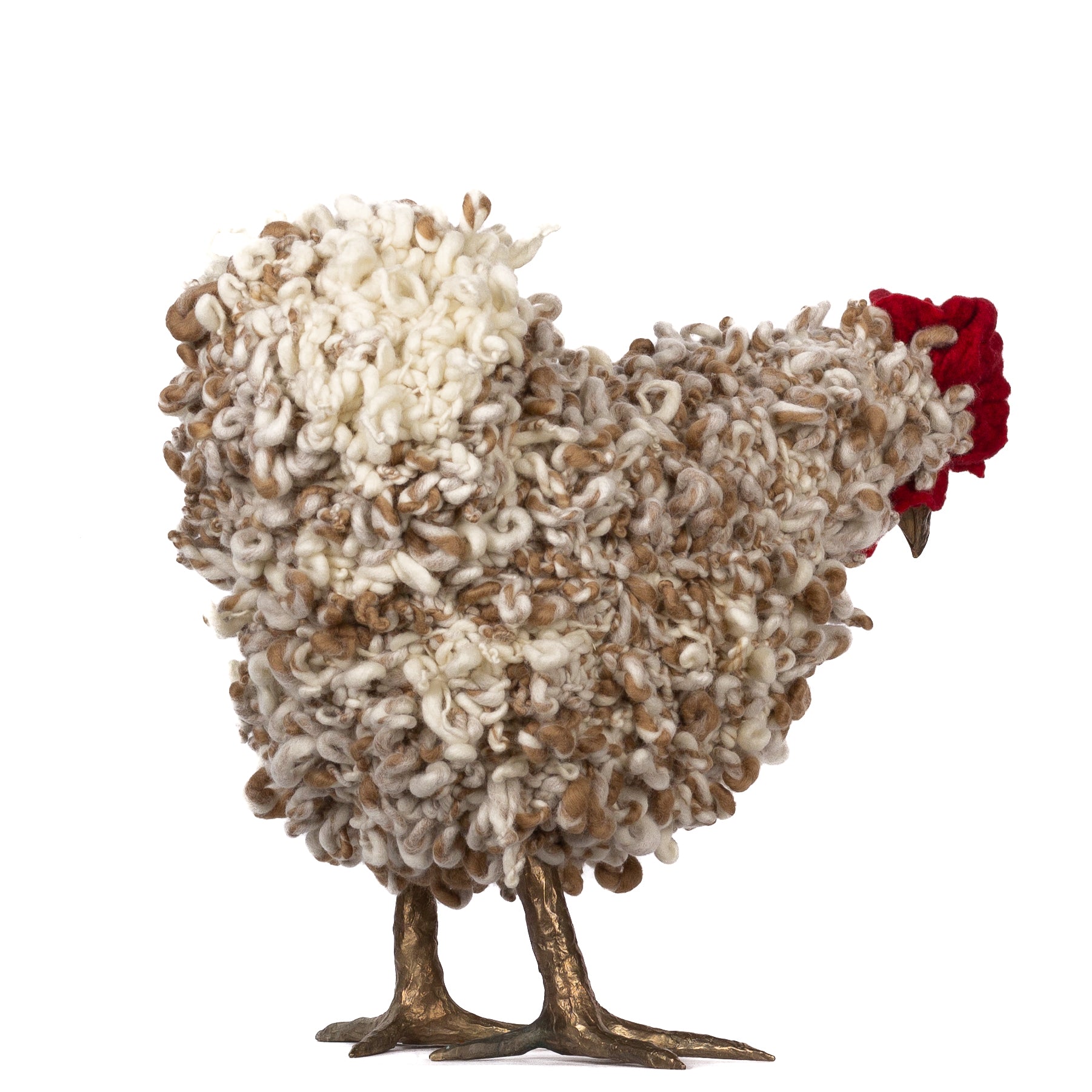 The chickens are sculpted in Kansas City, Missouri with care and delight, upholstered to function as footstools. Each is one-of-a-kind, unique in posture and personality. A turned wood egg-shaped core stands on bronze feet and is connected to a bronze beak. Feathers are fashioned with traditional fiber art techniques- dyeing, felting, spinning, knitting- and are stitched by hand. And a surprise? Their heads bob.