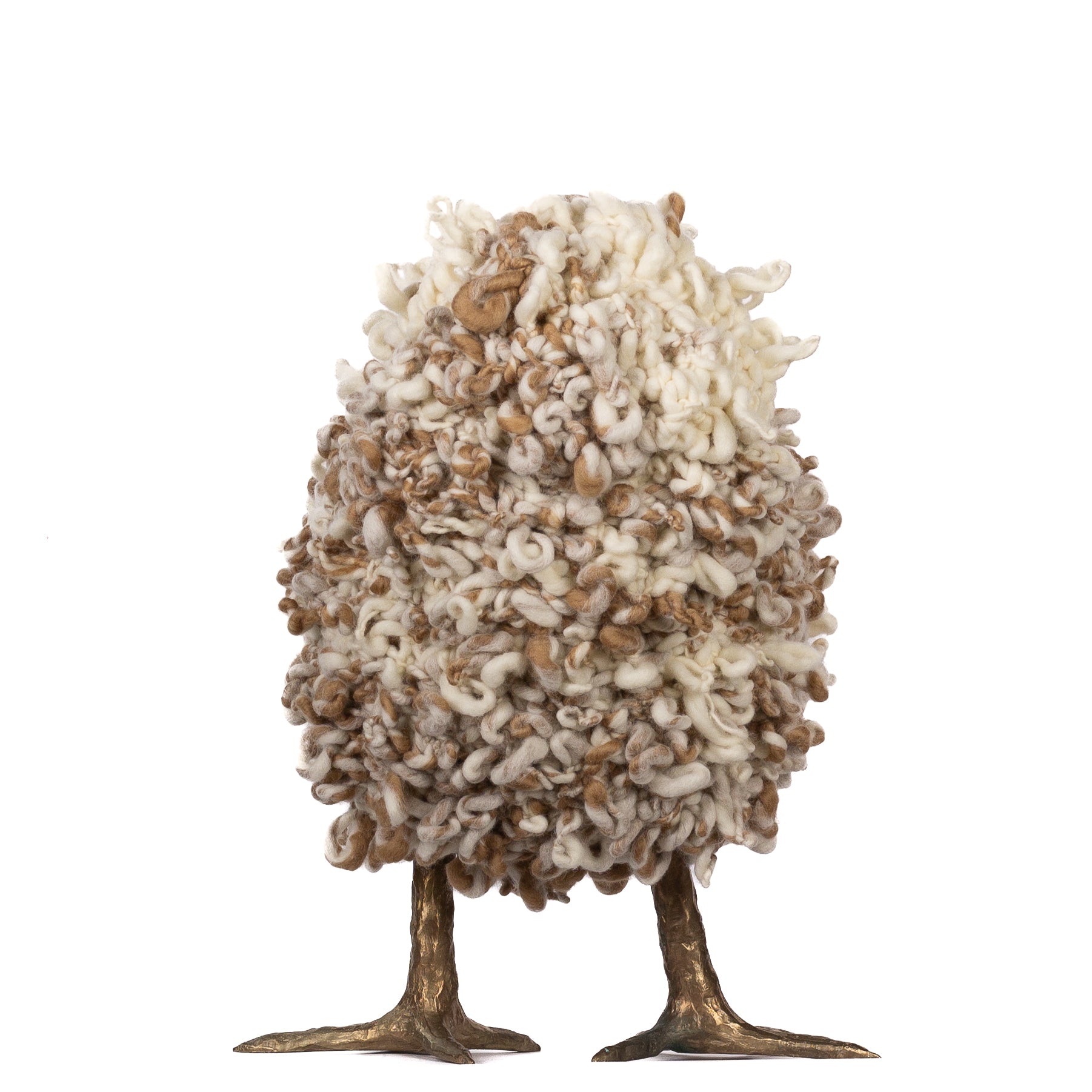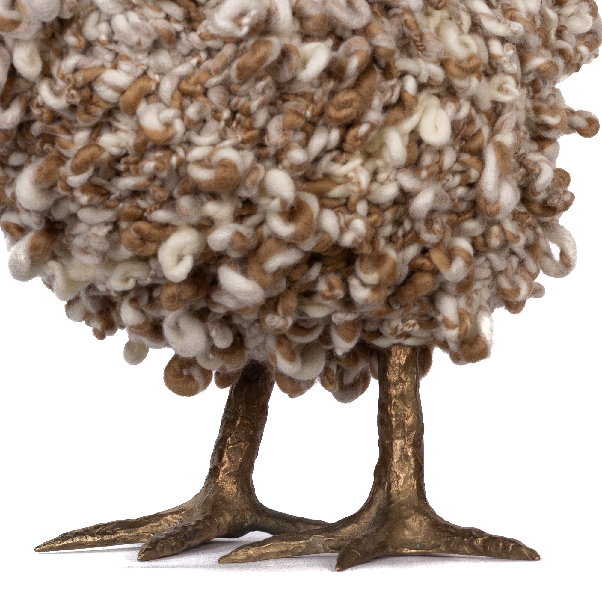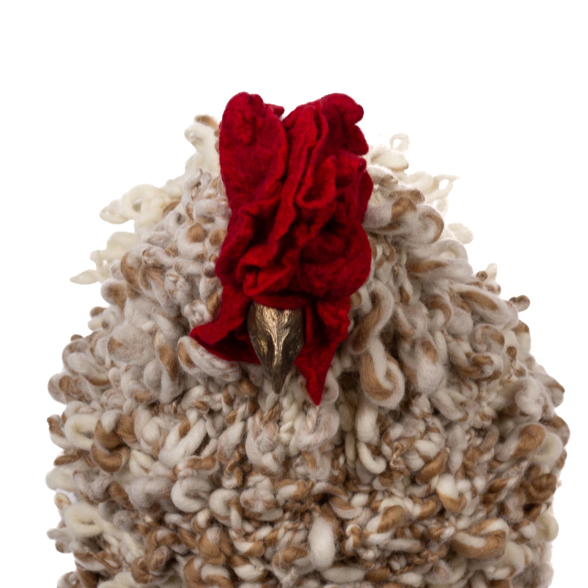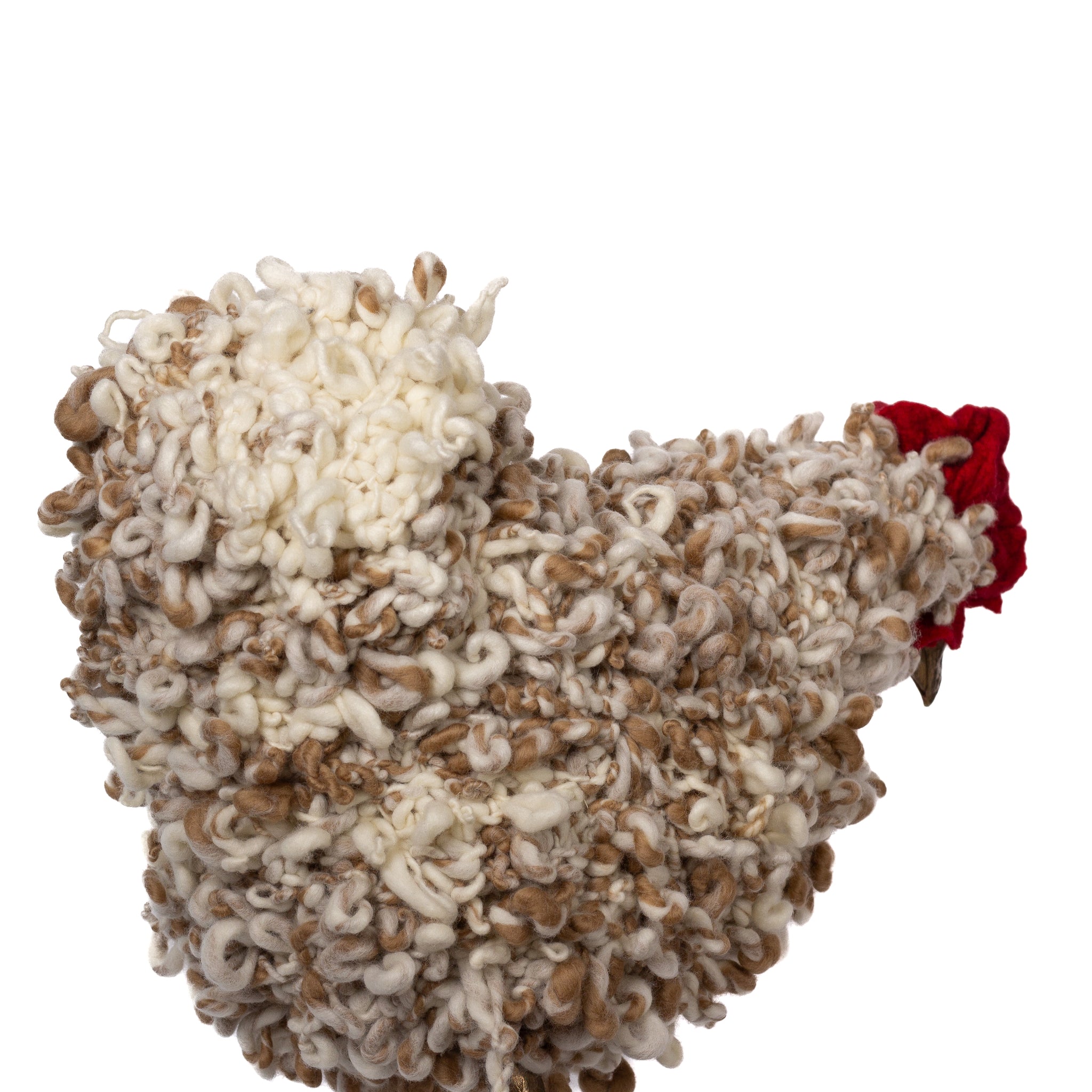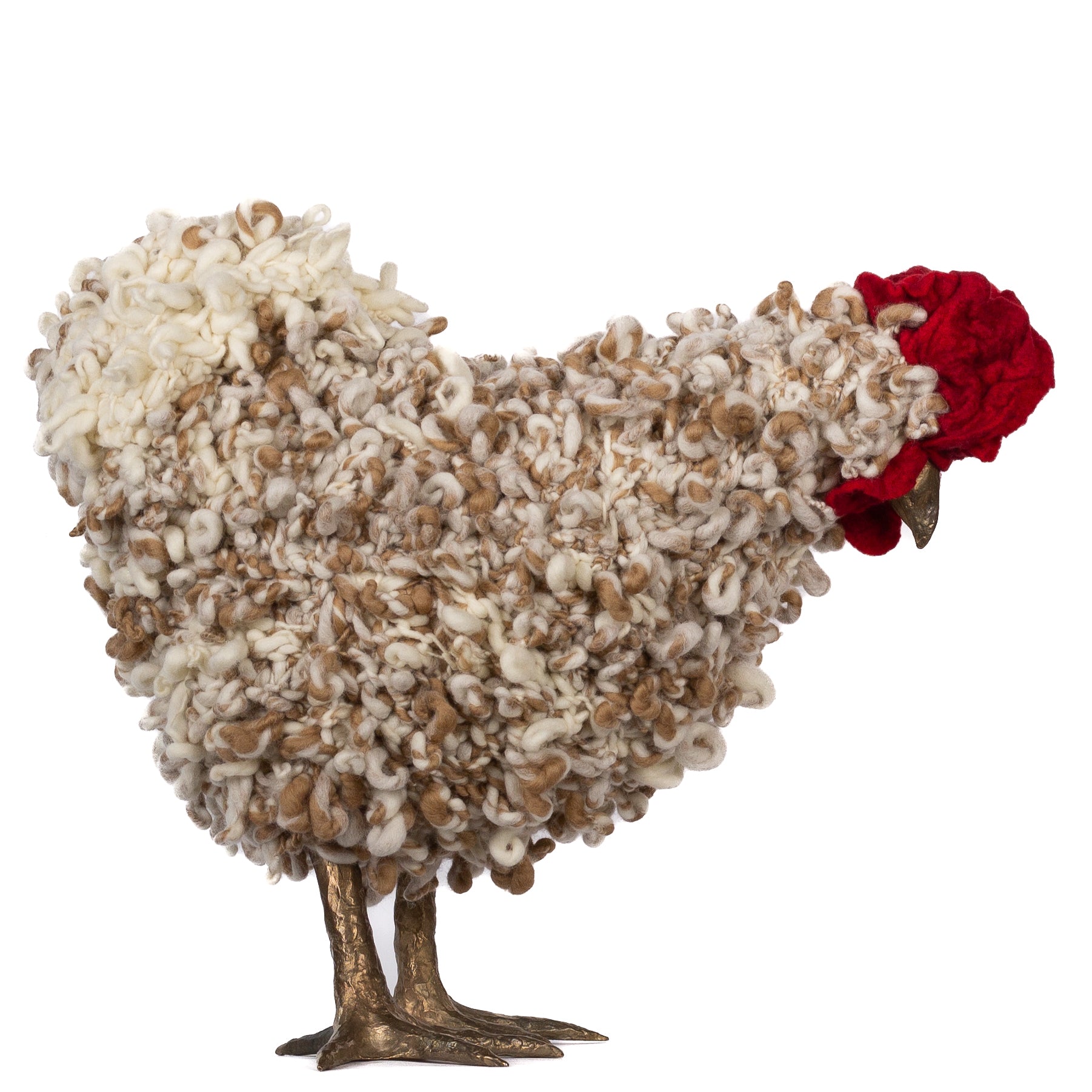The chickens are sculpted in Kansas City, Missouri with care and delight, upholstered to function as footstools. Each is one-of-a-kind, unique in posture and personality. A turned wood egg-shaped core stands on bronze feet and is connected to a bronze beak. Feathers are fashioned with traditional fiber art techniques- dyeing, felting, spinning, knitting- and are stitched by hand. And a surprise? Their heads bob.