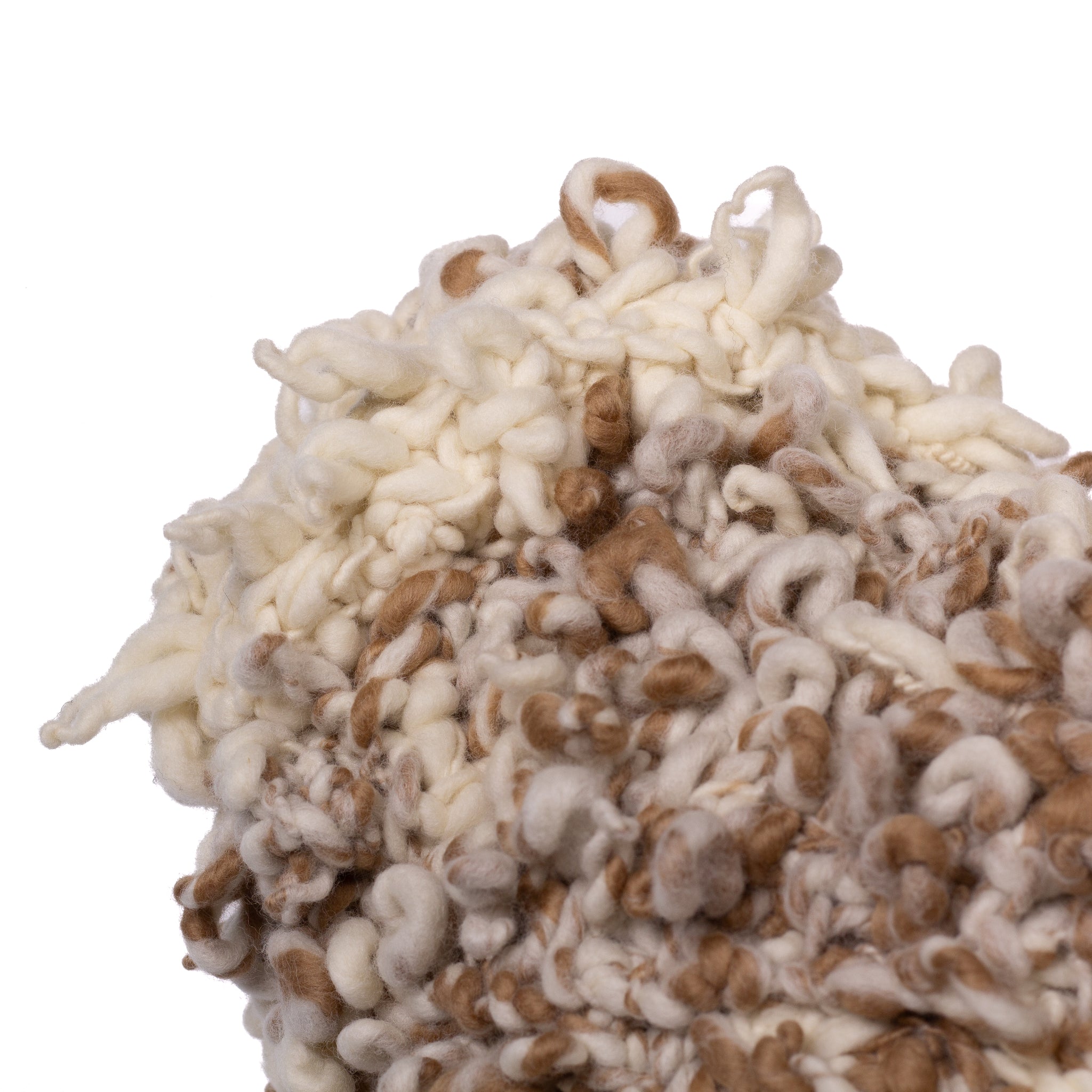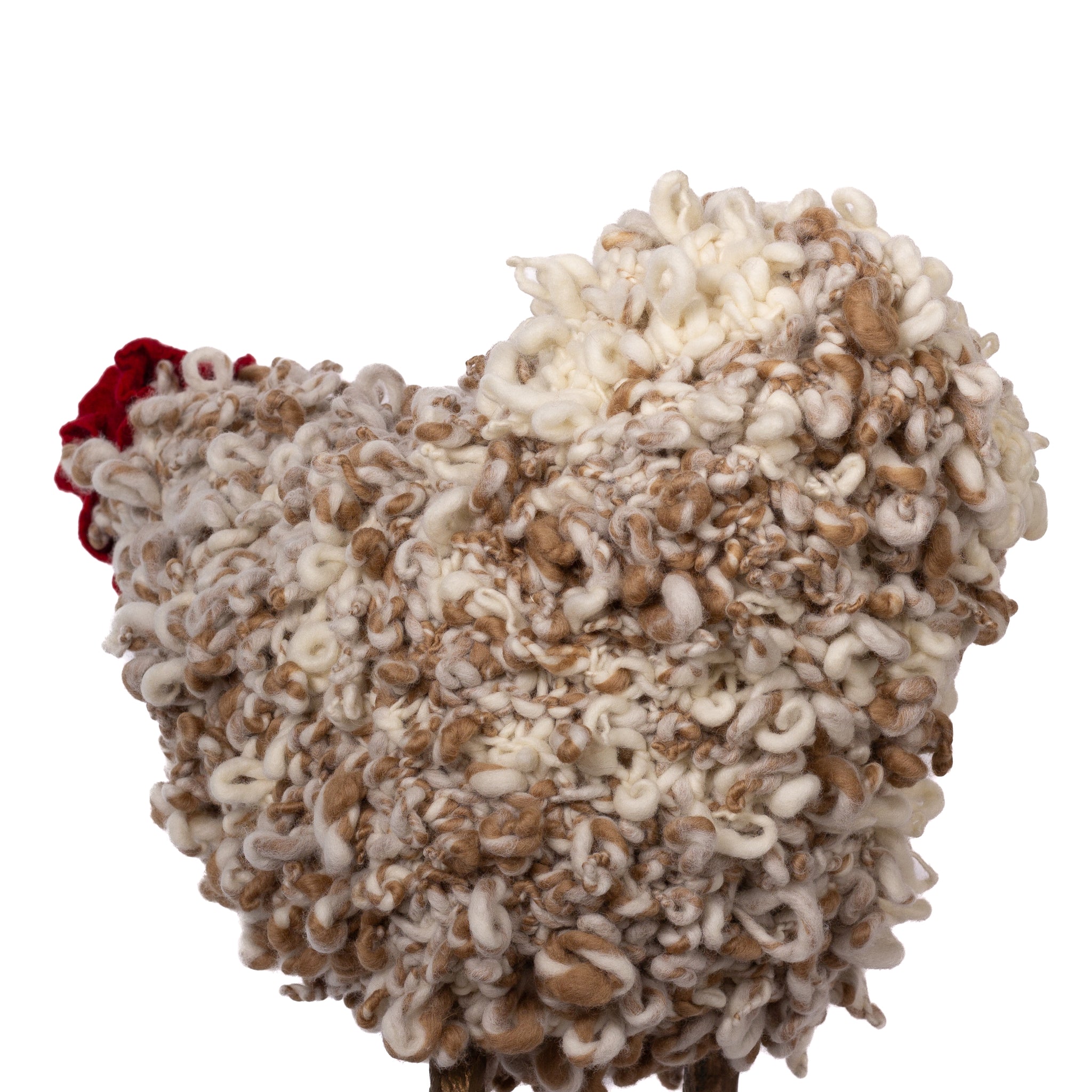 Evaline is a Chicken Little Footstool whose feathers are fashioned with hand-knit 100% Merino wool. She is looking for a good home.