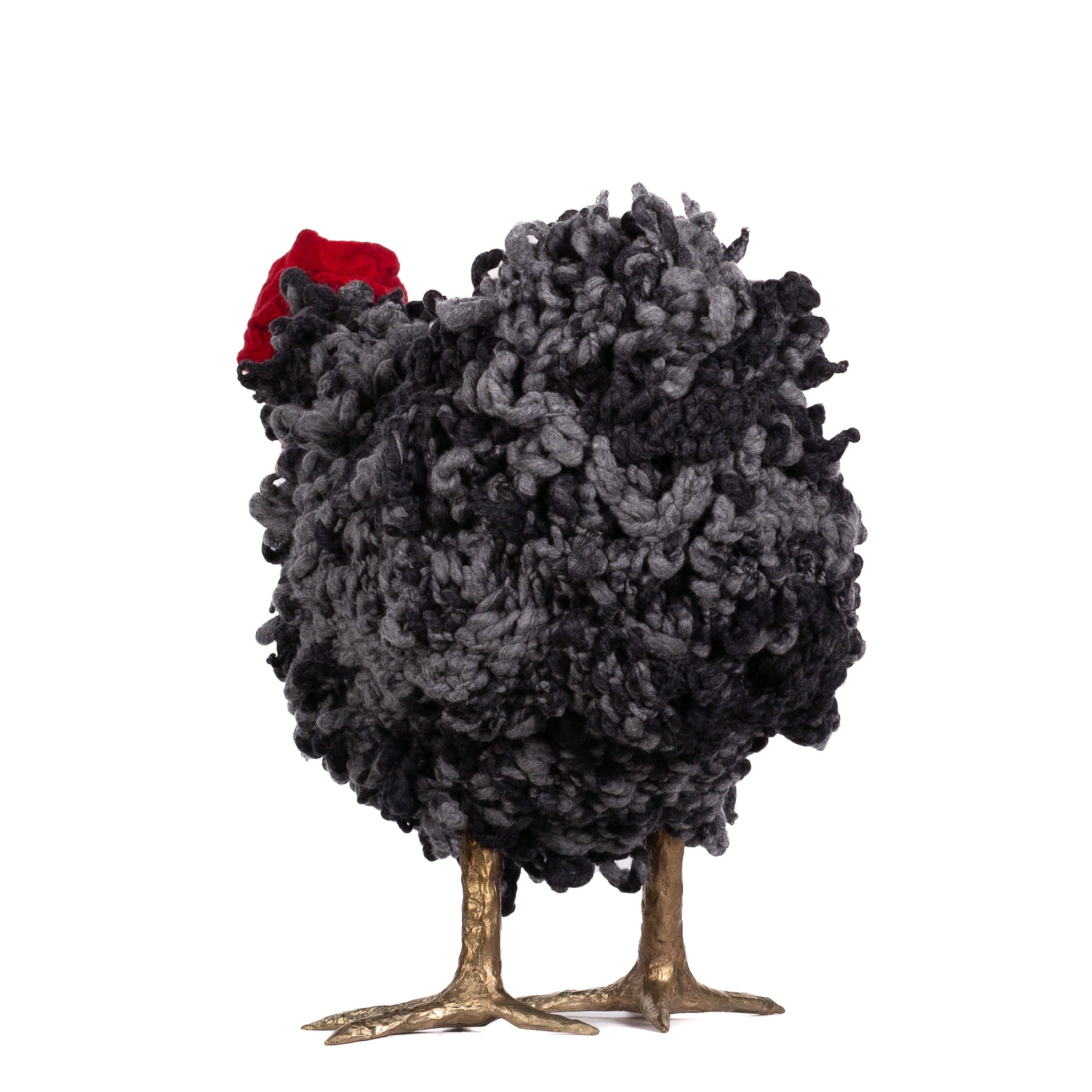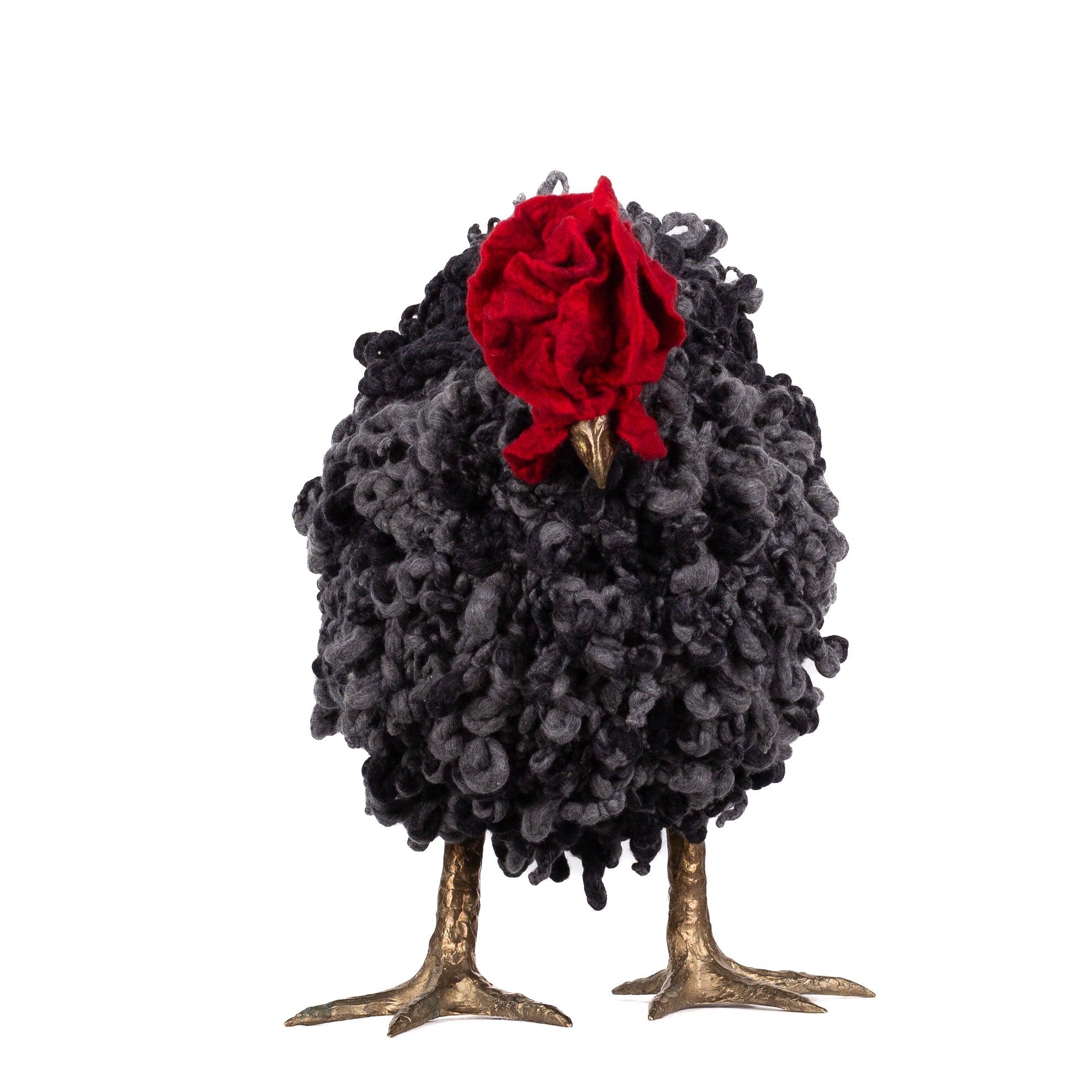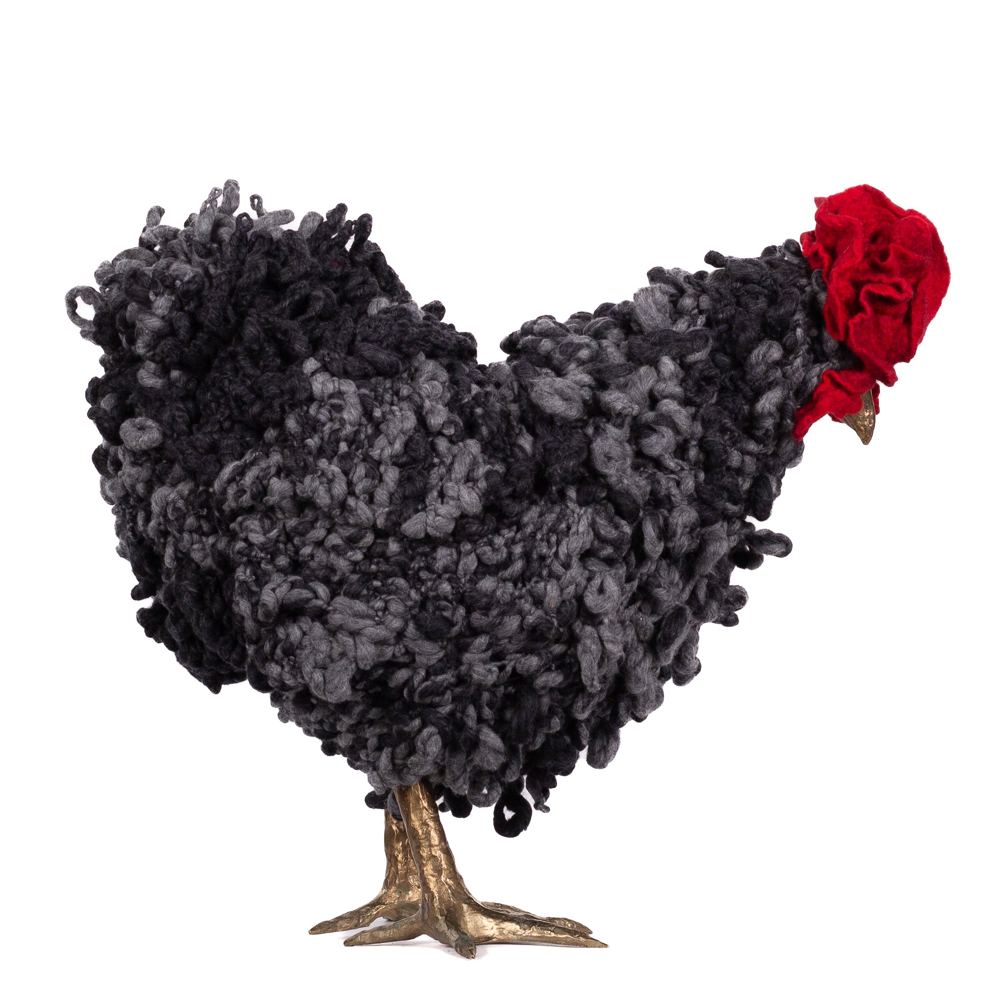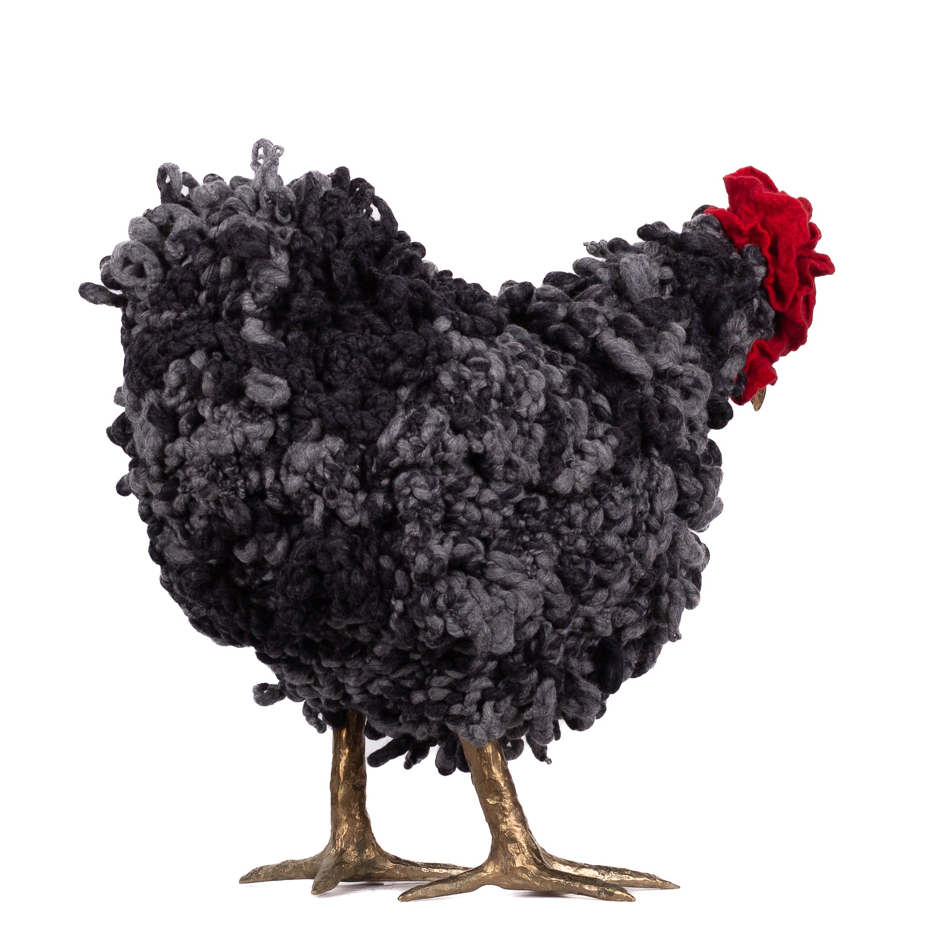 The chickens are sculpted in Kansas City, Missouri with care and delight, upholstered to function as footstools. Each is one-of-a-kind, unique in posture and personality. A turned wood egg-shaped core stands on bronze feet and is connected to a bronze beak. Feathers are fashioned with traditional fiber art techniques- dyeing, felting, spinning, knitting- and are stitched by hand. And a surprise? Their heads bob.