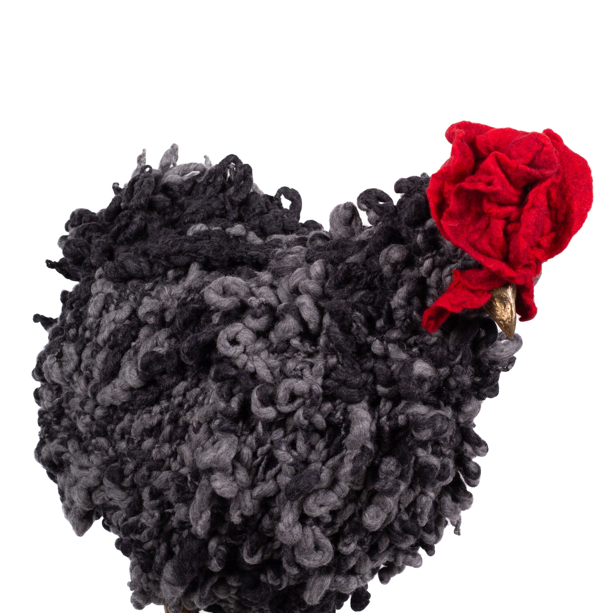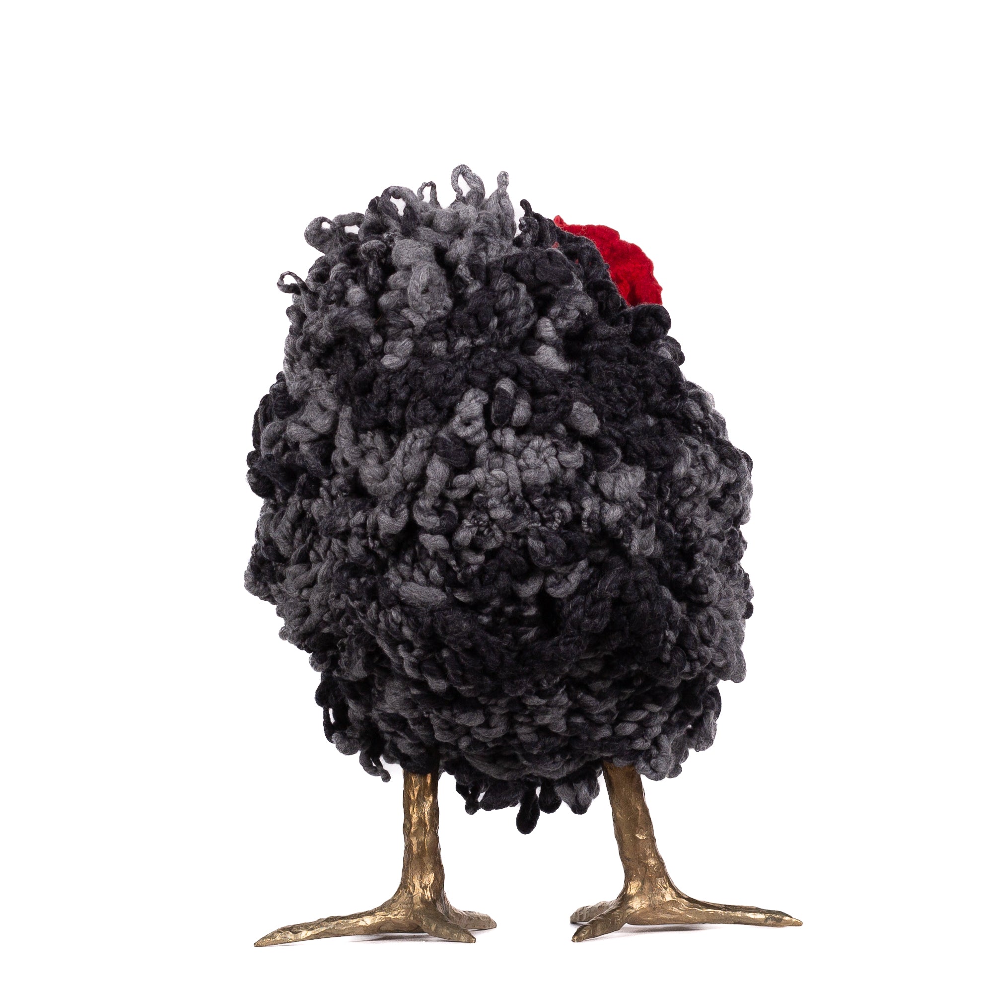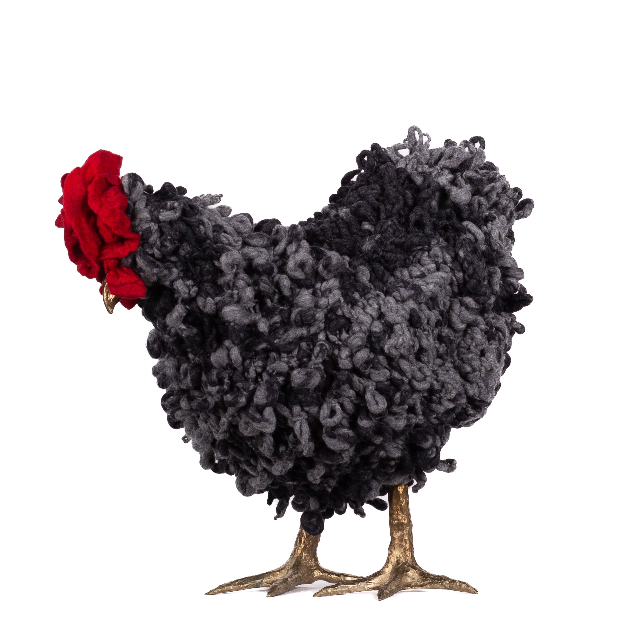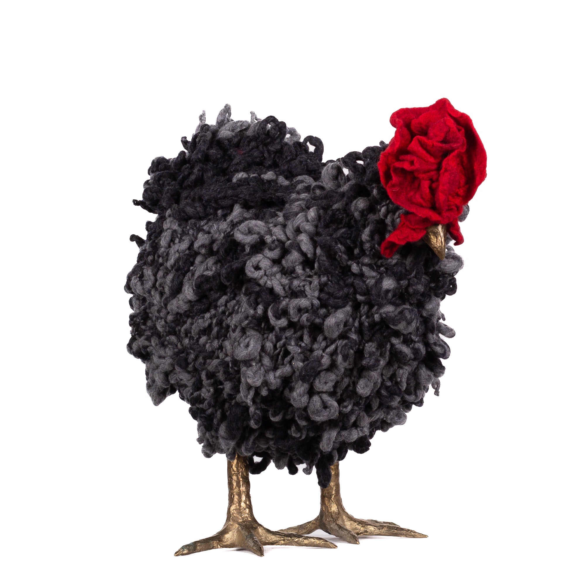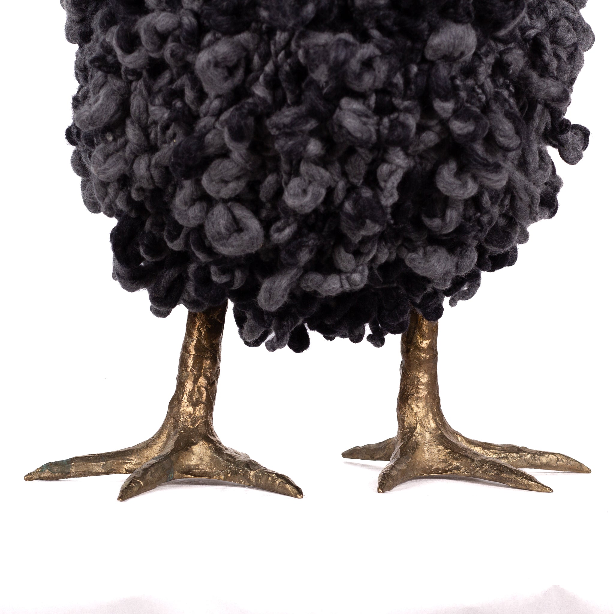 The chickens are sculpted in Kansas City, Missouri with care and delight, upholstered to function as footstools. Each is one-of-a-kind, unique in posture and personality. A turned wood egg-shaped core stands on bronze feet and is connected to a bronze beak. Feathers are fashioned with traditional fiber art techniques- dyeing, felting, spinning, knitting- and are stitched by hand. And a surprise? Their heads bob.