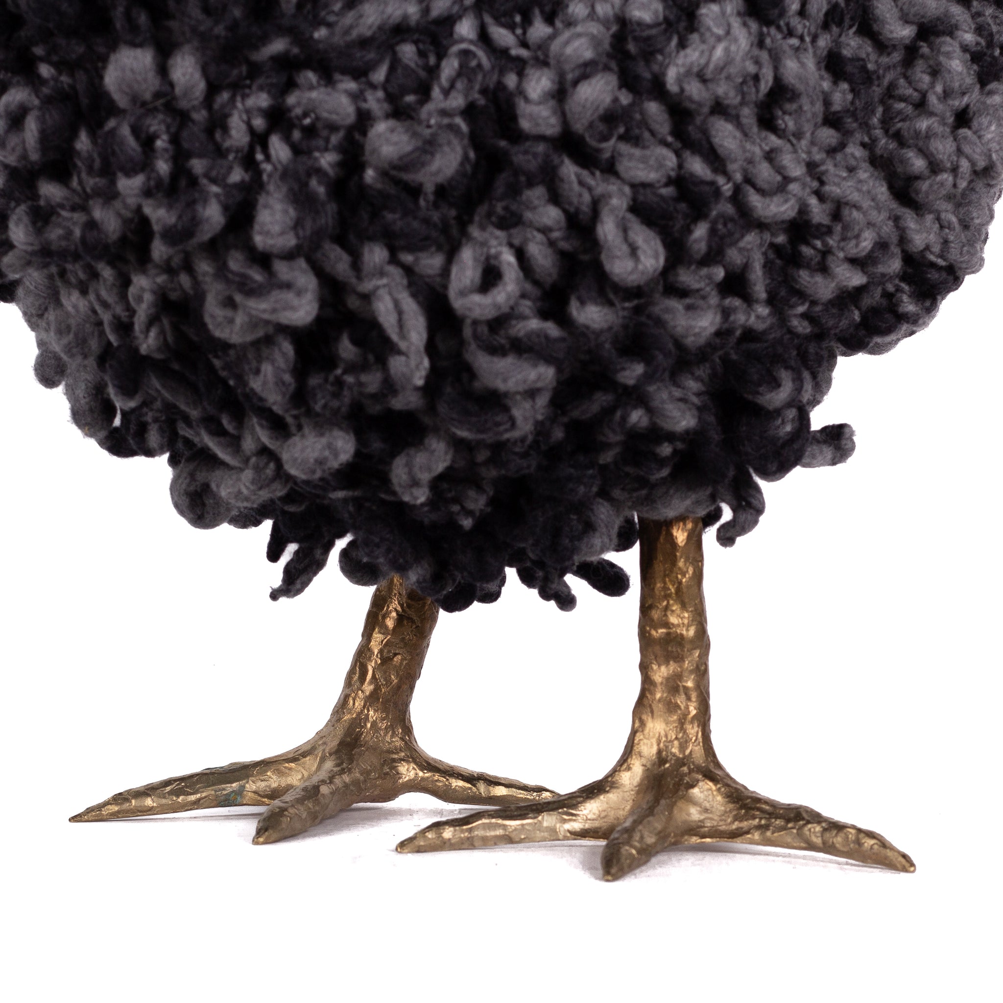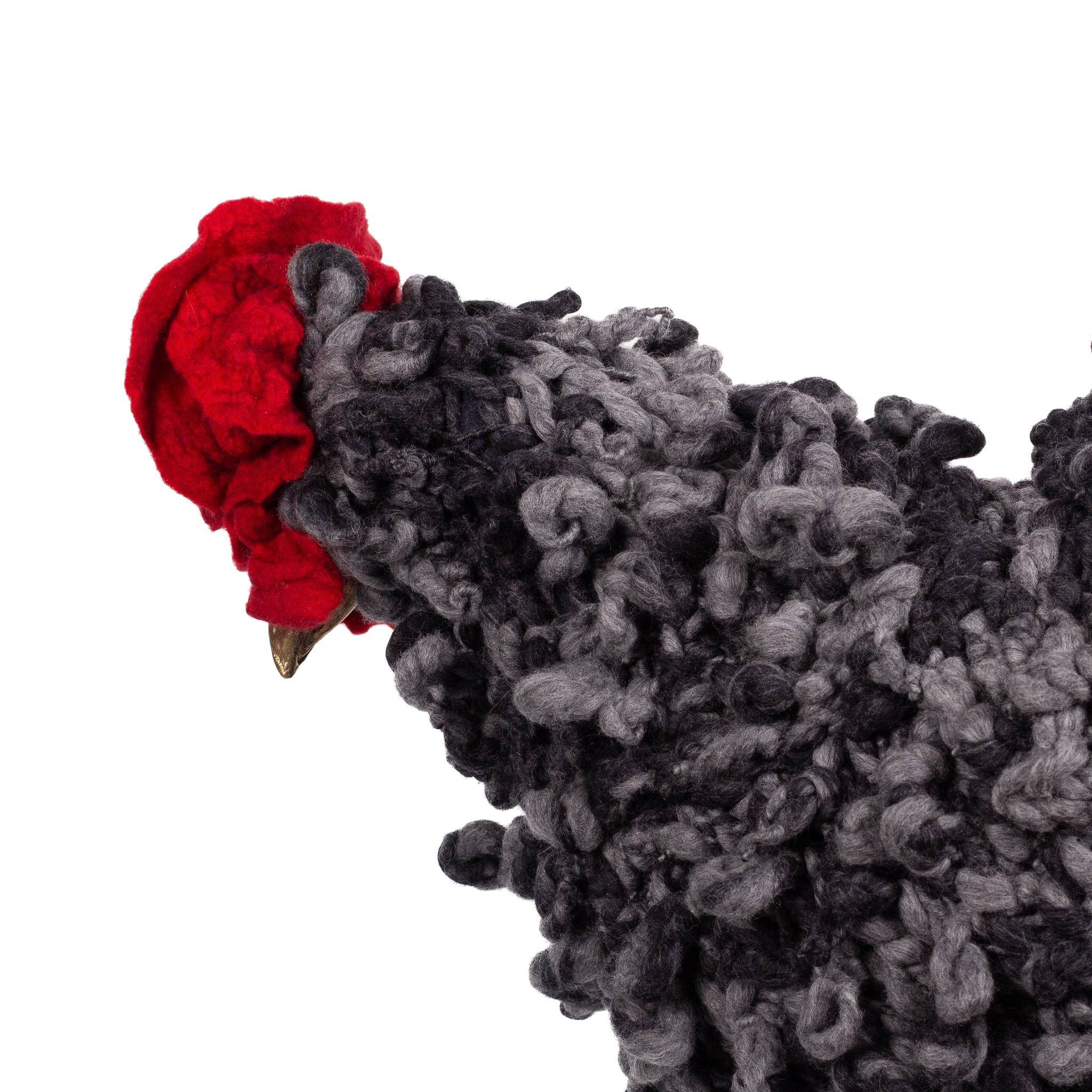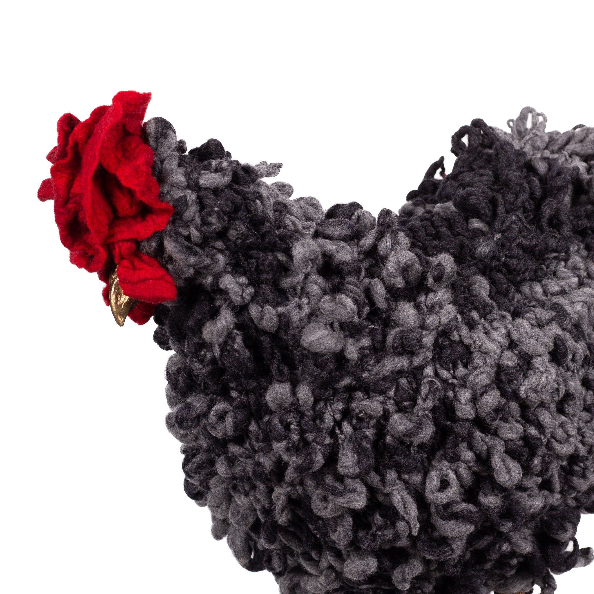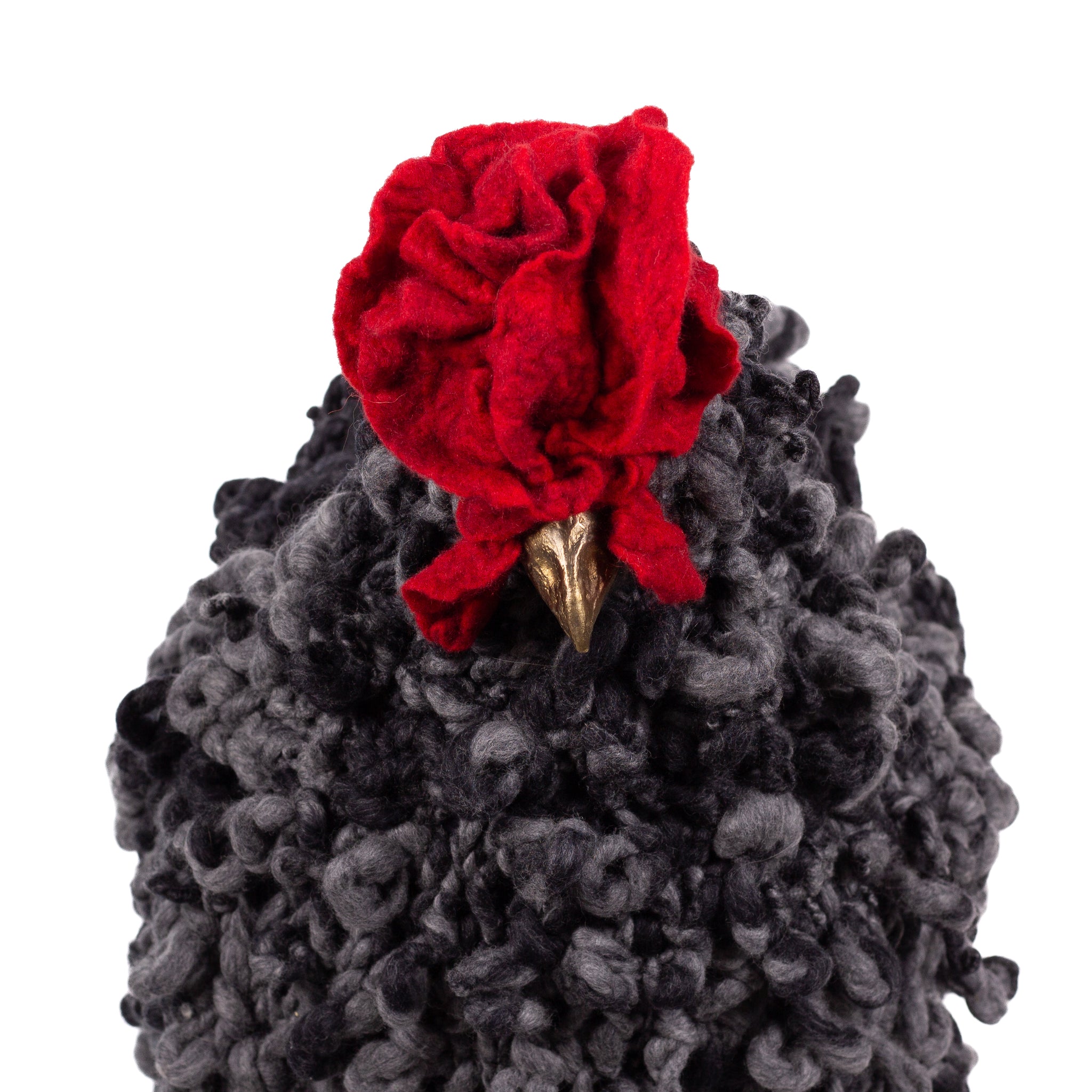 The chickens are sculpted in Kansas City, Missouri with care and delight, upholstered to function as footstools. Each is one-of-a-kind, unique in posture and personality. A turned wood egg-shaped core stands on bronze feet and is connected to a bronze beak. Feathers are fashioned with traditional fiber art techniques- dyeing, felting, spinning, knitting- and are stitched by hand. And a surprise? Their heads bob.