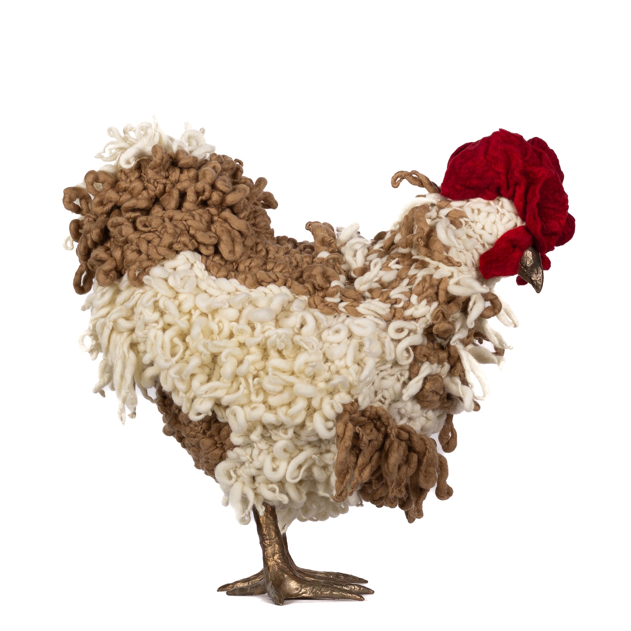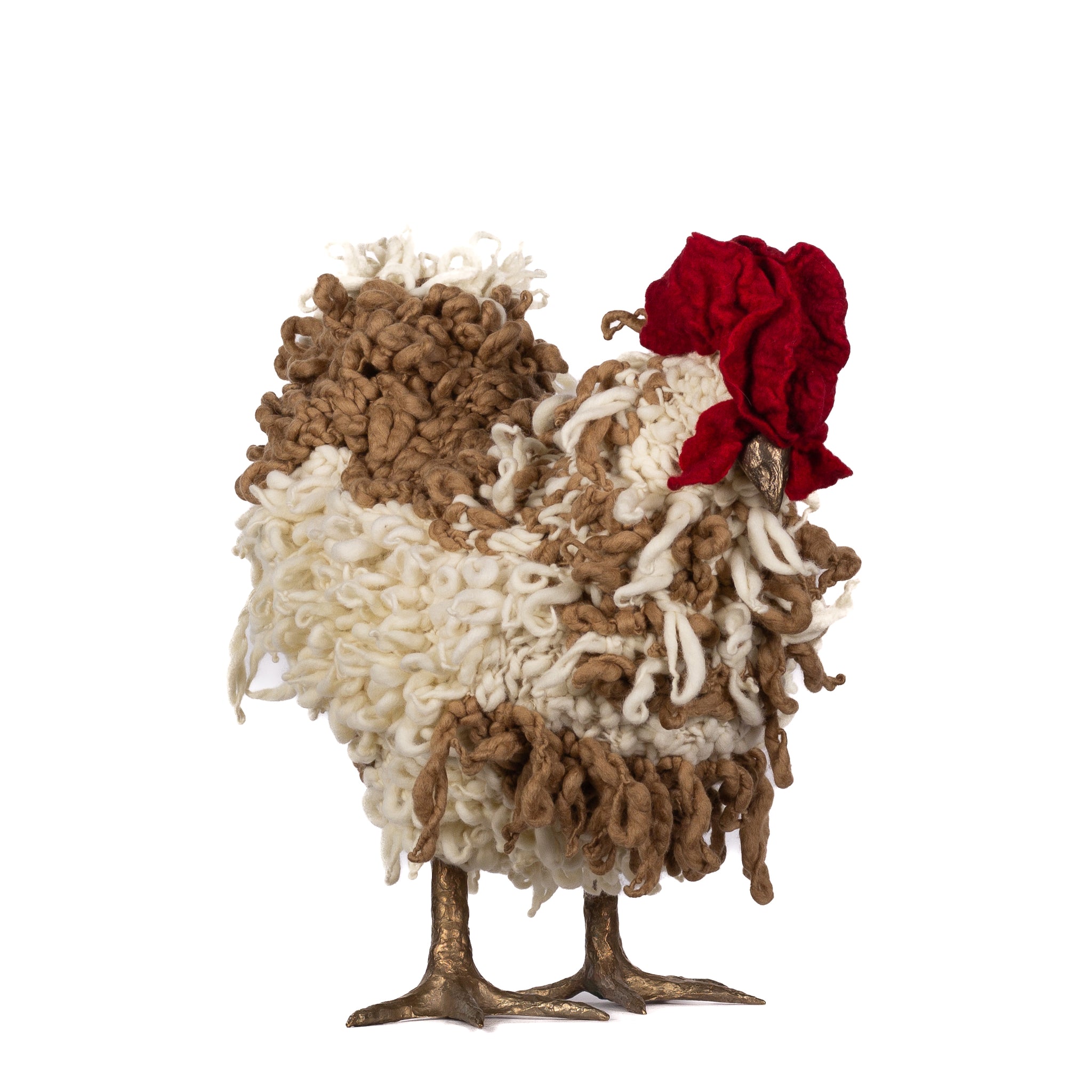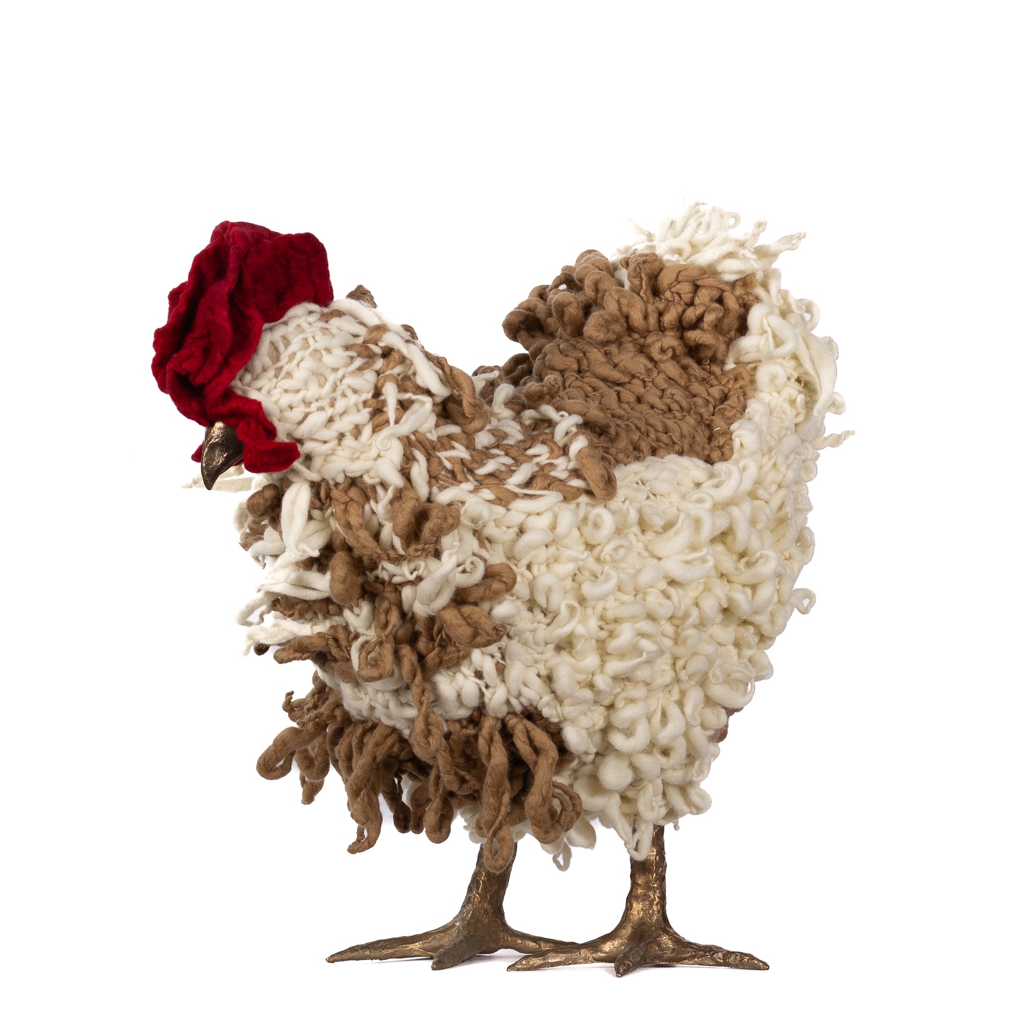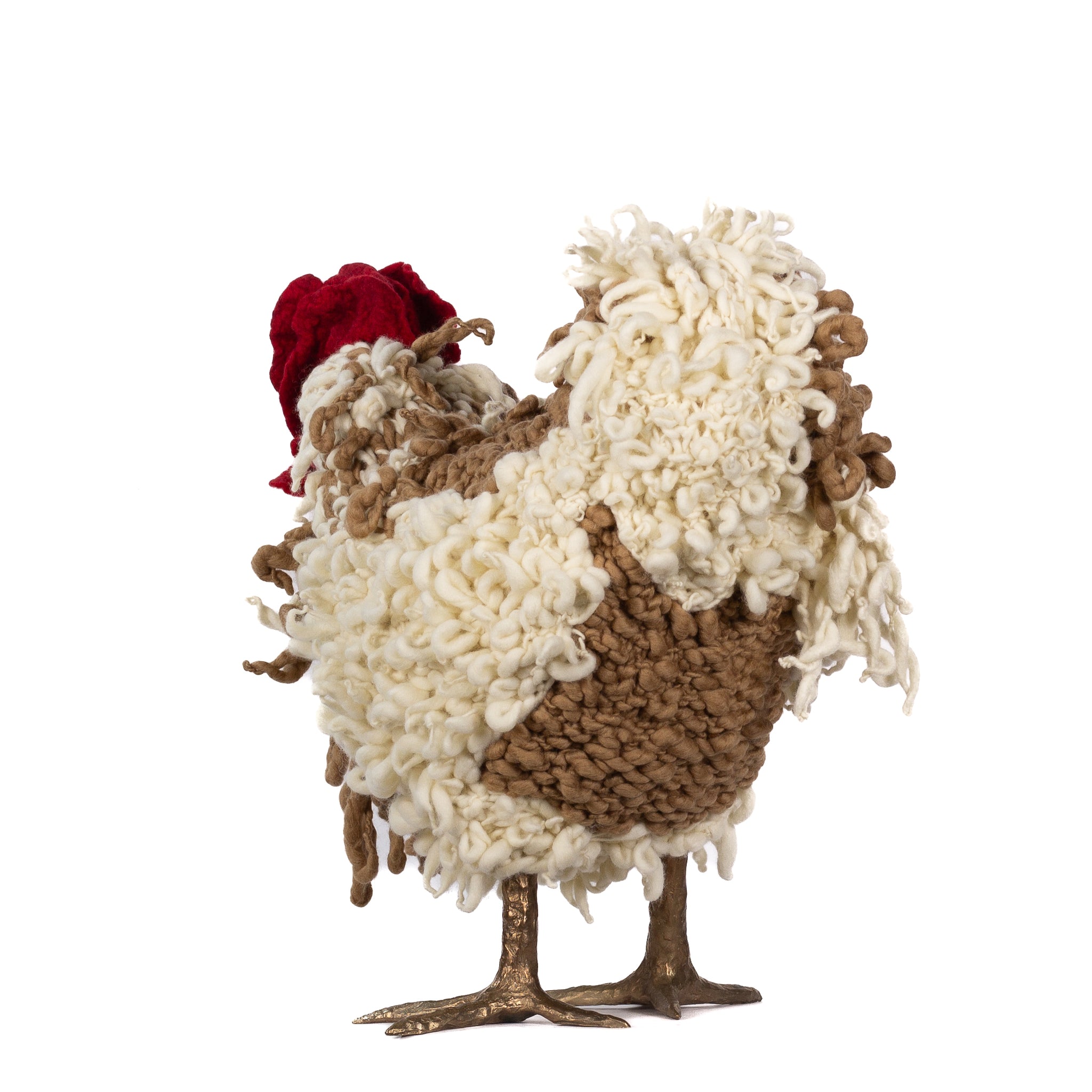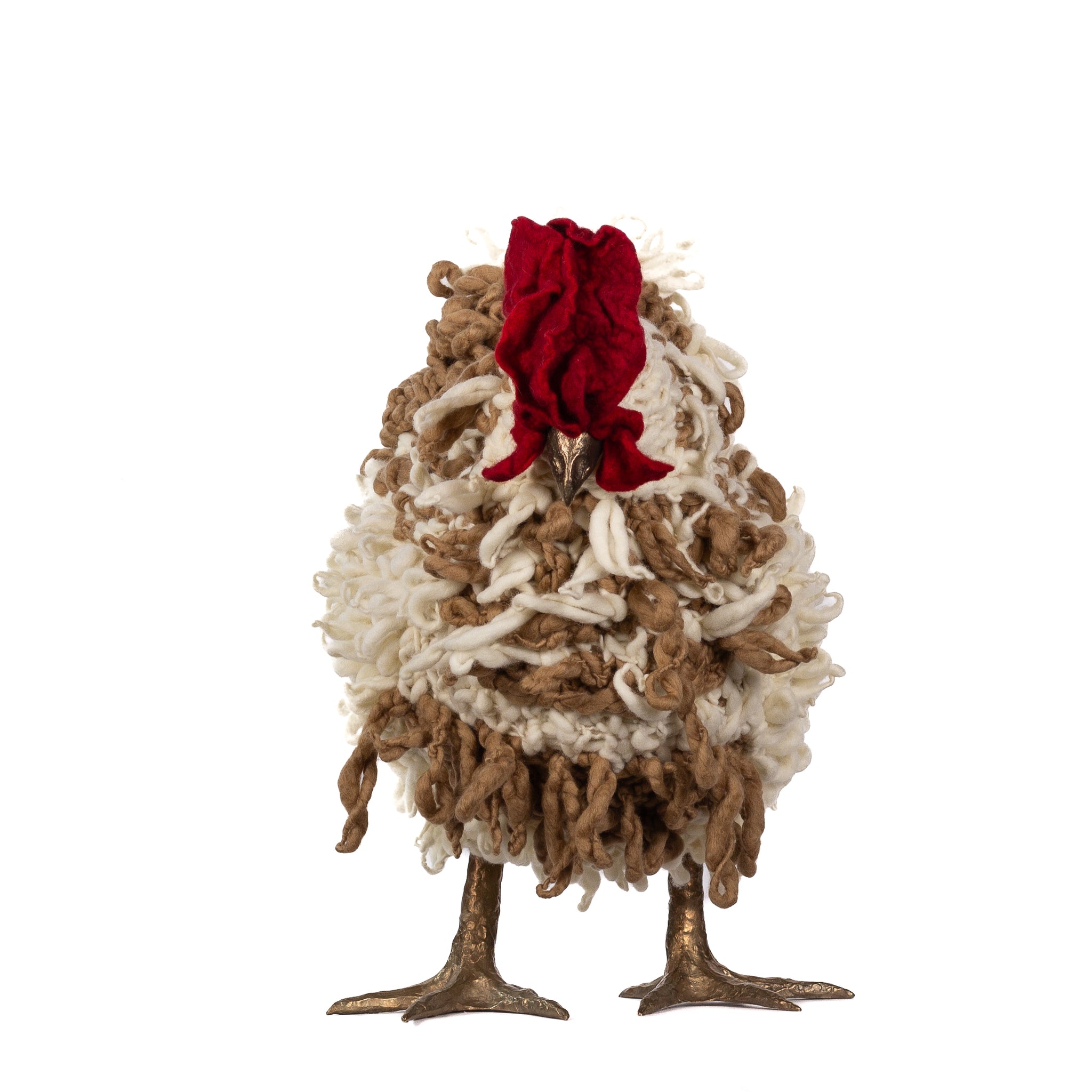 The chickens are sculpted in Kansas City, Missouri with care and delight, upholstered to function as footstools. Each is one-of-a-kind, unique in posture and personality. A turned wood egg-shaped core stands on bronze feet and is connected to a bronze beak. Feathers are fashioned with traditional fiber art techniques- dyeing, felting, spinning, knitting- and are stitched by hand. And a surprise? Their heads bob.