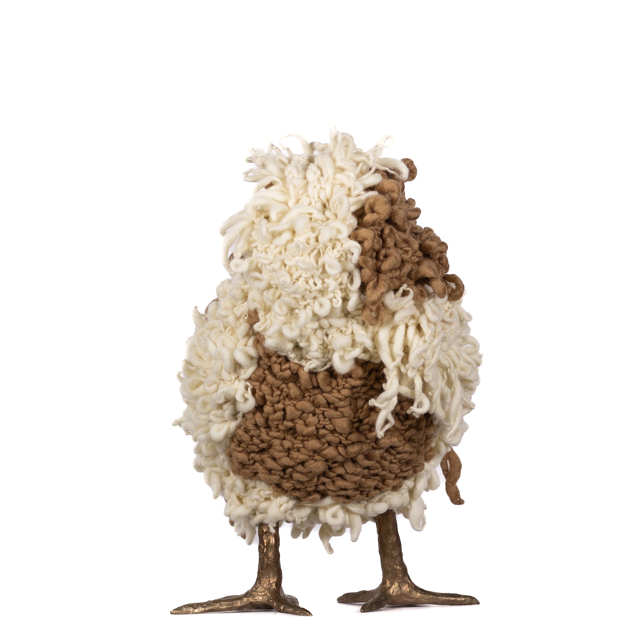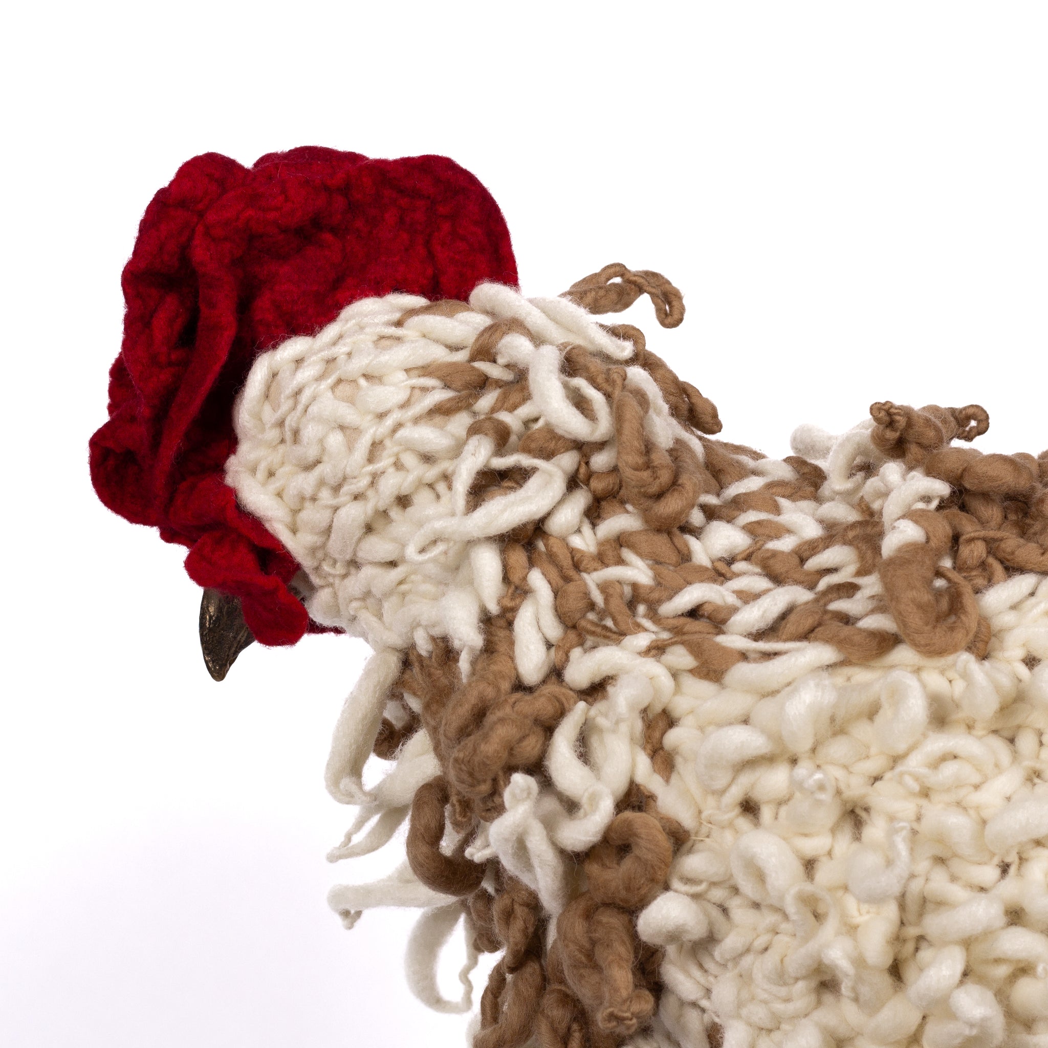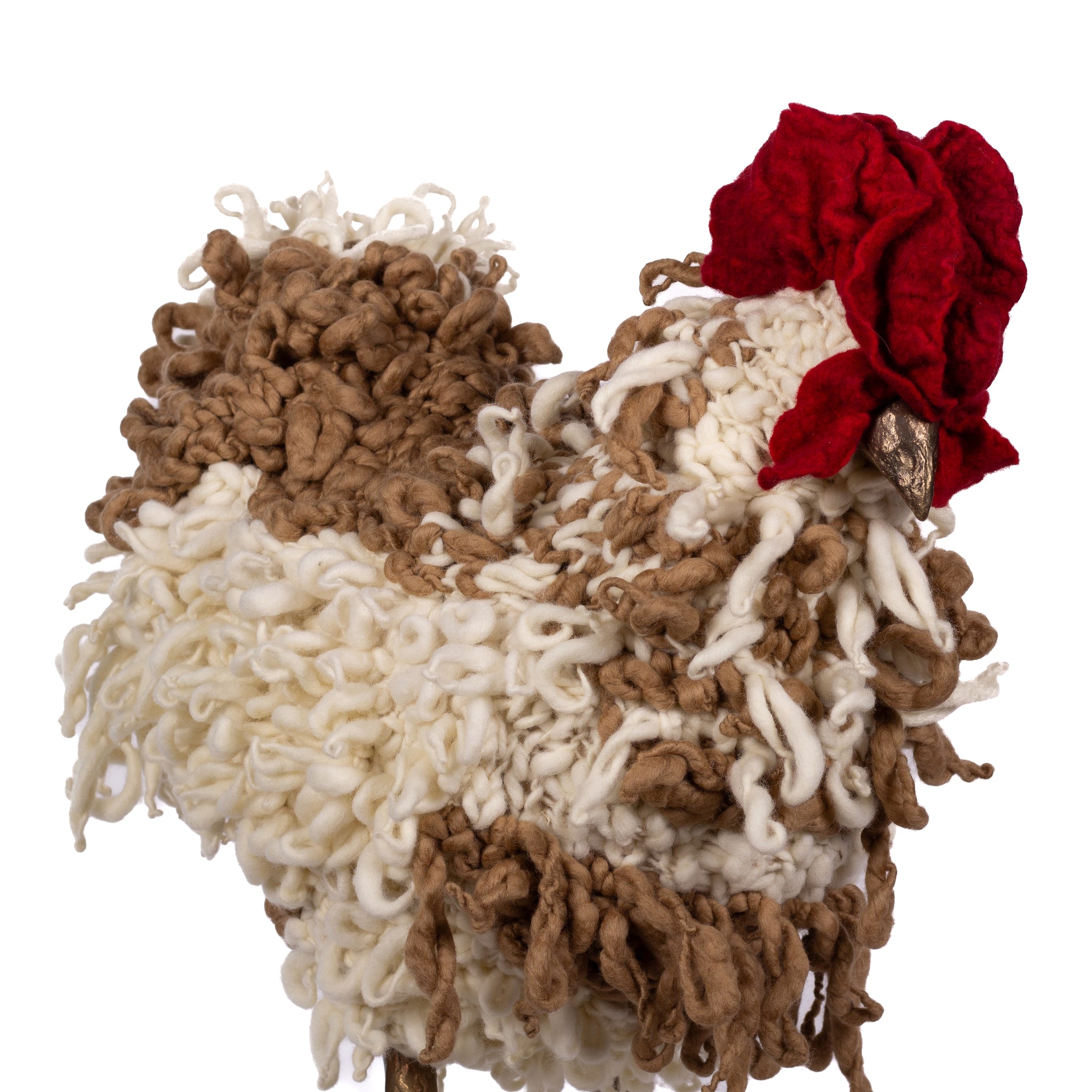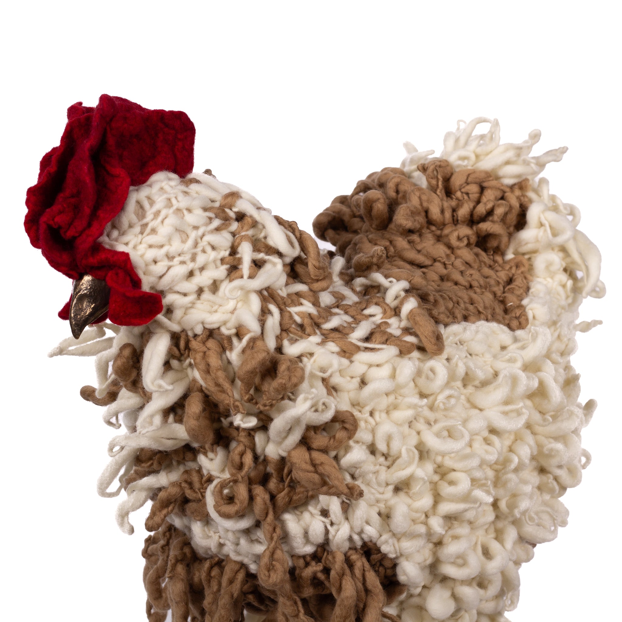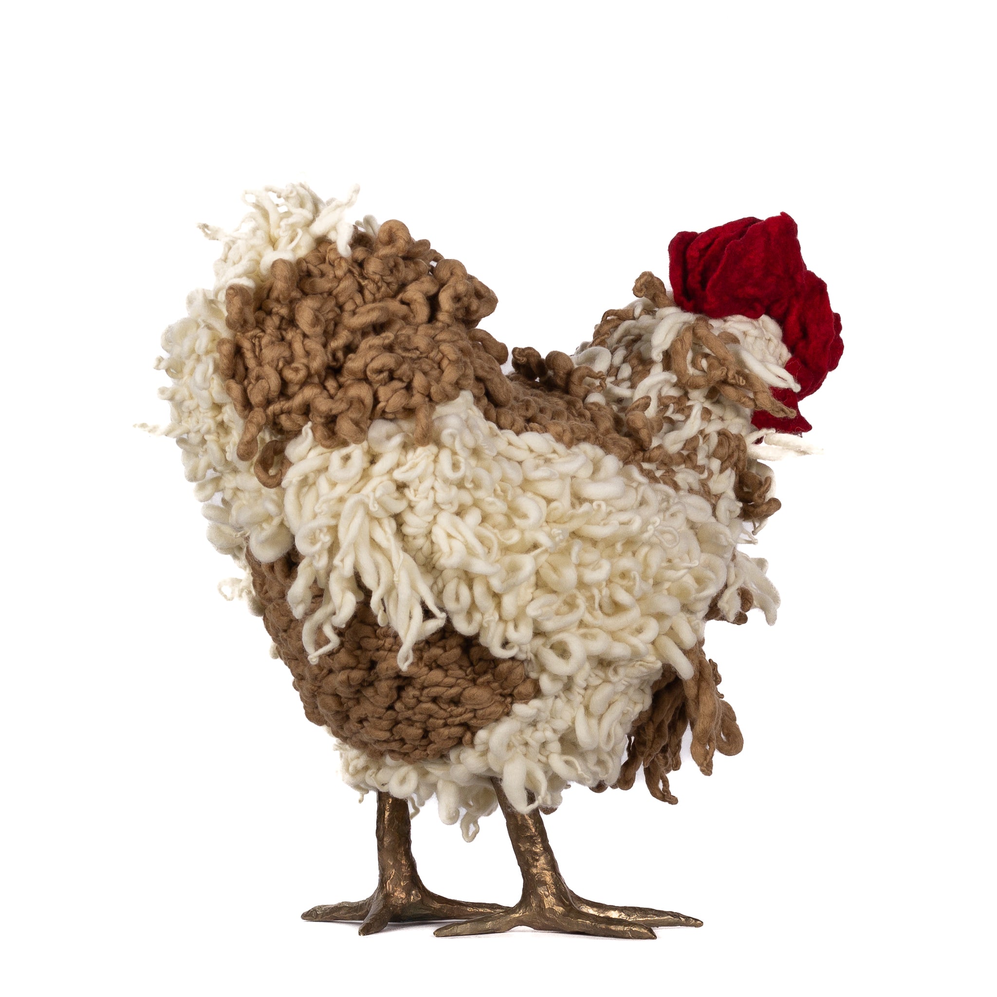 The chickens are sculpted in Kansas City, Missouri with care and delight, upholstered to function as footstools. Each is one-of-a-kind, unique in posture and personality. A turned wood egg-shaped core stands on bronze feet and is connected to a bronze beak. Feathers are fashioned with traditional fiber art techniques- dyeing, felting, spinning, knitting- and are stitched by hand. And a surprise? Their heads bob.