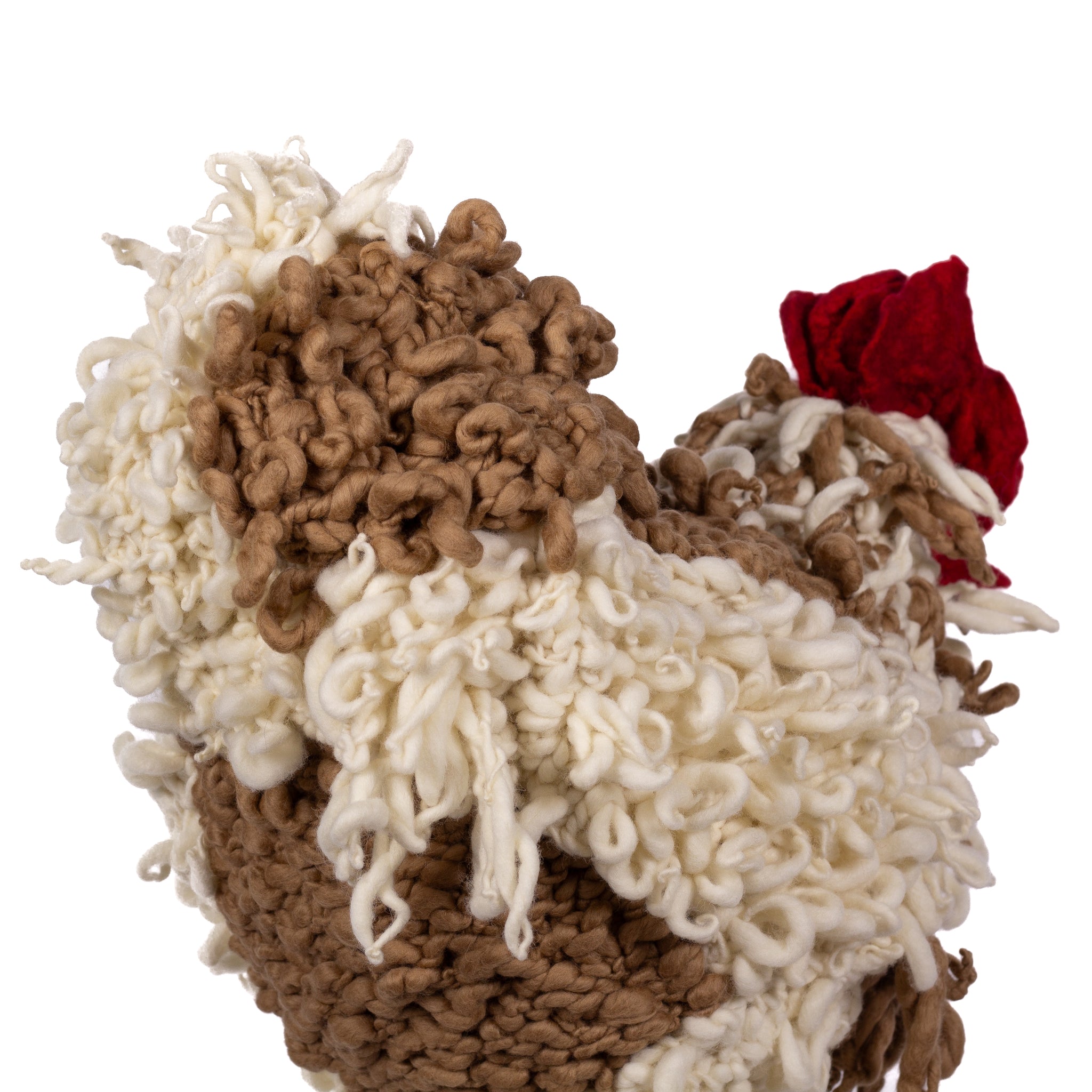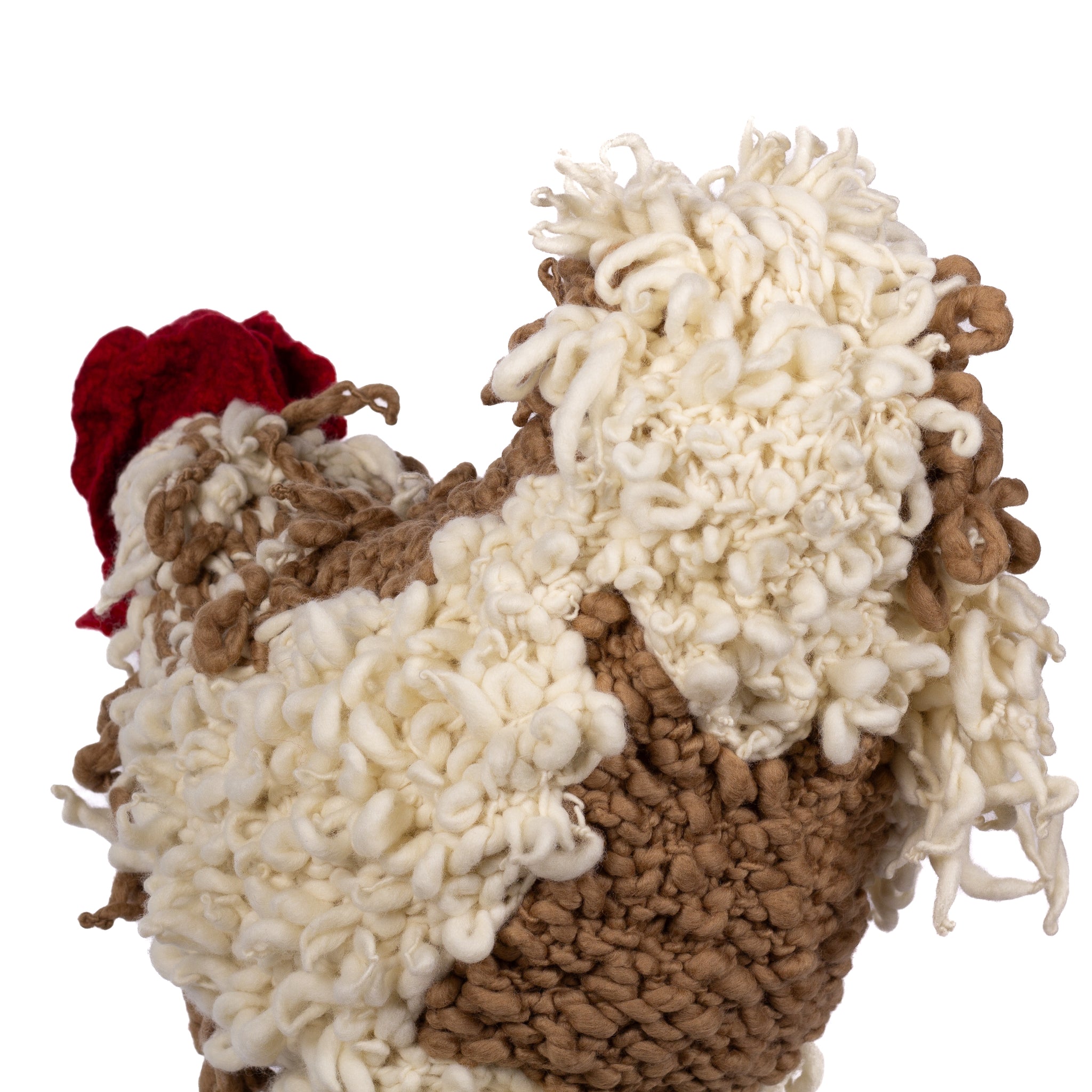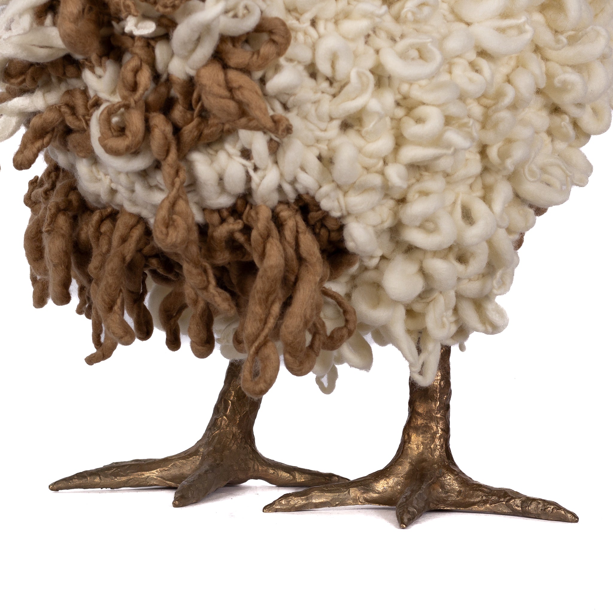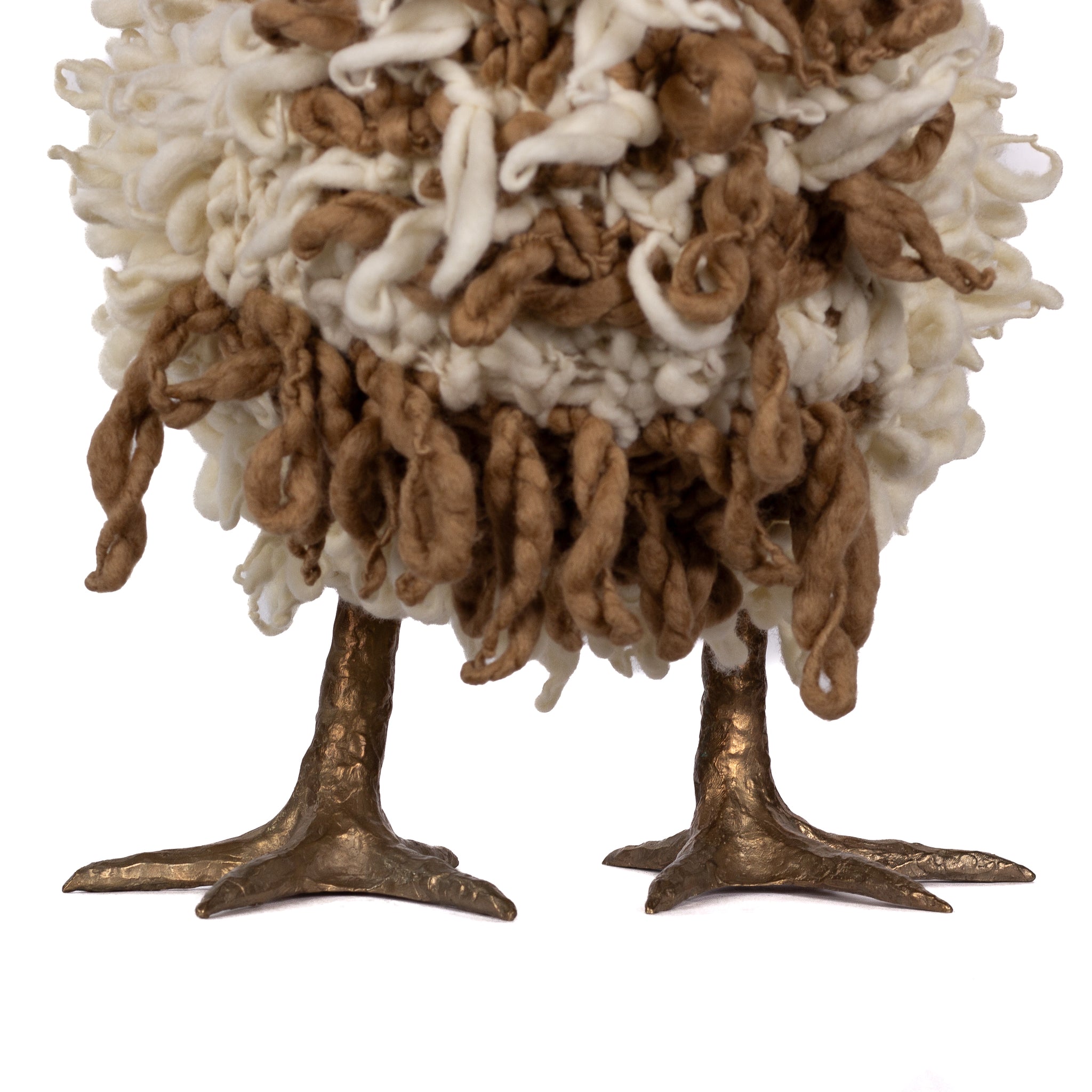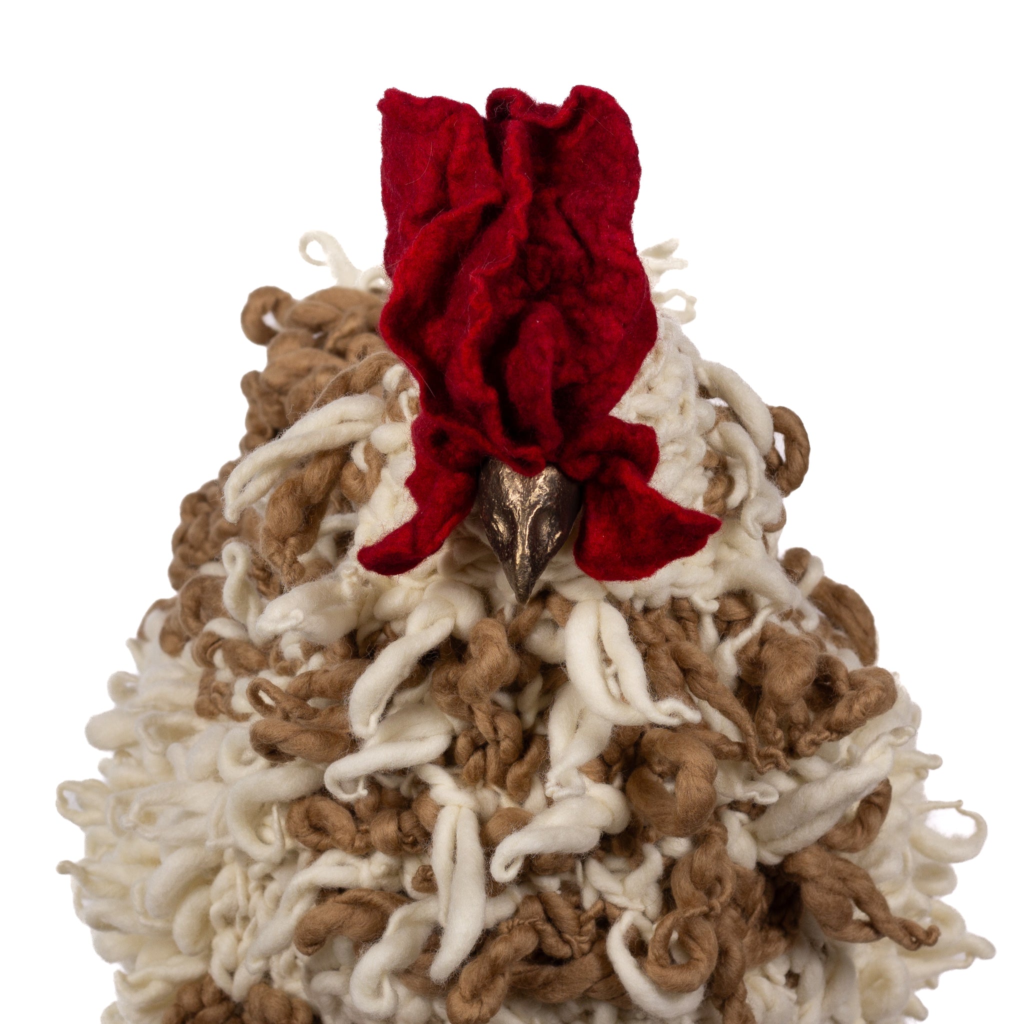 The chickens are sculpted in Kansas City, Missouri with care and delight, upholstered to function as footstools. Each is one-of-a-kind, unique in posture and personality. A turned wood egg-shaped core stands on bronze feet and is connected to a bronze beak. Feathers are fashioned with traditional fiber art techniques- dyeing, felting, spinning, knitting- and are stitched by hand. And a surprise? Their heads bob.