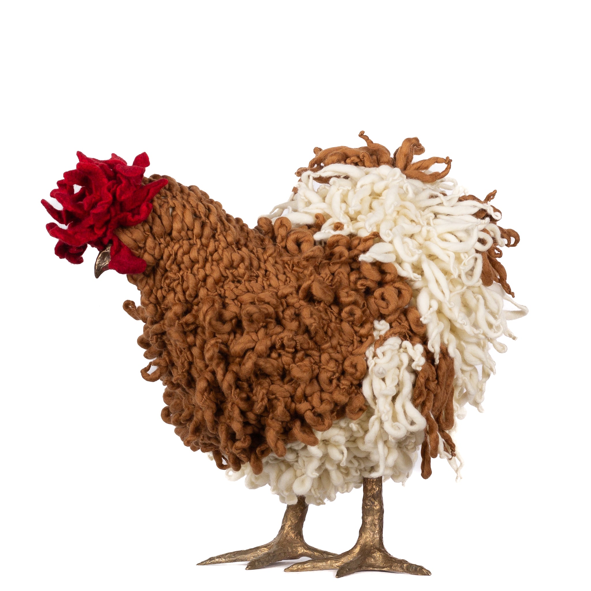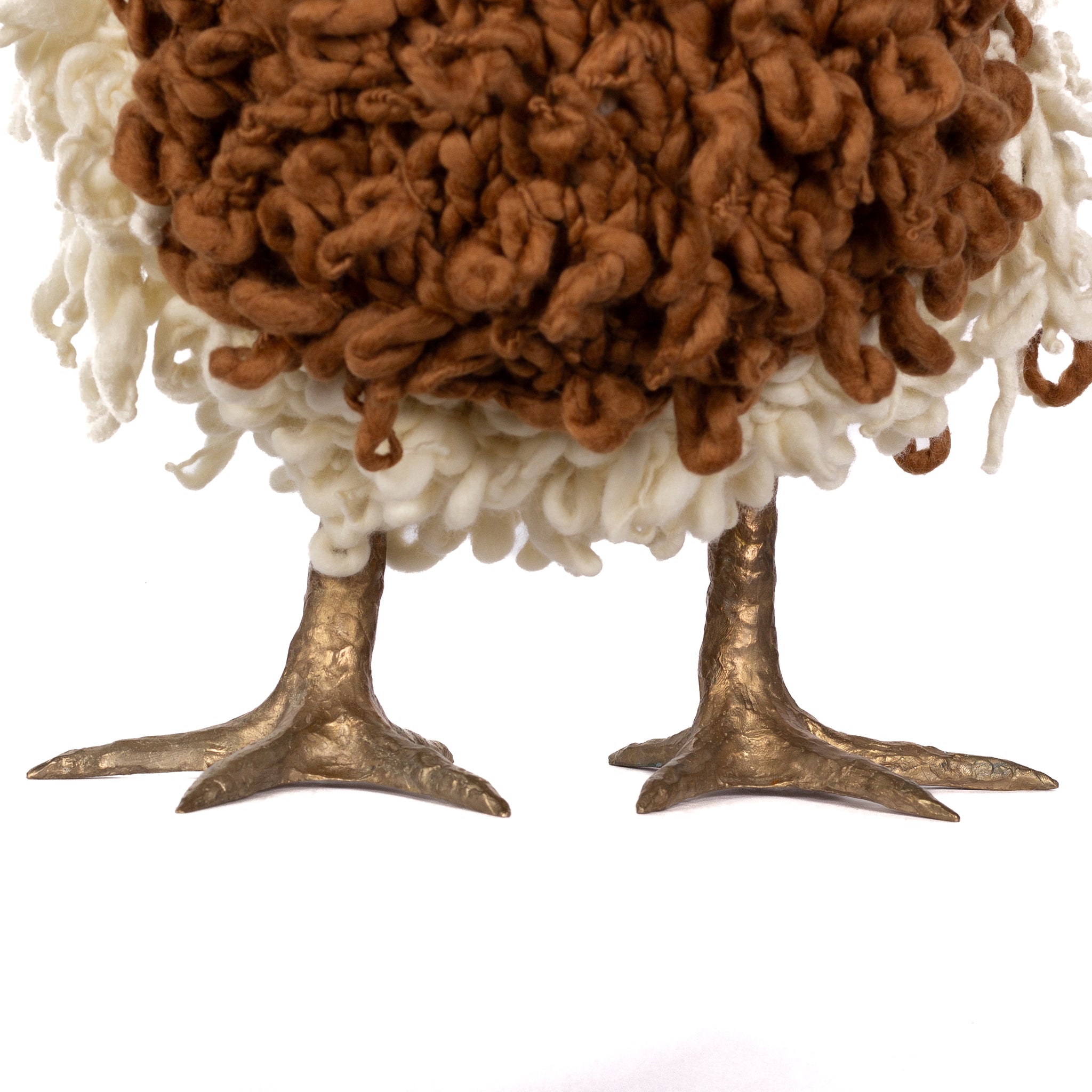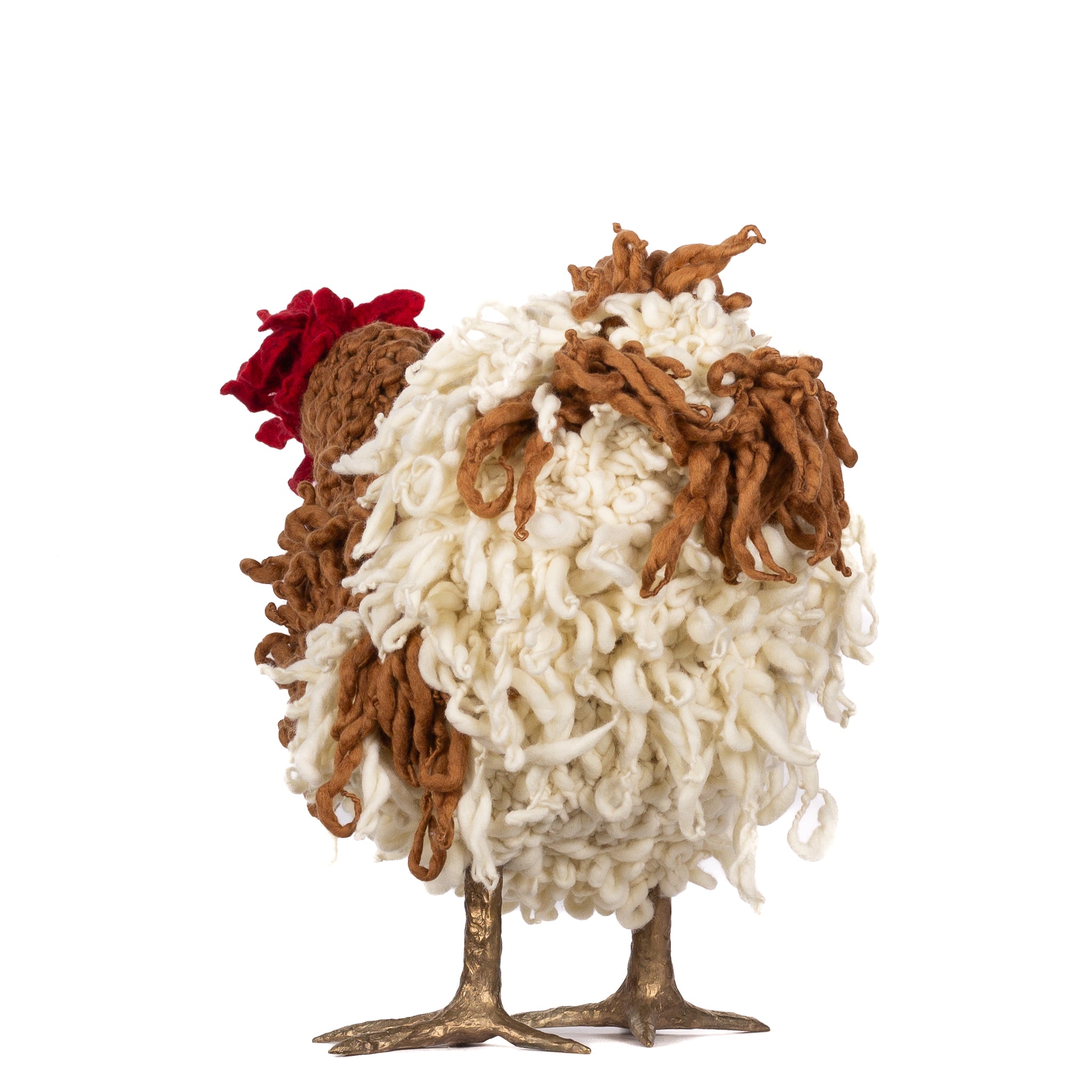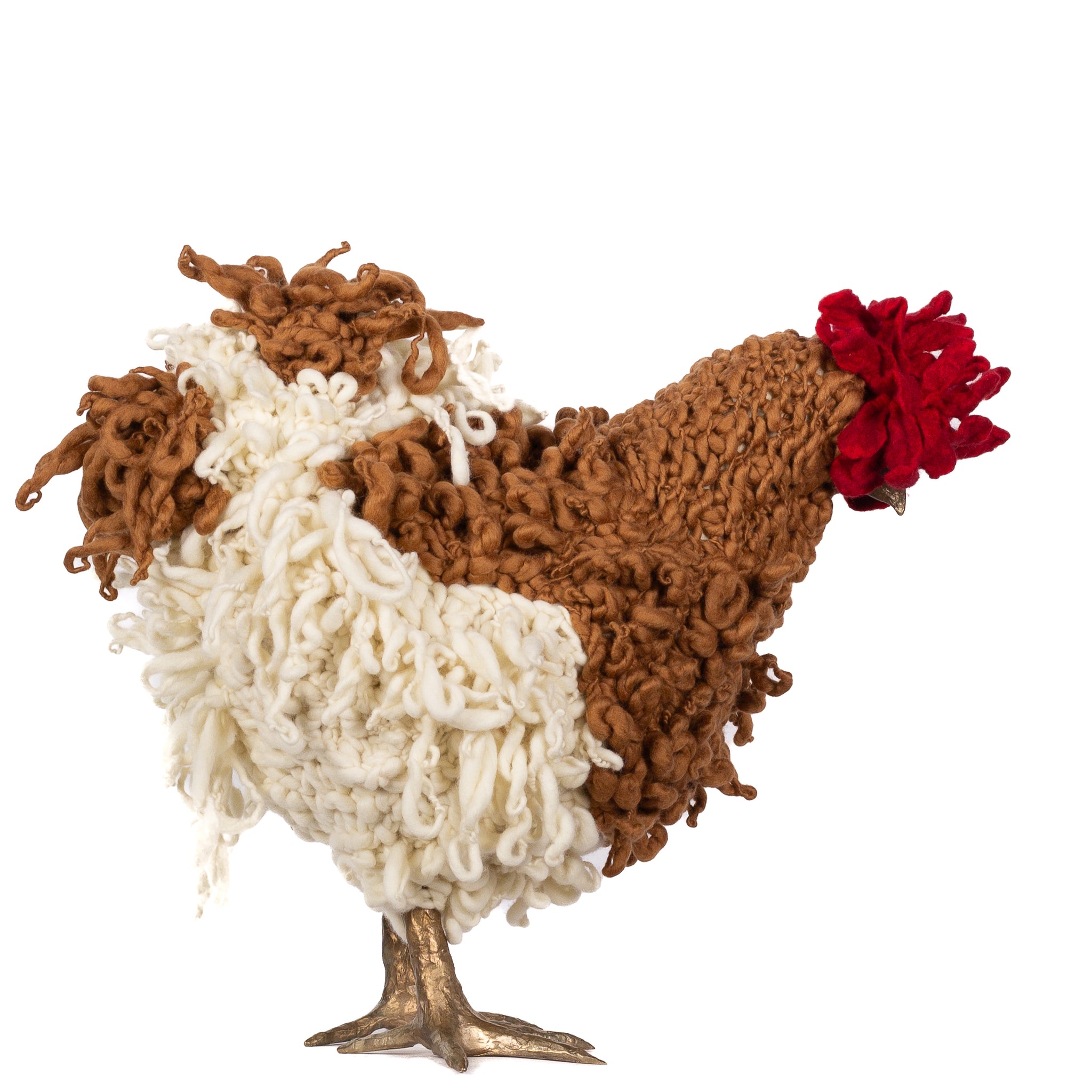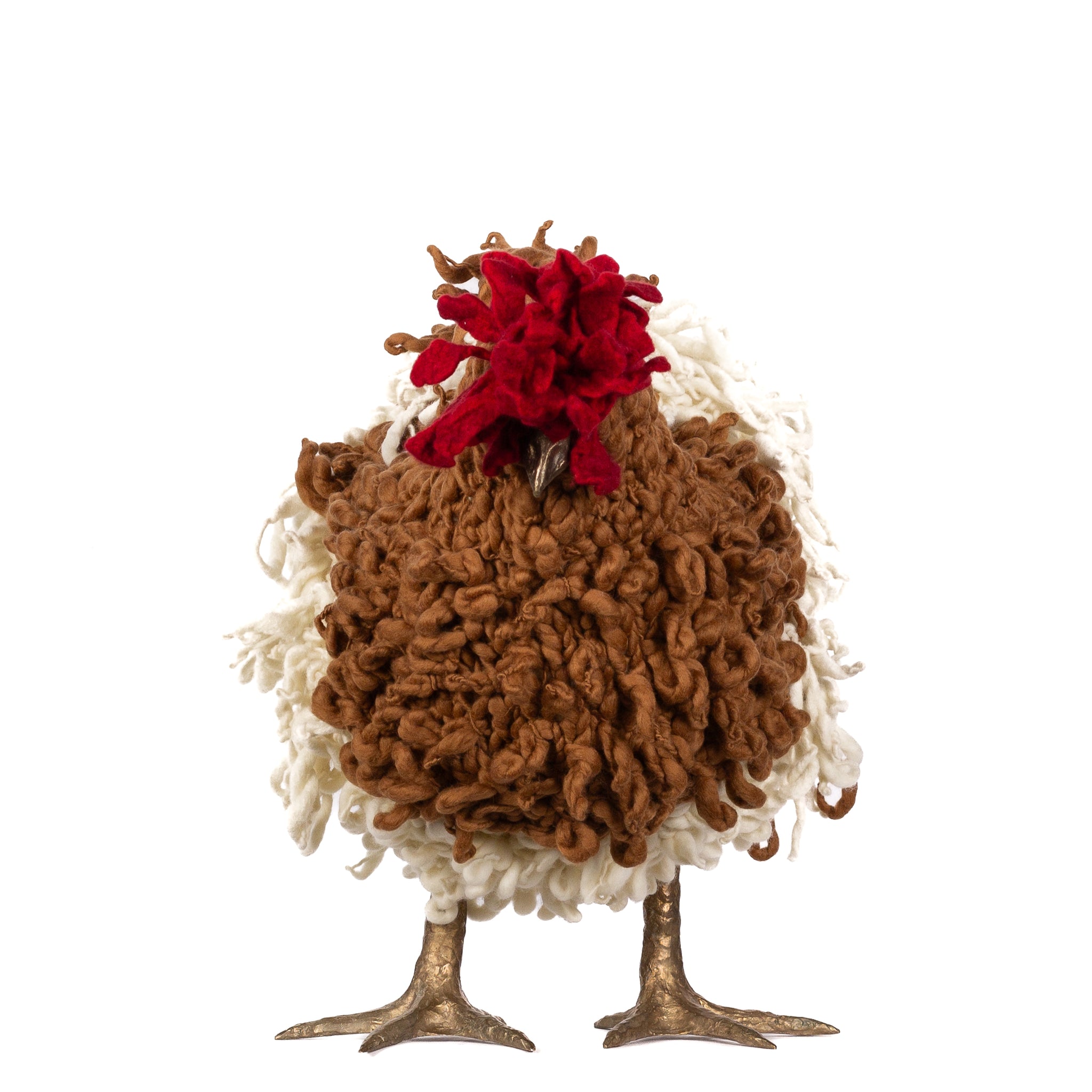 The chickens are sculpted in Kansas City, Missouri with care and delight, upholstered to function as footstools. Each is one-of-a-kind, unique in posture and personality. A turned wood egg-shaped core stands on bronze feet and is connected to a bronze beak. Feathers are fashioned with traditional fiber art techniques- dyeing, felting, spinning, knitting- and are stitched by hand. And a surprise? Their heads bob.