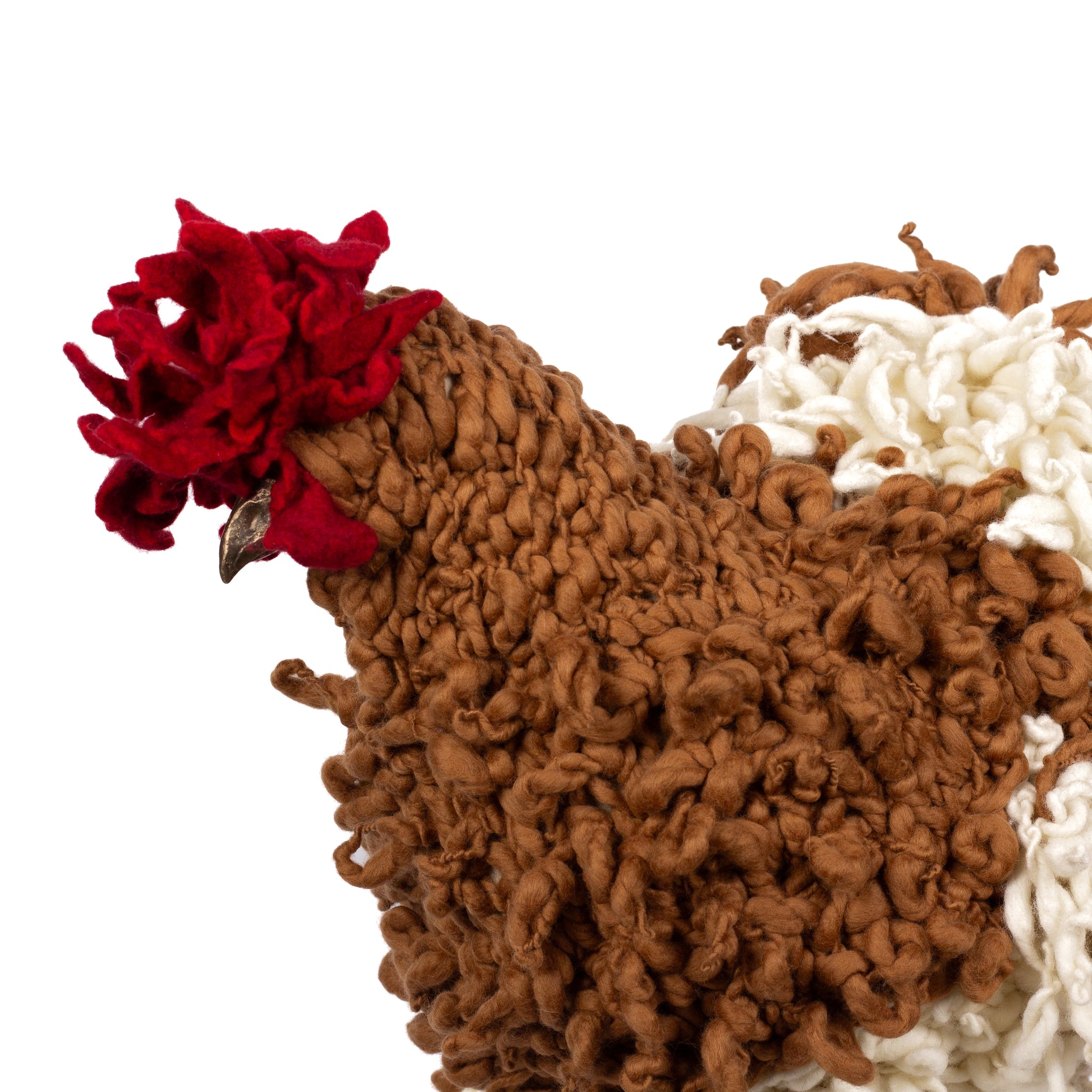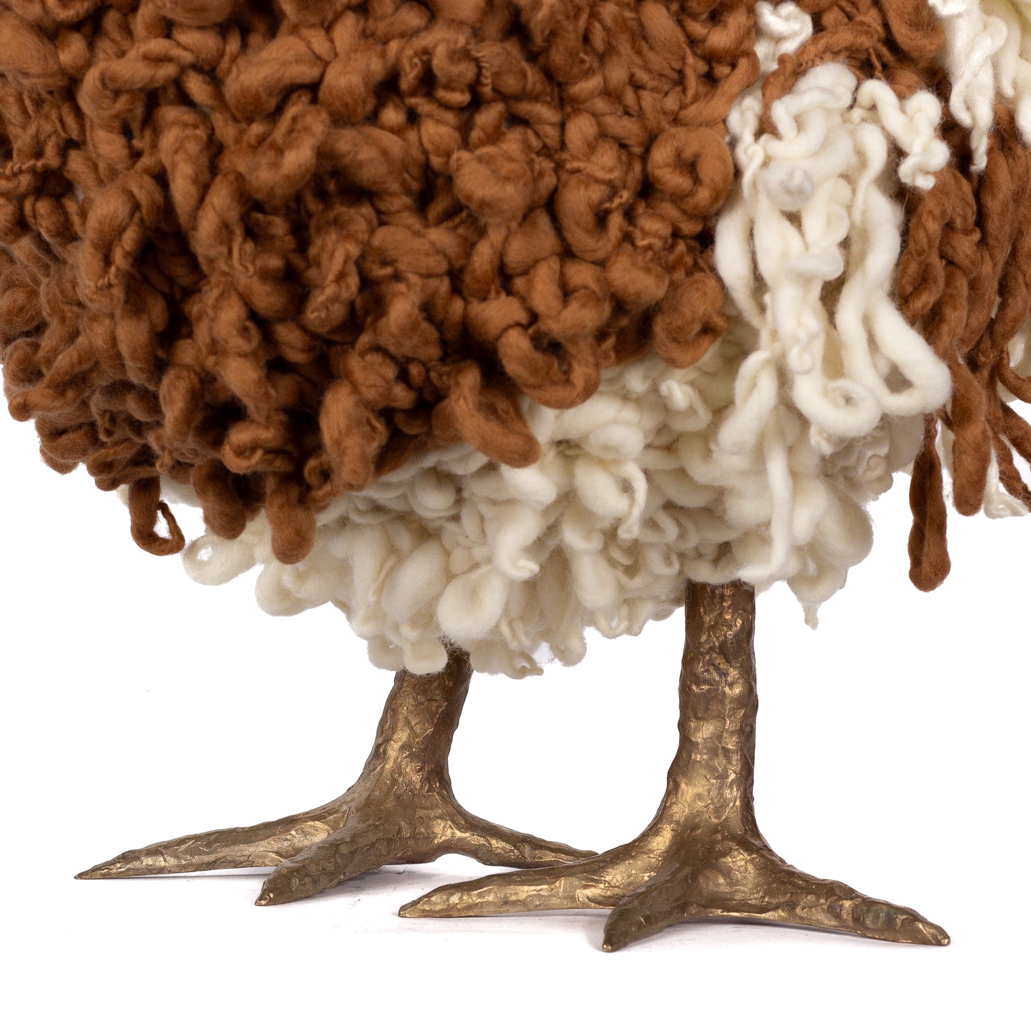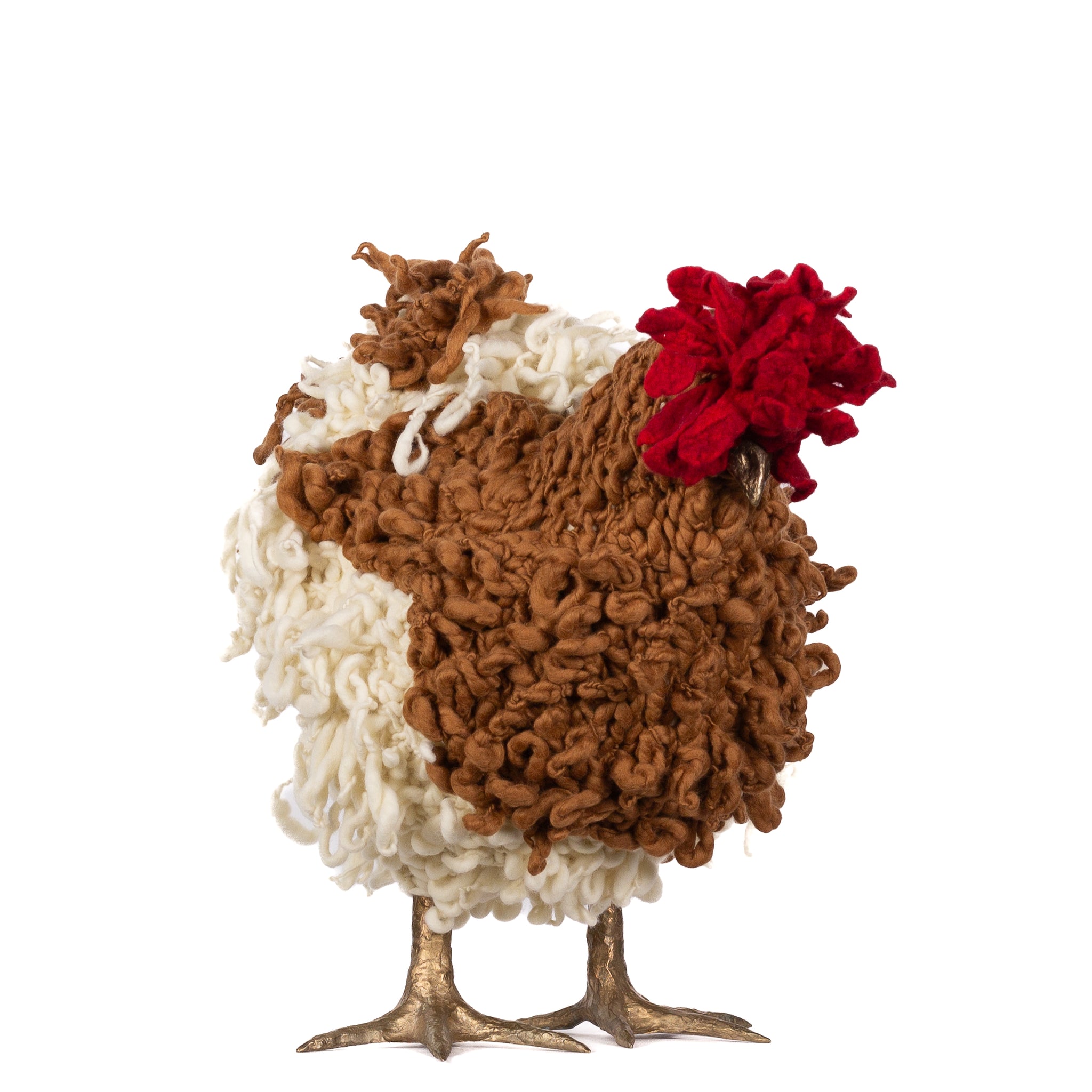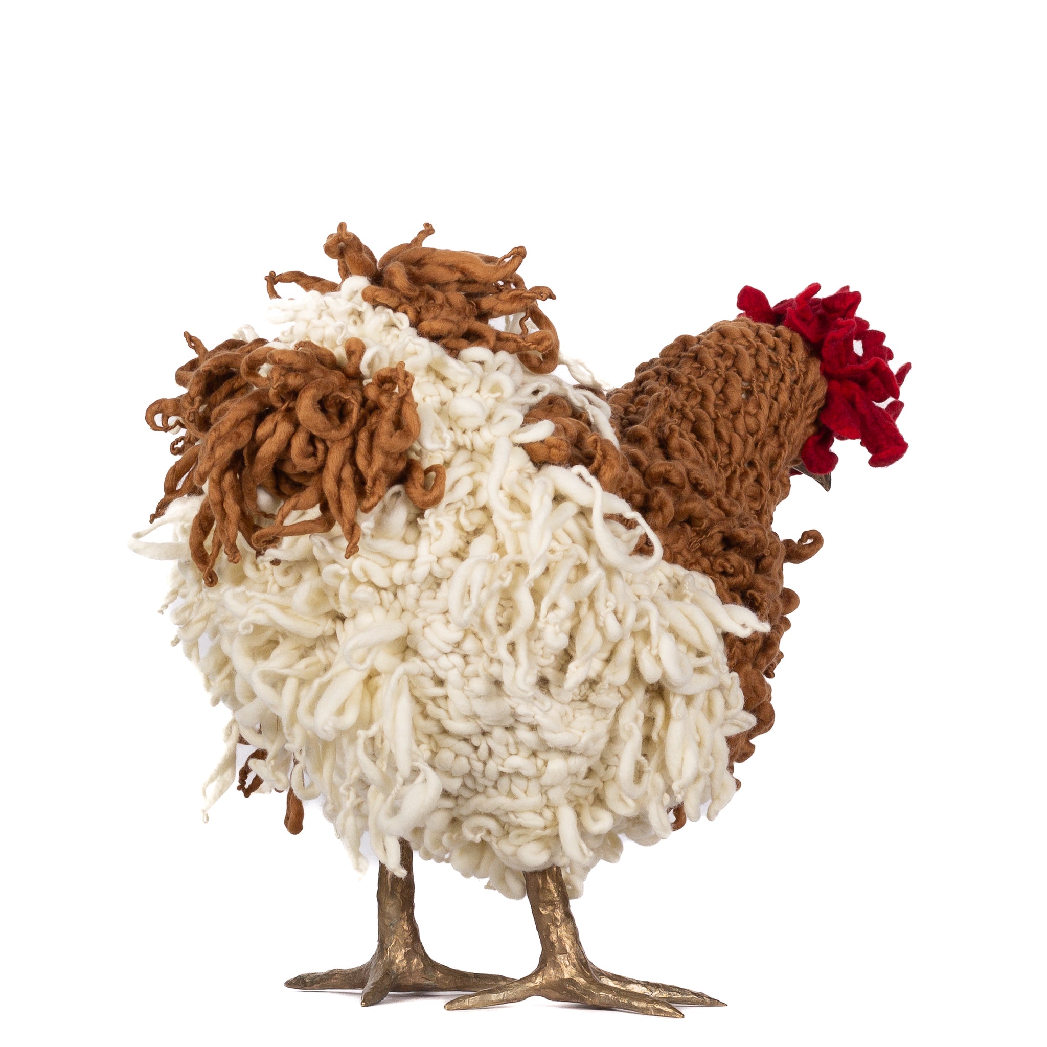 The chickens are sculpted in Kansas City, Missouri with care and delight, upholstered to function as footstools. Each is one-of-a-kind, unique in posture and personality. A turned wood egg-shaped core stands on bronze feet and is connected to a bronze beak. Feathers are fashioned with traditional fiber art techniques- dyeing, felting, spinning, knitting- and are stitched by hand. And a surprise? Their heads bob.
