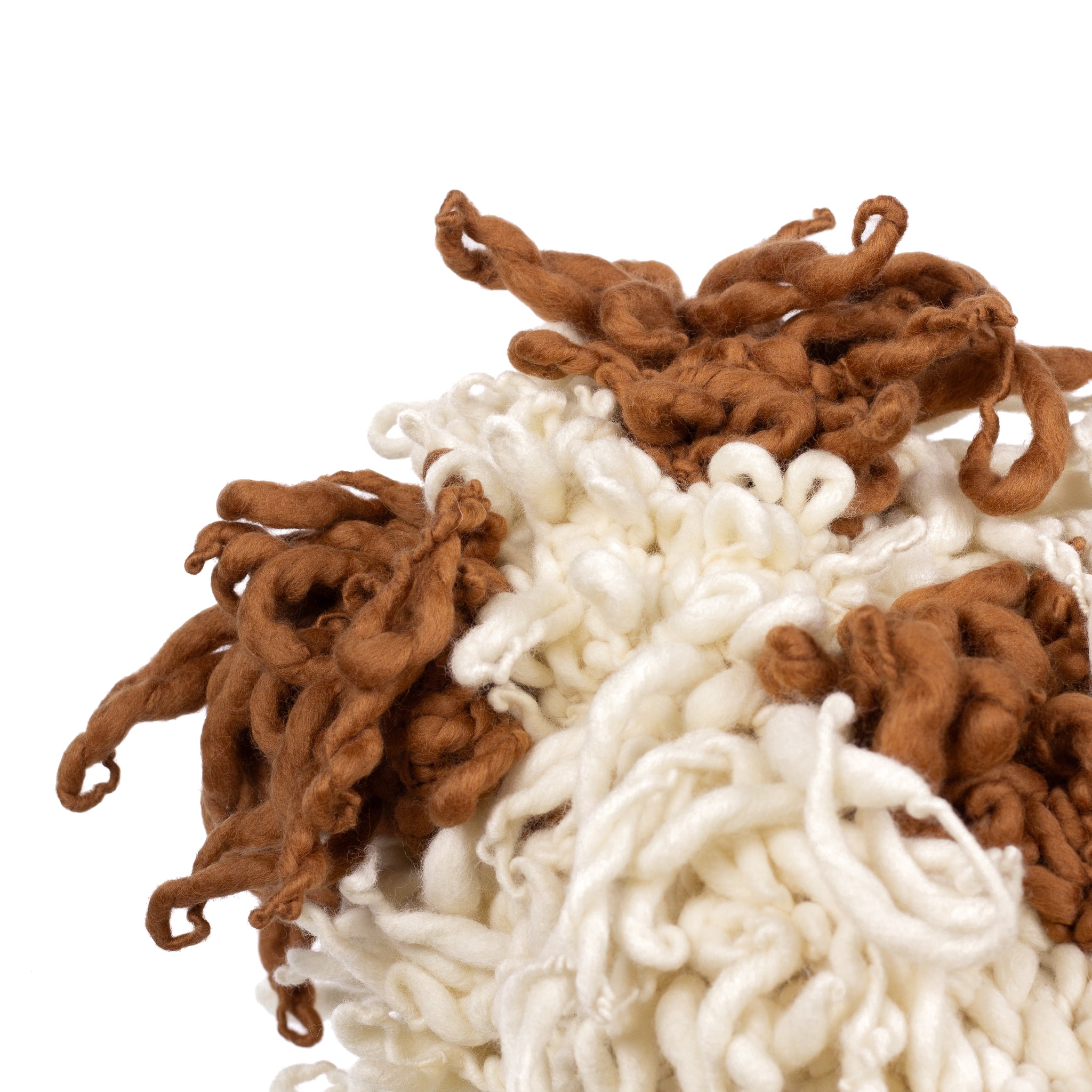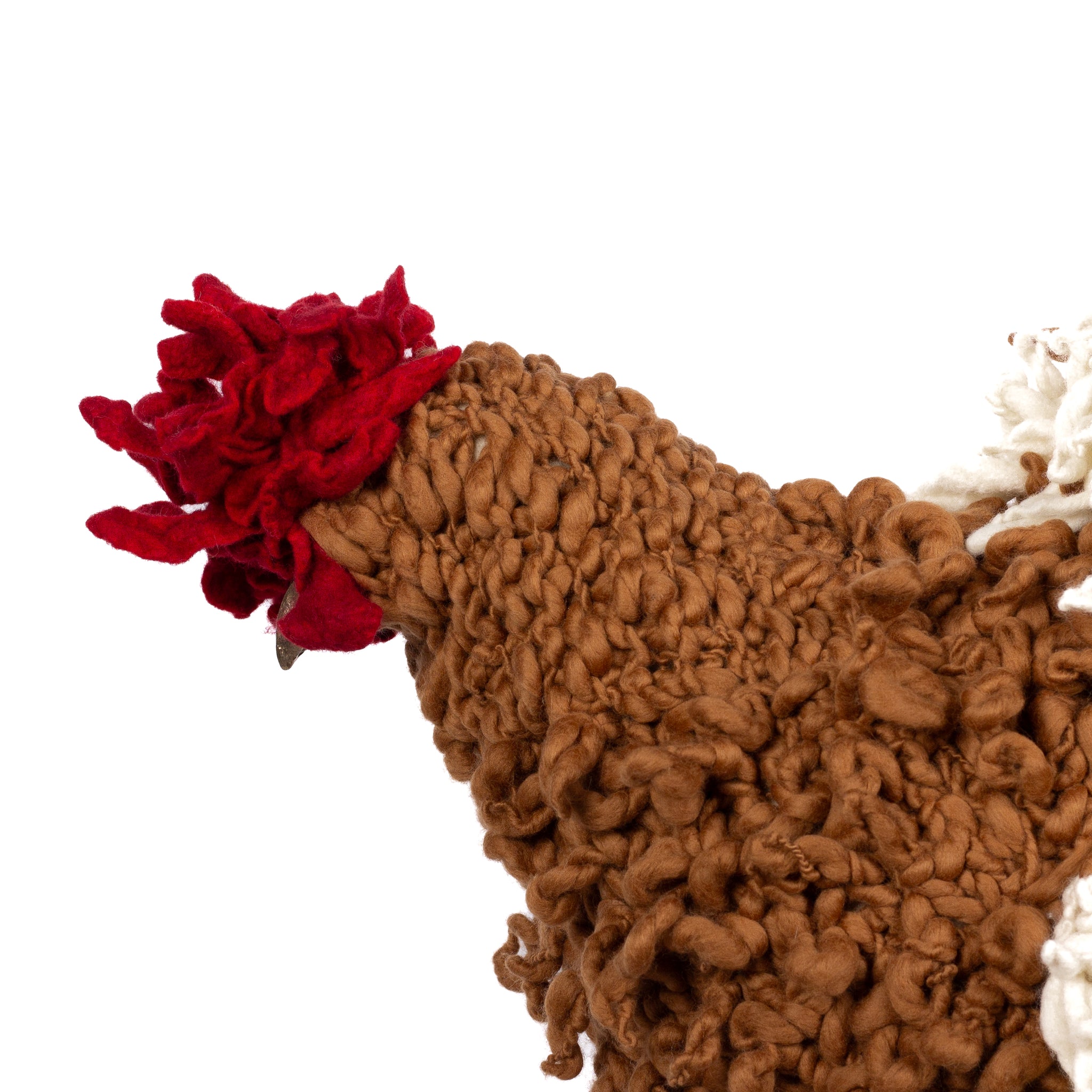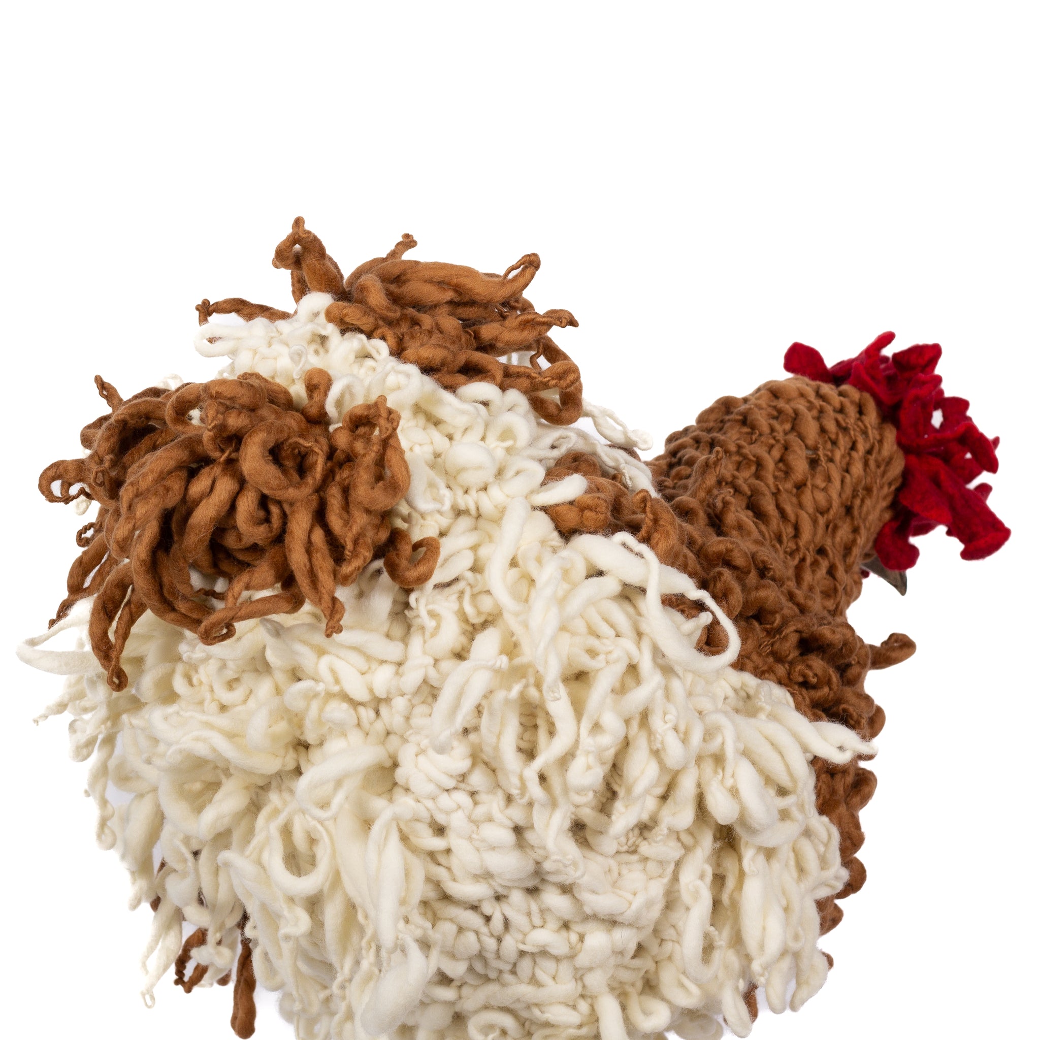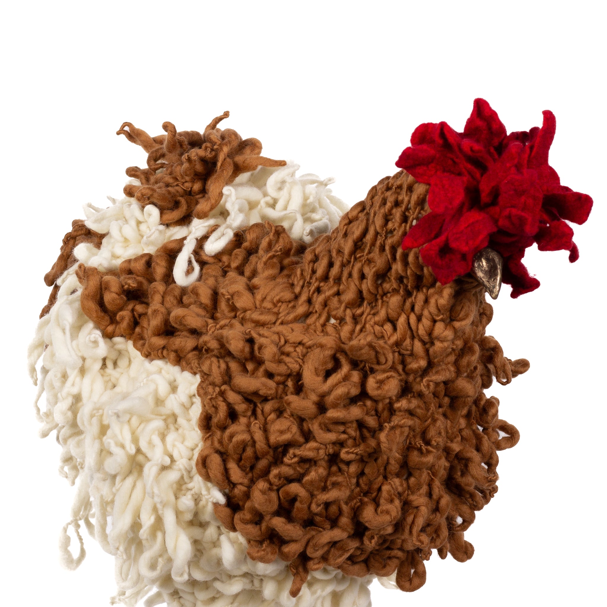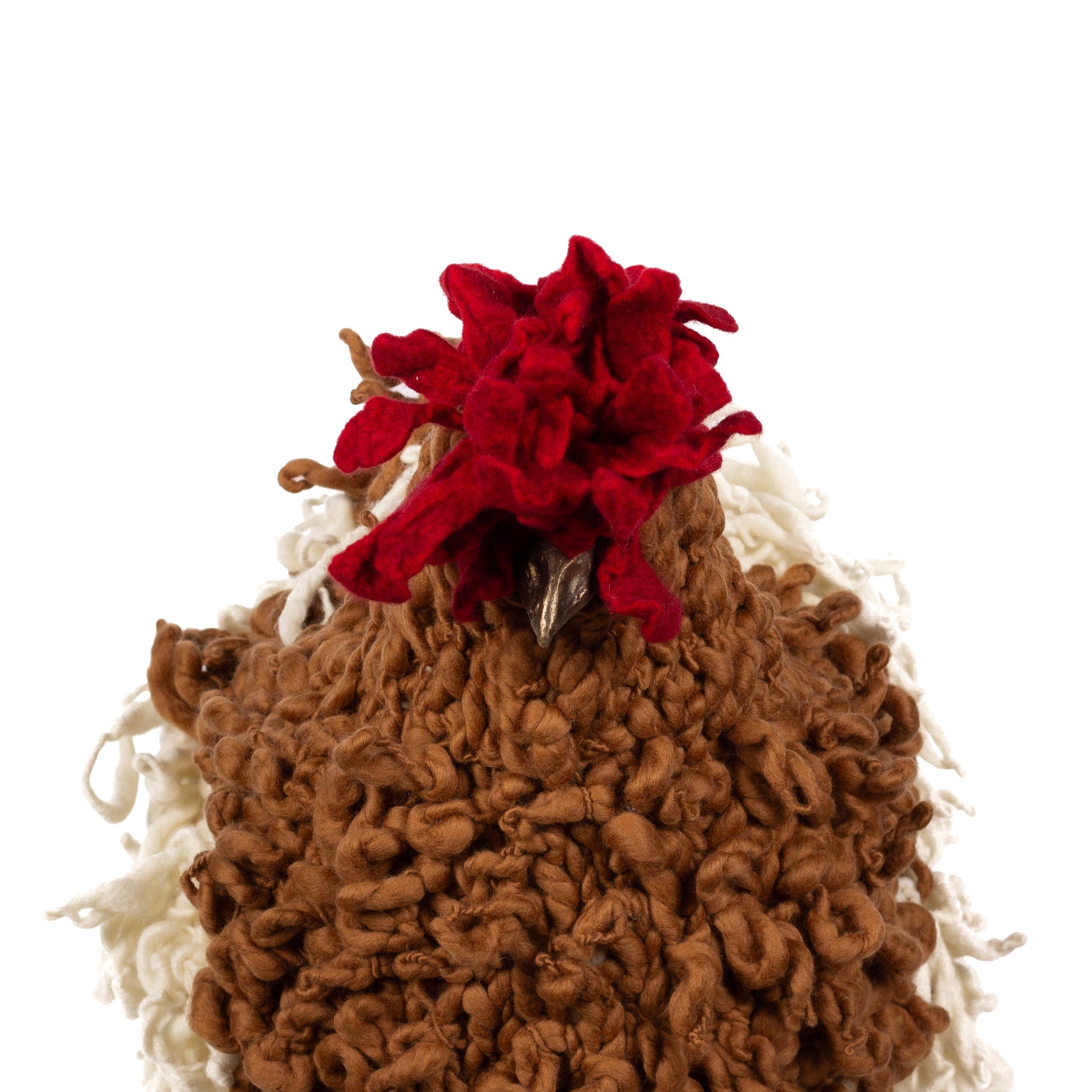 The chickens are sculpted in Kansas City, Missouri with care and delight, upholstered to function as footstools. Each is one-of-a-kind, unique in posture and personality. A turned wood egg-shaped core stands on bronze feet and is connected to a bronze beak. Feathers are fashioned with traditional fiber art techniques- dyeing, felting, spinning, knitting- and are stitched by hand. And a surprise? Their heads bob.