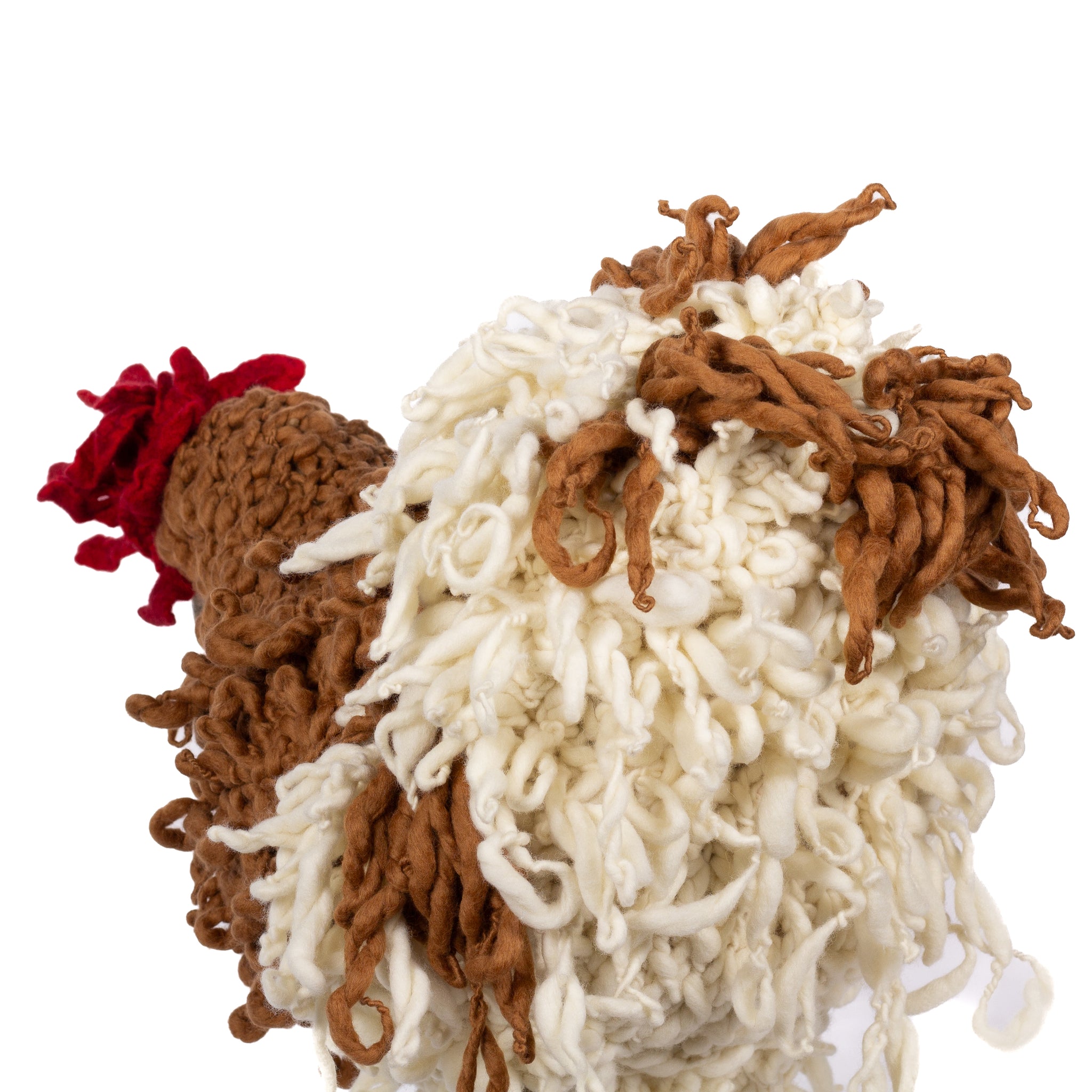 Glo is a Chicken Little Footstool whose feathers are fashioned with hand-knit 100% Merino wool. She is looking for a good home.