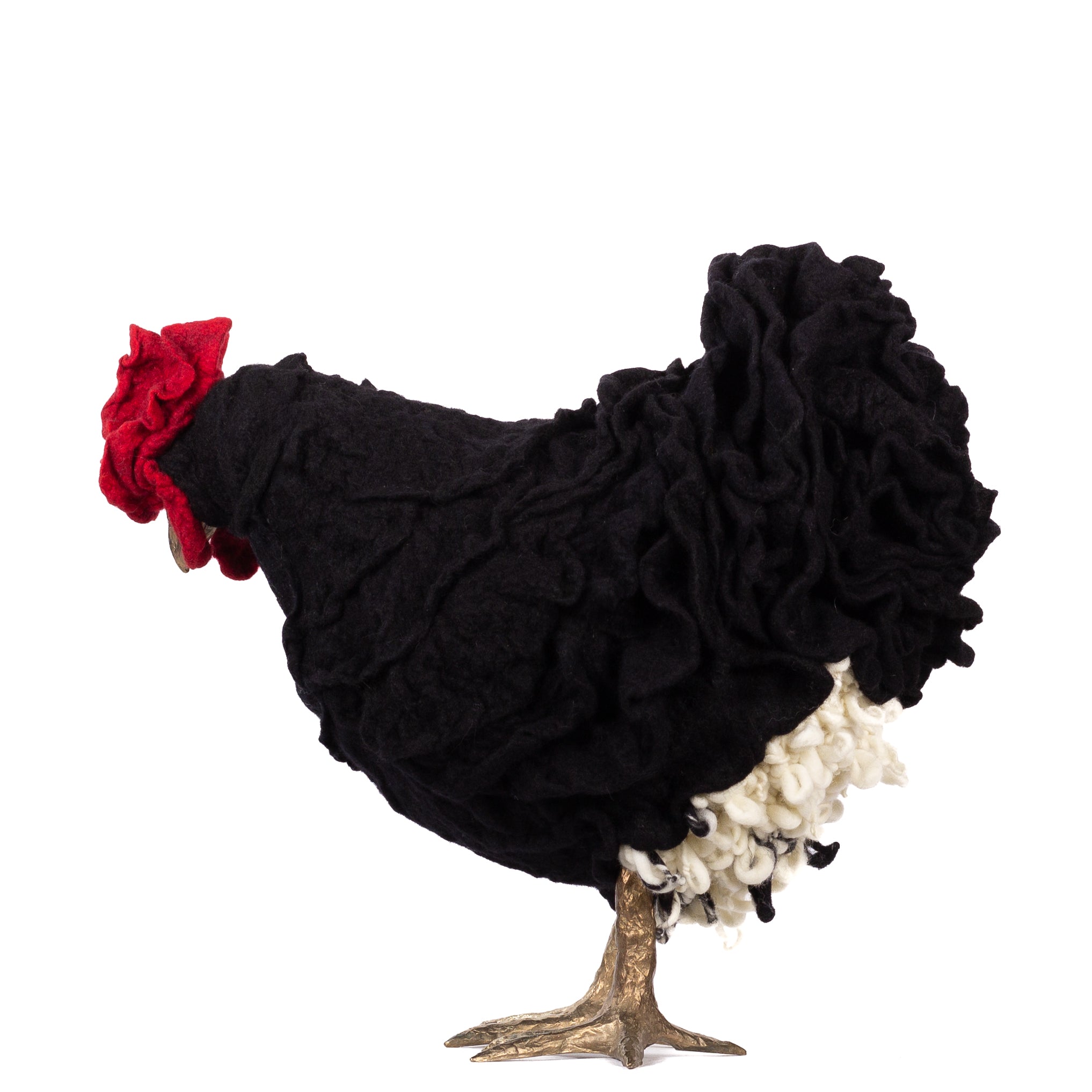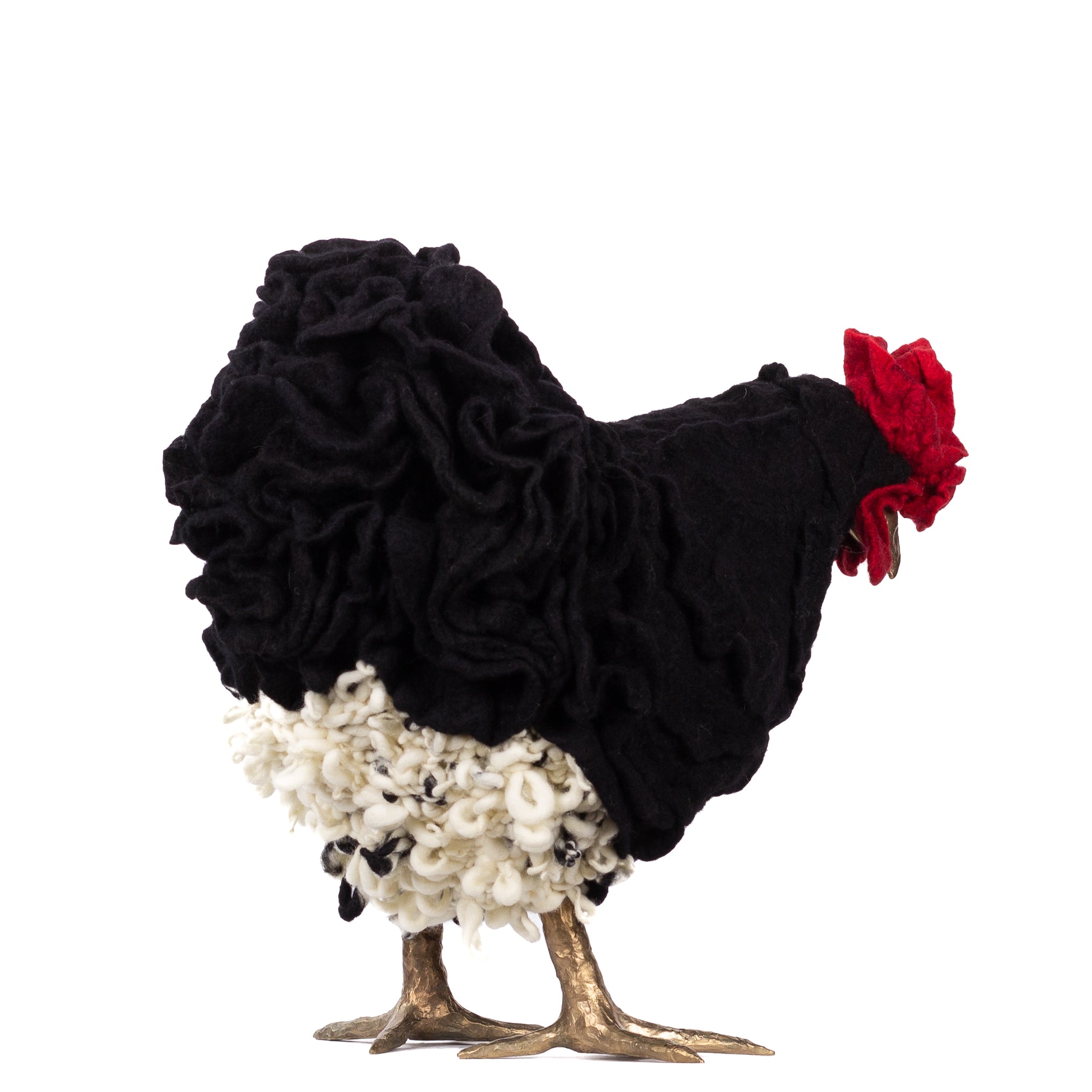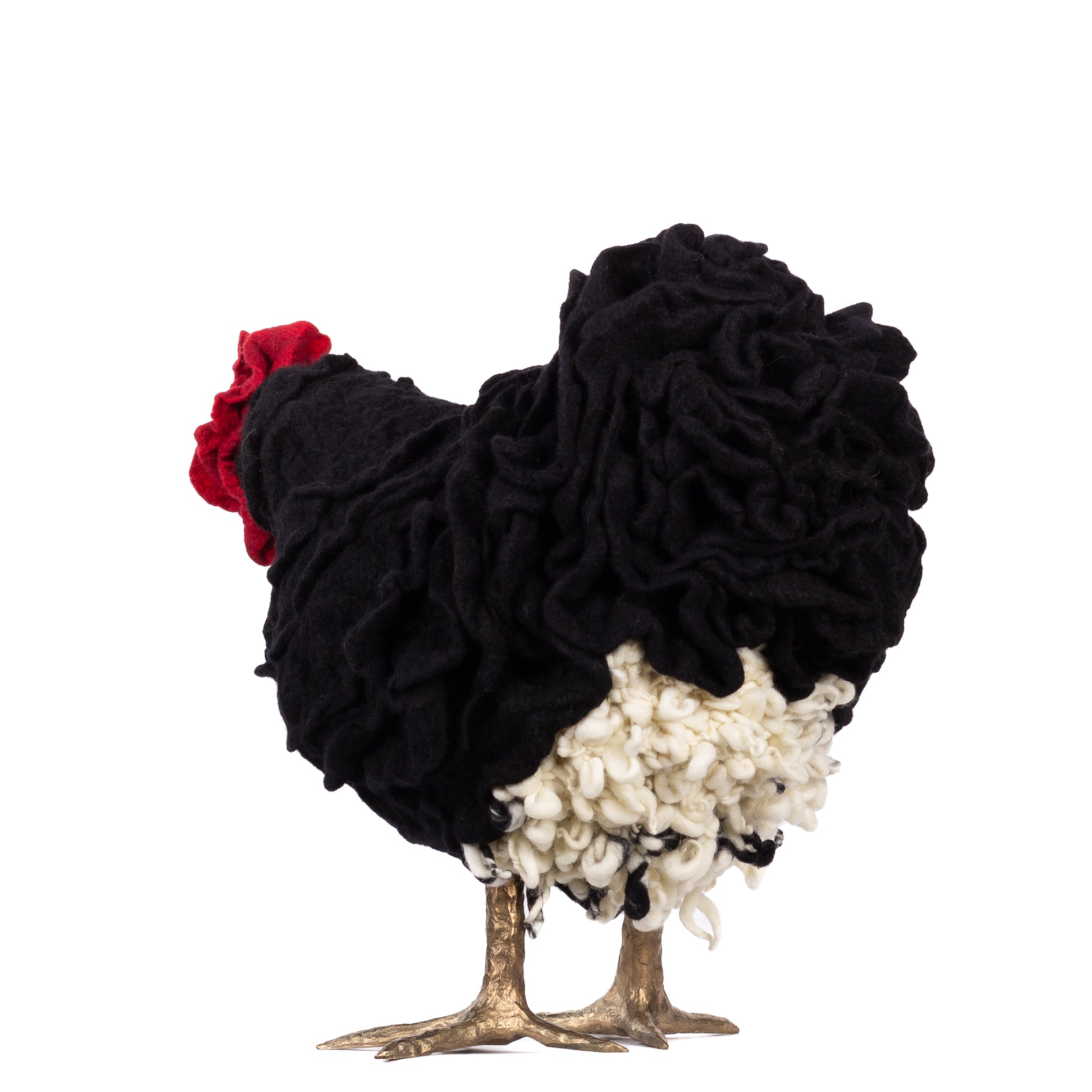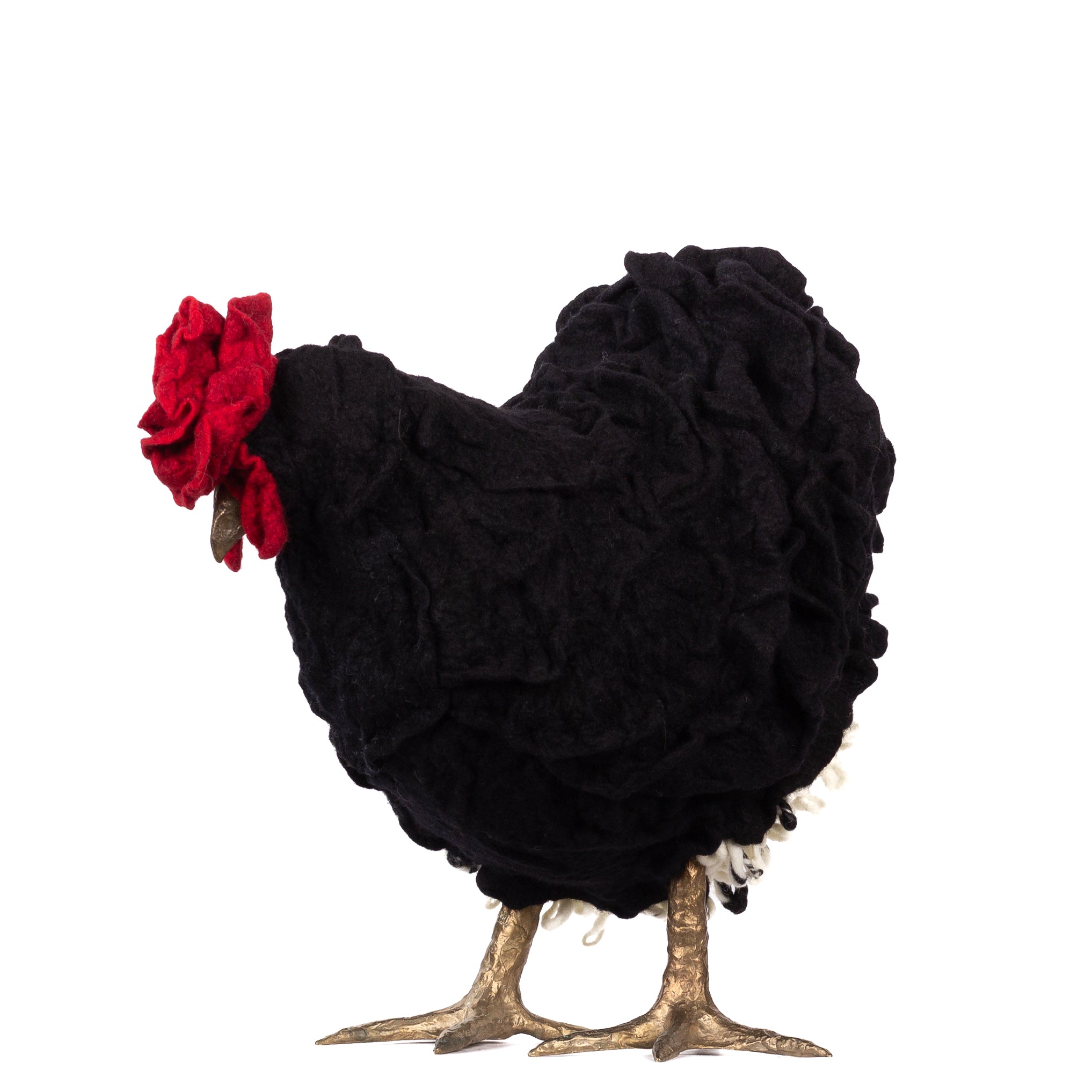 The chickens are sculpted in Kansas City, Missouri with care and delight, upholstered to function as footstools. Each is one-of-a-kind, unique in posture and personality. A turned wood egg-shaped core stands on bronze feet and is connected to a bronze beak. Feathers are fashioned with traditional fiber art techniques- dyeing, felting, spinning, knitting- and are stitched by hand. And a surprise? Their heads bob.