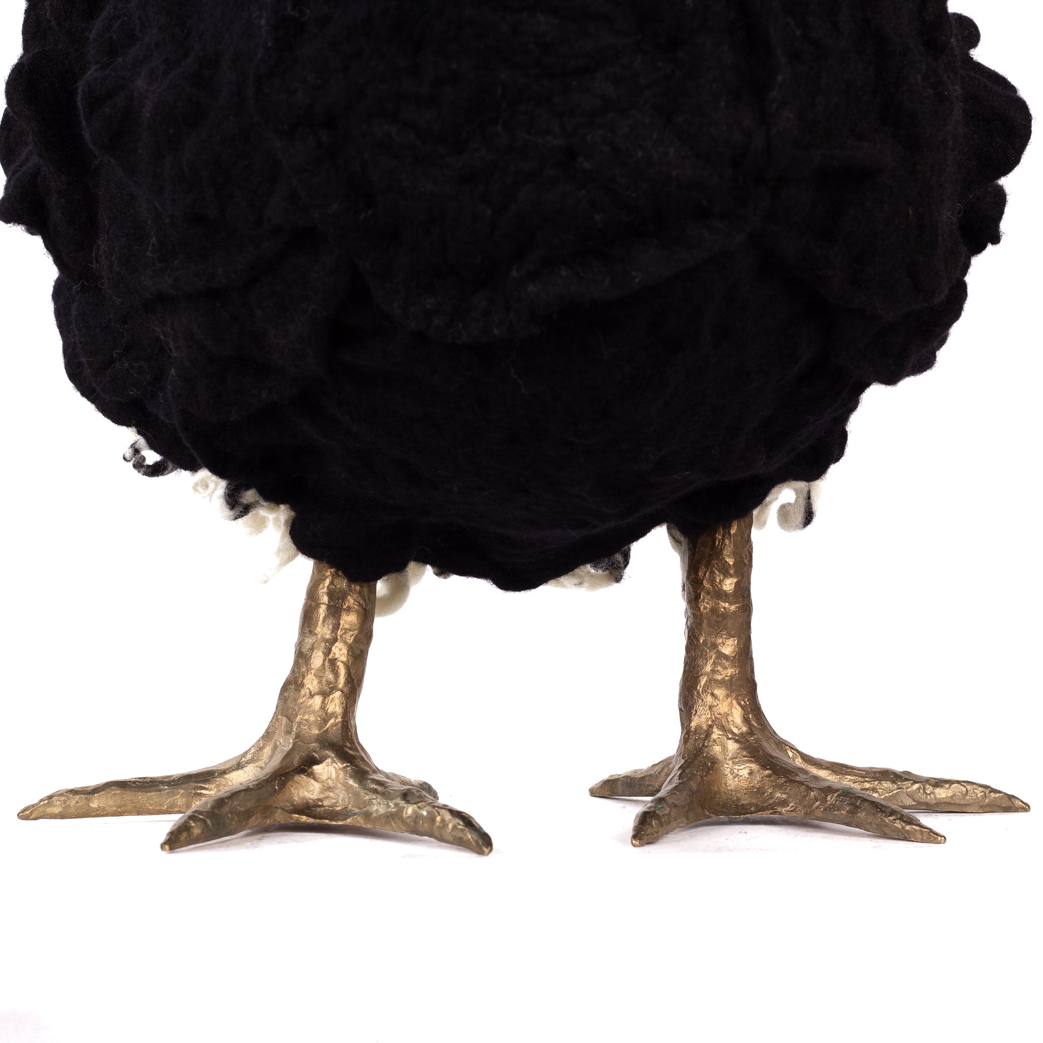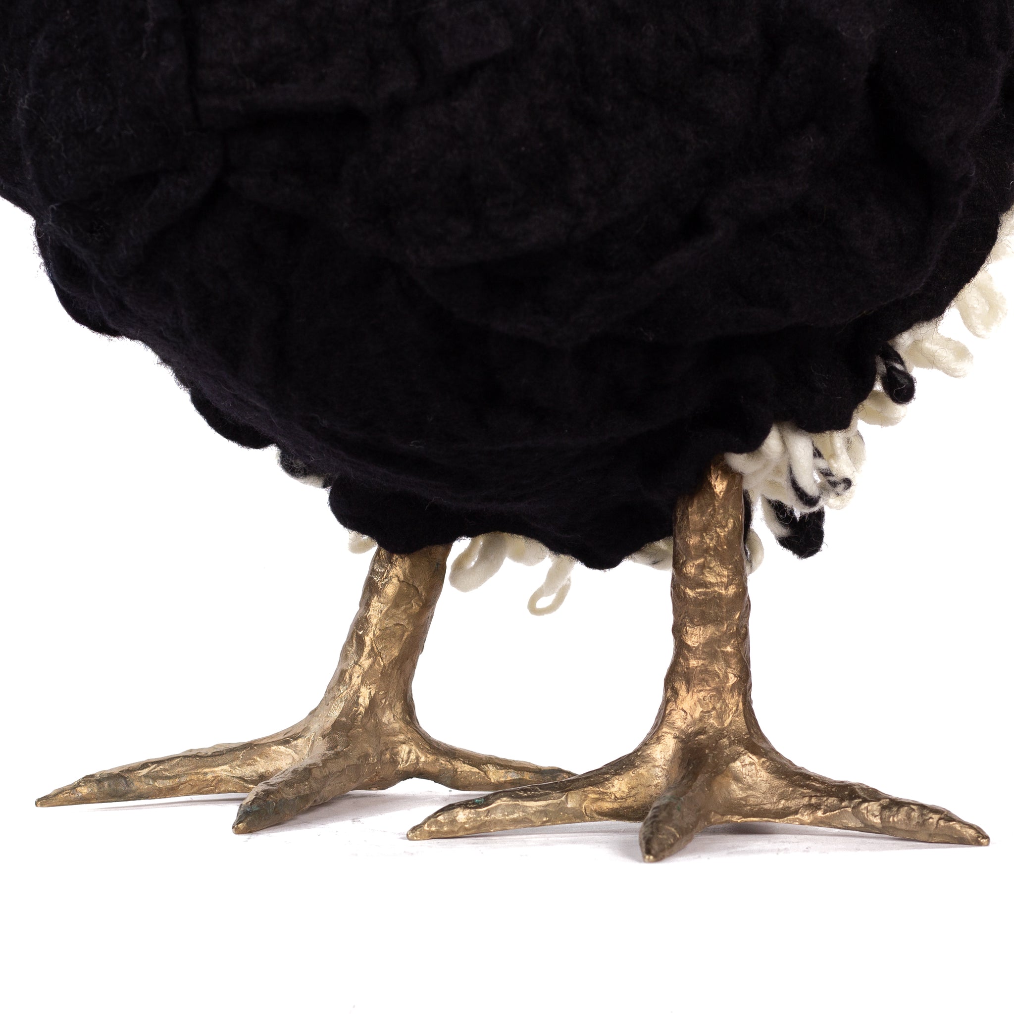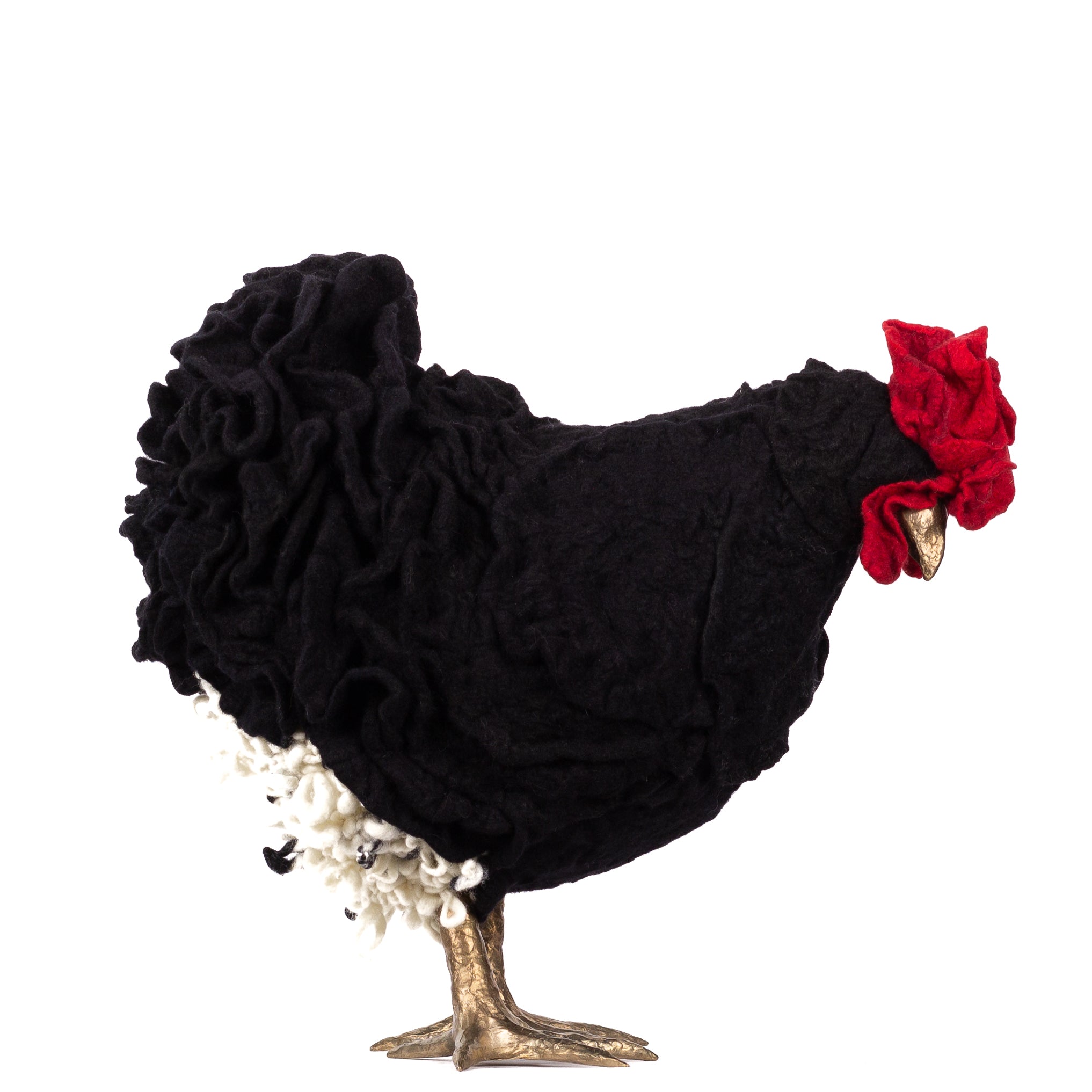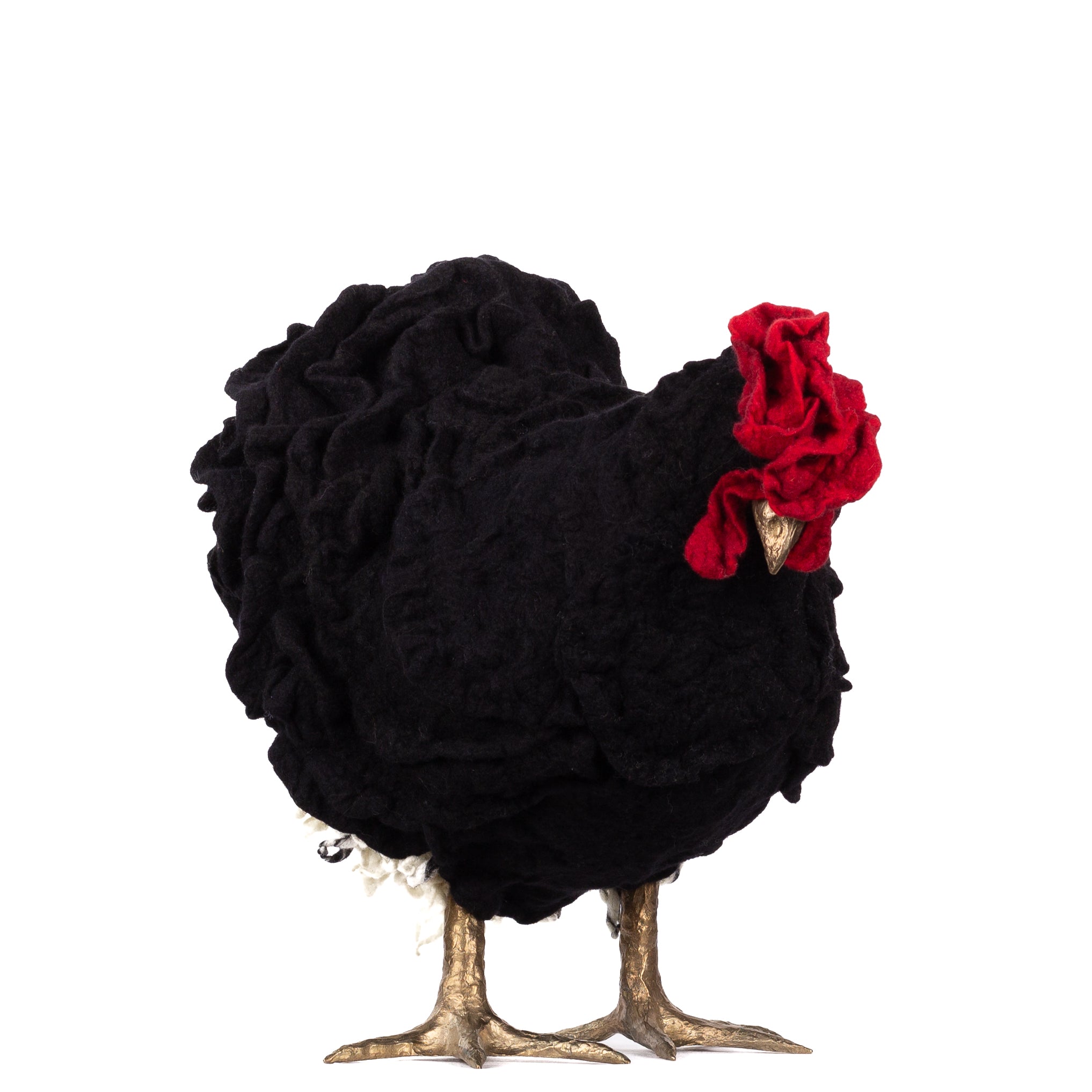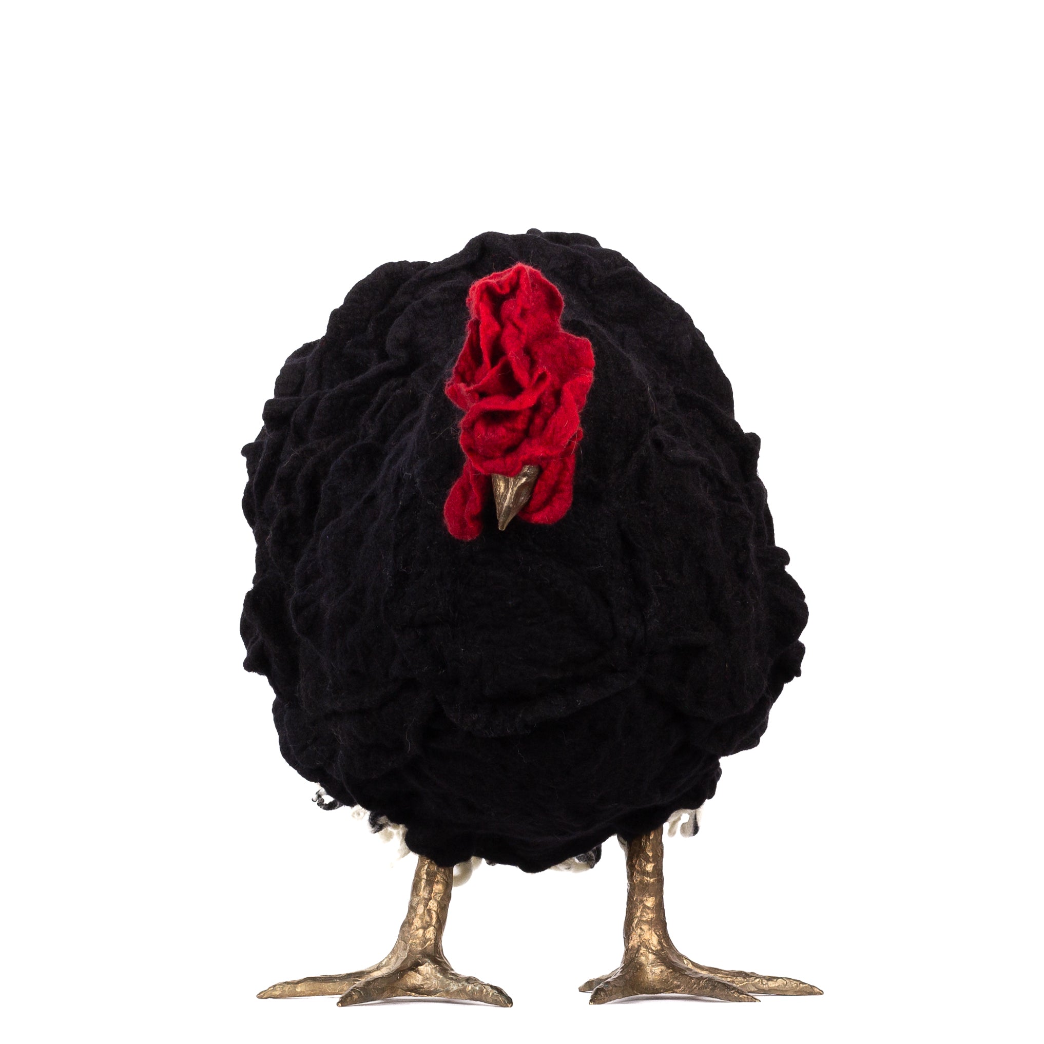 The chickens are sculpted in Kansas City, Missouri with care and delight, upholstered to function as footstools. Each is one-of-a-kind, unique in posture and personality. A turned wood egg-shaped core stands on bronze feet and is connected to a bronze beak. Feathers are fashioned with traditional fiber art techniques- dyeing, felting, spinning, knitting- and are stitched by hand. And a surprise? Their heads bob.