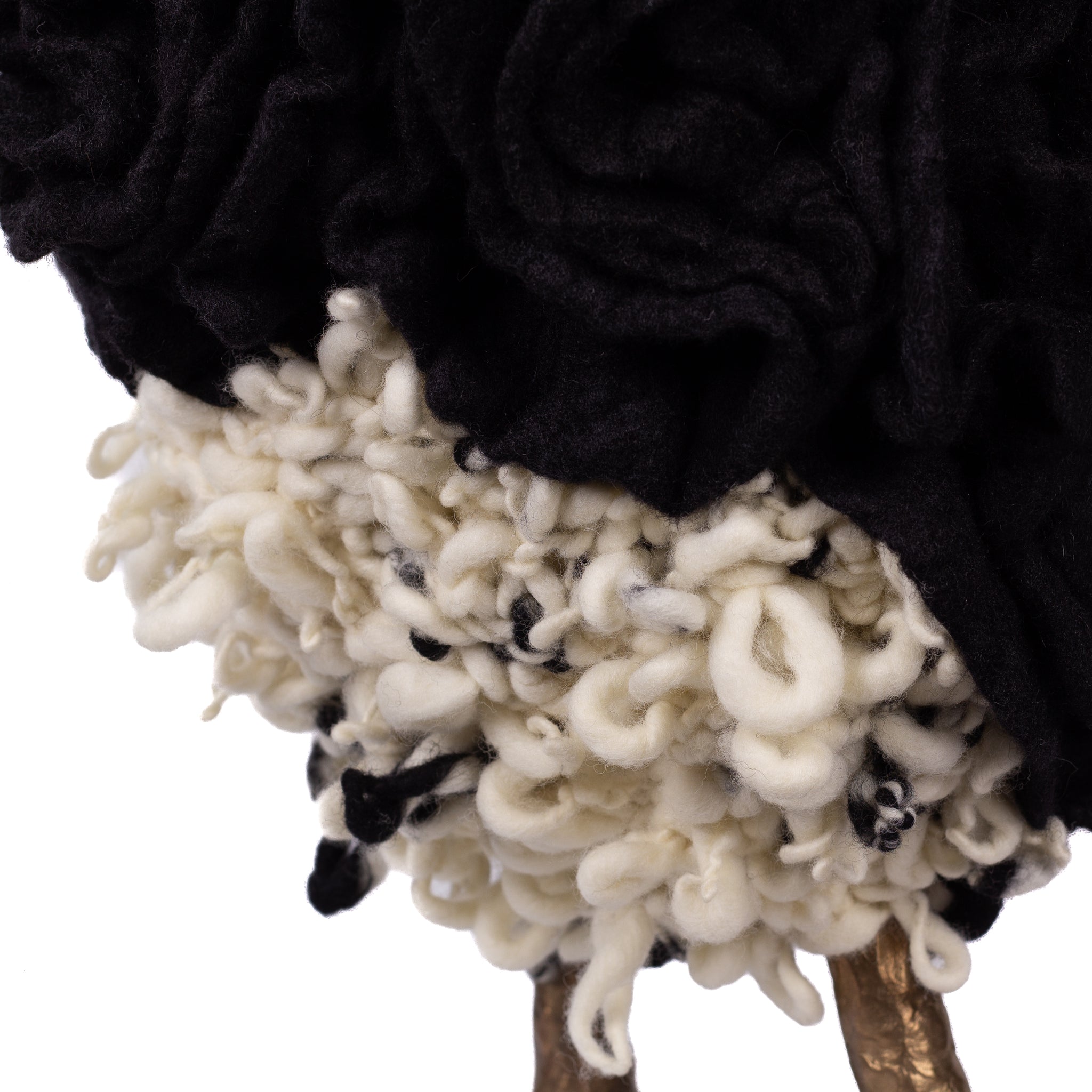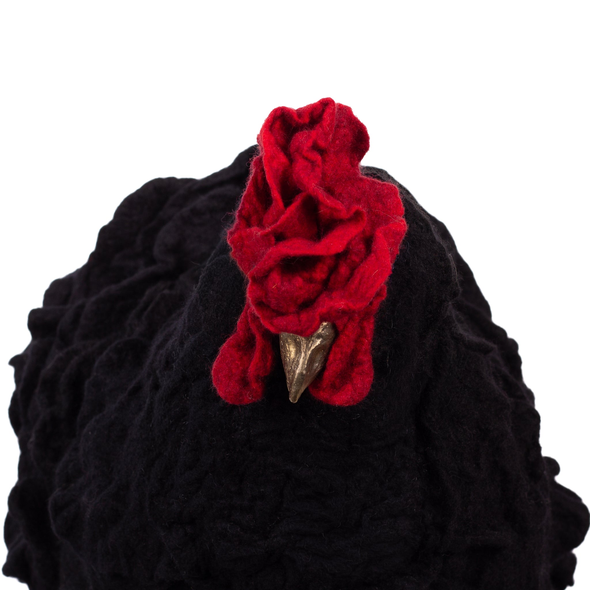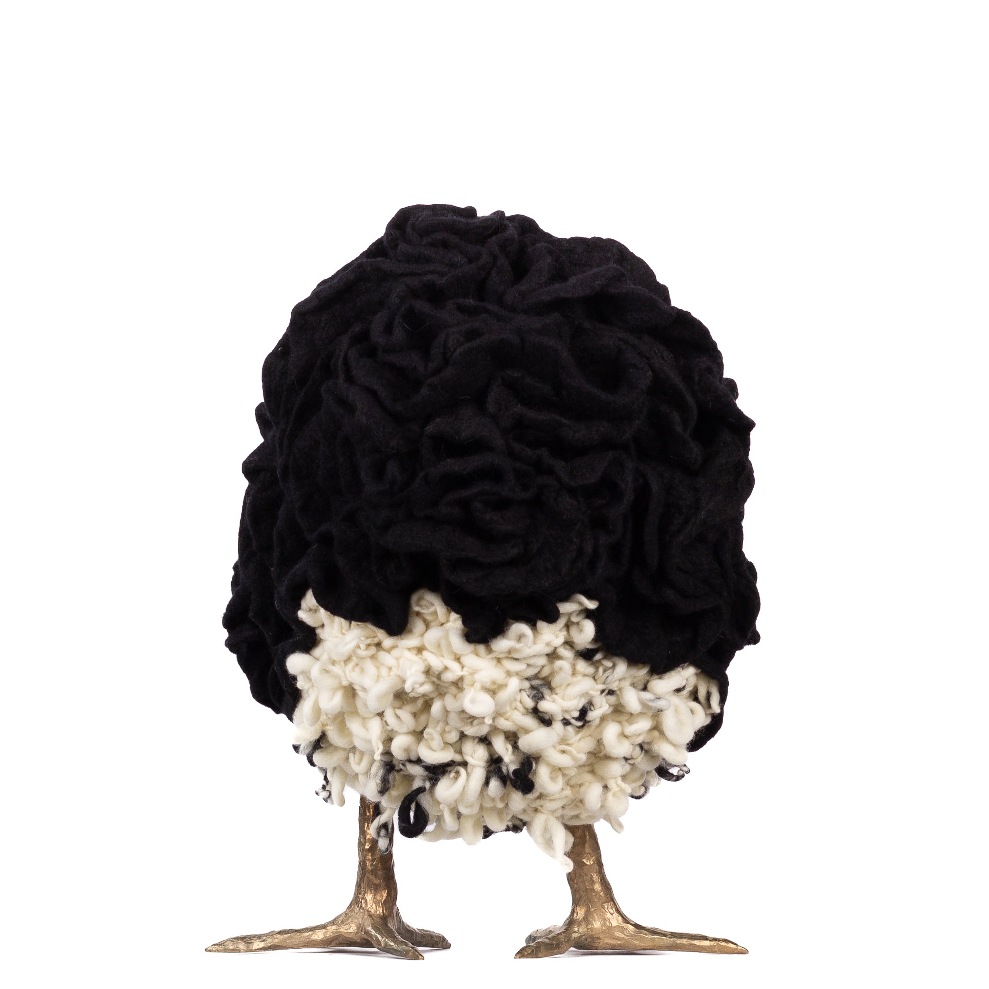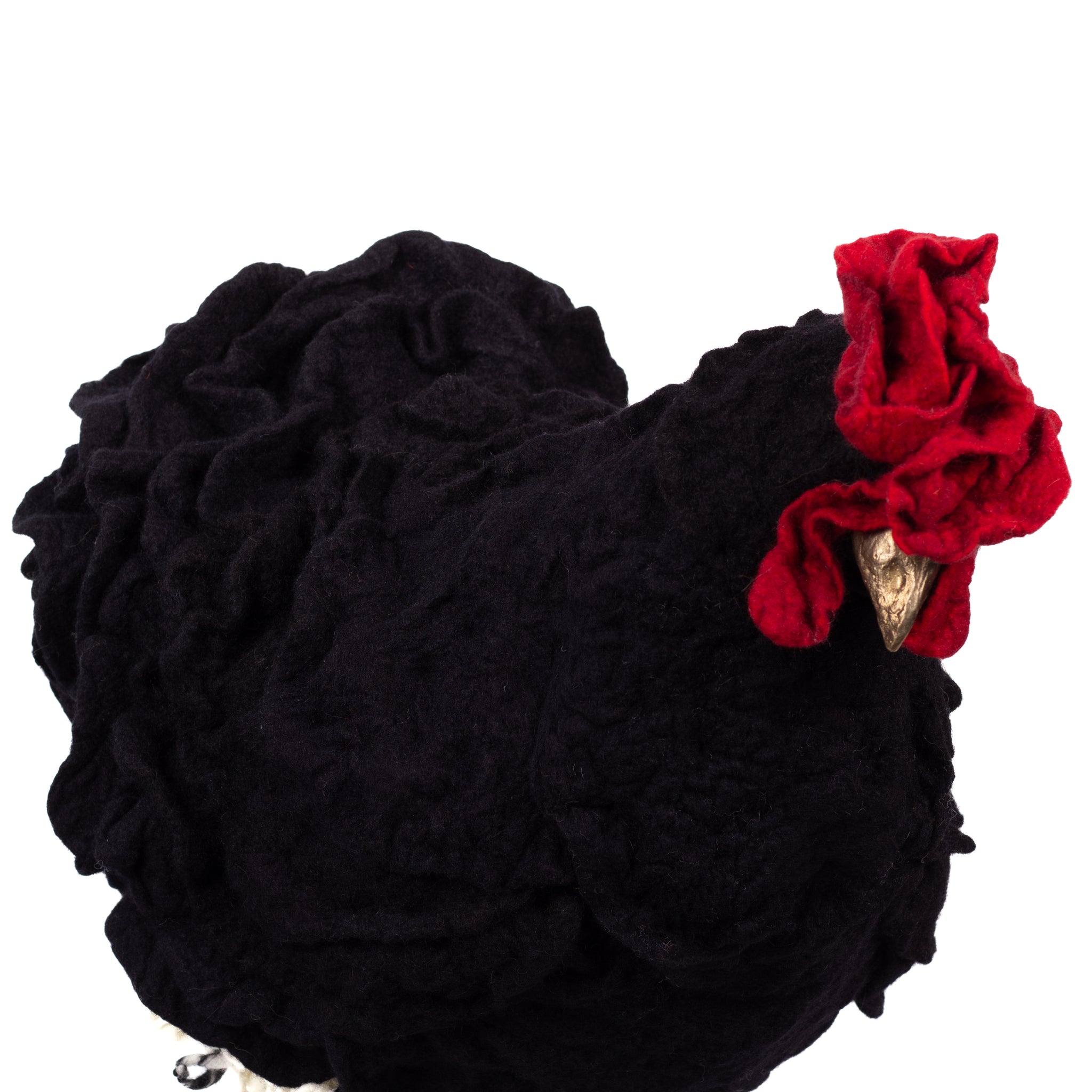 The chickens are sculpted in Kansas City, Missouri with care and delight, upholstered to function as footstools. Each is one-of-a-kind, unique in posture and personality. A turned wood egg-shaped core stands on bronze feet and is connected to a bronze beak. Feathers are fashioned with traditional fiber art techniques- dyeing, felting, spinning, knitting- and are stitched by hand. And a surprise? Their heads bob.
