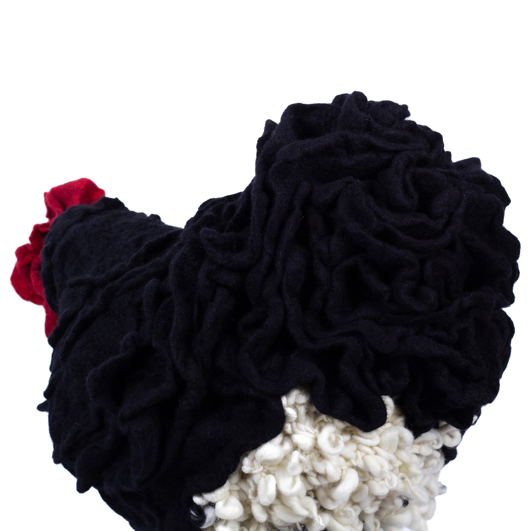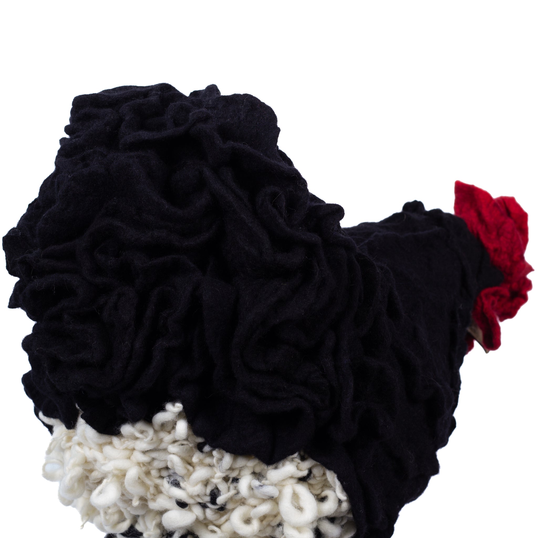 Scotti is a Chicken Little Footstool whose feathers are fashioned with hand-felt and hand-knit 100% Merino wool. She is looking for a good home.