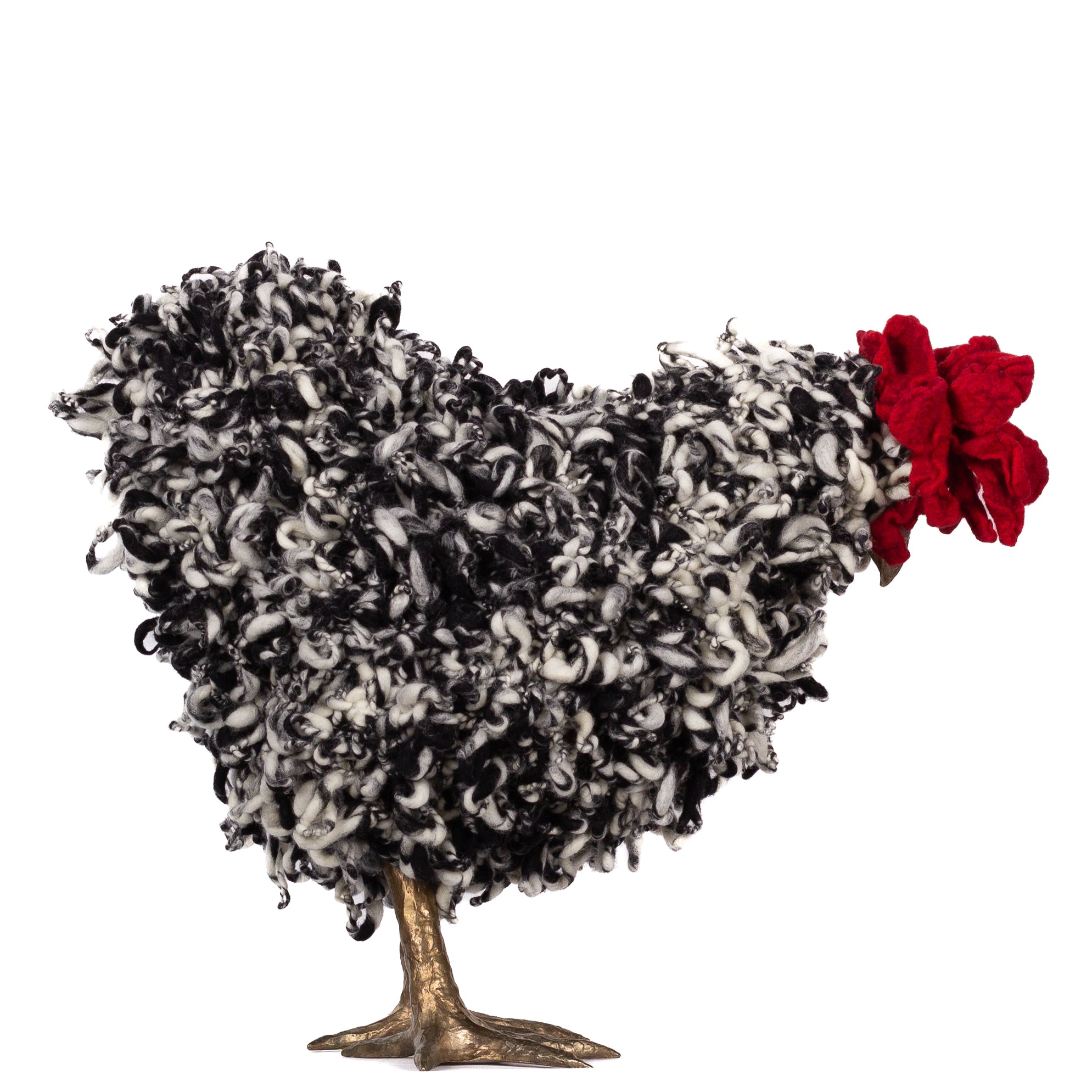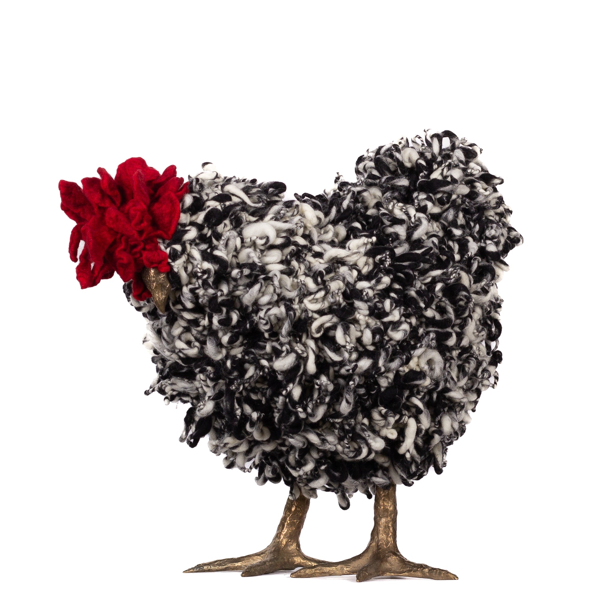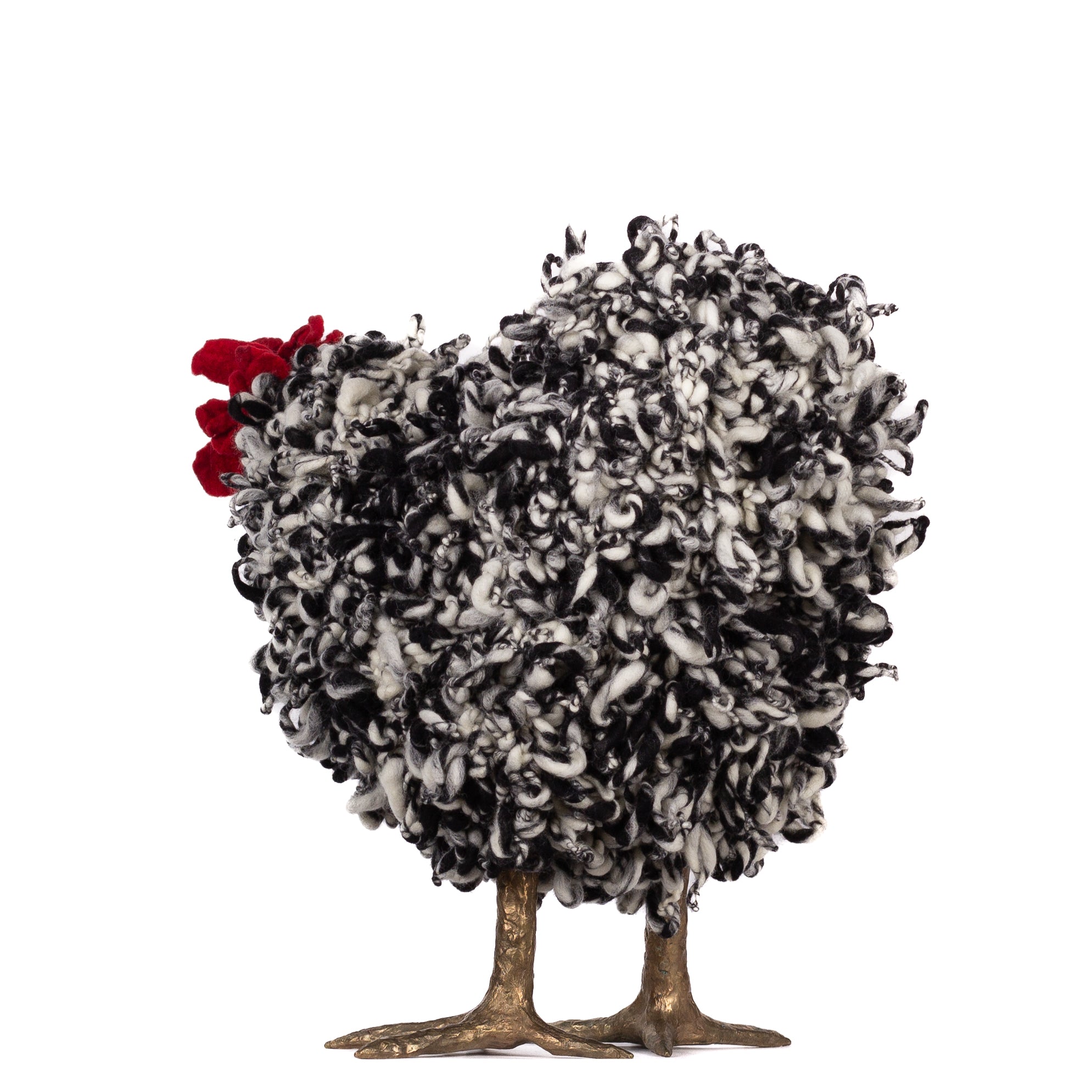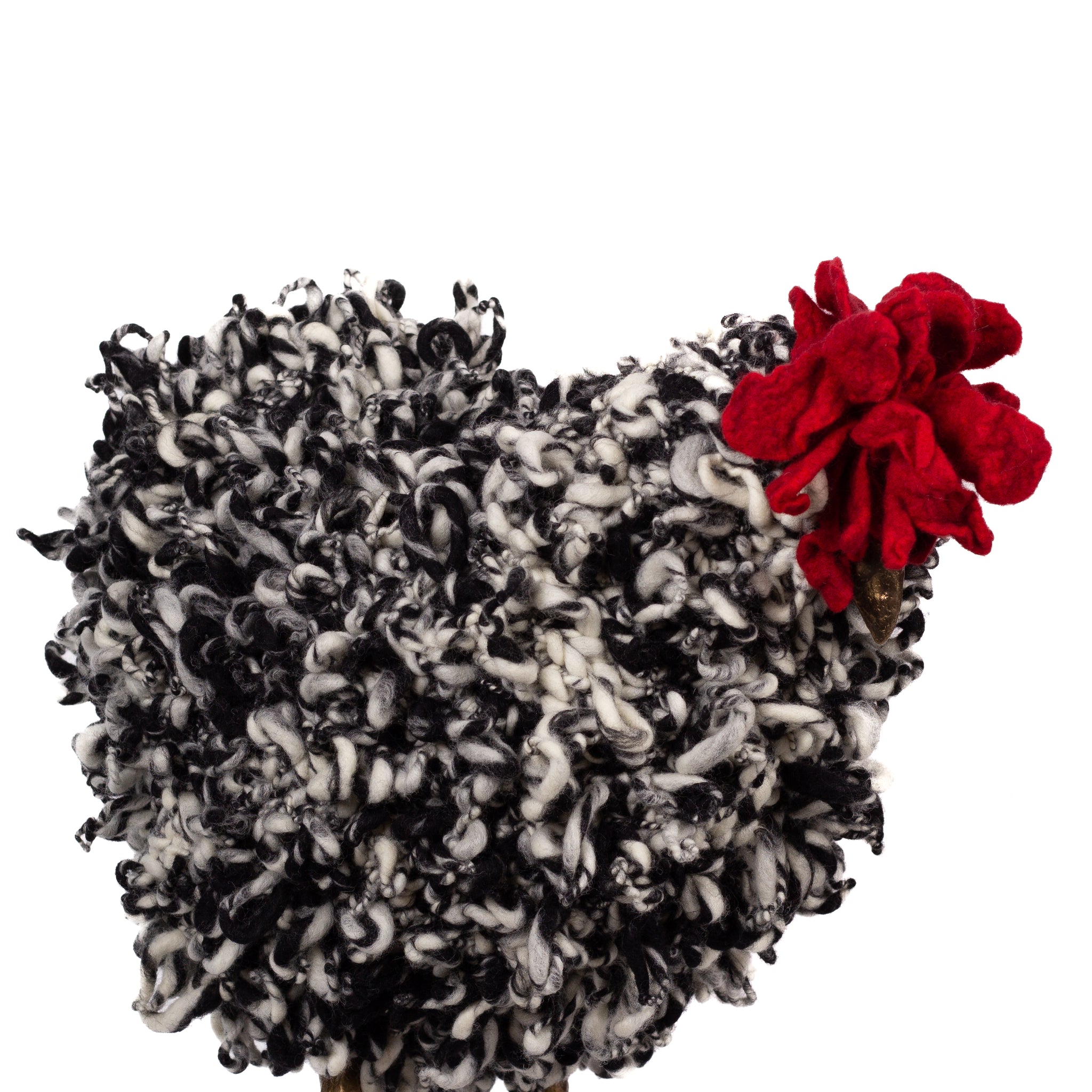 The chickens are sculpted in Kansas City, Missouri with care and delight, upholstered to function as footstools. Each is one-of-a-kind, unique in posture and personality. A turned wood egg-shaped core stands on bronze feet and is connected to a bronze beak. Feathers are fashioned with traditional fiber art techniques- dyeing, felting, spinning, knitting- and are stitched by hand. And a surprise? Their heads bob.