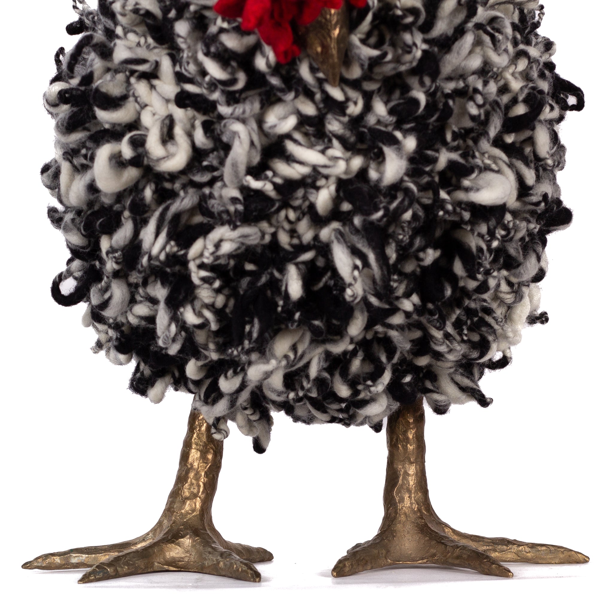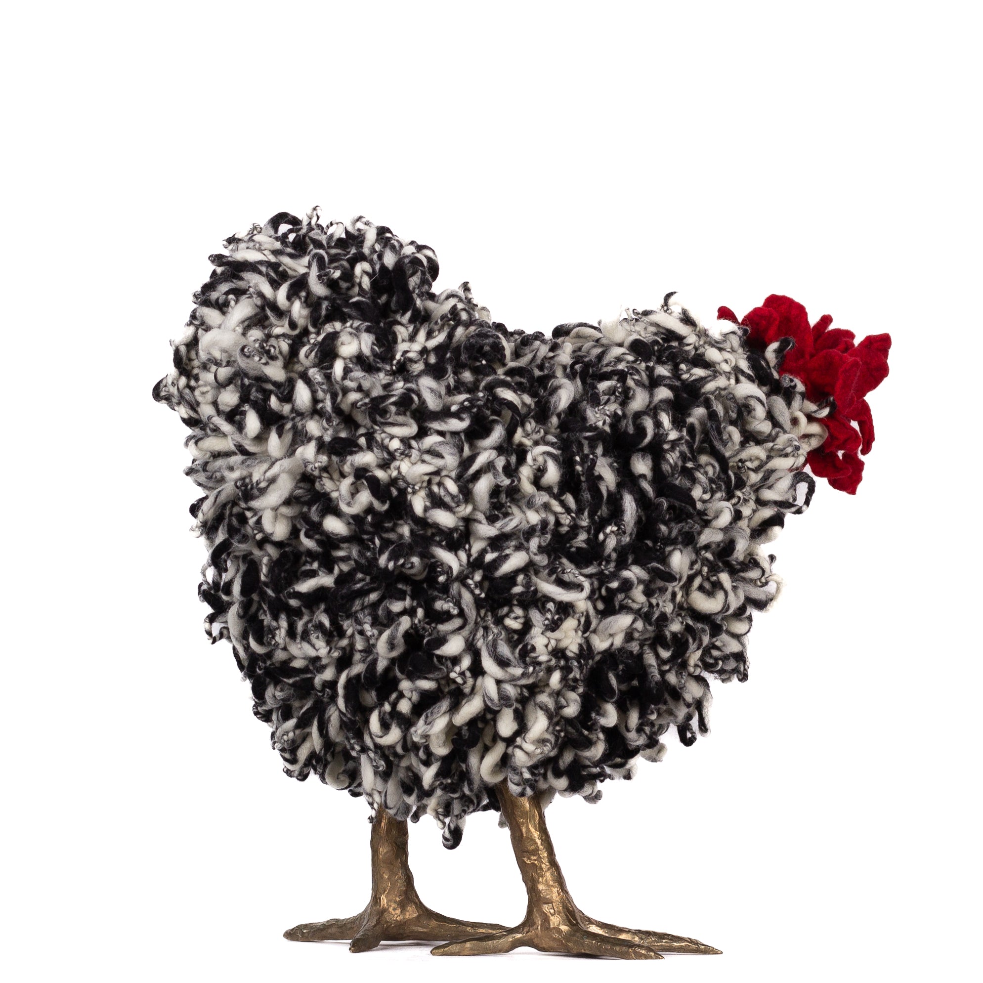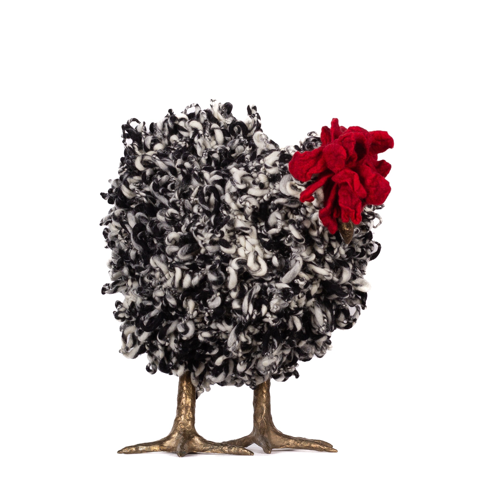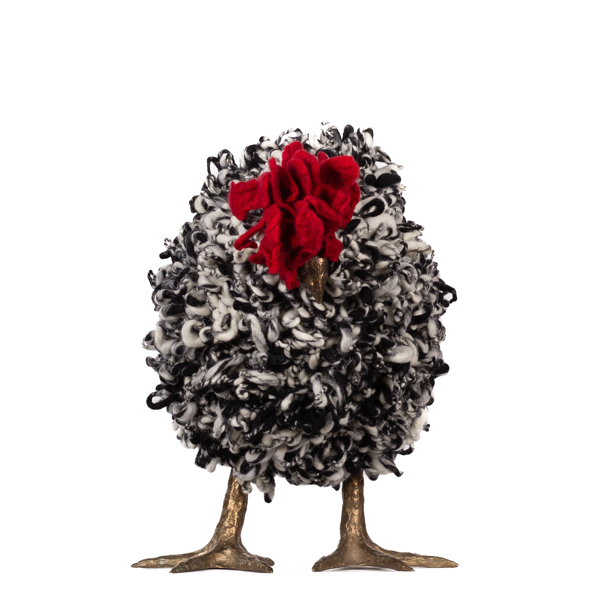 The chickens are sculpted in Kansas City, Missouri with care and delight, upholstered to function as footstools. Each is one-of-a-kind, unique in posture and personality. A turned wood egg-shaped core stands on bronze feet and is connected to a bronze beak. Feathers are fashioned with traditional fiber art techniques- dyeing, felting, spinning, knitting- and are stitched by hand. And a surprise? Their heads bob.