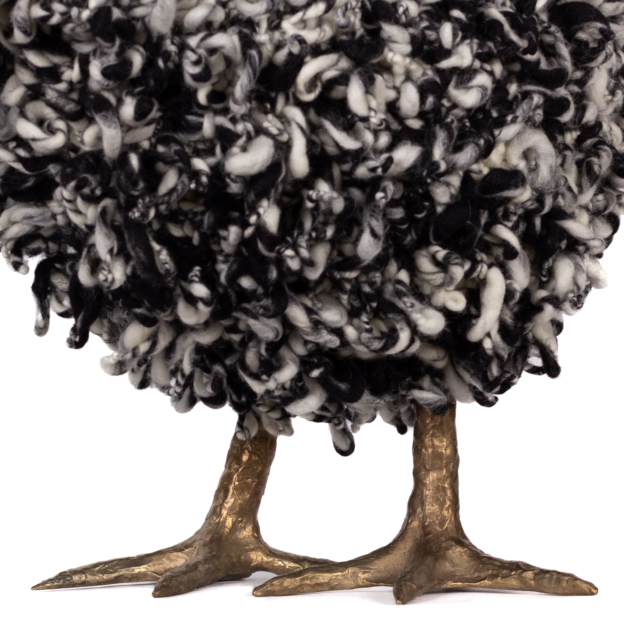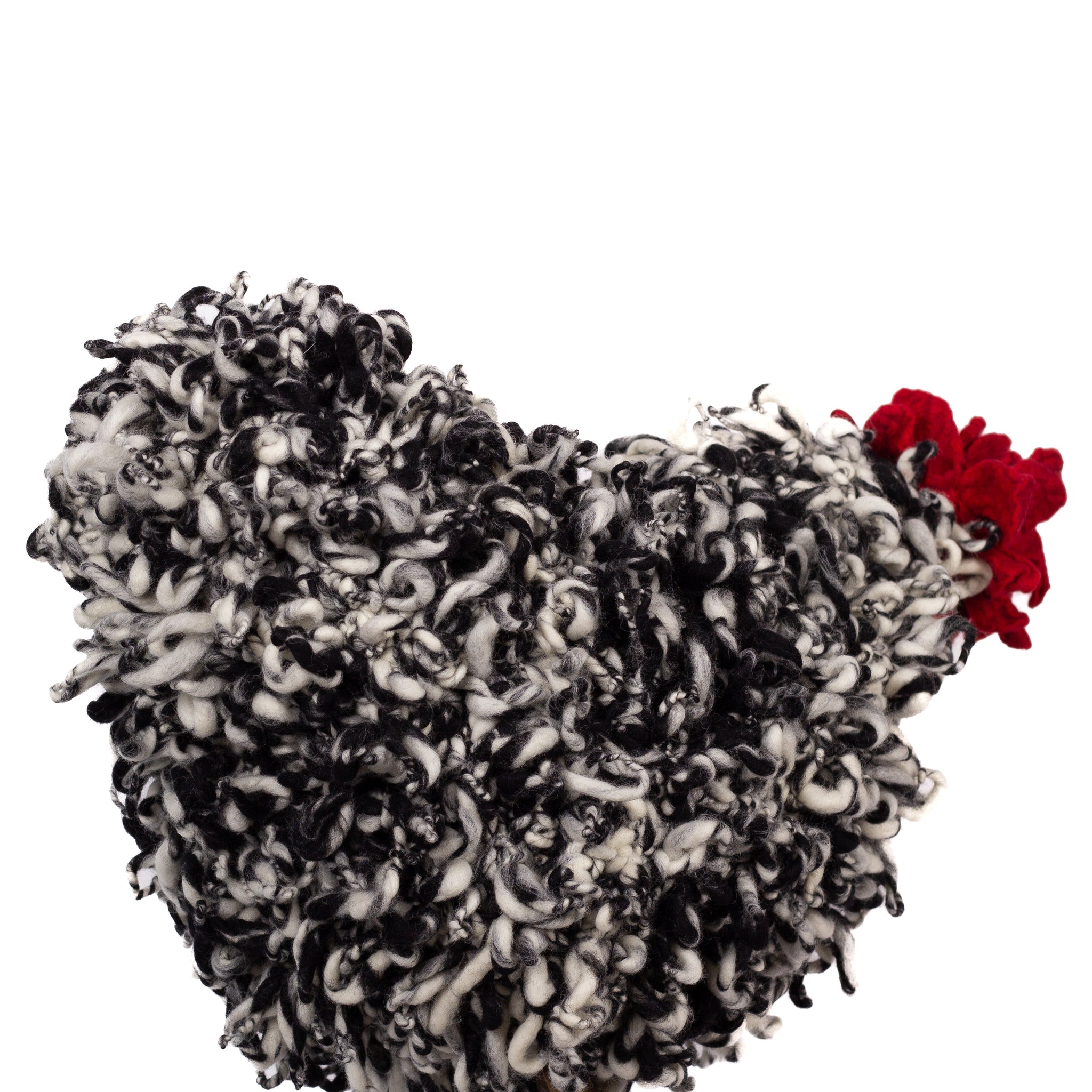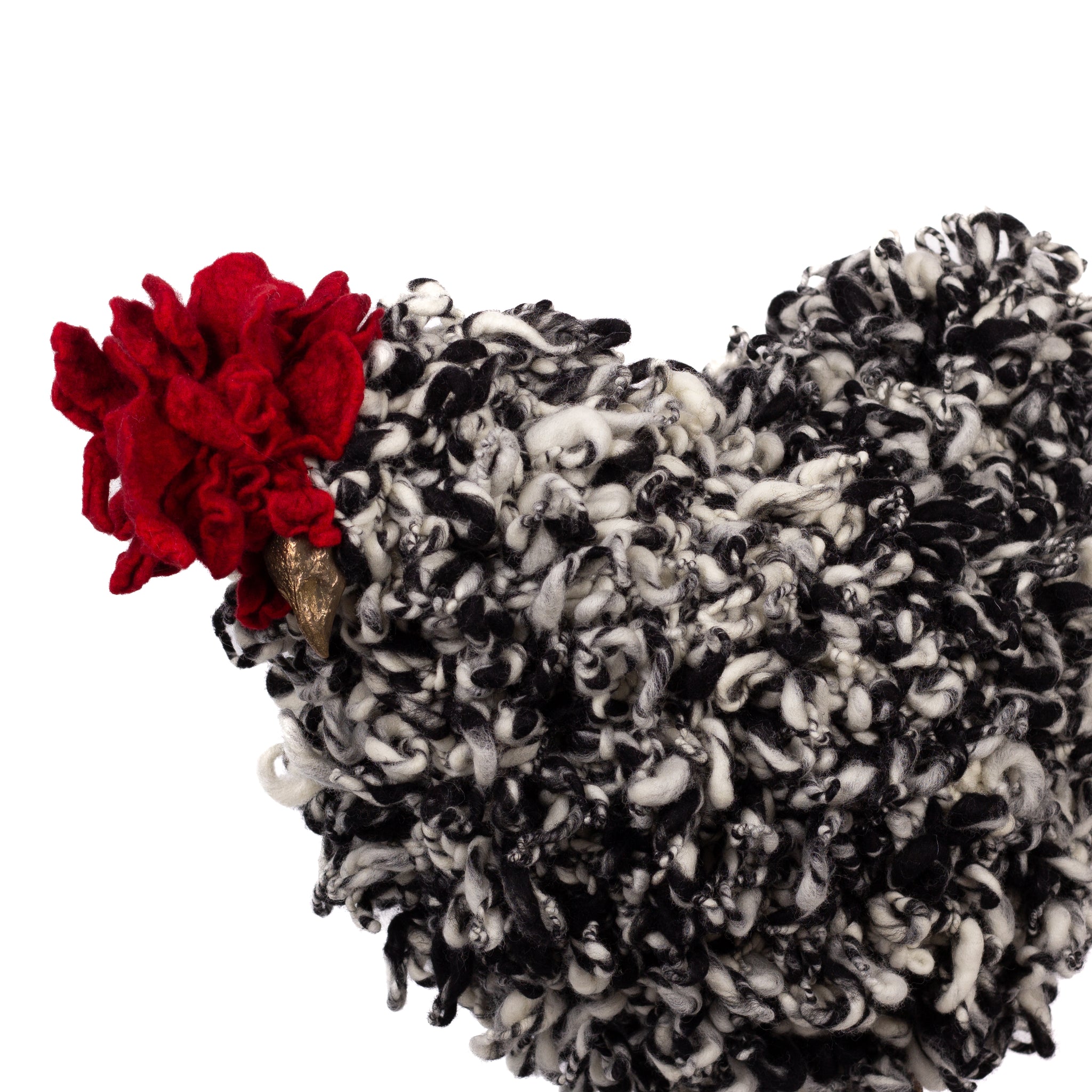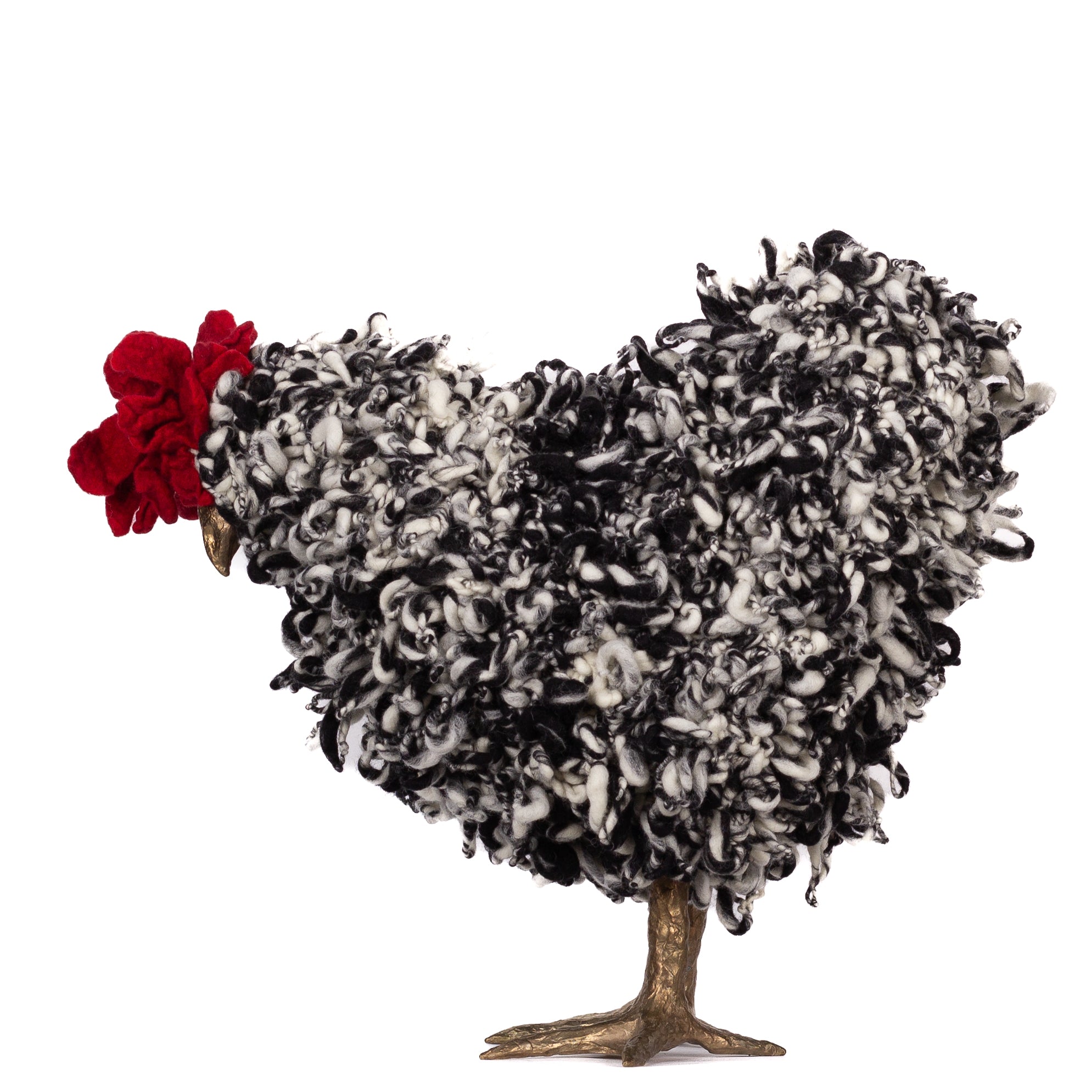 The chickens are sculpted in Kansas City, Missouri with care and delight, upholstered to function as footstools. Each is one-of-a-kind, unique in posture and personality. A turned wood egg-shaped core stands on bronze feet and is connected to a bronze beak. Feathers are fashioned with traditional fiber art techniques- dyeing, felting, spinning, knitting- and are stitched by hand. And a surprise? Their heads bob.