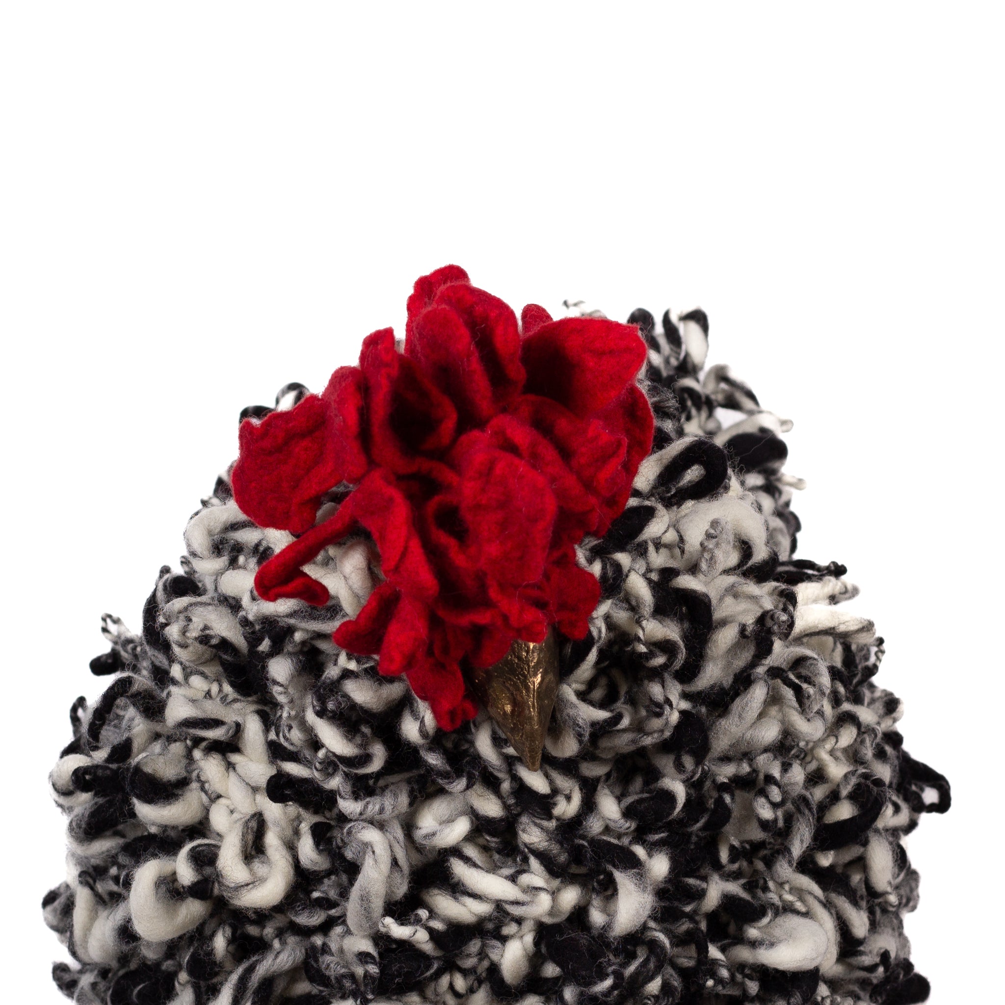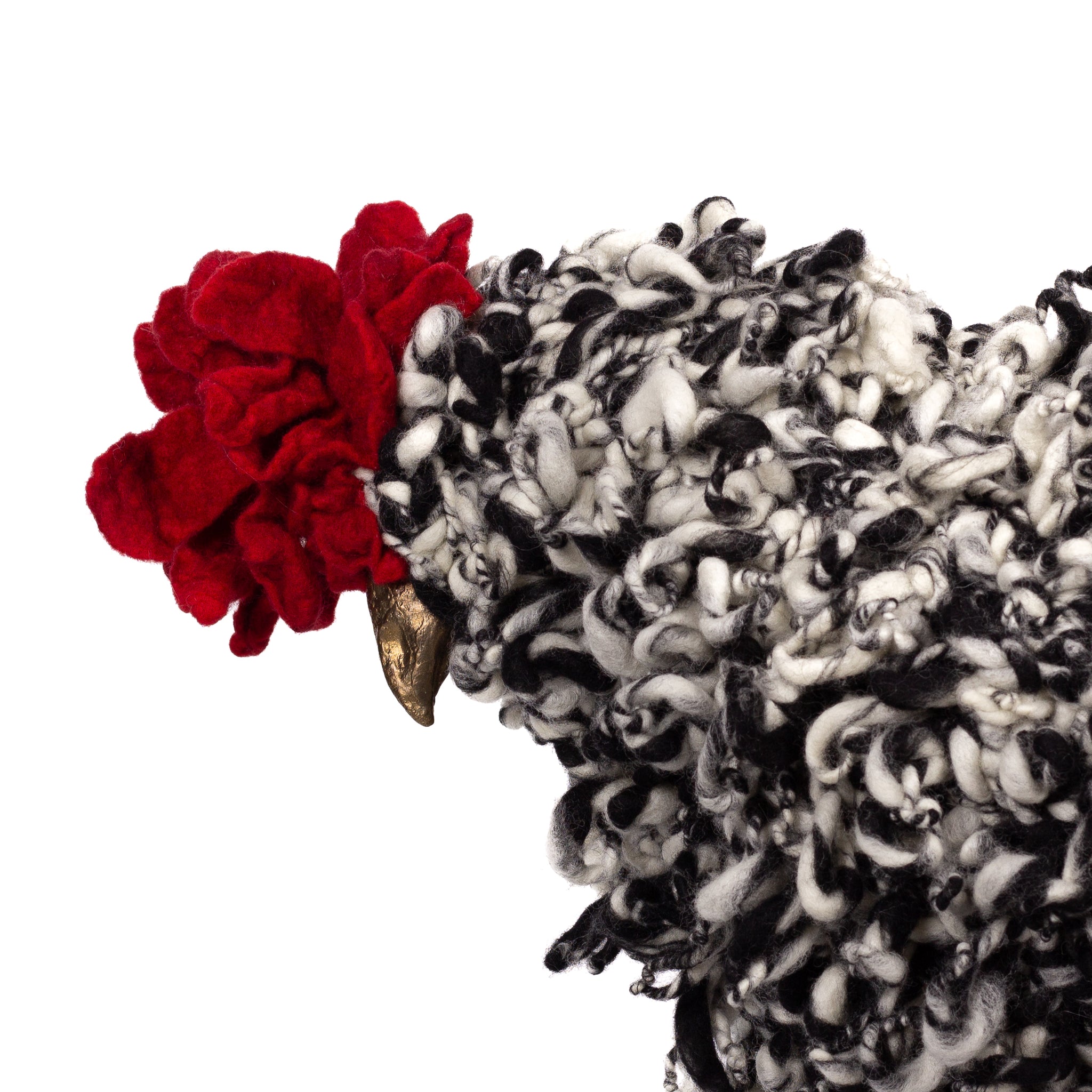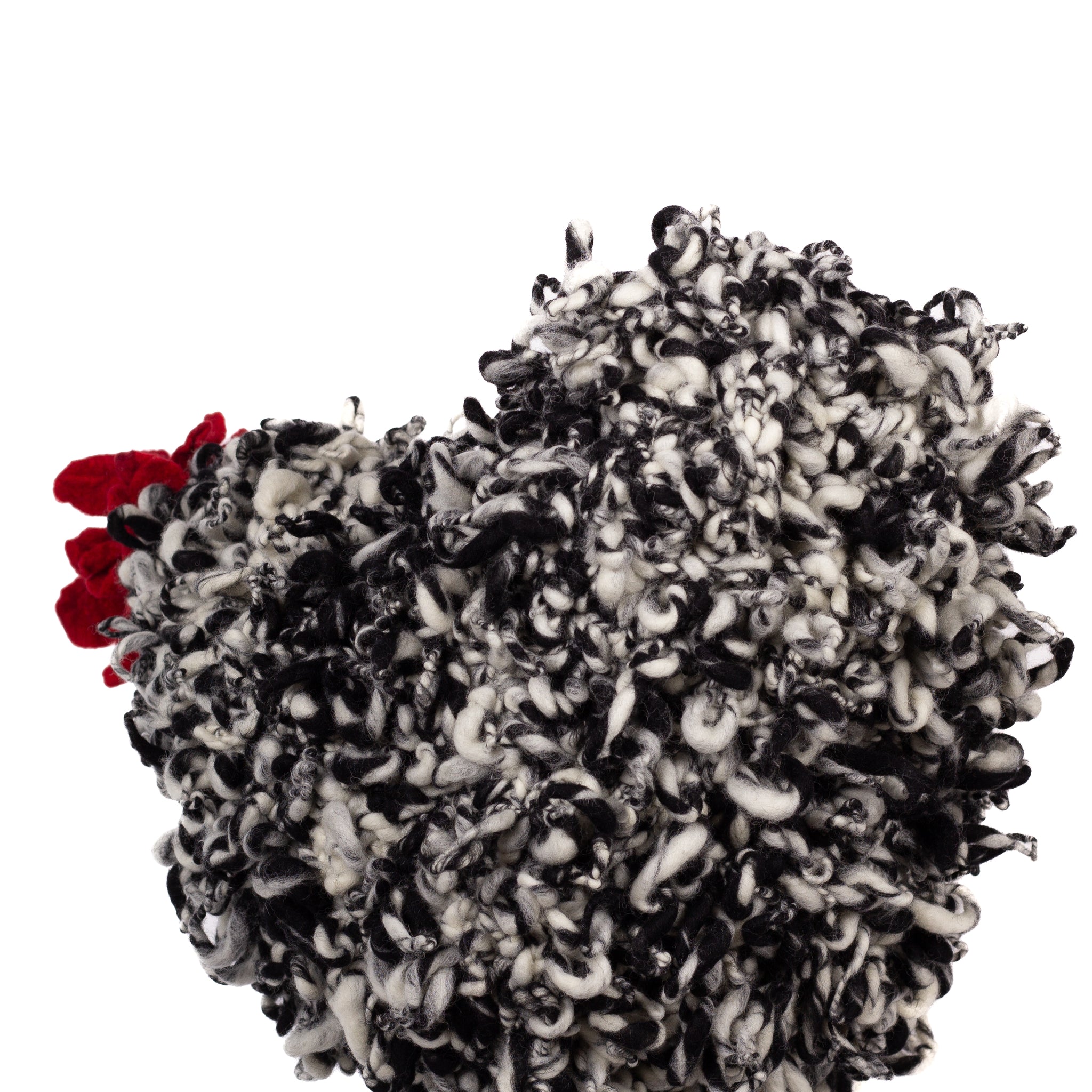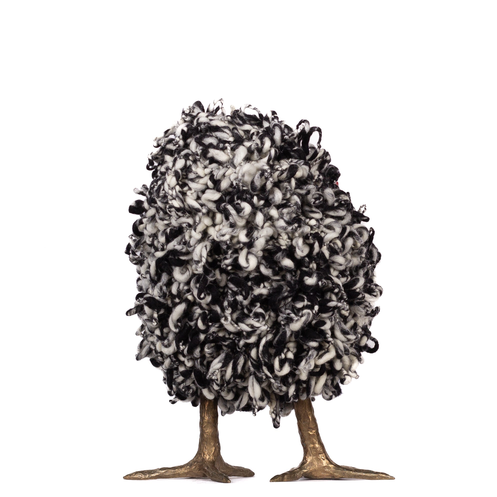 The chickens are sculpted in Kansas City, Missouri with care and delight, upholstered to function as footstools. Each is one-of-a-kind, unique in posture and personality. A turned wood egg-shaped core stands on bronze feet and is connected to a bronze beak. Feathers are fashioned with traditional fiber art techniques- dyeing, felting, spinning, knitting- and are stitched by hand. And a surprise? Their heads bob.