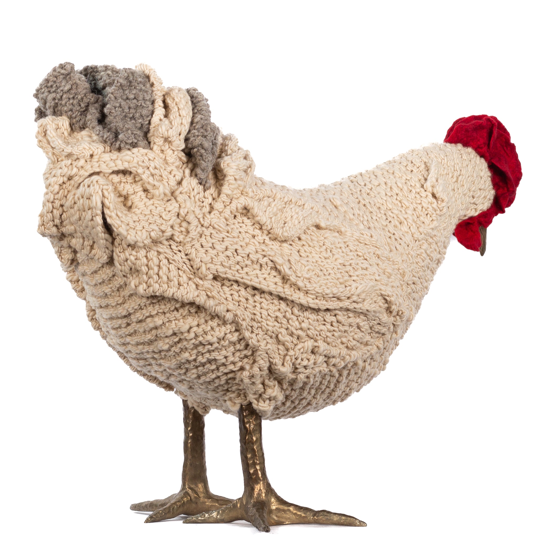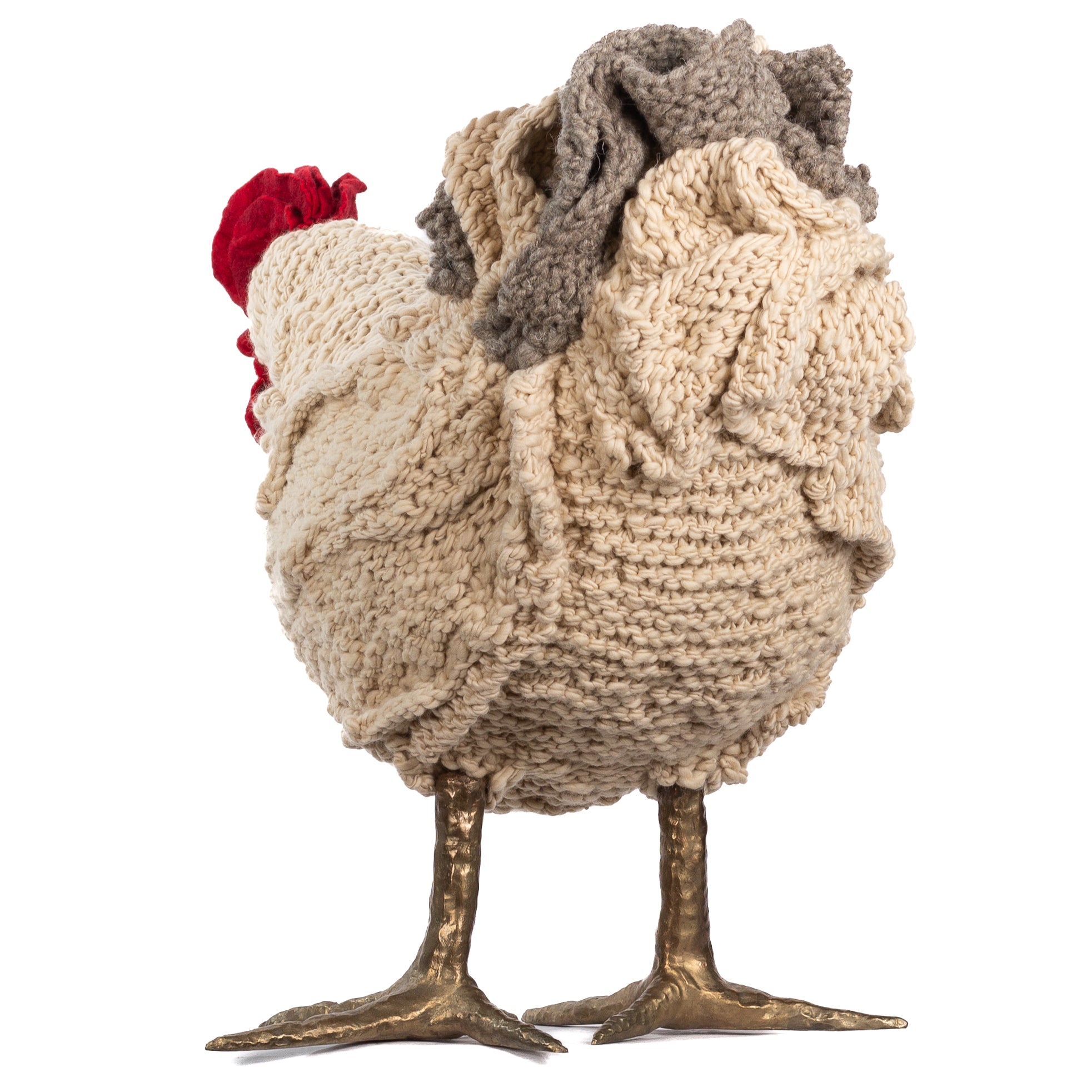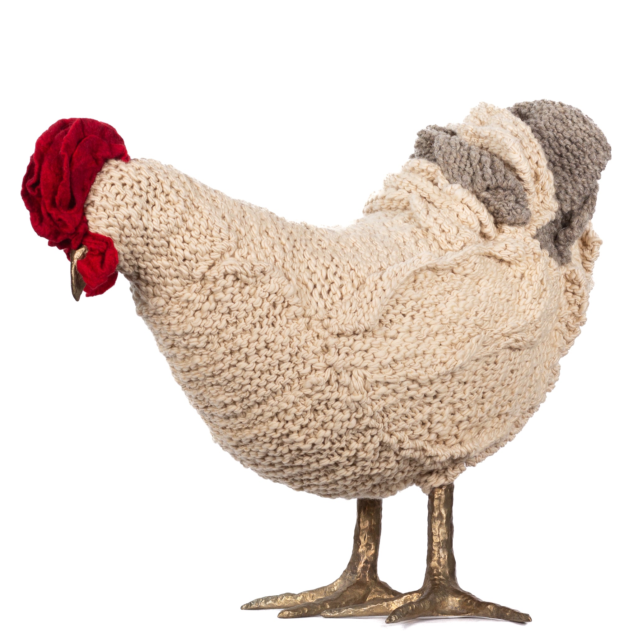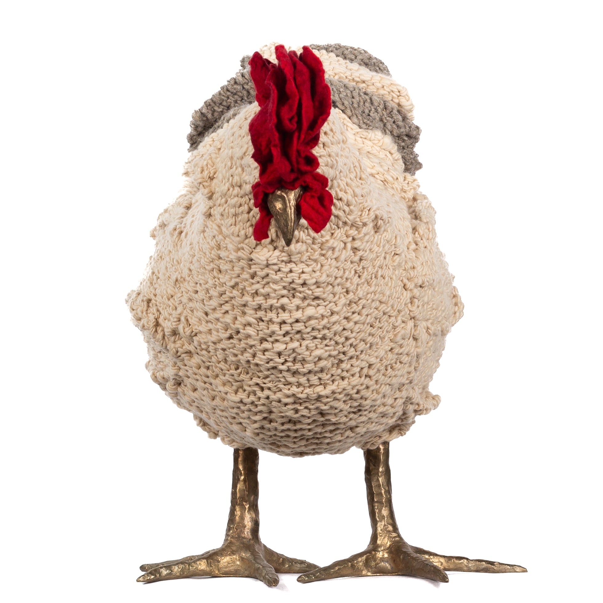 The chickens are sculpted in Kansas City, Missouri with care and delight, upholstered to function as footstools. Each is one-of-a-kind, unique in posture and personality. A turned wood egg-shaped core stands on bronze feet and is connected to a bronze beak. Feathers are fashioned with traditional fiber art techniques- dyeing, felting, spinning, knitting- and are stitched by hand. And a surprise? Their heads bob.