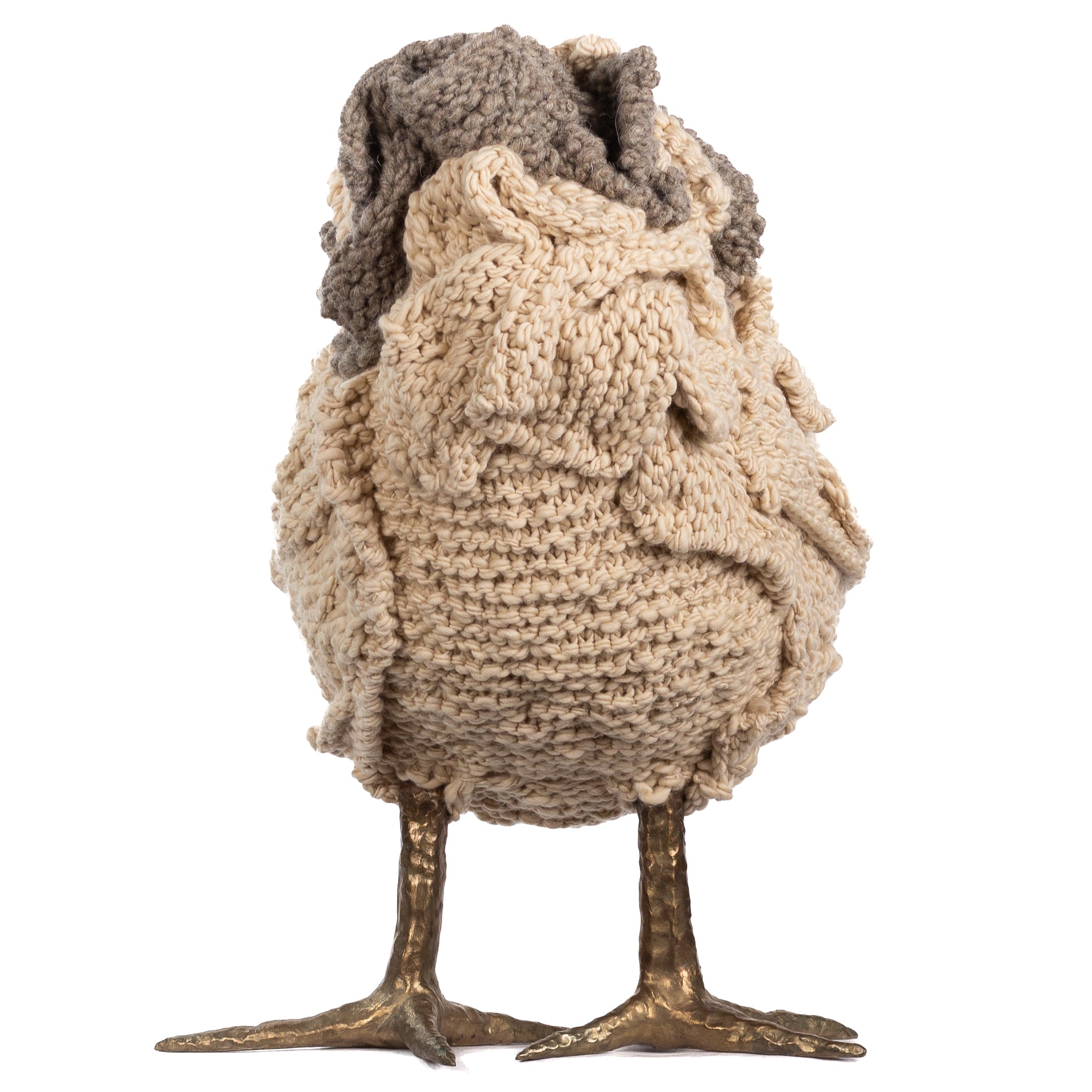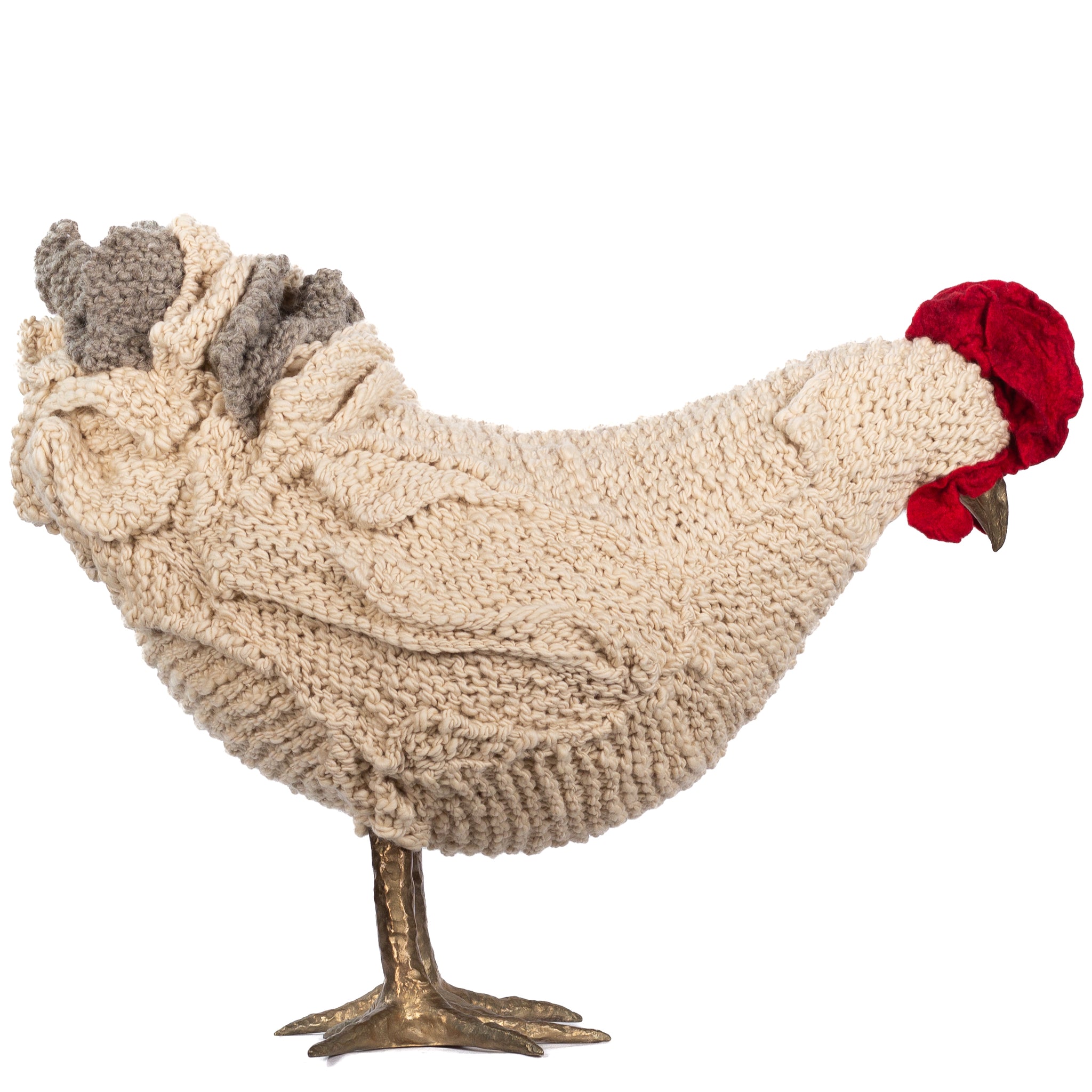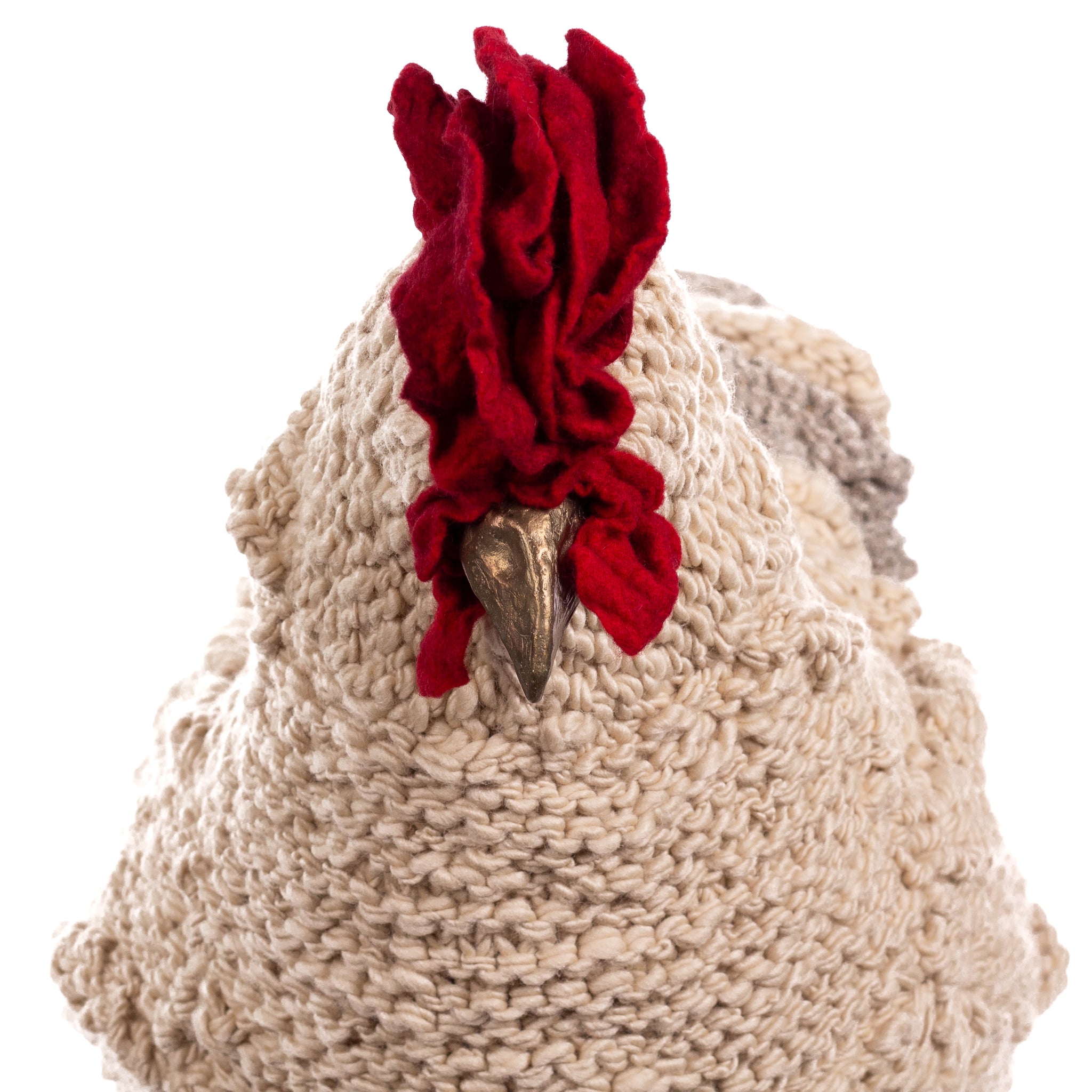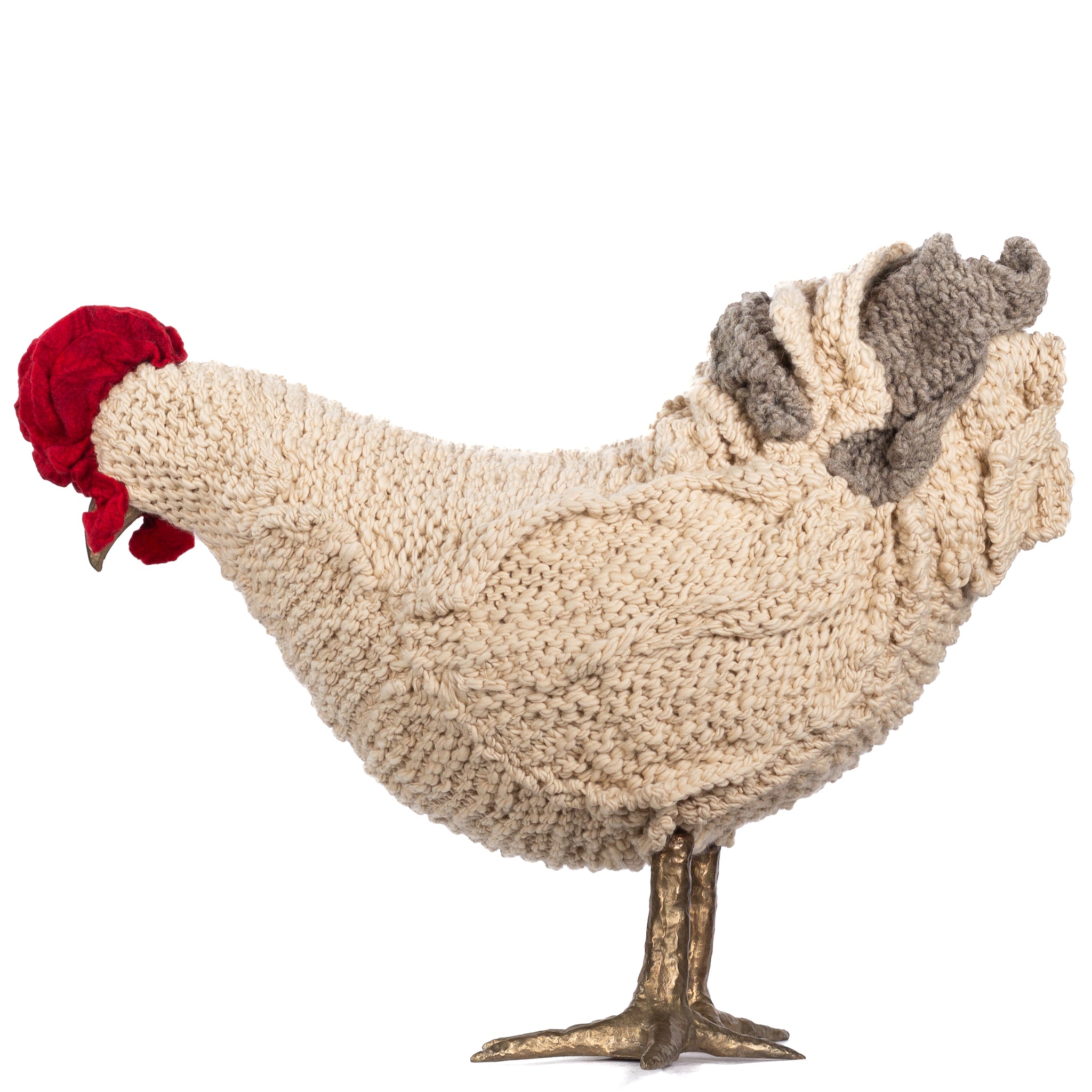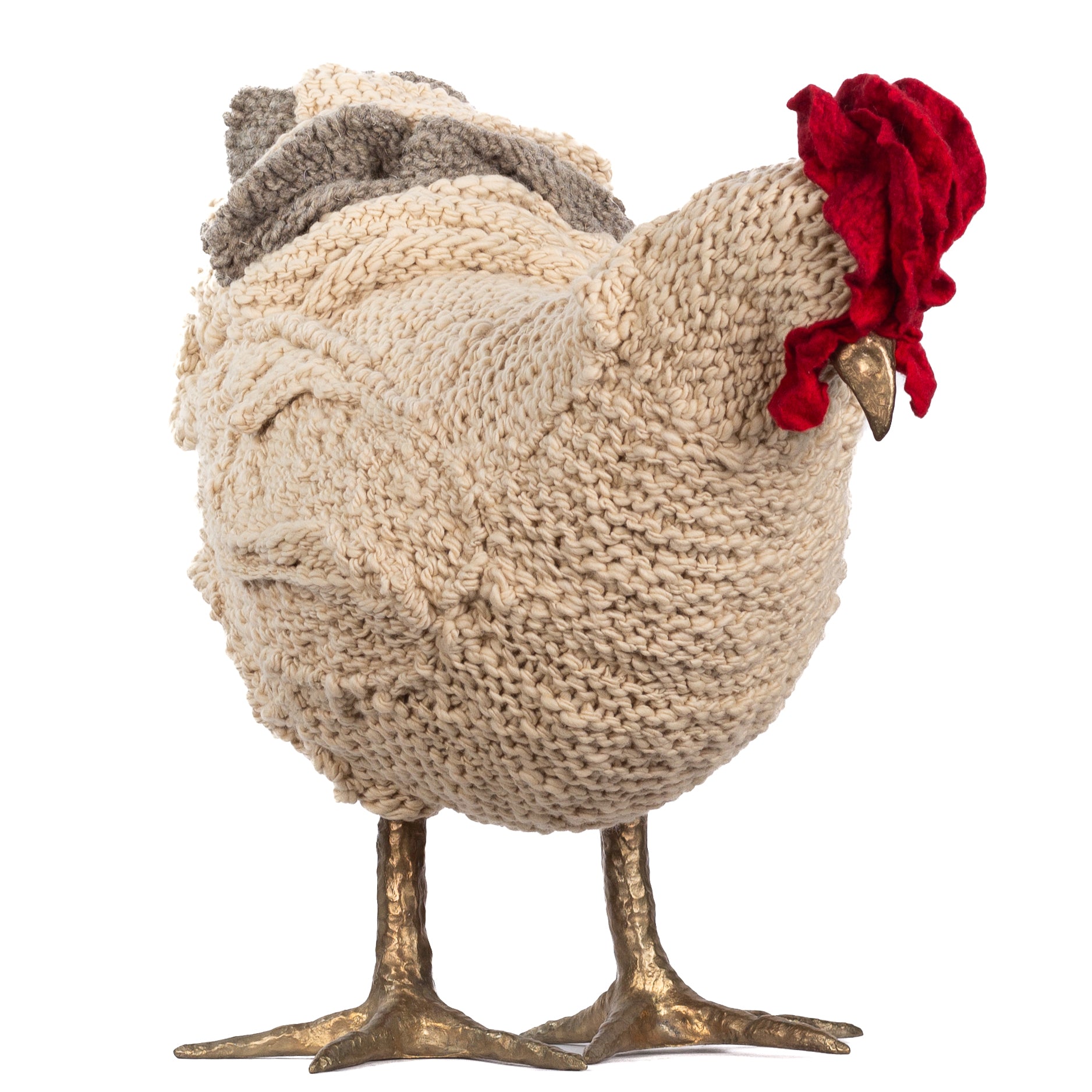The chickens are sculpted in Kansas City, Missouri with care and delight, upholstered to function as footstools. Each is one-of-a-kind, unique in posture and personality. A turned wood egg-shaped core stands on bronze feet and is connected to a bronze beak. Feathers are fashioned with traditional fiber art techniques- dyeing, felting, spinning, knitting- and are stitched by hand. And a surprise? Their heads bob.