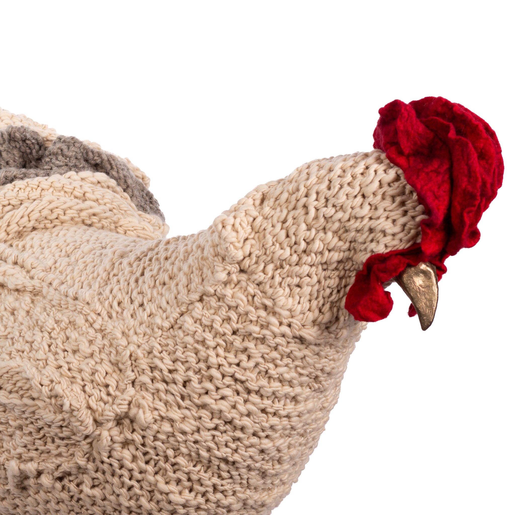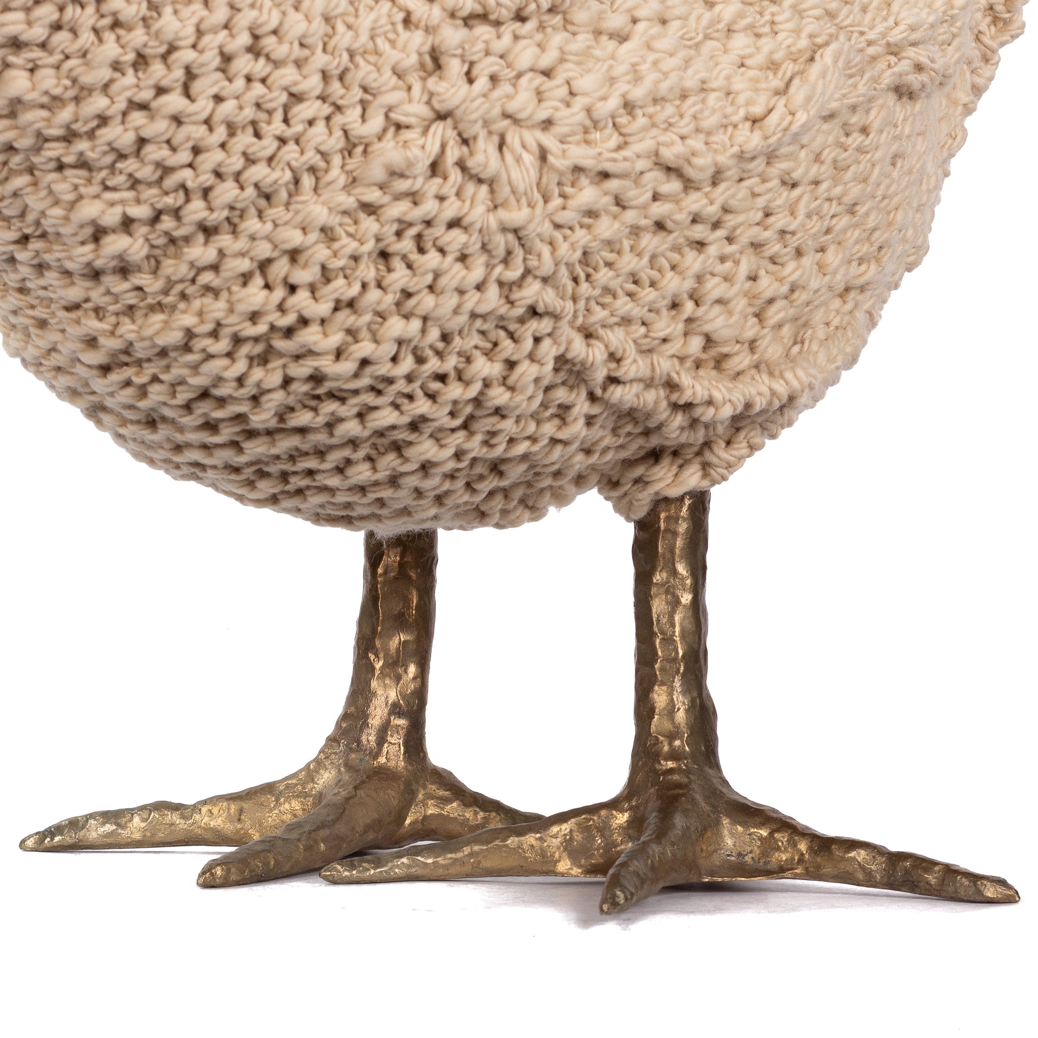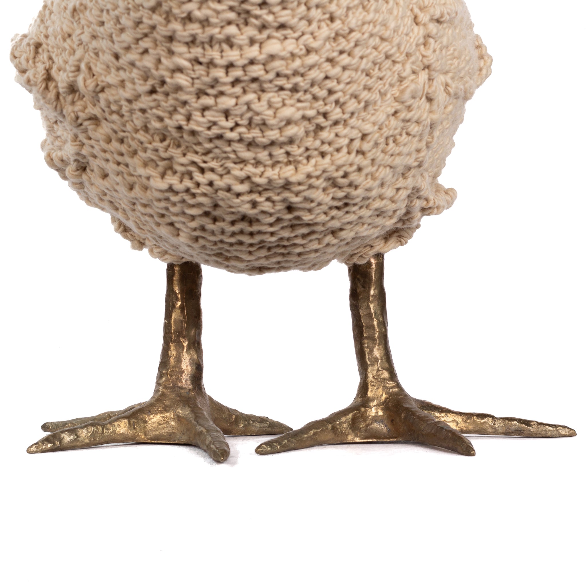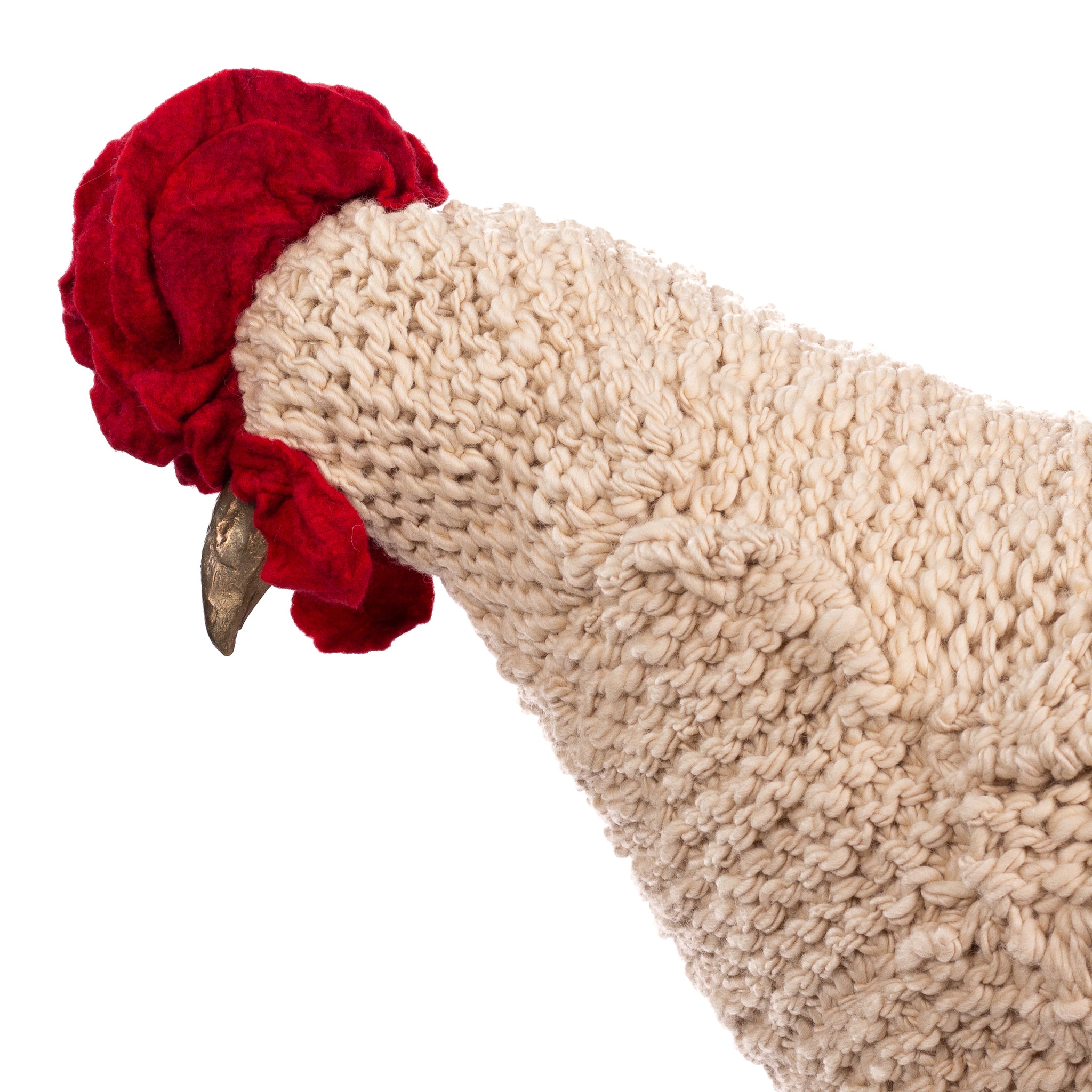The chickens are sculpted in Kansas City, Missouri with care and delight, upholstered to function as footstools. Each is one-of-a-kind, unique in posture and personality. A turned wood egg-shaped core stands on bronze feet and is connected to a bronze beak. Feathers are fashioned with traditional fiber art techniques- dyeing, felting, spinning, knitting- and are stitched by hand. And a surprise? Their heads bob.