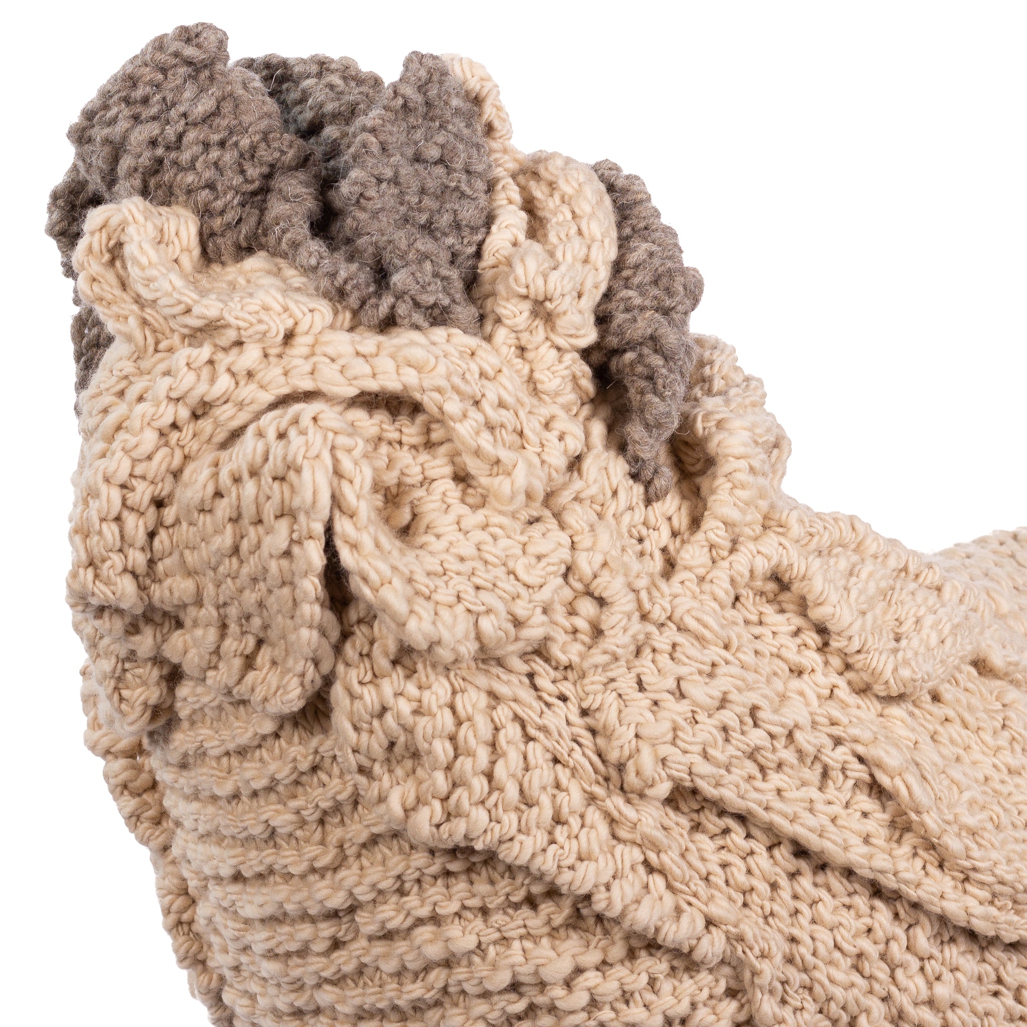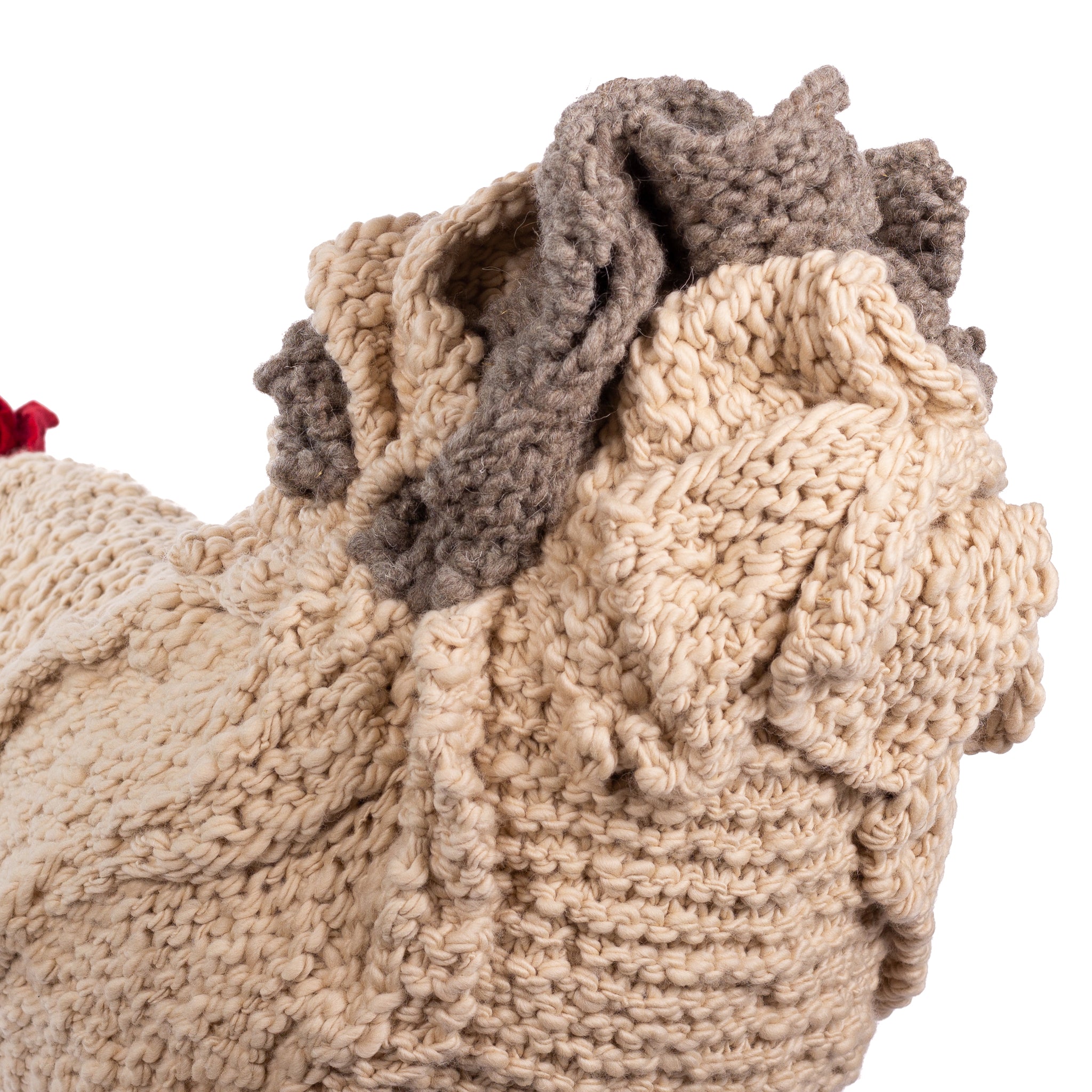 Carolyn is a Big Chicken Footstool whose feathers are fashioned with hand-knit 100% Merino wool. She is looking for a good home.