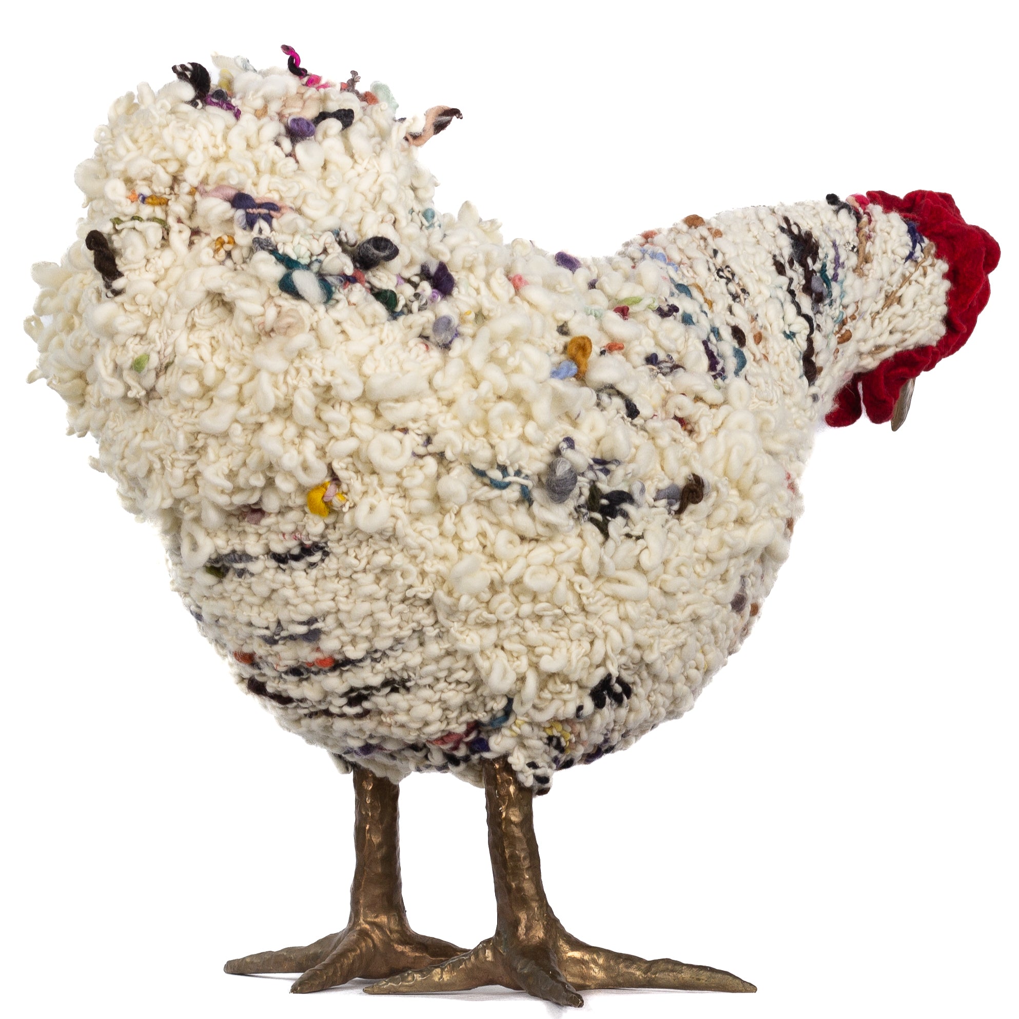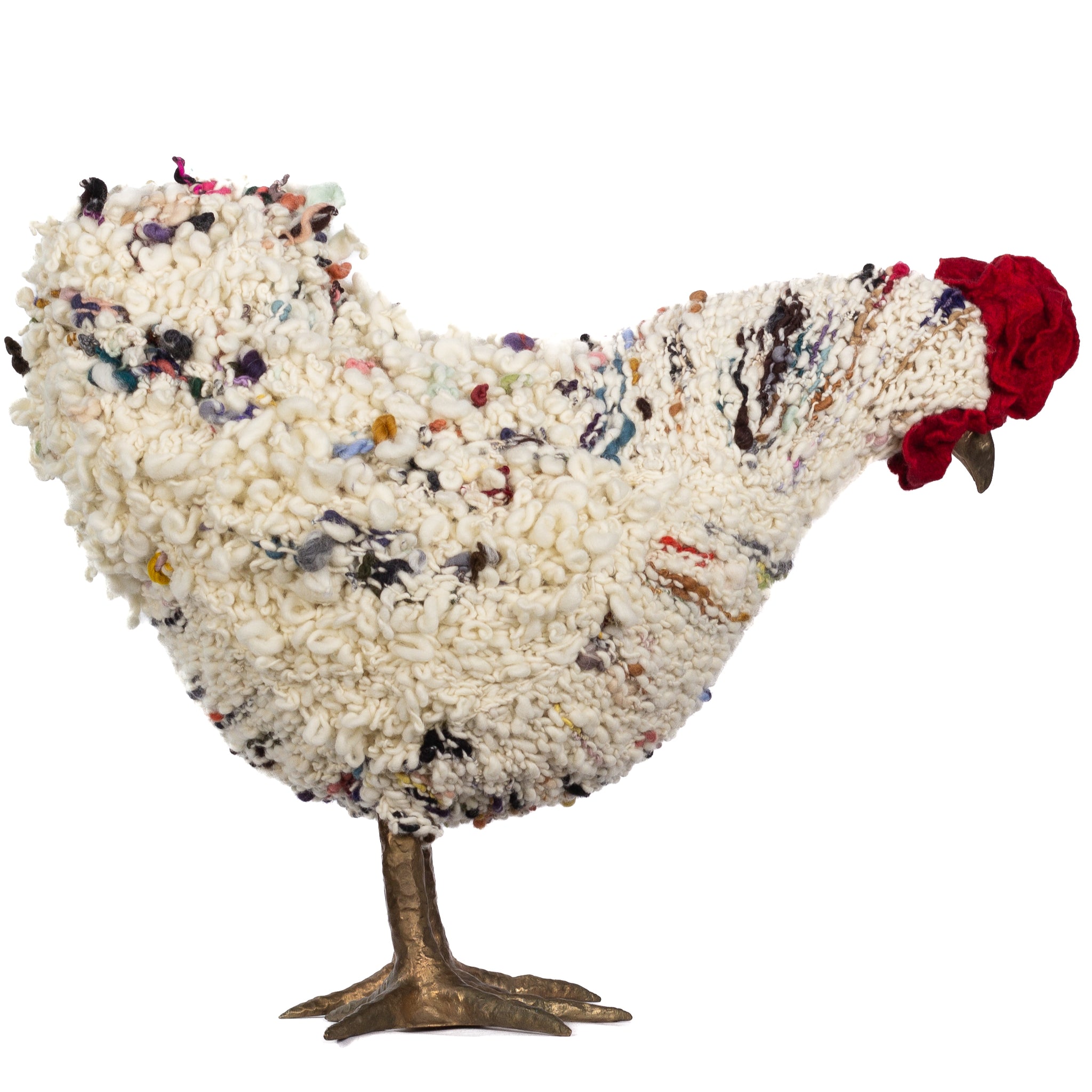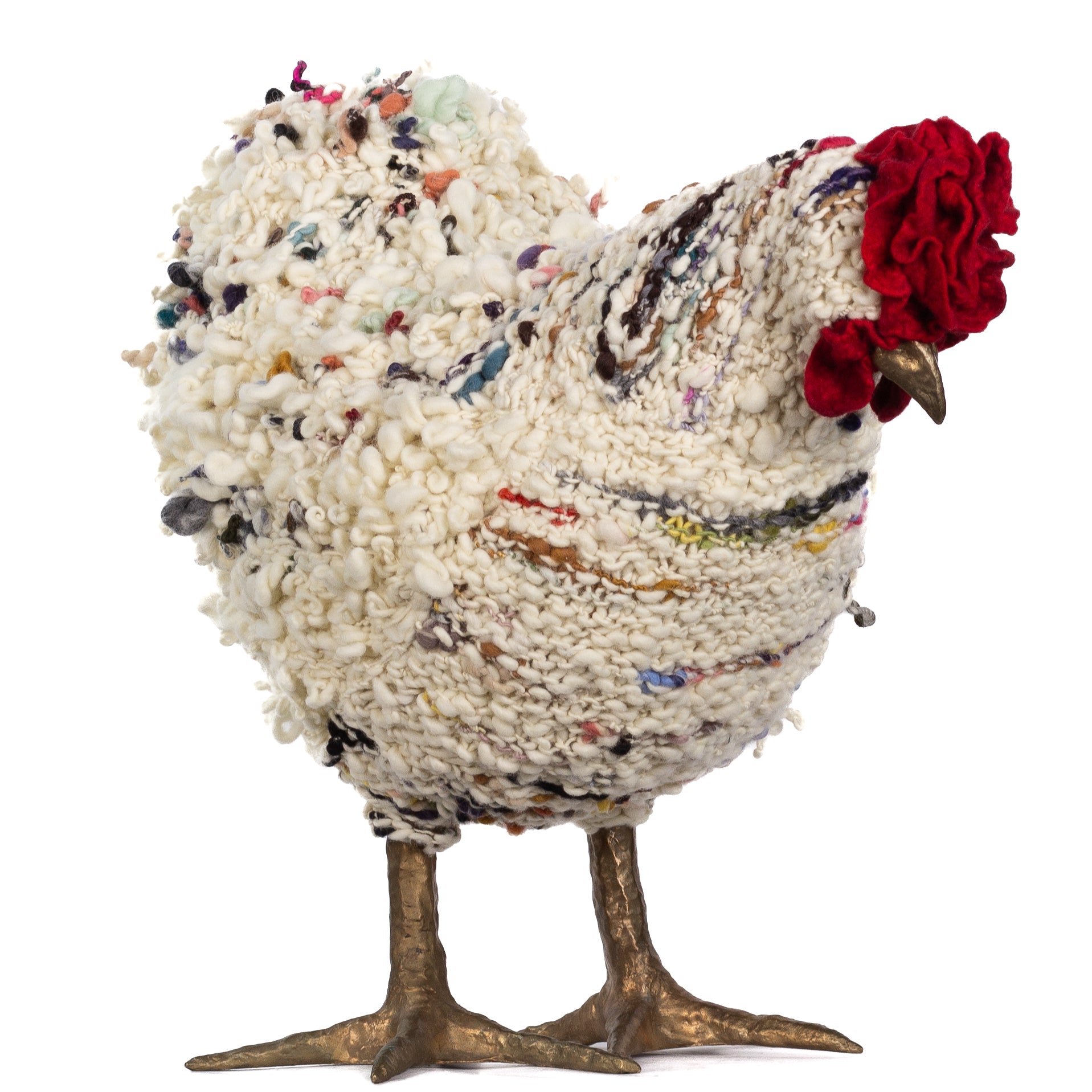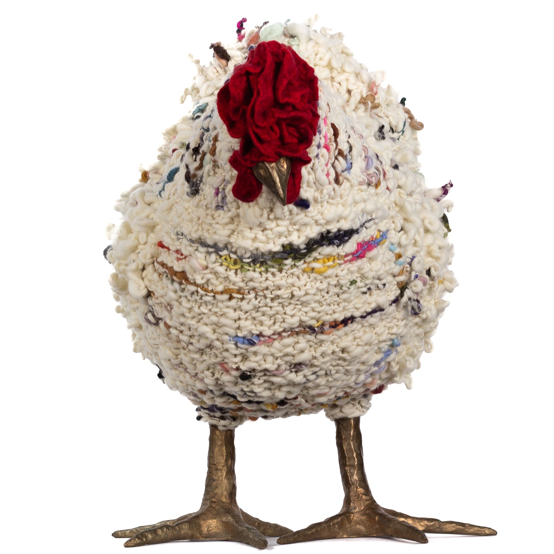 The chickens are sculpted in Kansas City, Missouri with care and delight, upholstered to function as footstools. Each is one-of-a-kind, unique in posture and personality. A turned wood egg-shaped core stands on bronze feet and is connected to a bronze beak. Feathers are fashioned with traditional fiber art techniques- dyeing, felting, spinning, knitting- and are stitched by hand. And a surprise? Their heads bob.