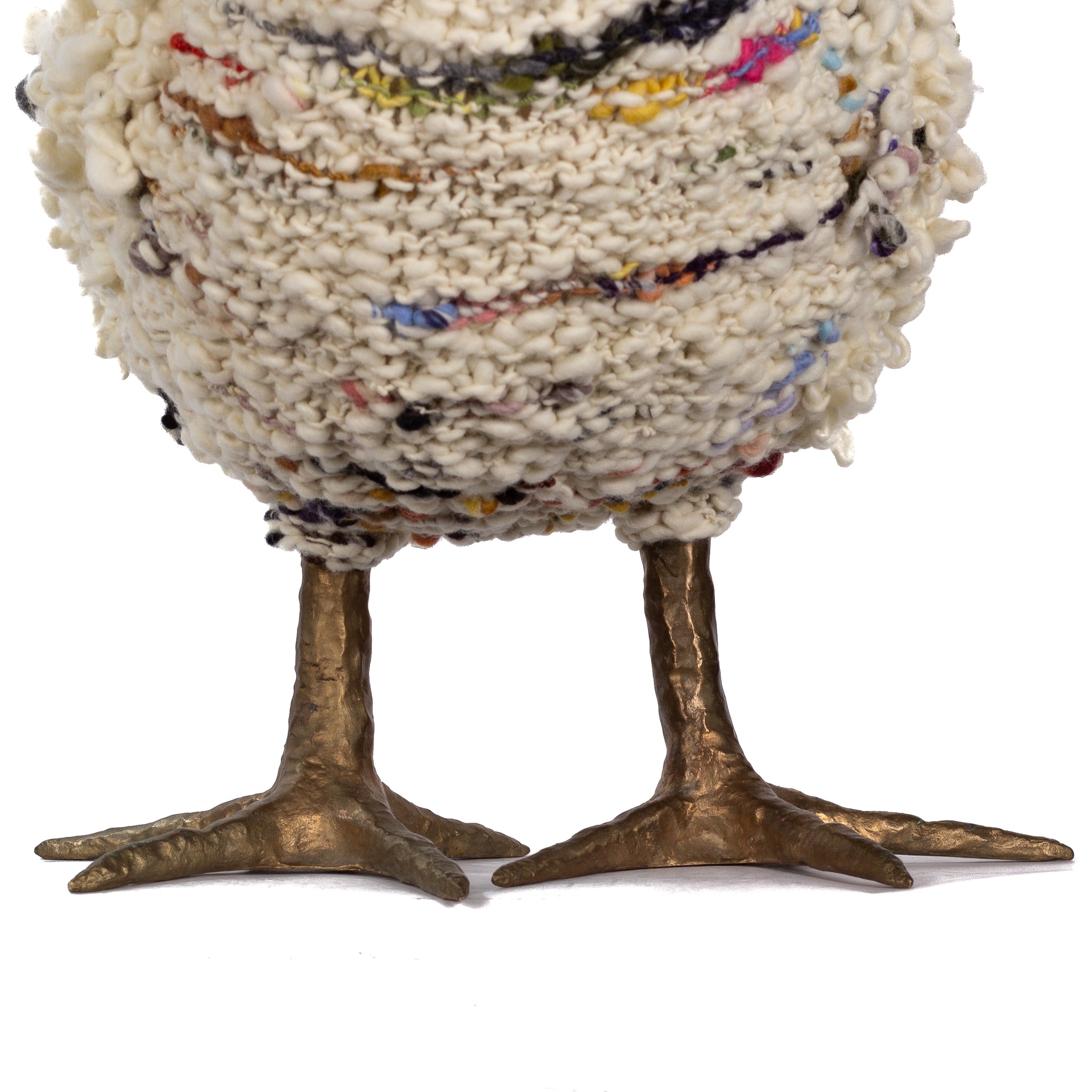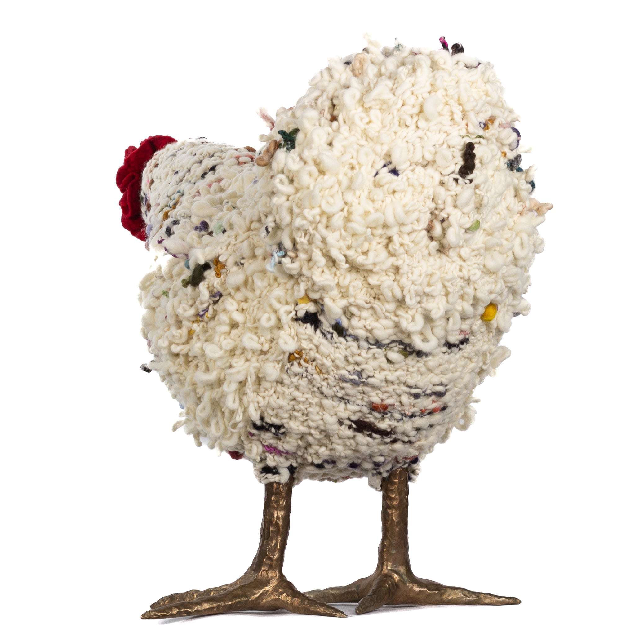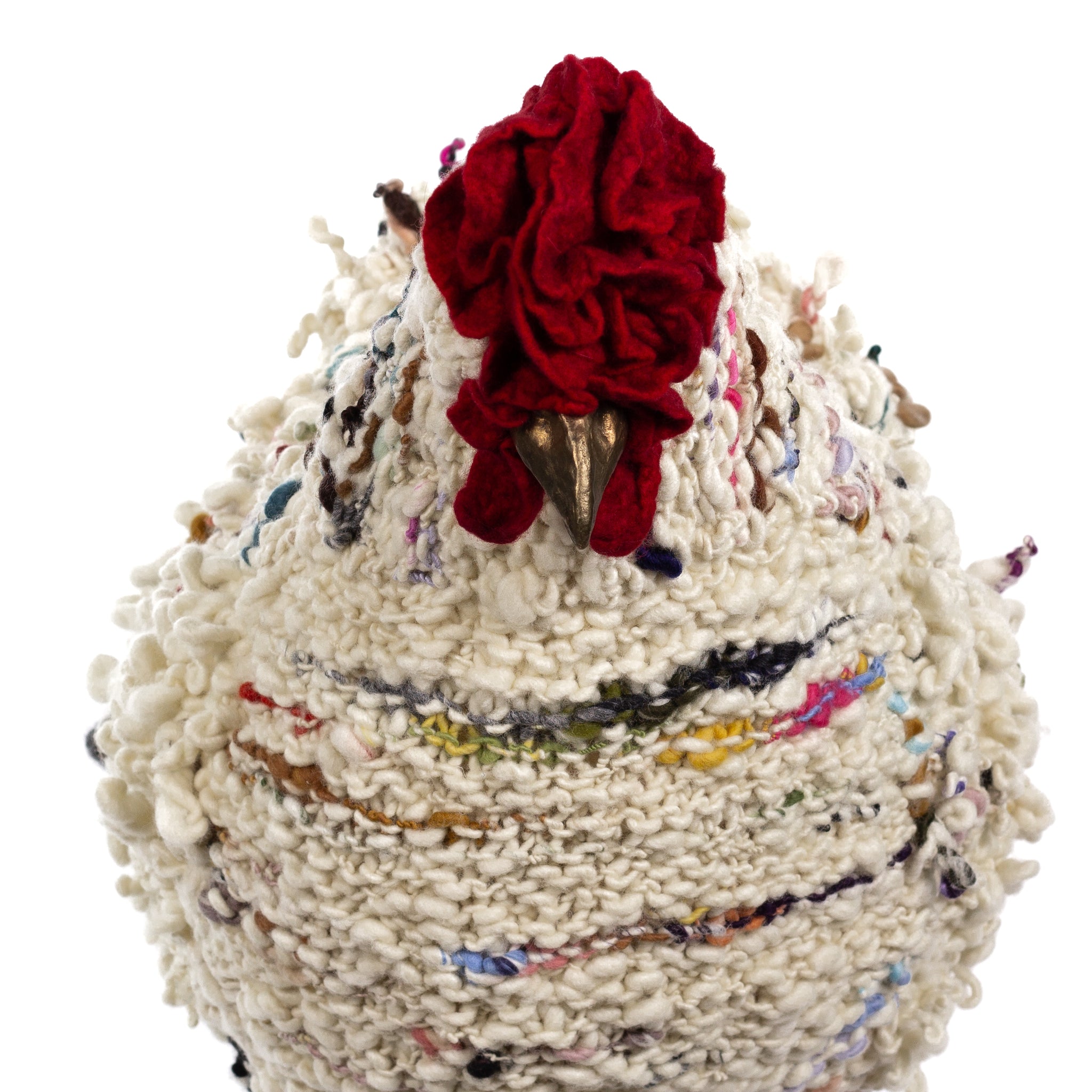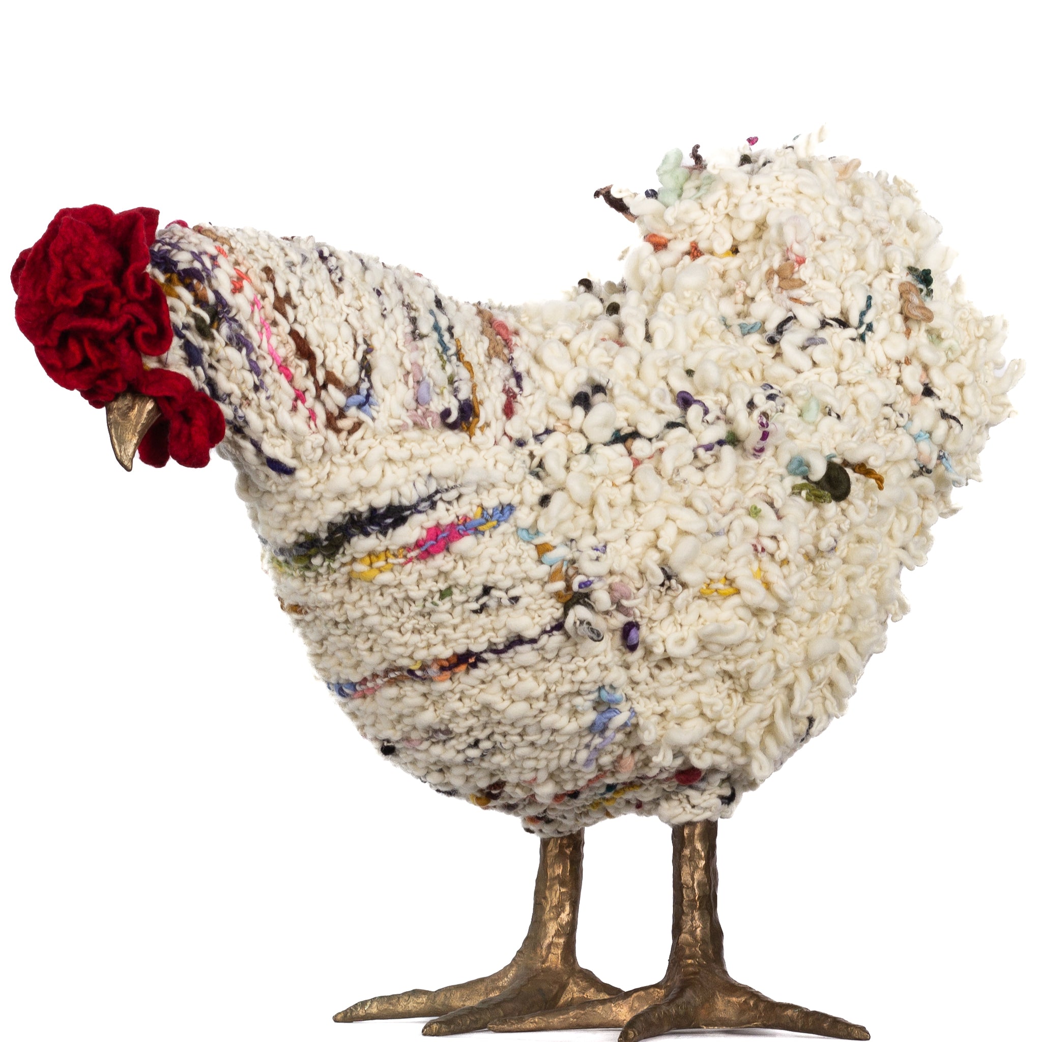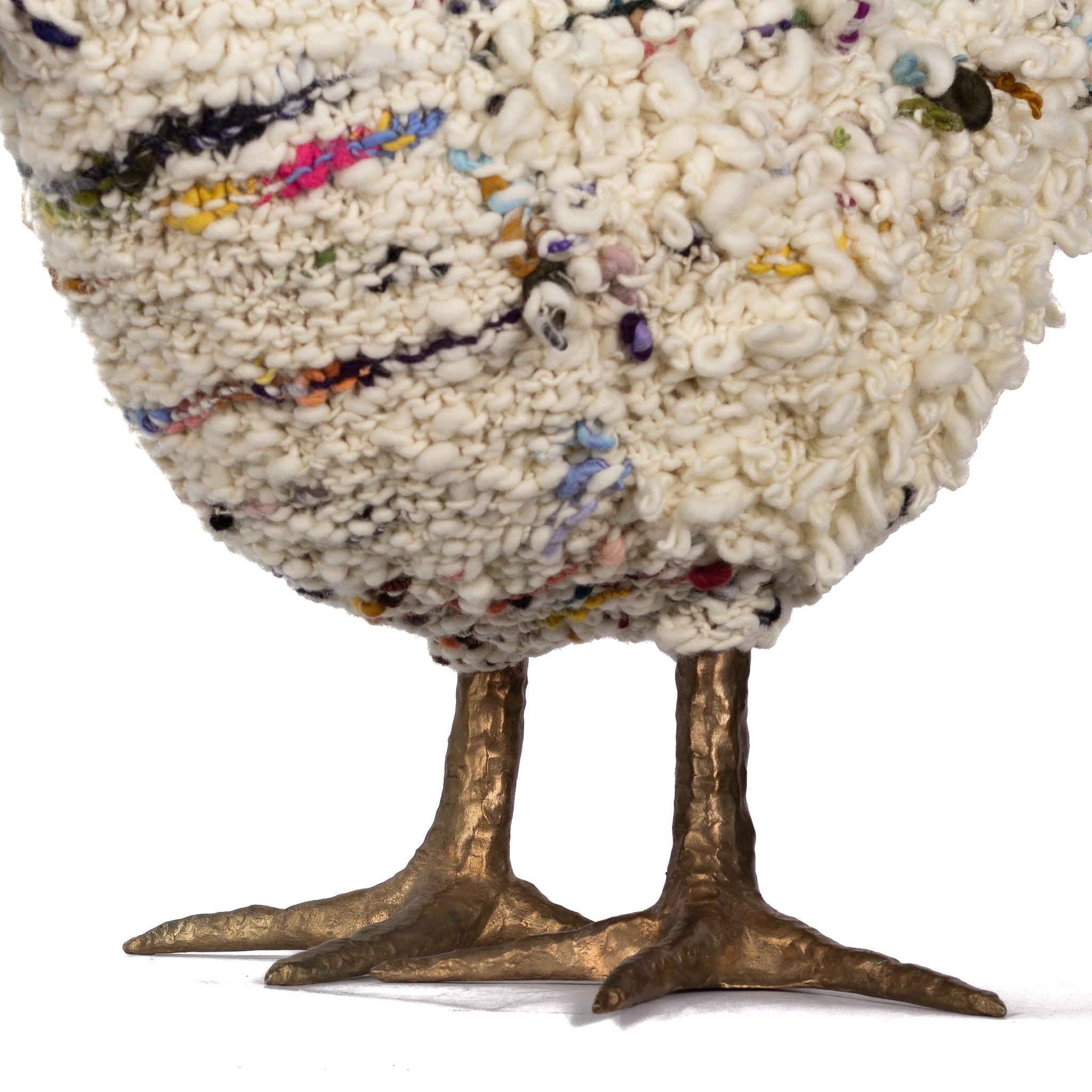The chickens are sculpted in Kansas City, Missouri with care and delight, upholstered to function as footstools. Each is one-of-a-kind, unique in posture and personality. A turned wood egg-shaped core stands on bronze feet and is connected to a bronze beak. Feathers are fashioned with traditional fiber art techniques- dyeing, felting, spinning, knitting- and are stitched by hand. And a surprise? Their heads bob.