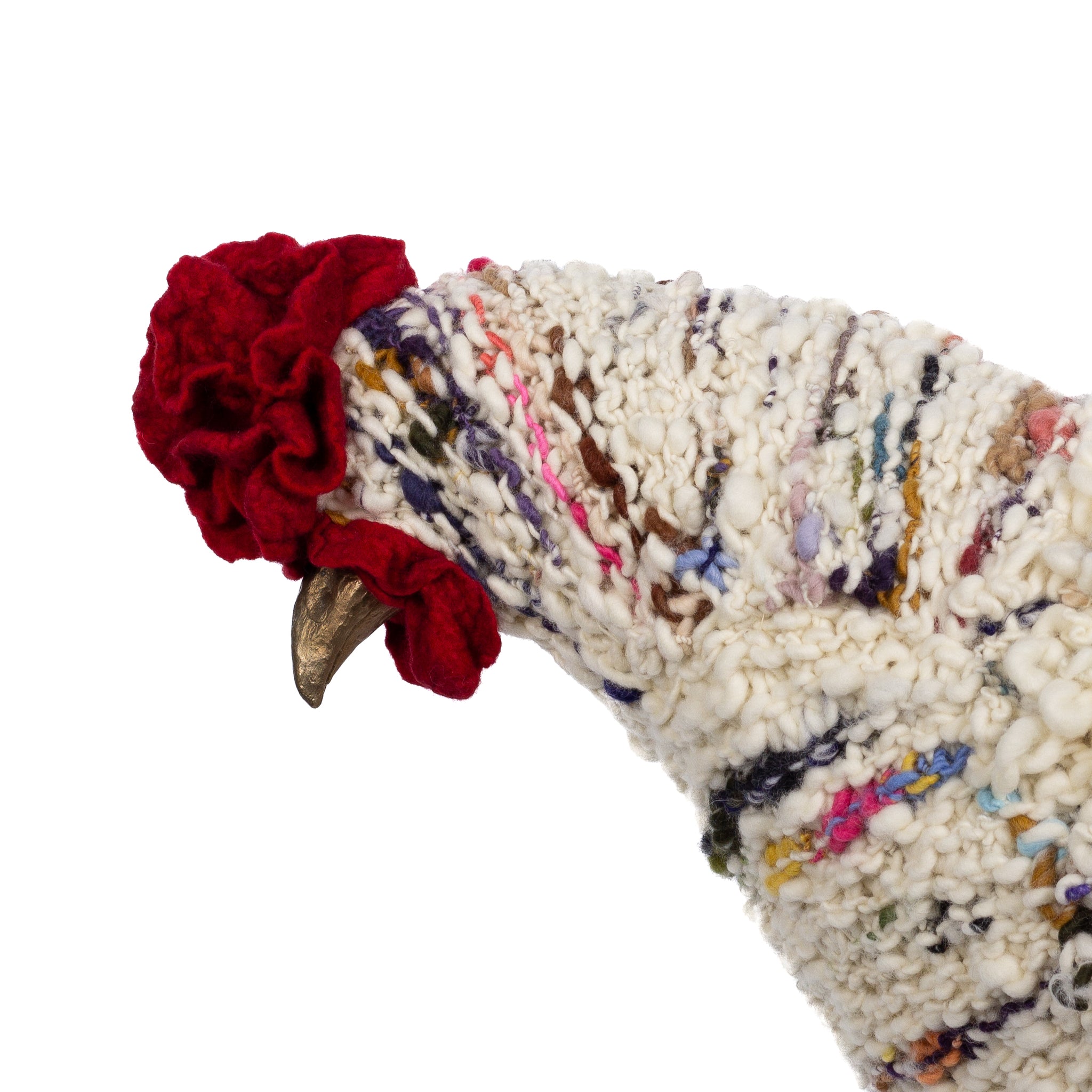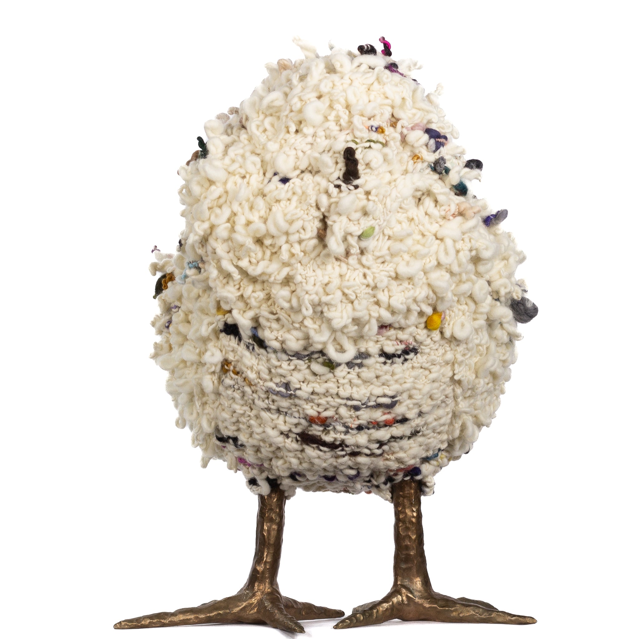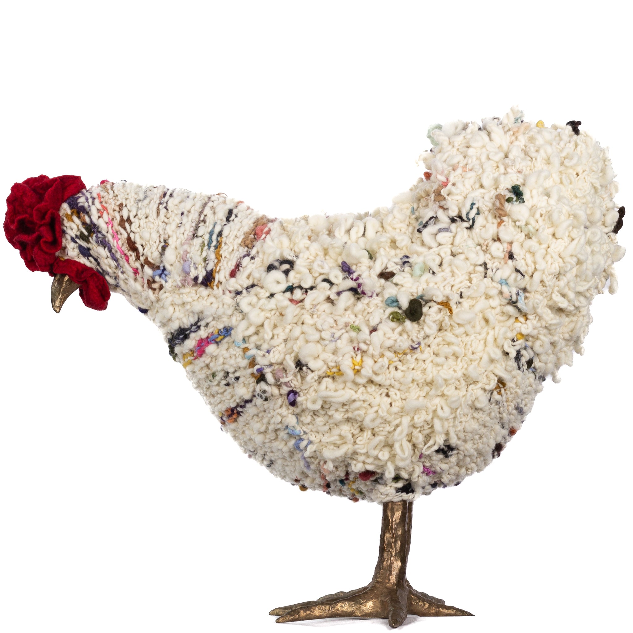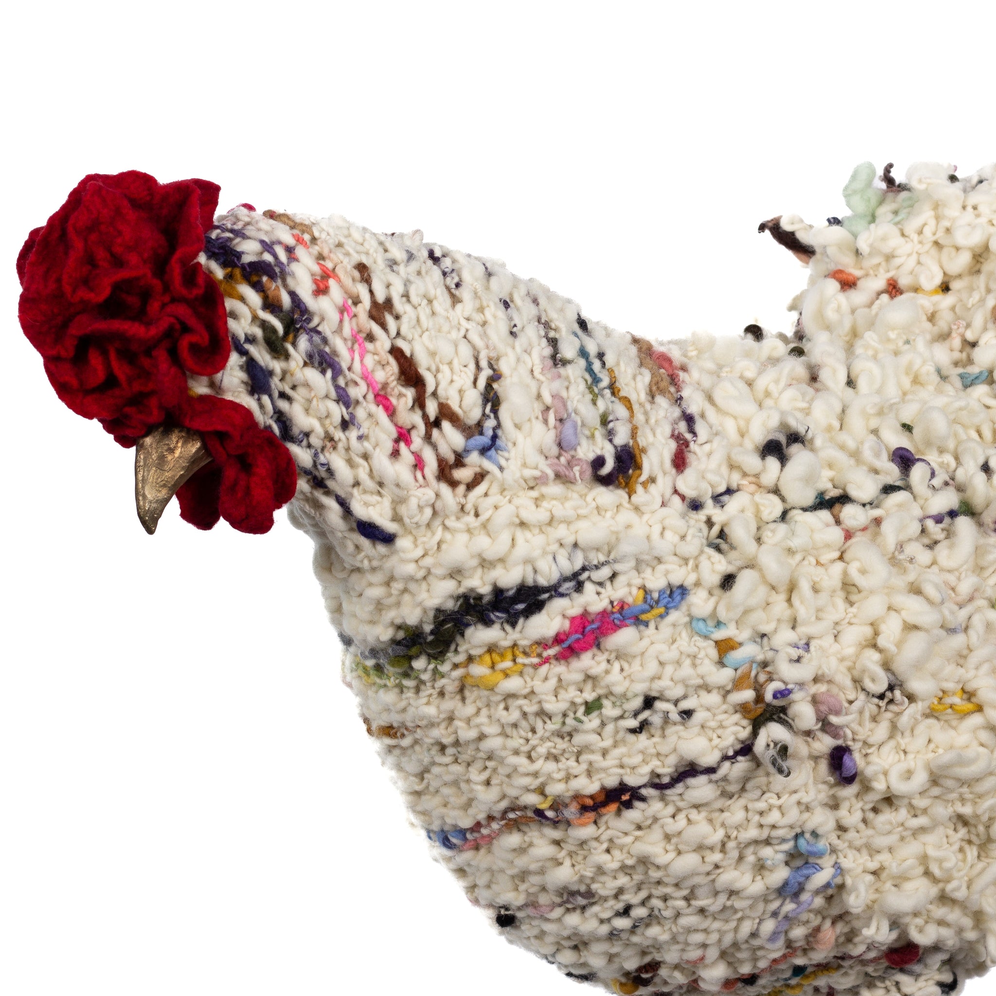 The chickens are sculpted in Kansas City, Missouri with care and delight, upholstered to function as footstools. Each is one-of-a-kind, unique in posture and personality. A turned wood egg-shaped core stands on bronze feet and is connected to a bronze beak. Feathers are fashioned with traditional fiber art techniques- dyeing, felting, spinning, knitting- and are stitched by hand. And a surprise? Their heads bob.