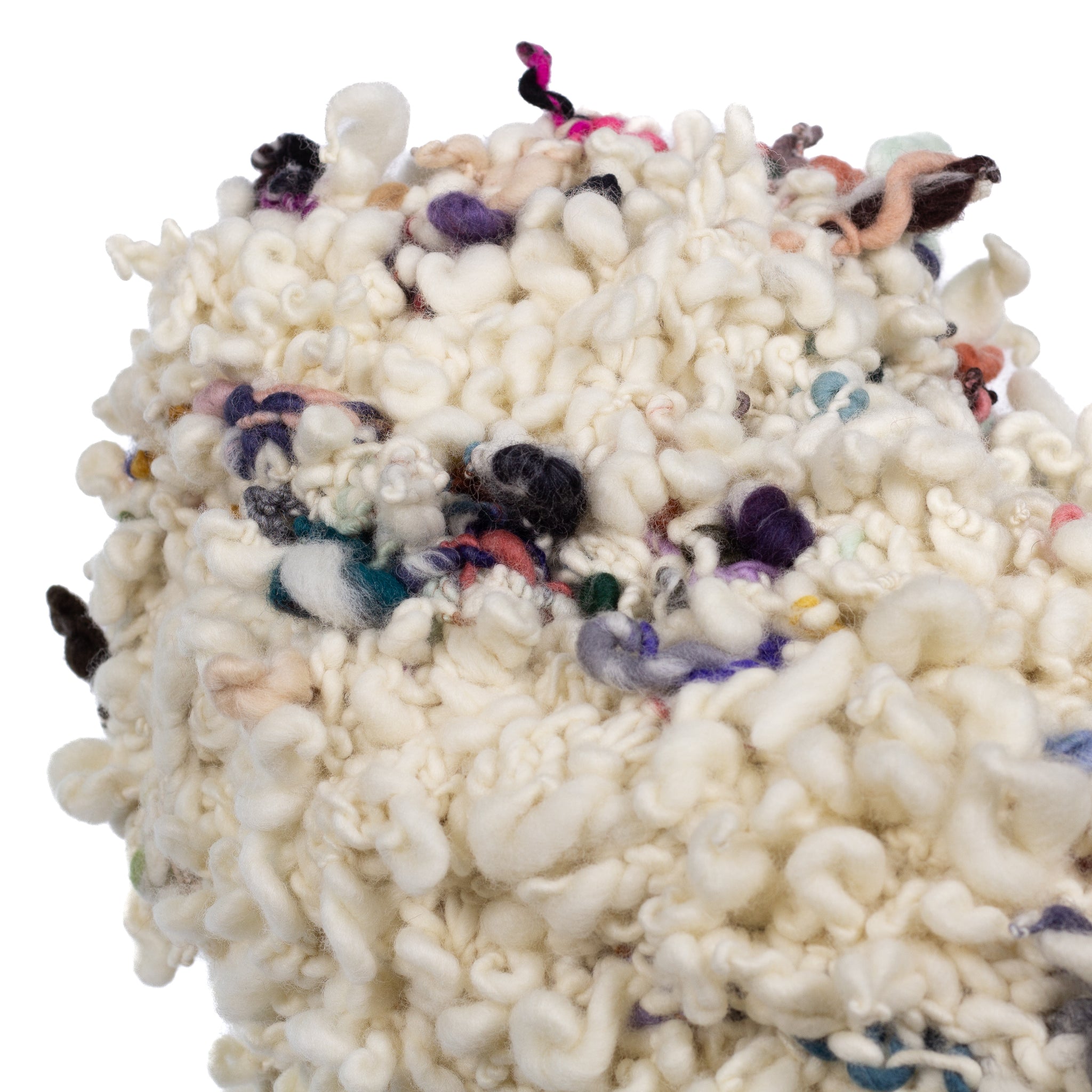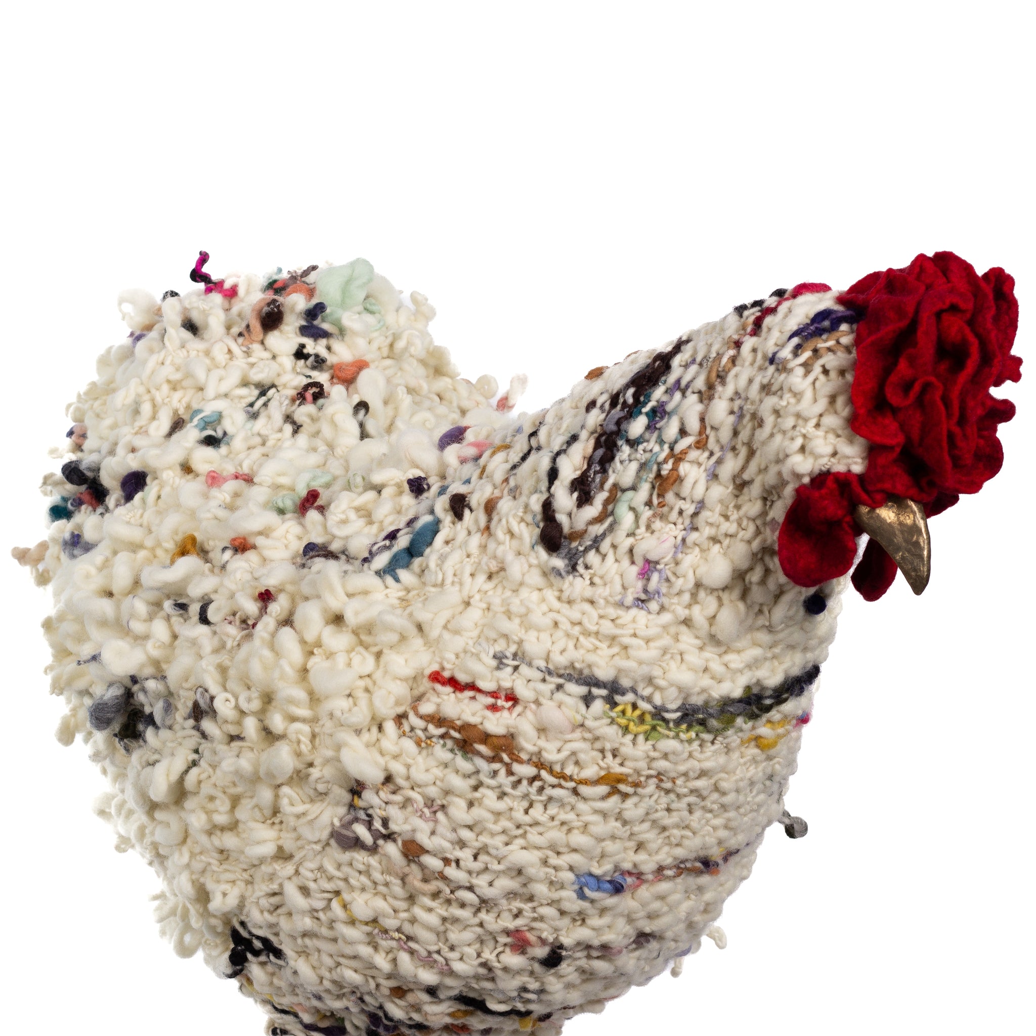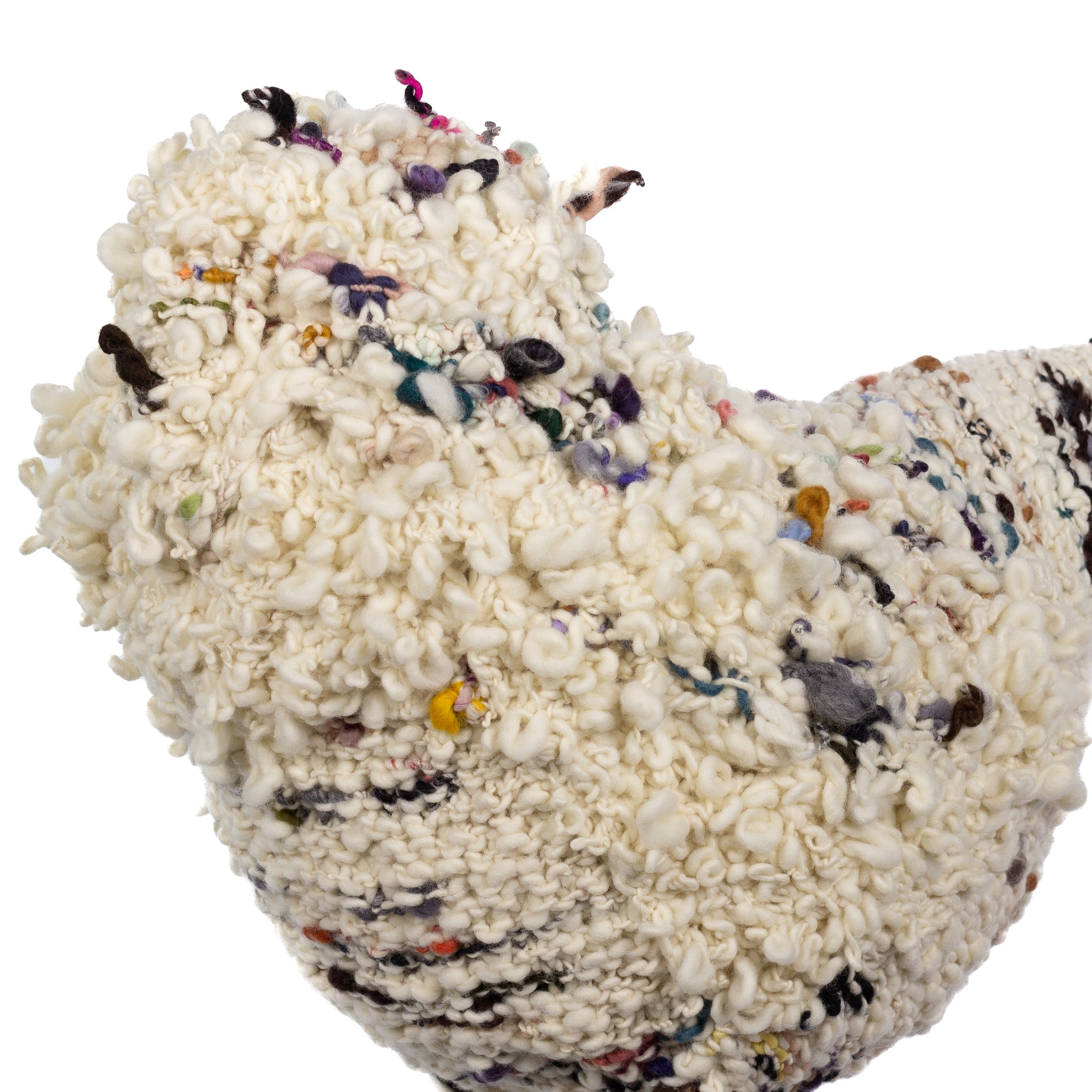 Spencer is a Big Chicken Footstool whose feathers are fashioned with hand-knit 100% Merino wool. He is looking for a good home.