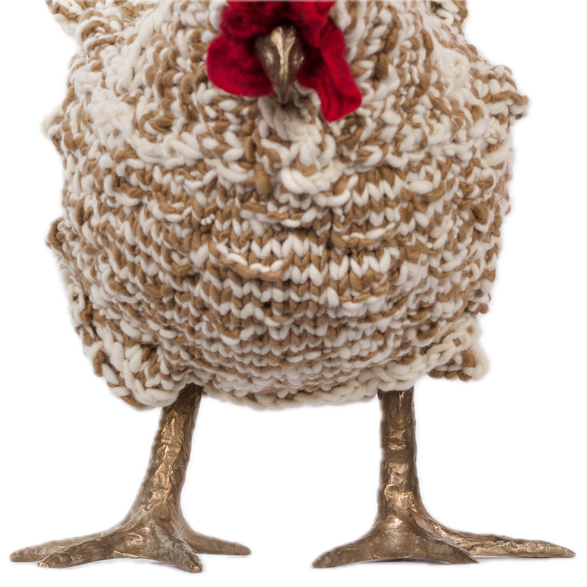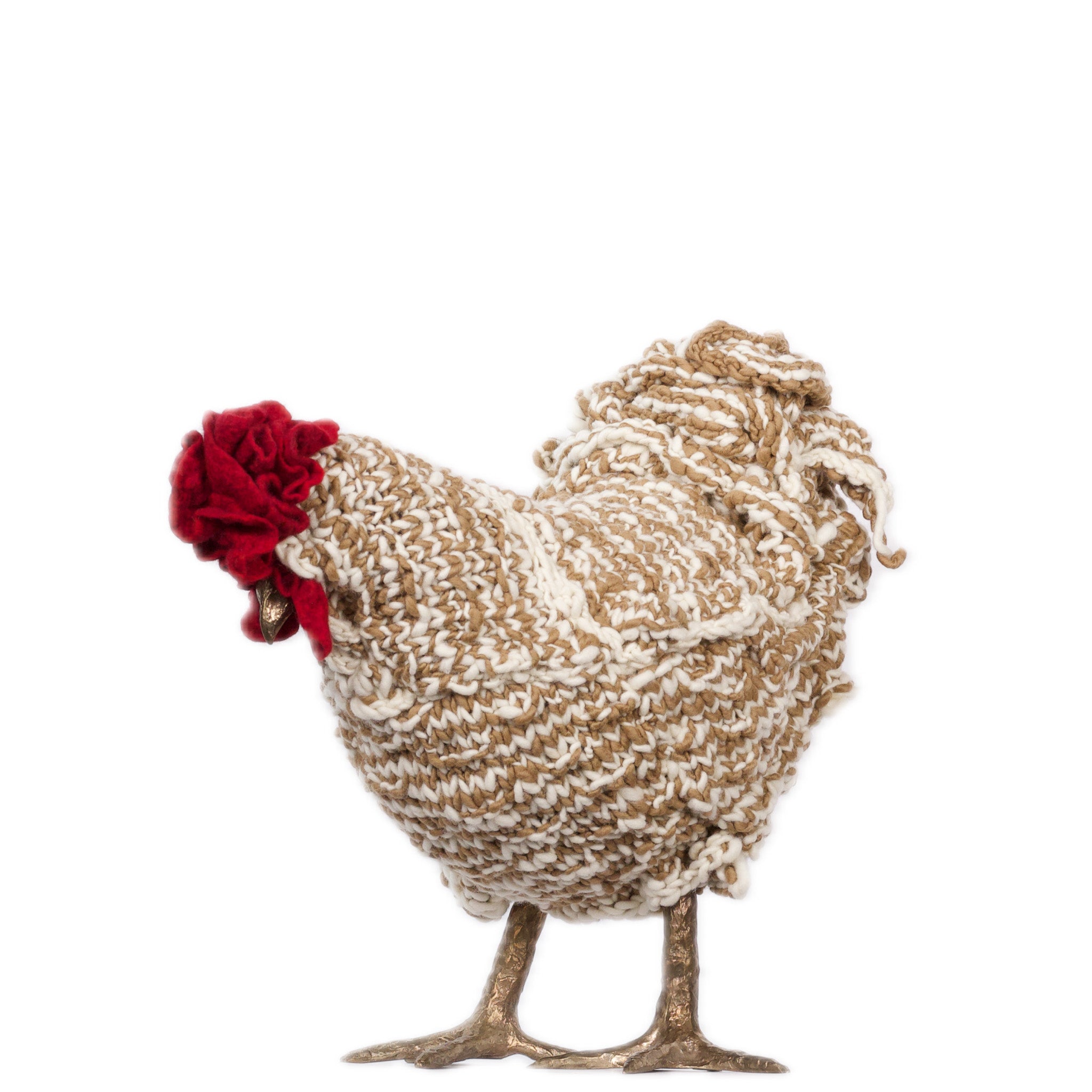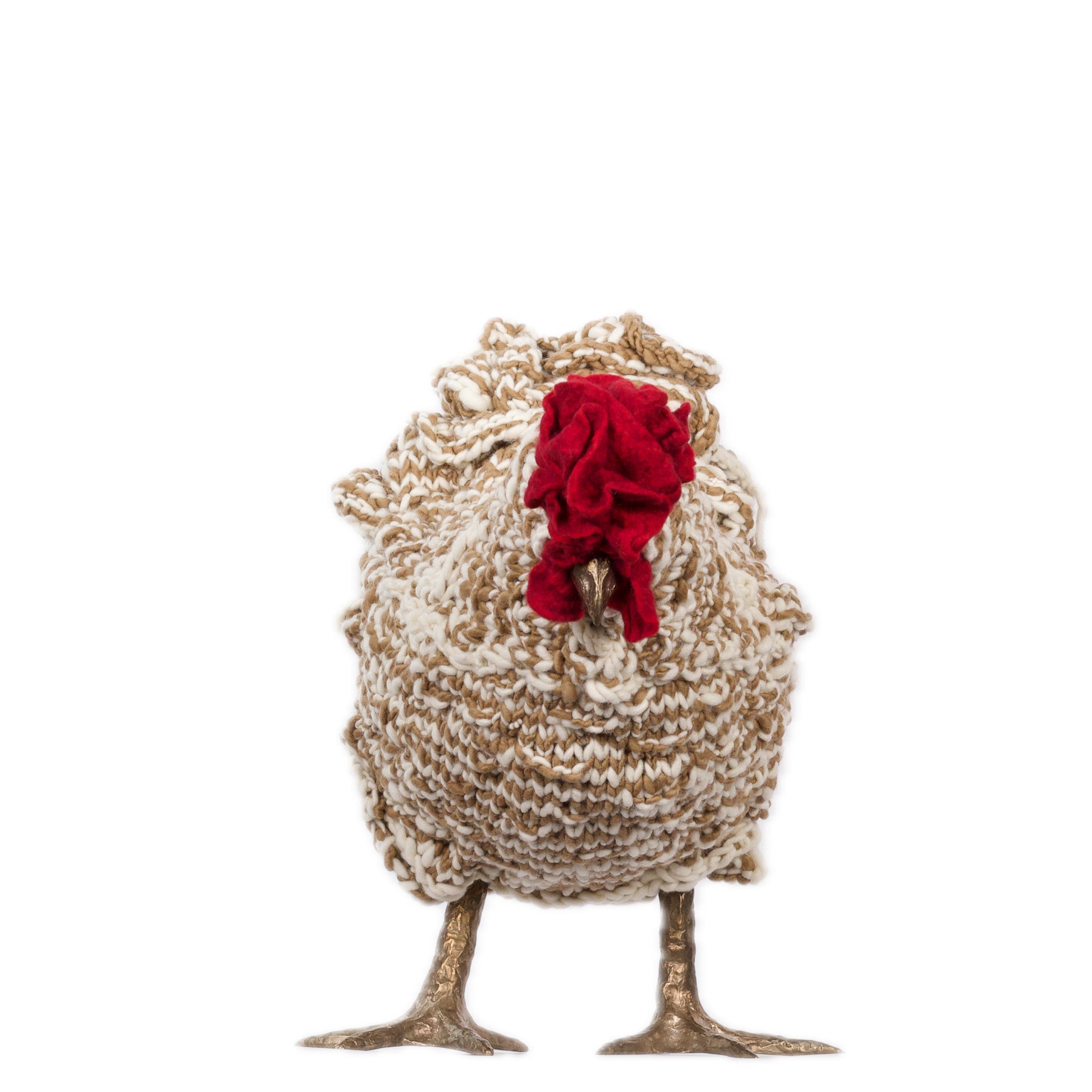 The chickens are sculpted in Kansas City, Missouri with care and delight, upholstered to function as footstools. Each is one-of-a-kind, unique in posture and personality. A turned wood egg-shaped core stands on bronze feet and is connected to a bronze beak. Feathers are fashioned with traditional fiber art techniques- dyeing, felting, spinning, knitting- and are stitched by hand. And a surprise? Their heads bob.