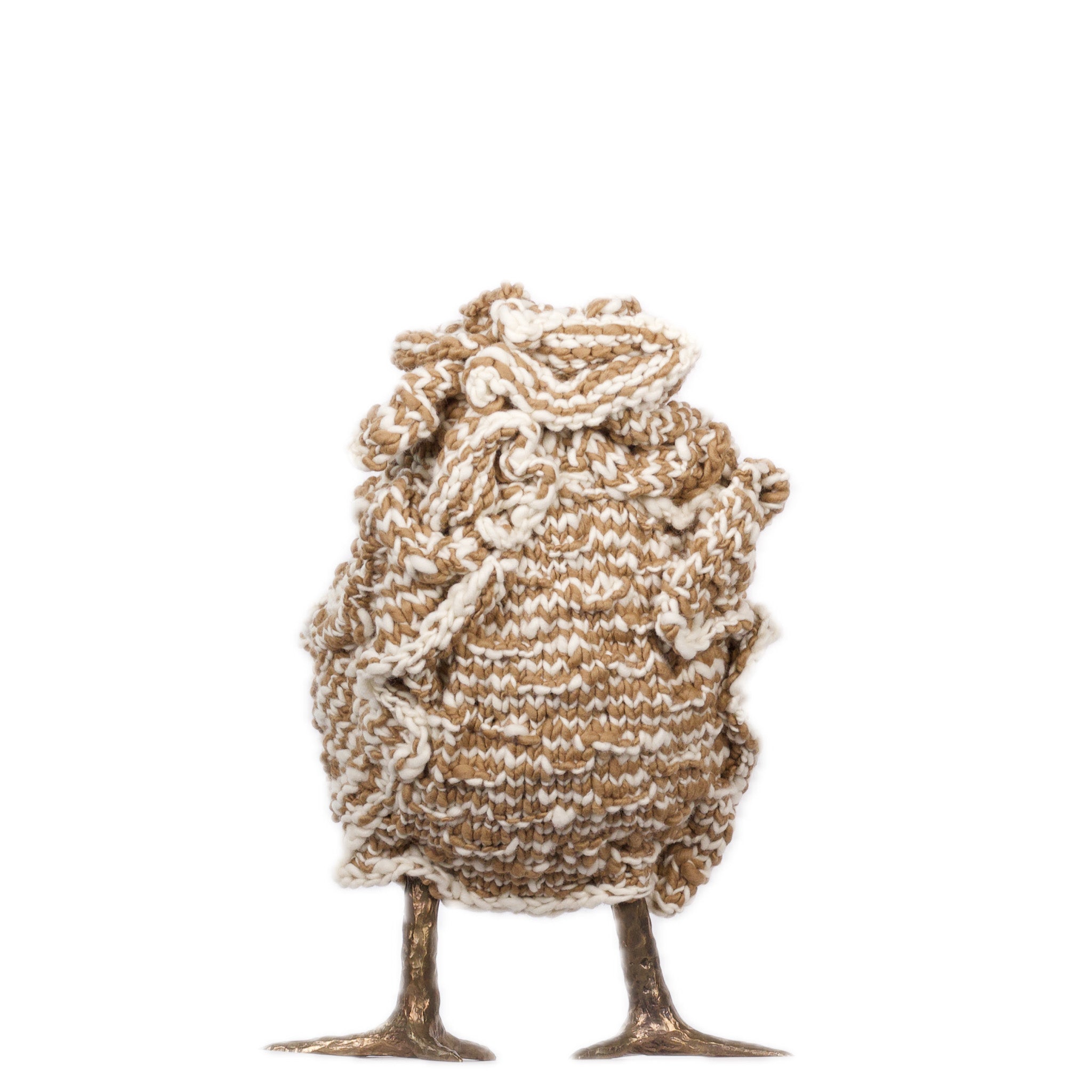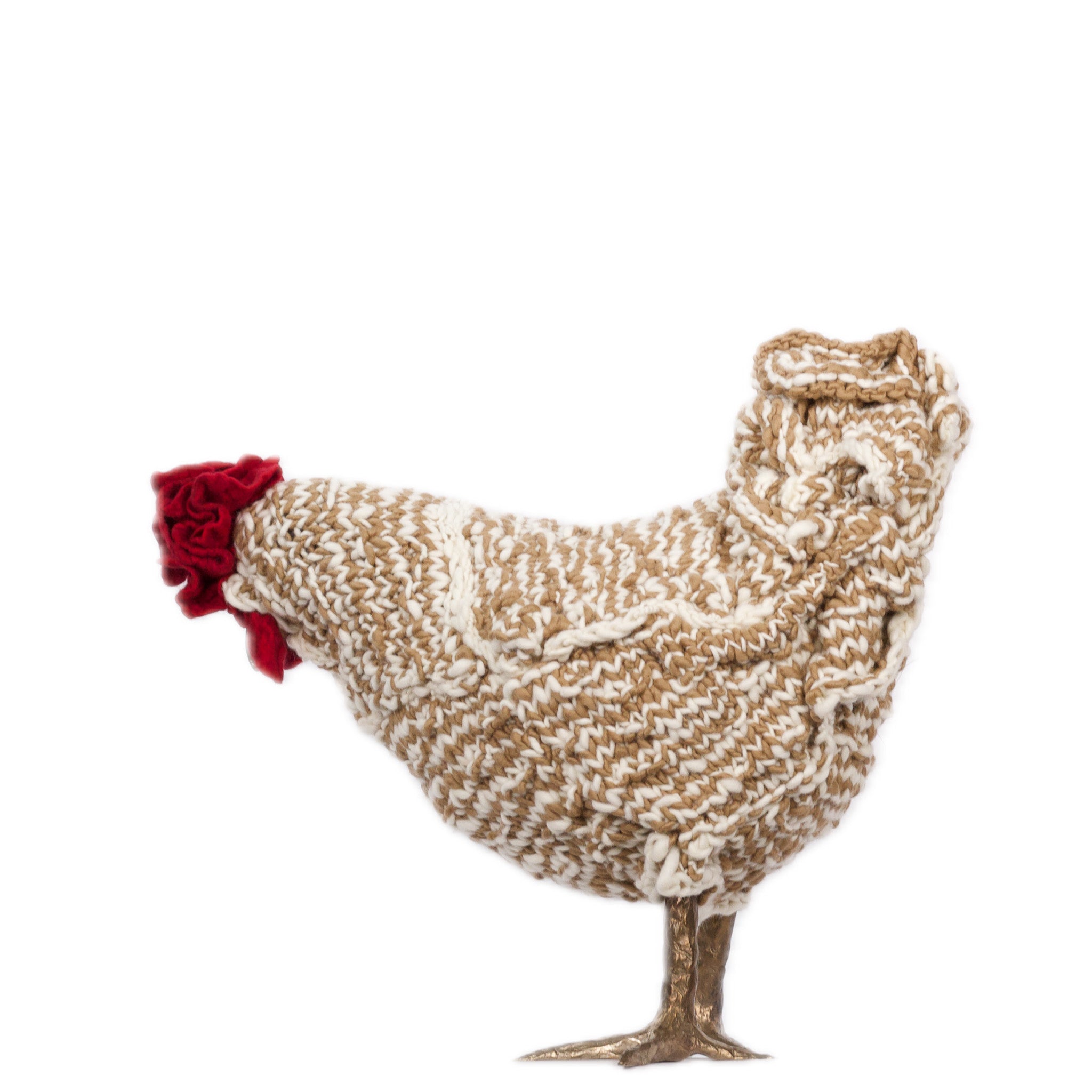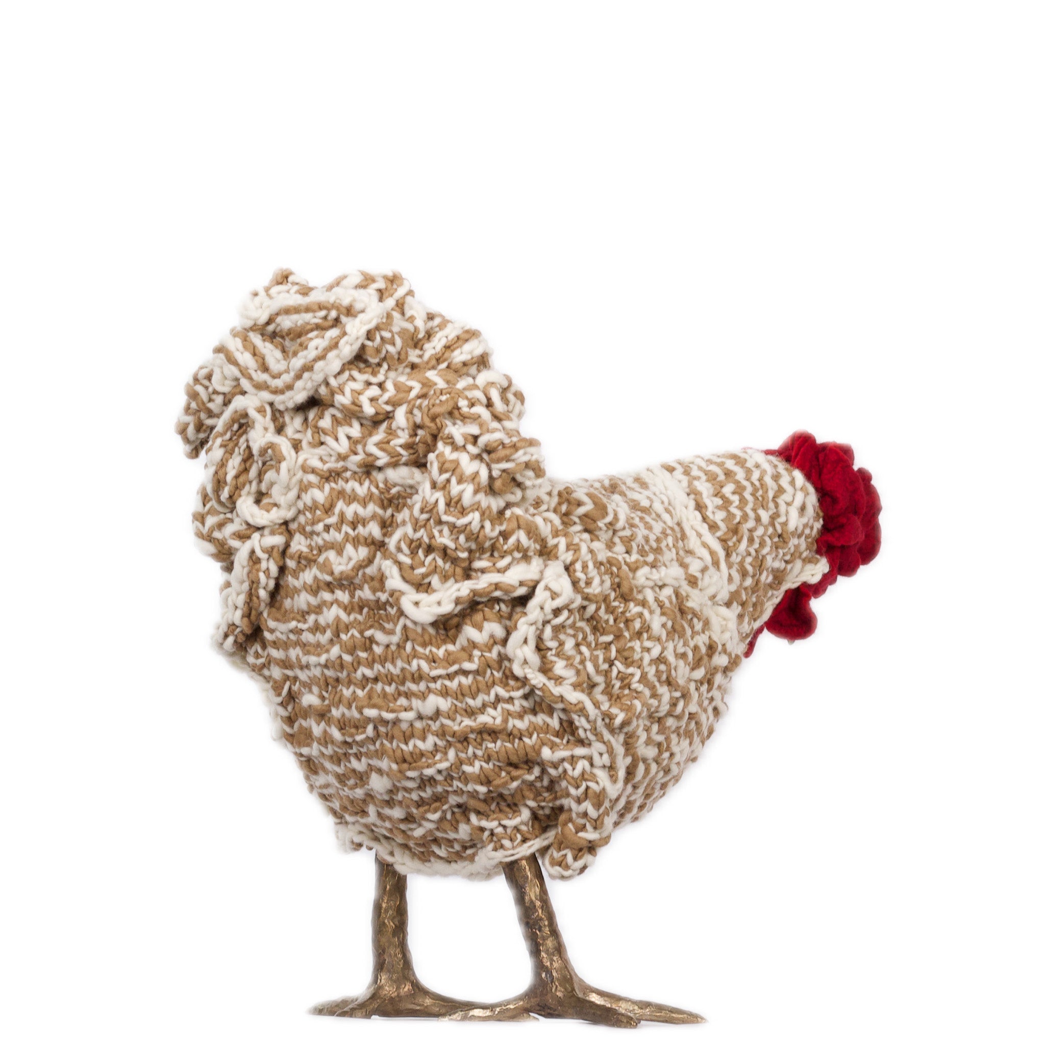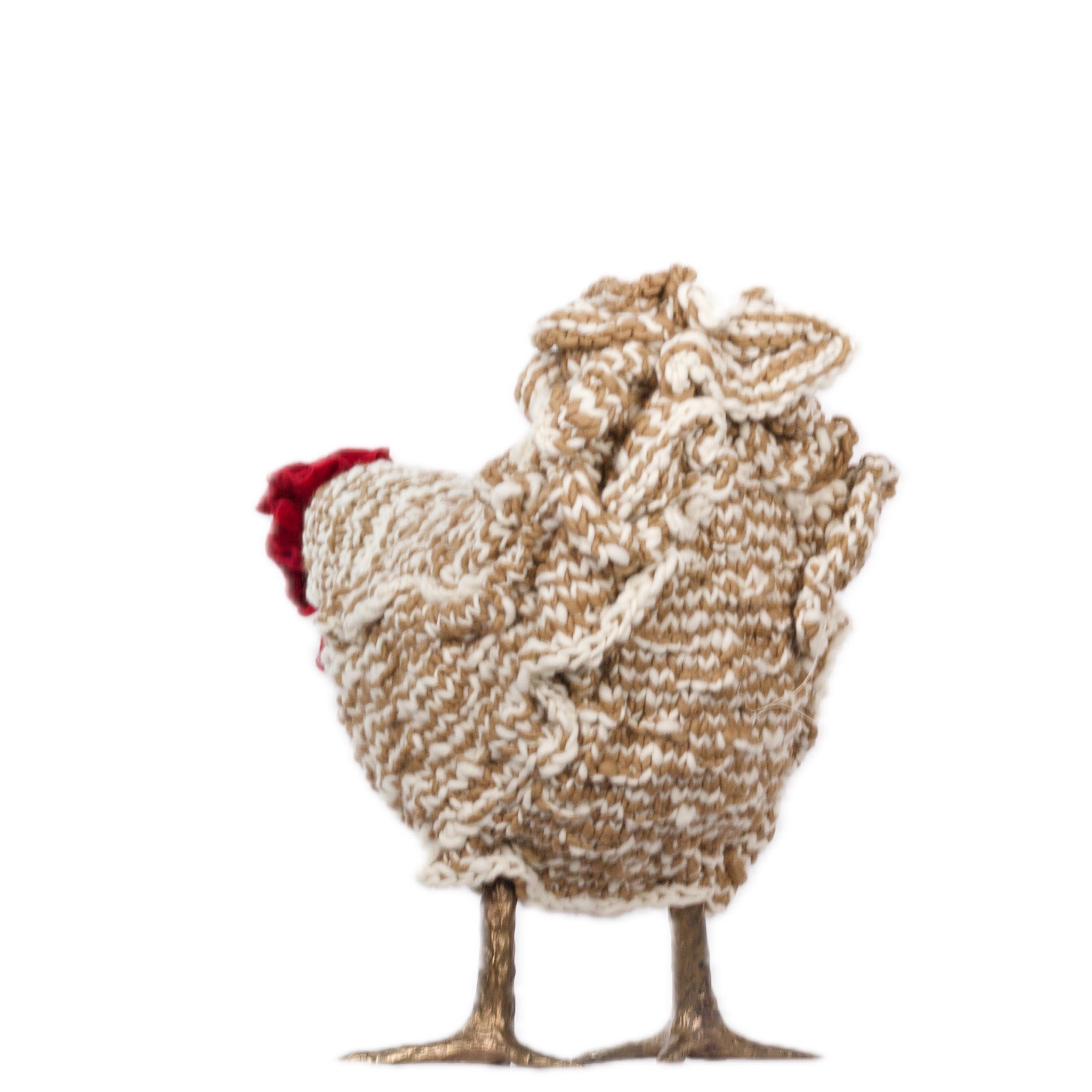 The chickens are sculpted in Kansas City, Missouri with care and delight, upholstered to function as footstools. Each is one-of-a-kind, unique in posture and personality. A turned wood egg-shaped core stands on bronze feet and is connected to a bronze beak. Feathers are fashioned with traditional fiber art techniques- dyeing, felting, spinning, knitting- and are stitched by hand. And a surprise? Their heads bob.