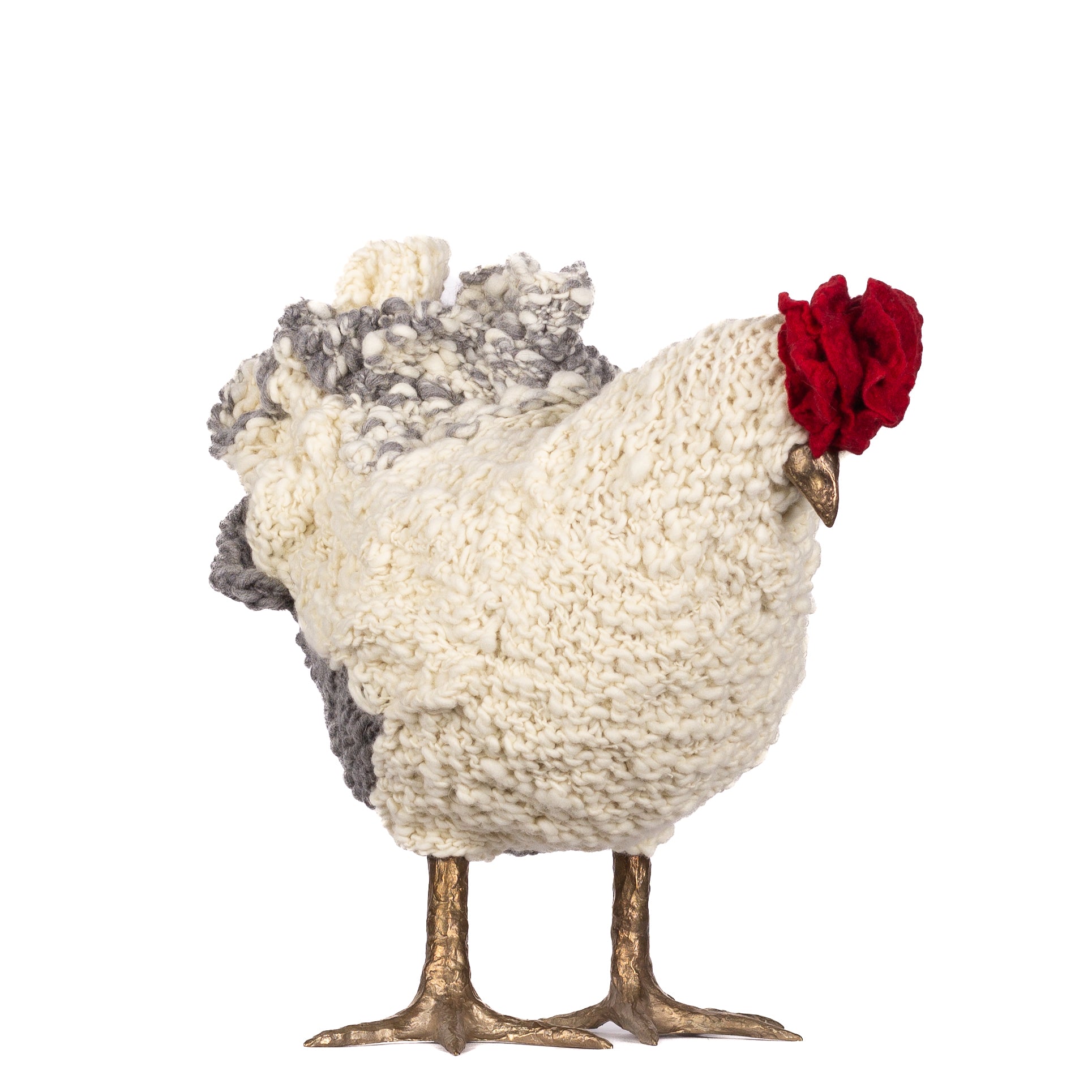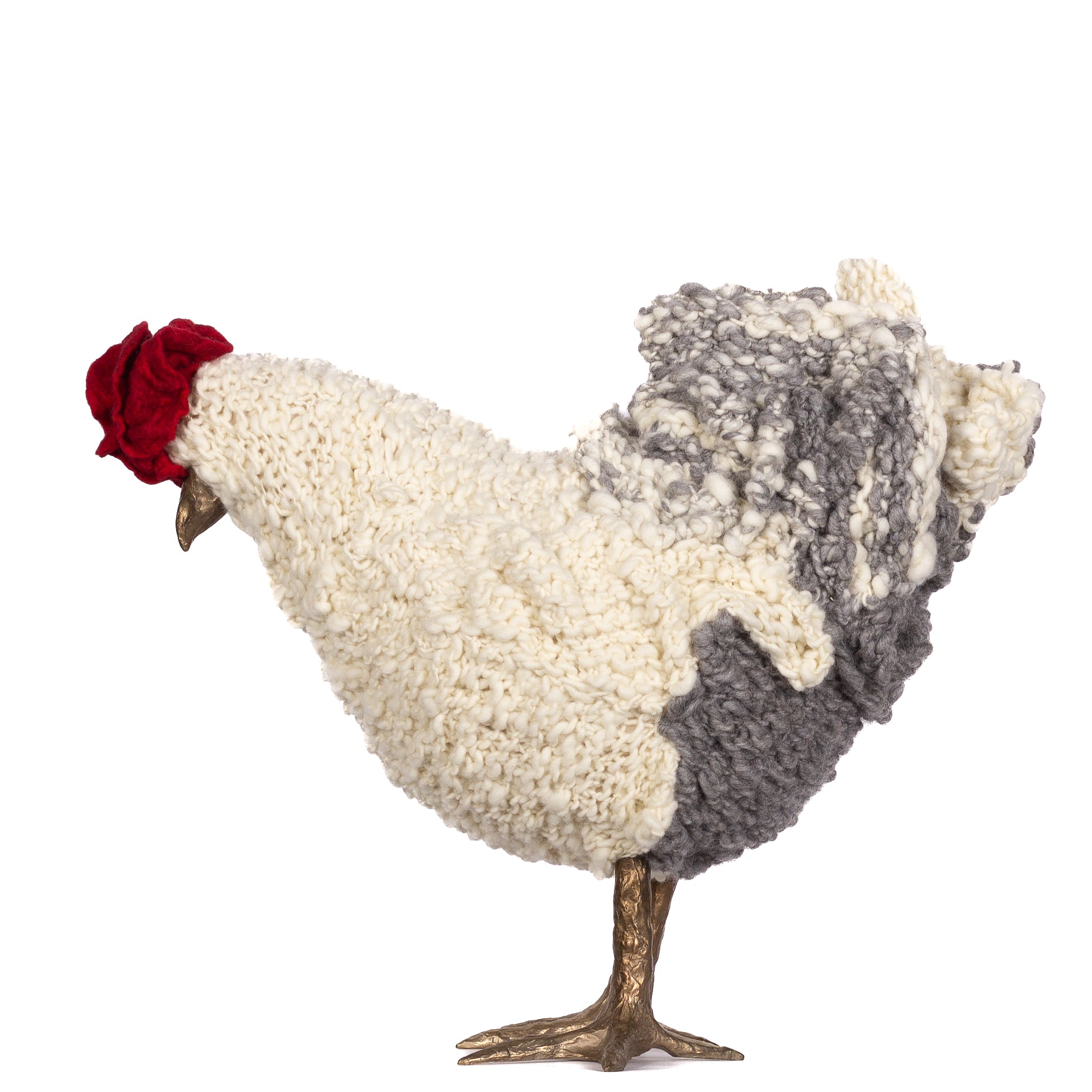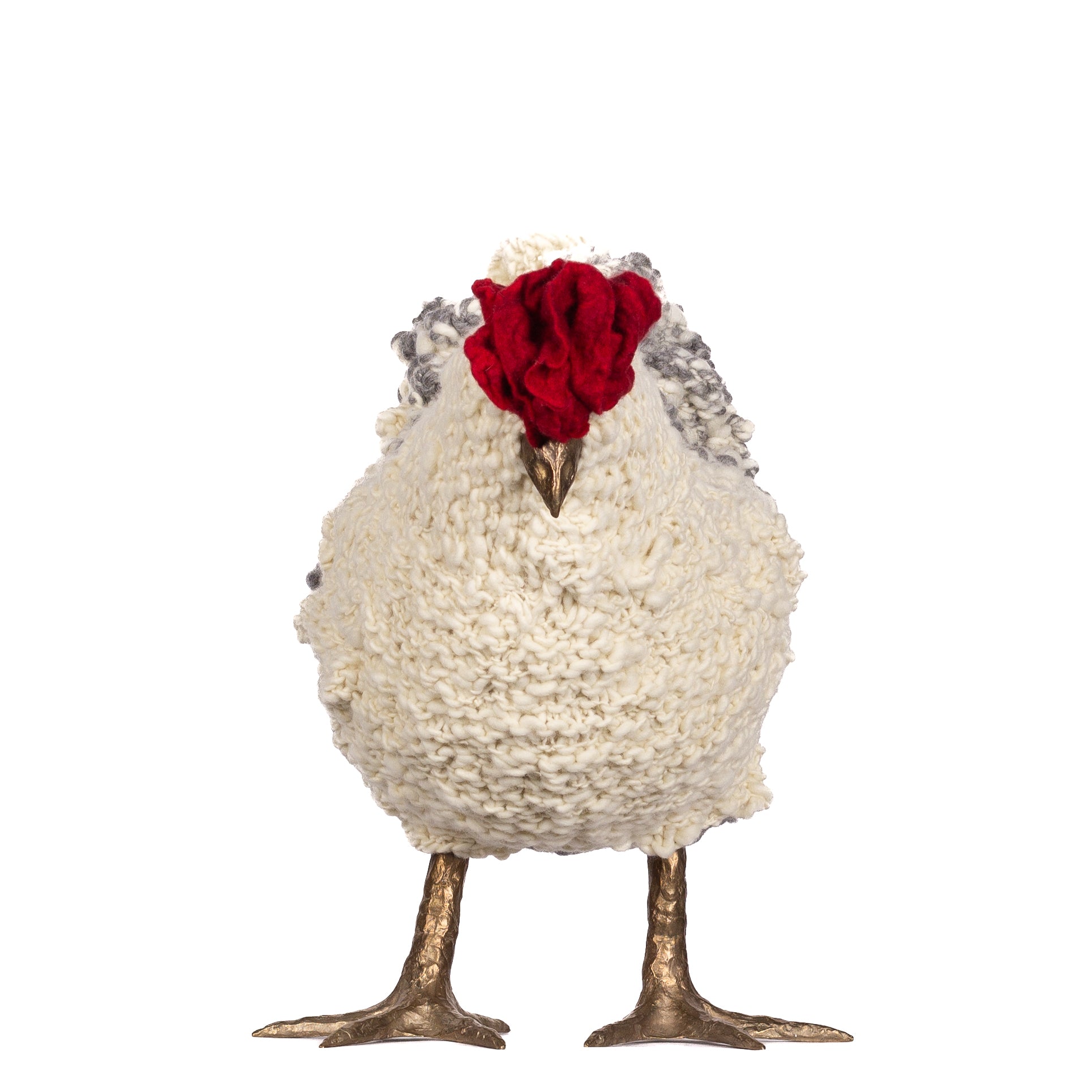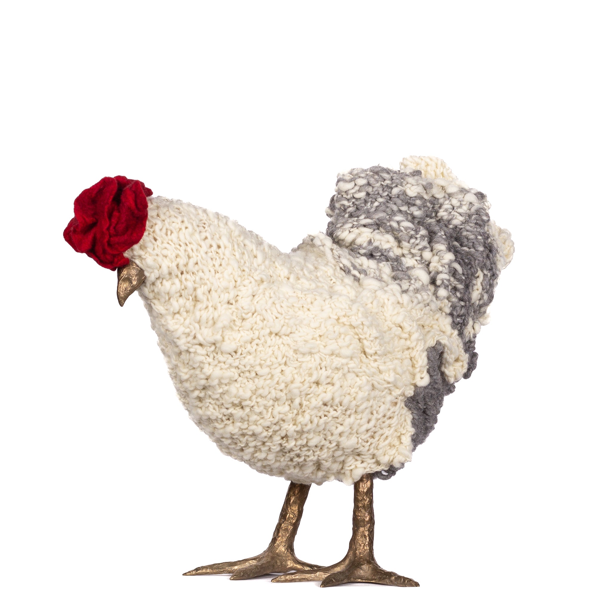 The chickens are sculpted in Kansas City, Missouri with care and delight, upholstered to function as footstools. Each is one-of-a-kind, unique in posture and personality. A turned wood egg-shaped core stands on bronze feet and is connected to a bronze beak. Feathers are fashioned with traditional fiber art techniques- dyeing, felting, spinning, knitting- and are stitched by hand. And a surprise? Their heads bob.