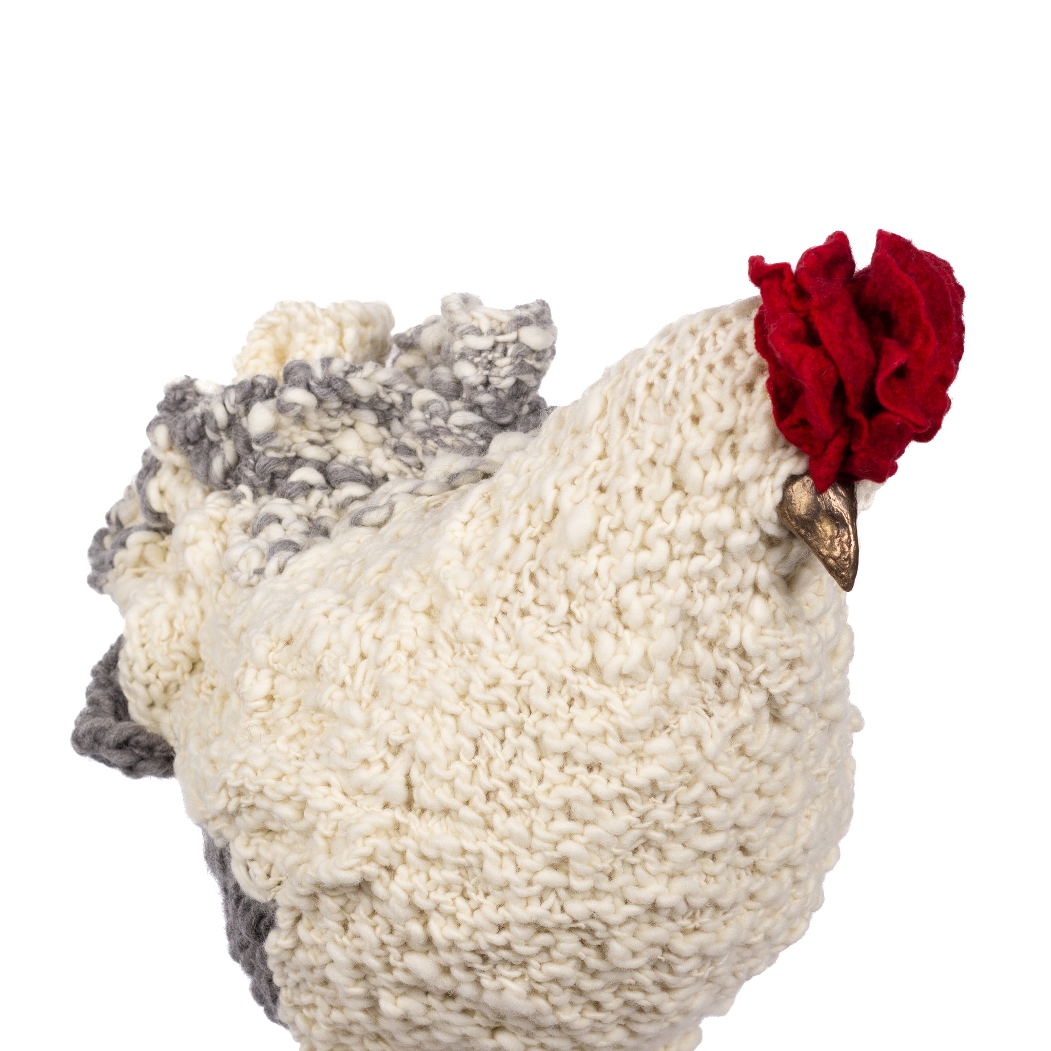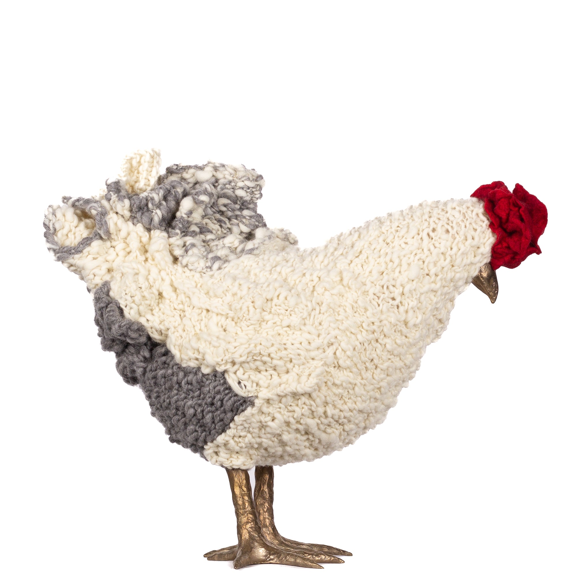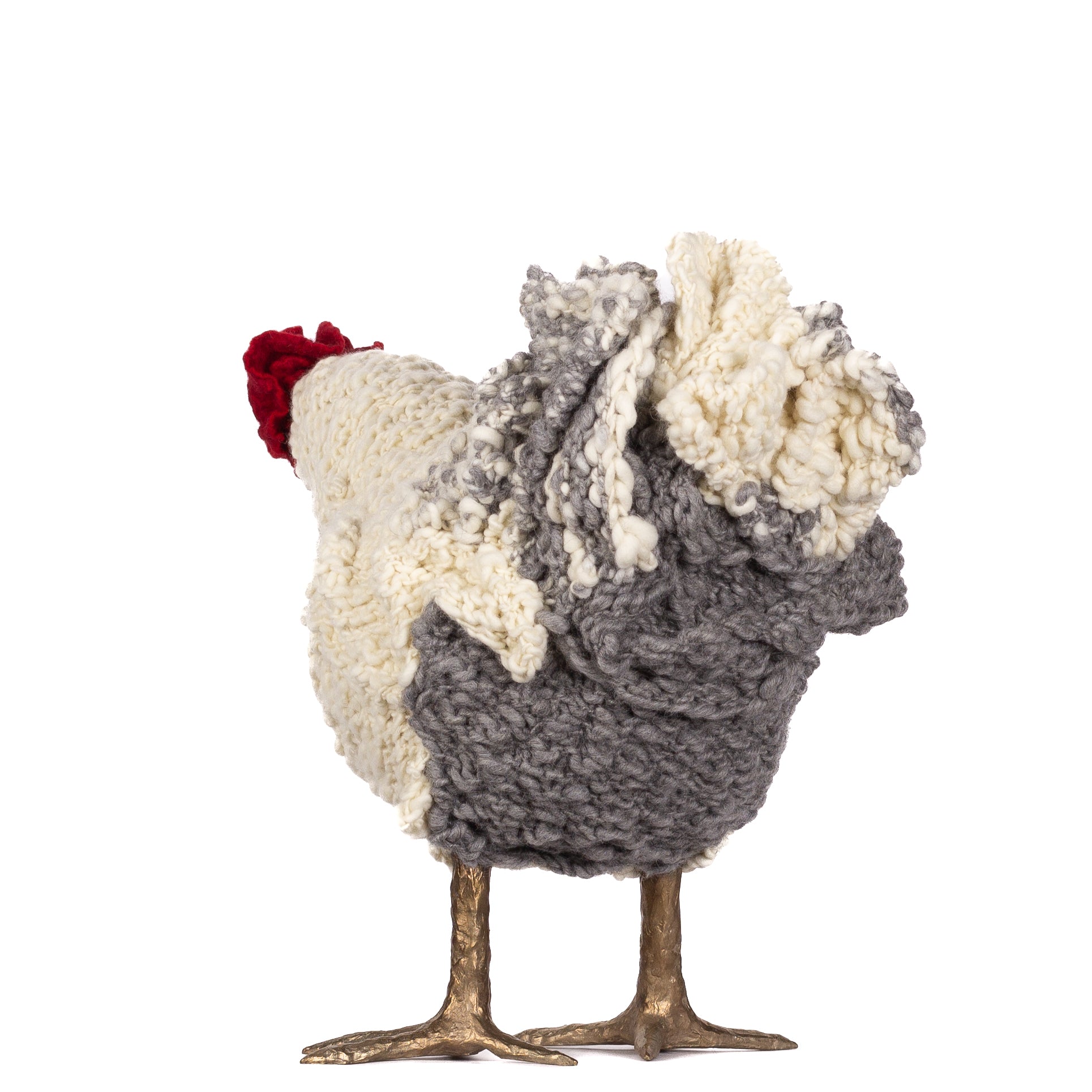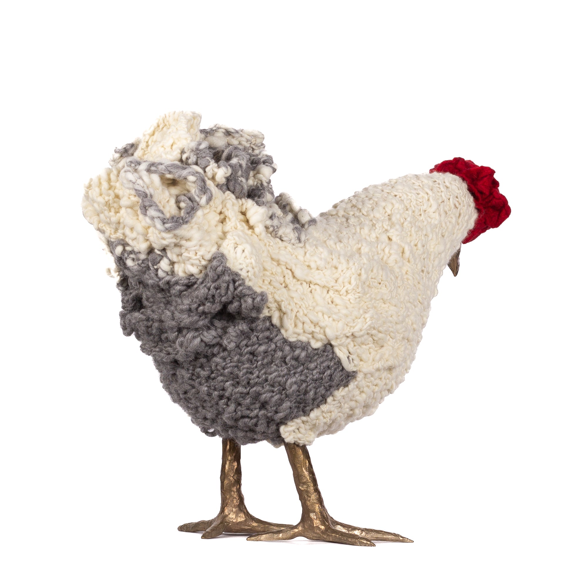 The chickens are sculpted in Kansas City, Missouri with care and delight, upholstered to function as footstools. Each is one-of-a-kind, unique in posture and personality. A turned wood egg-shaped core stands on bronze feet and is connected to a bronze beak. Feathers are fashioned with traditional fiber art techniques- dyeing, felting, spinning, knitting- and are stitched by hand. And a surprise? Their heads bob.