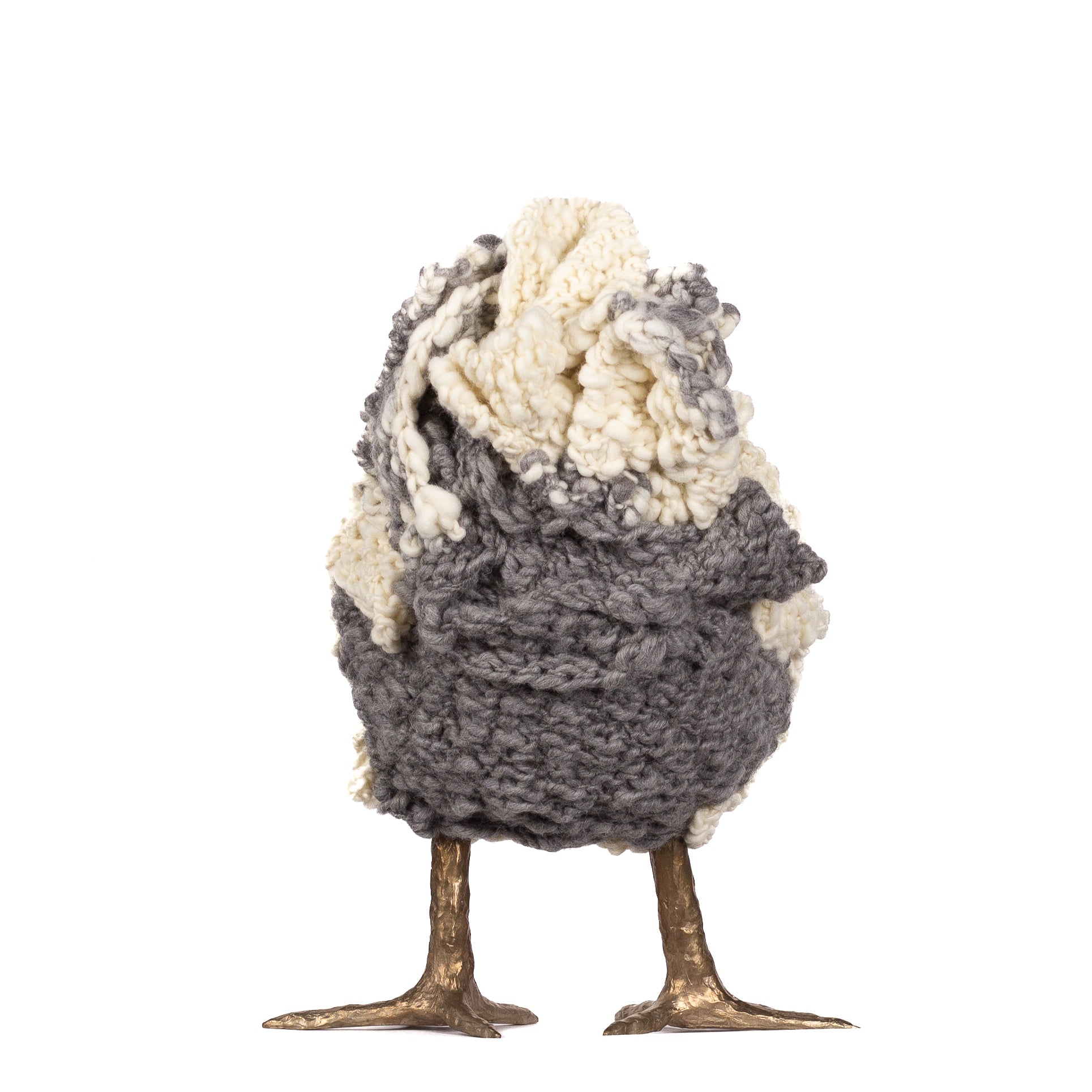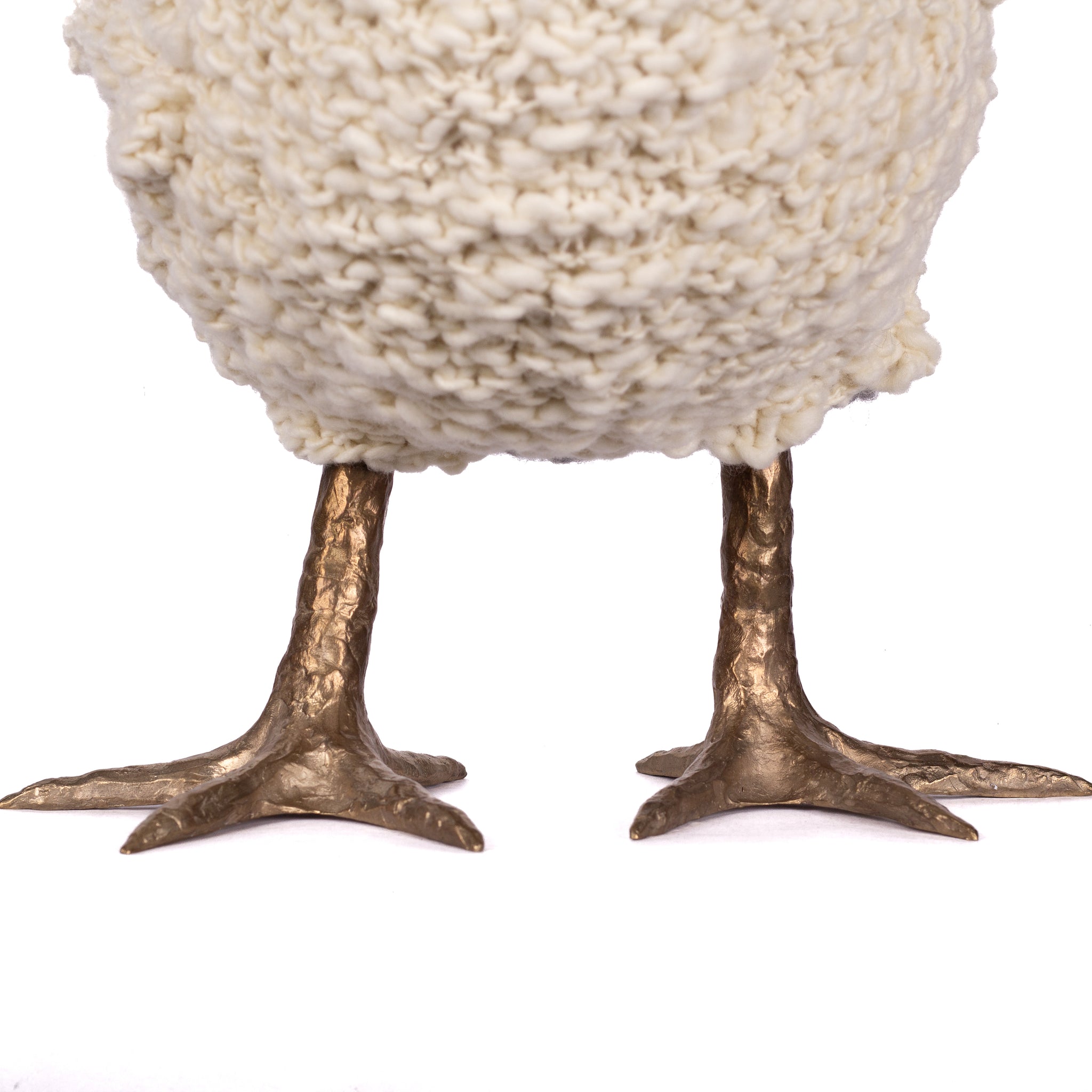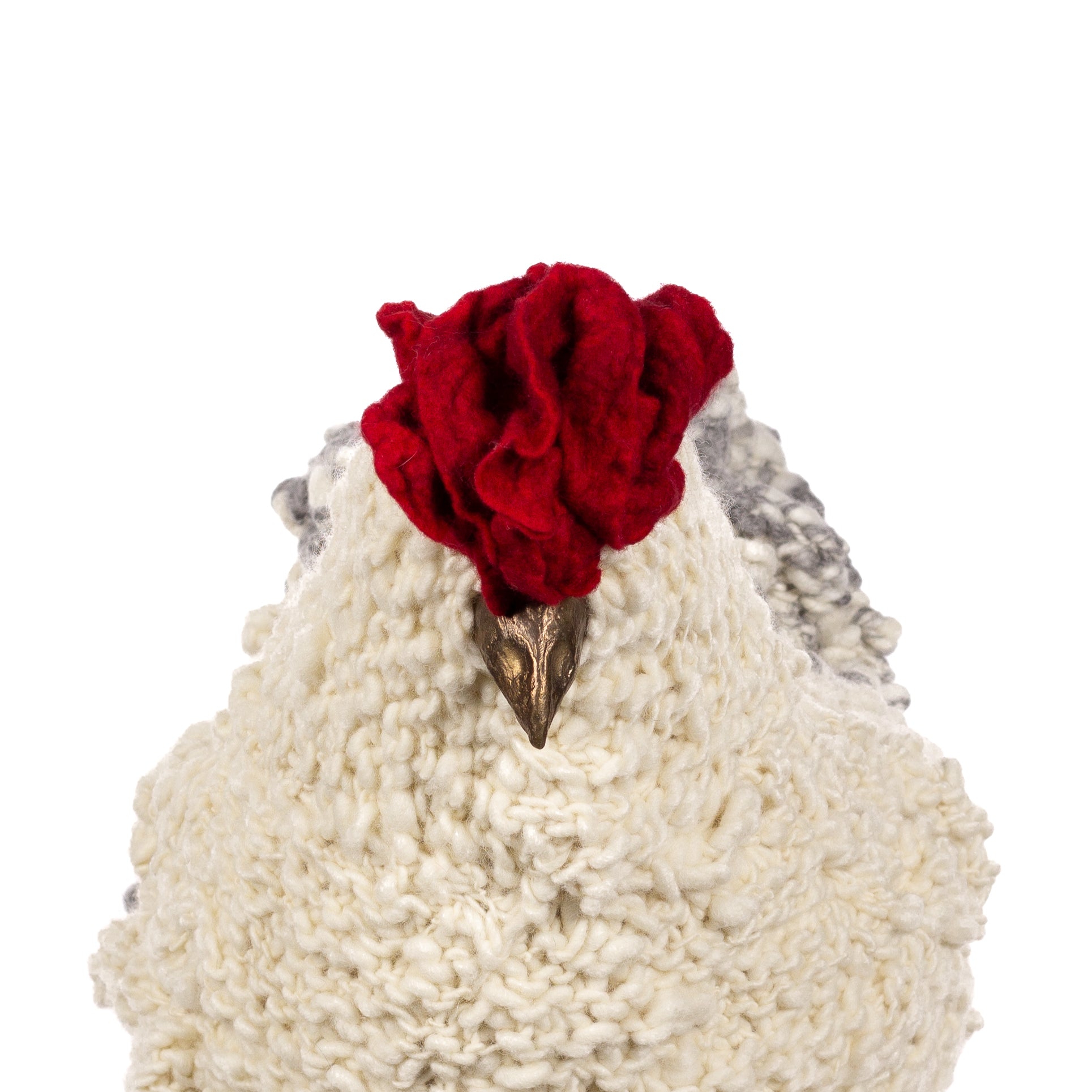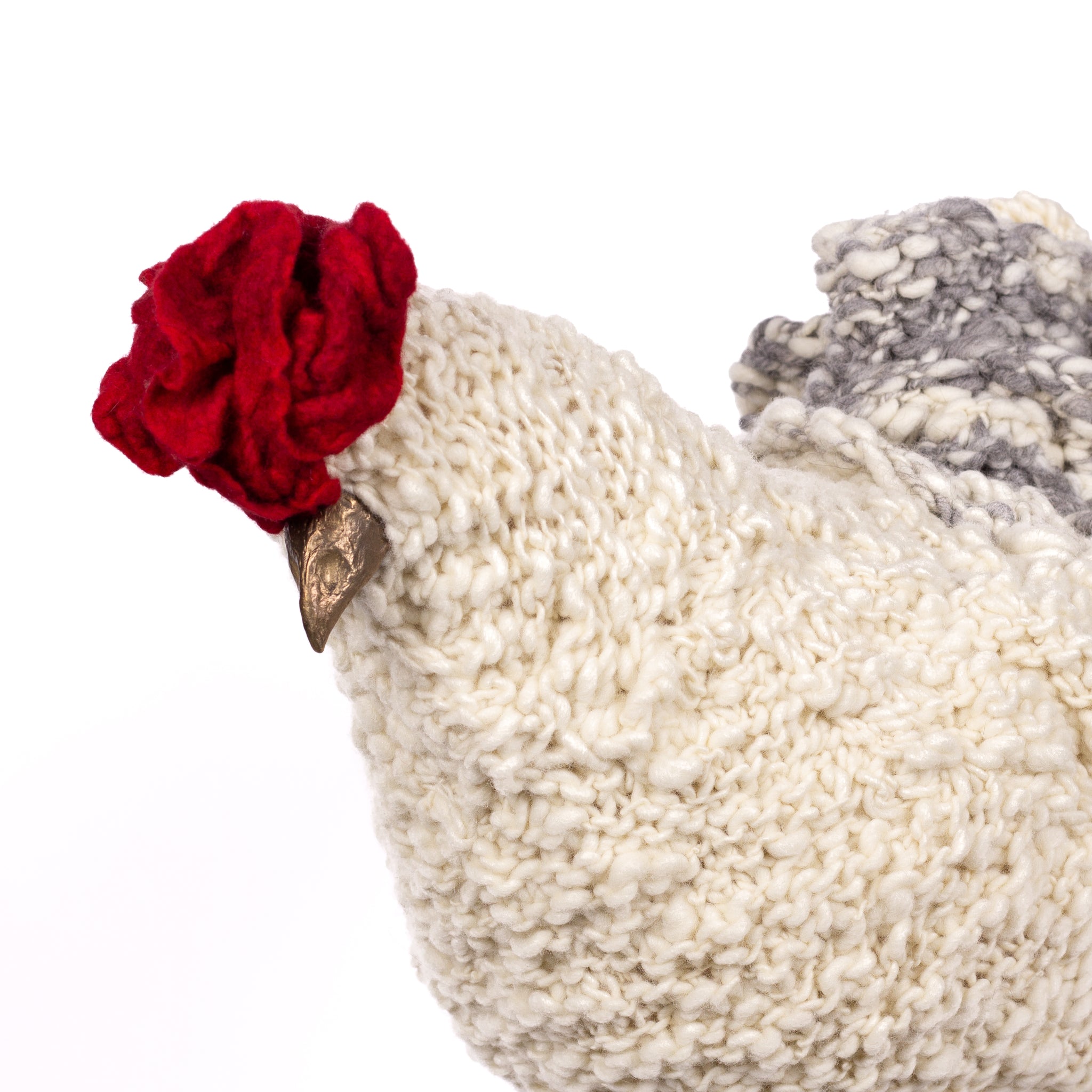 The chickens are sculpted in Kansas City, Missouri with care and delight, upholstered to function as footstools. Each is one-of-a-kind, unique in posture and personality. A turned wood egg-shaped core stands on bronze feet and is connected to a bronze beak. Feathers are fashioned with traditional fiber art techniques- dyeing, felting, spinning, knitting- and are stitched by hand. And a surprise? Their heads bob.
